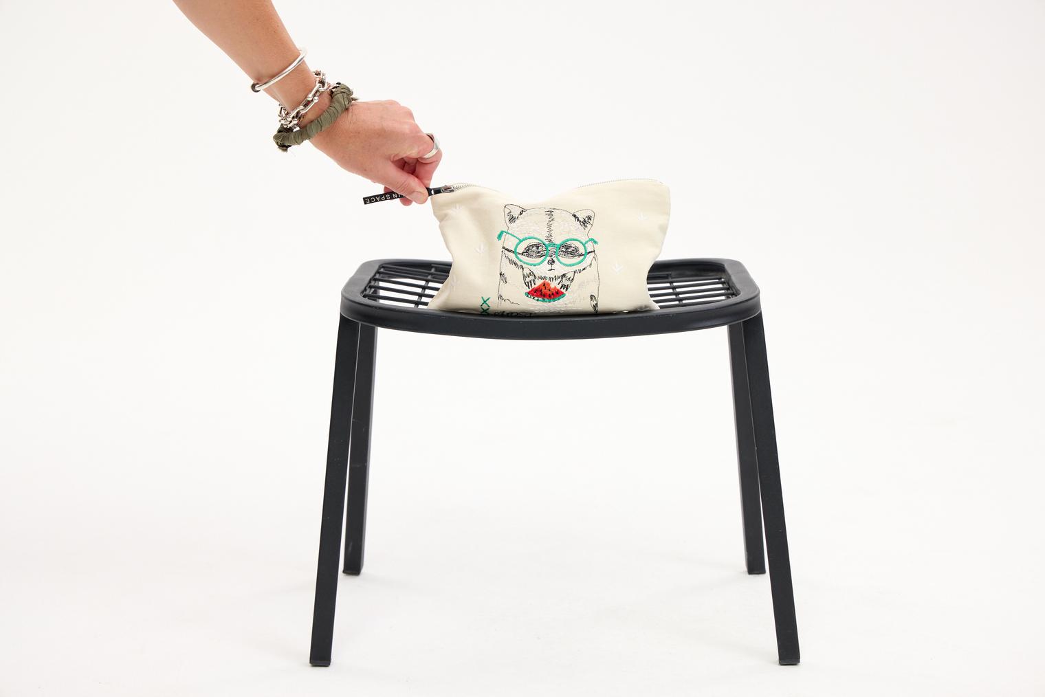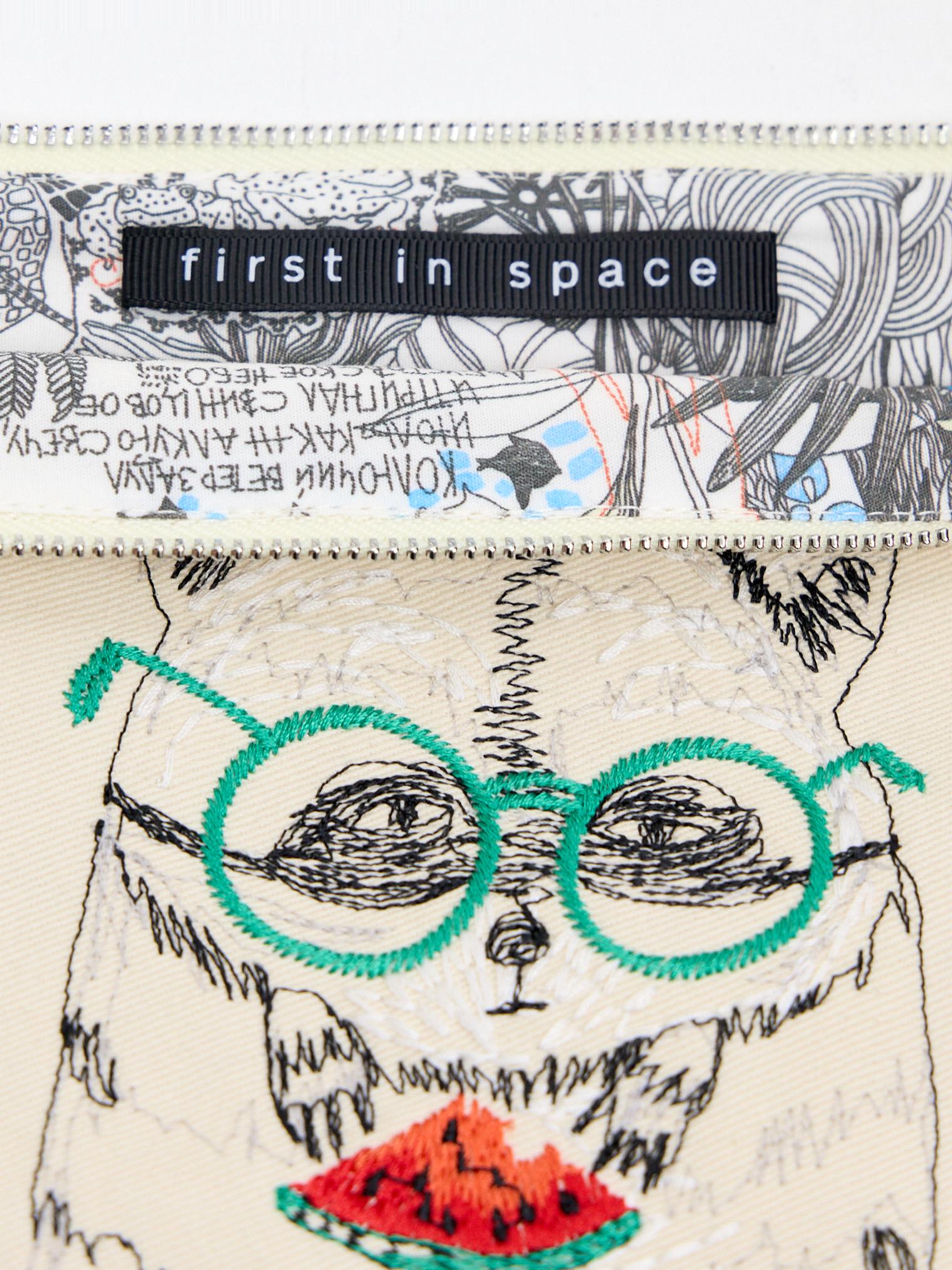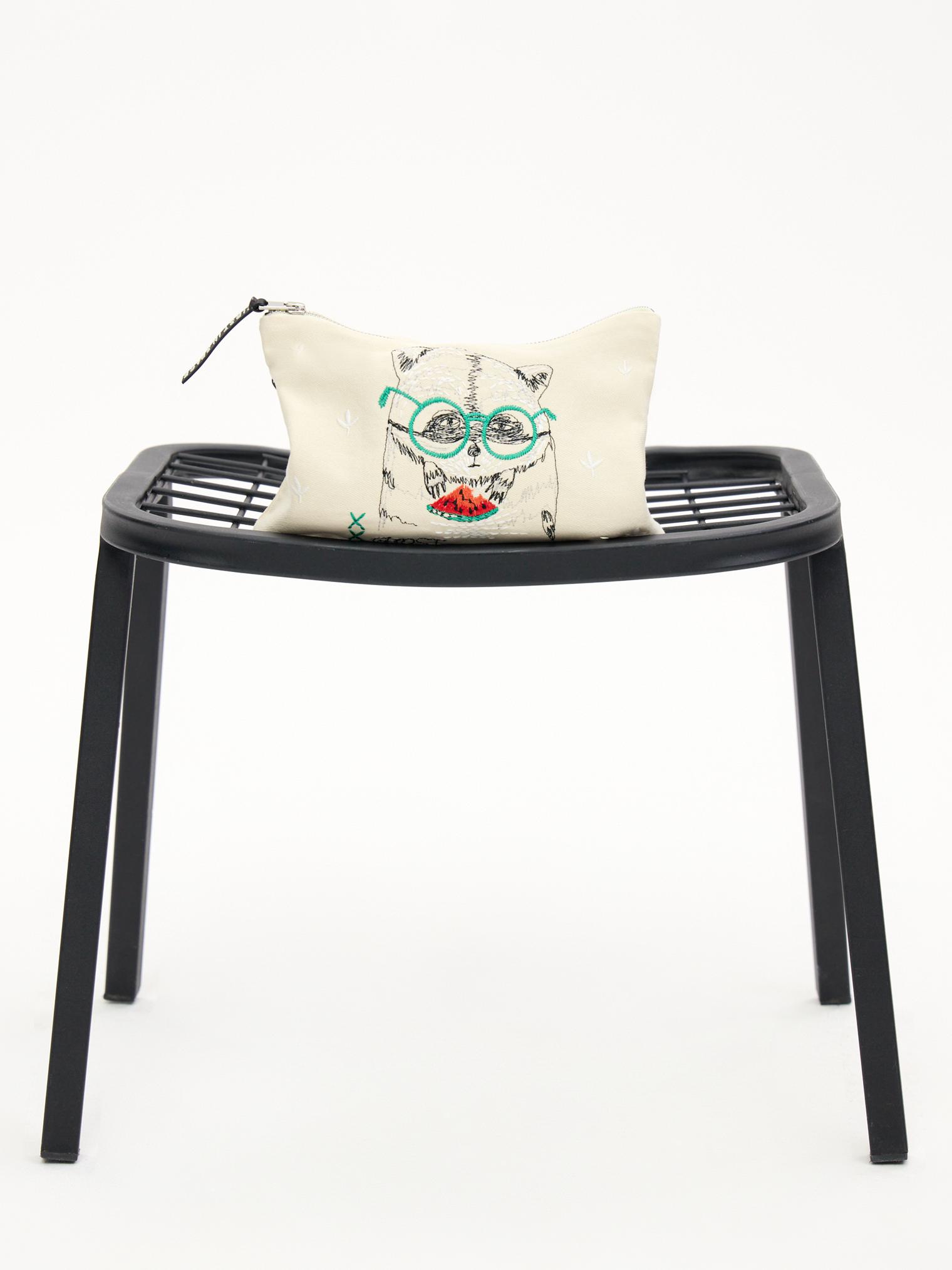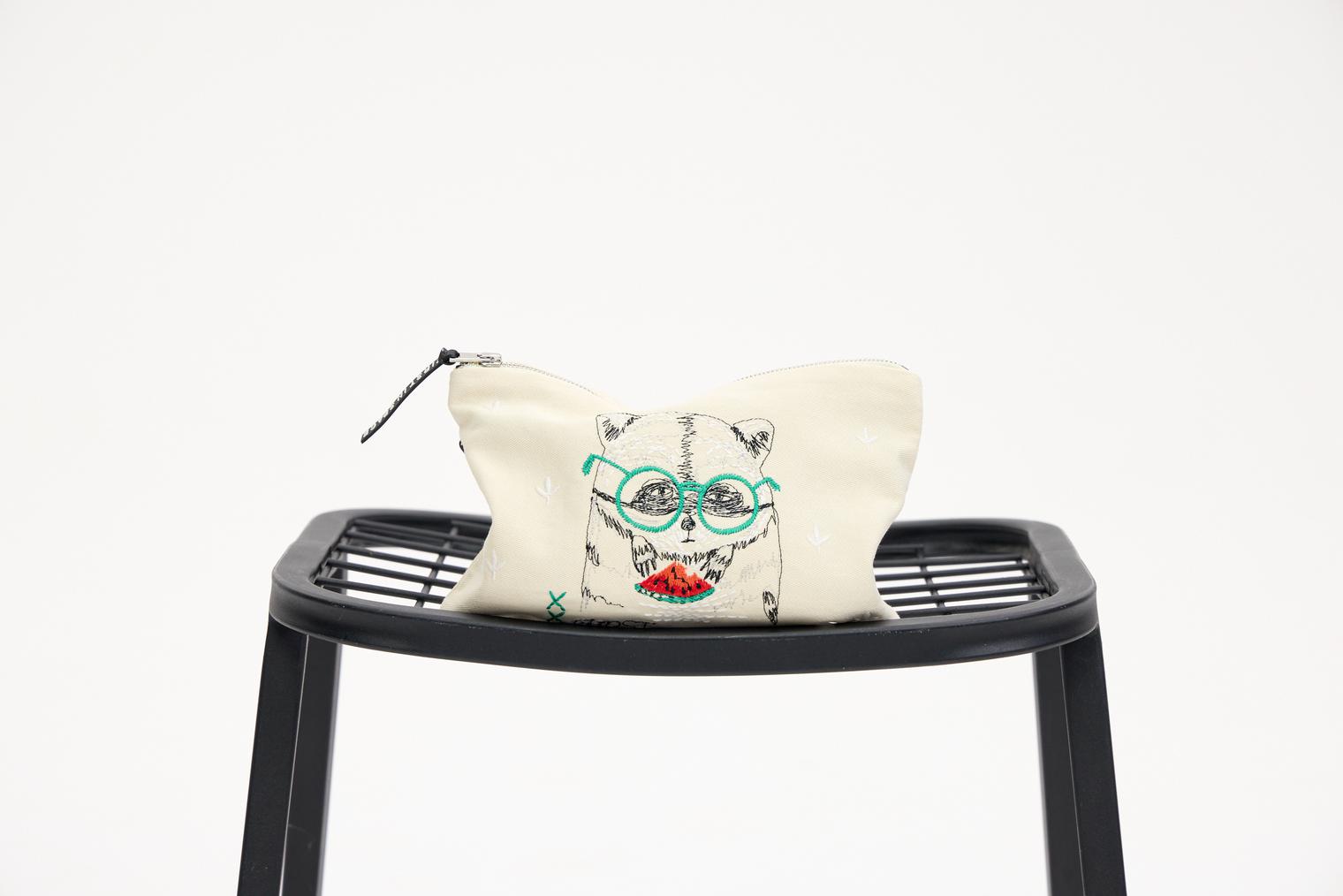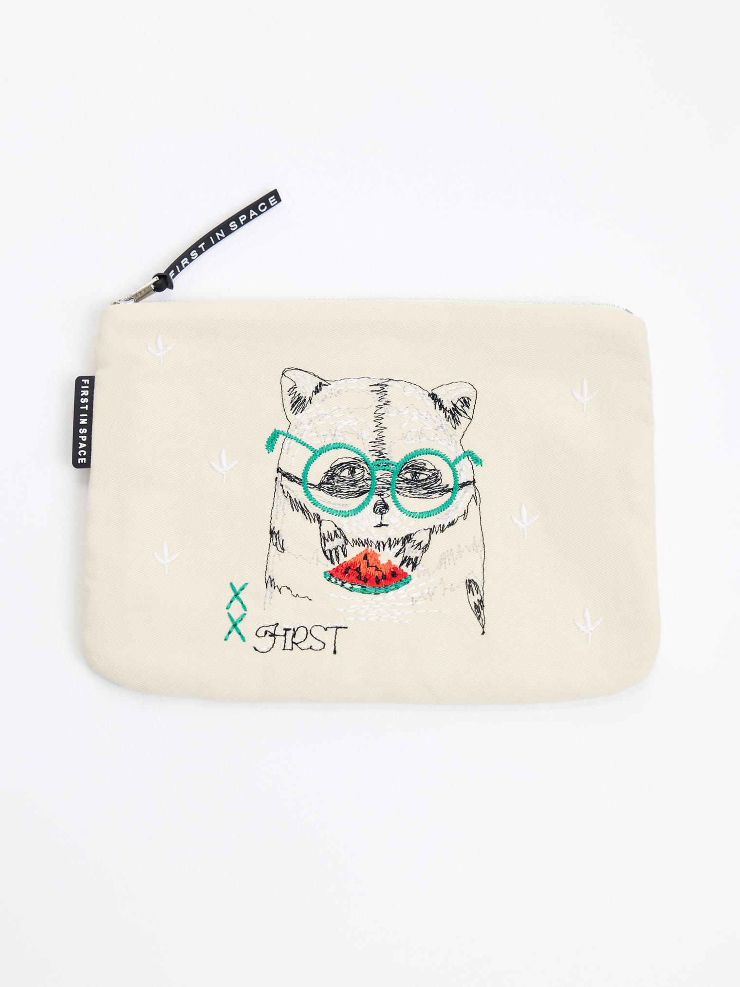 Стильная брендированная косметичка из джинсовой ткани благородного цвета "экрю". Декорирована вышивкой: забавный енот бережно сохранит самые необходимые вещи. Также косметичка может использоваться как пенал для пишущих принадлежностей.