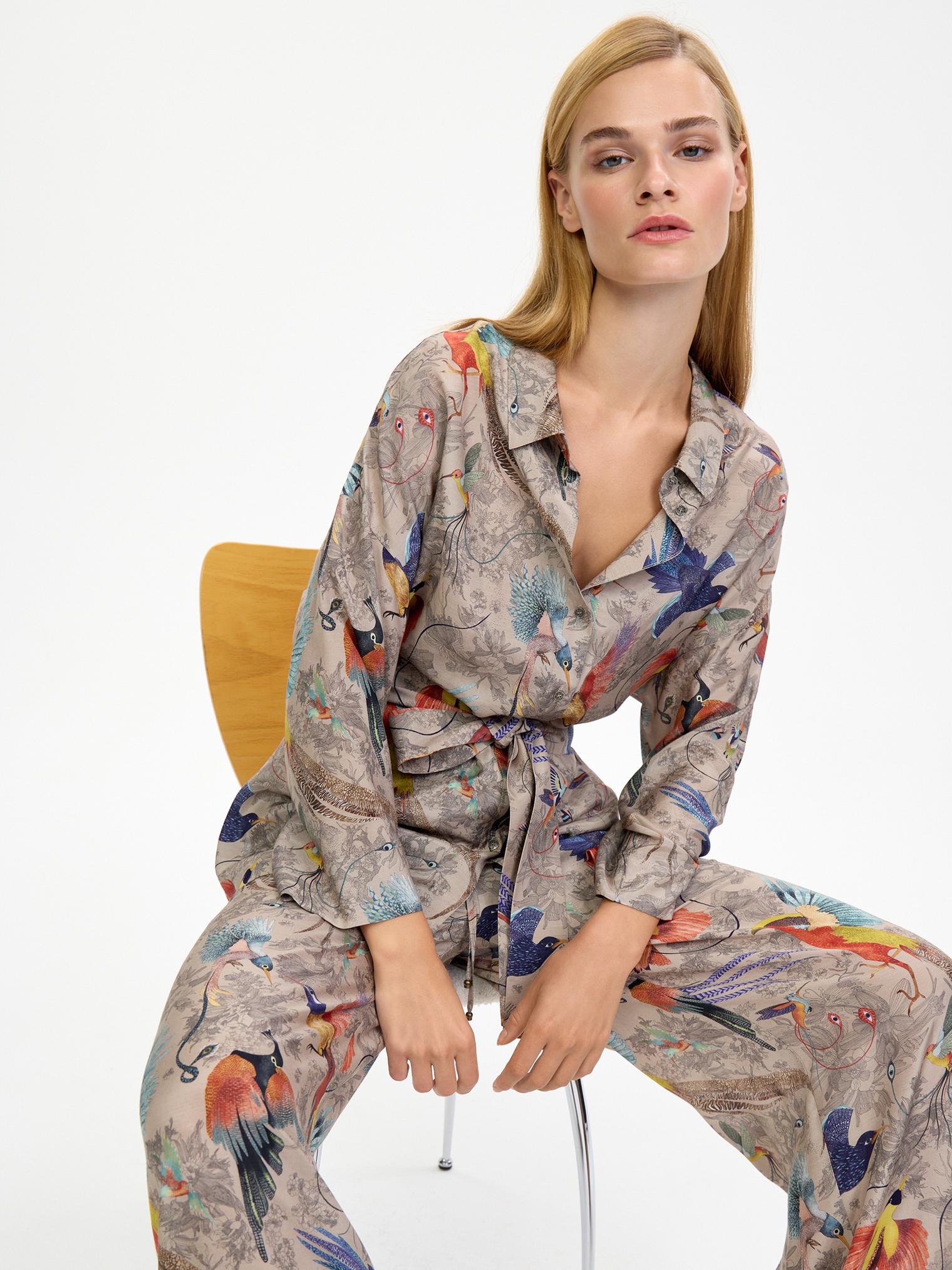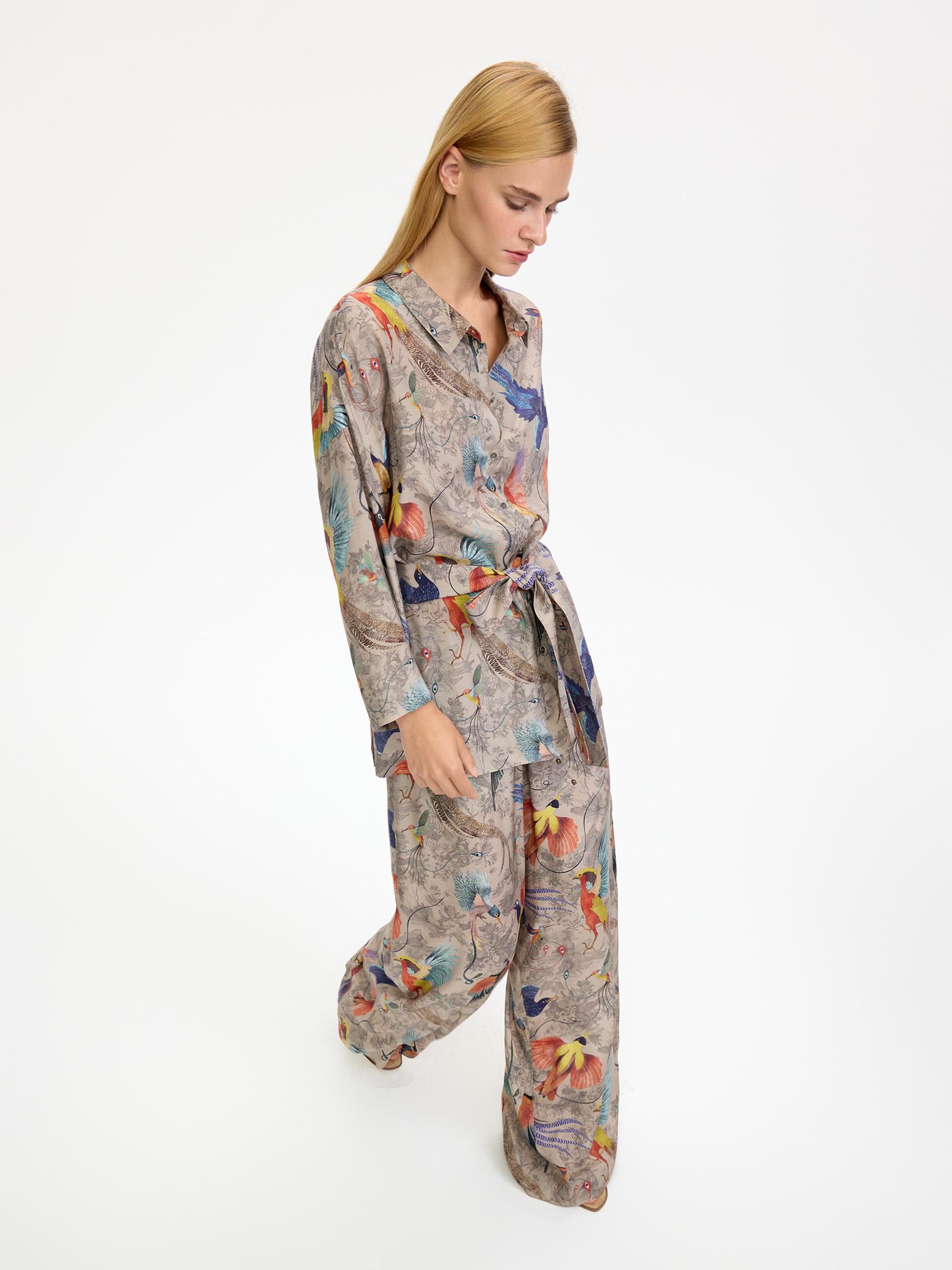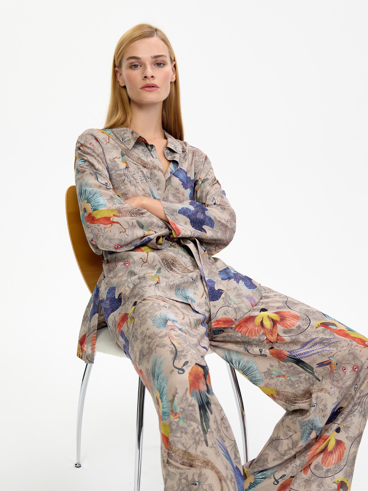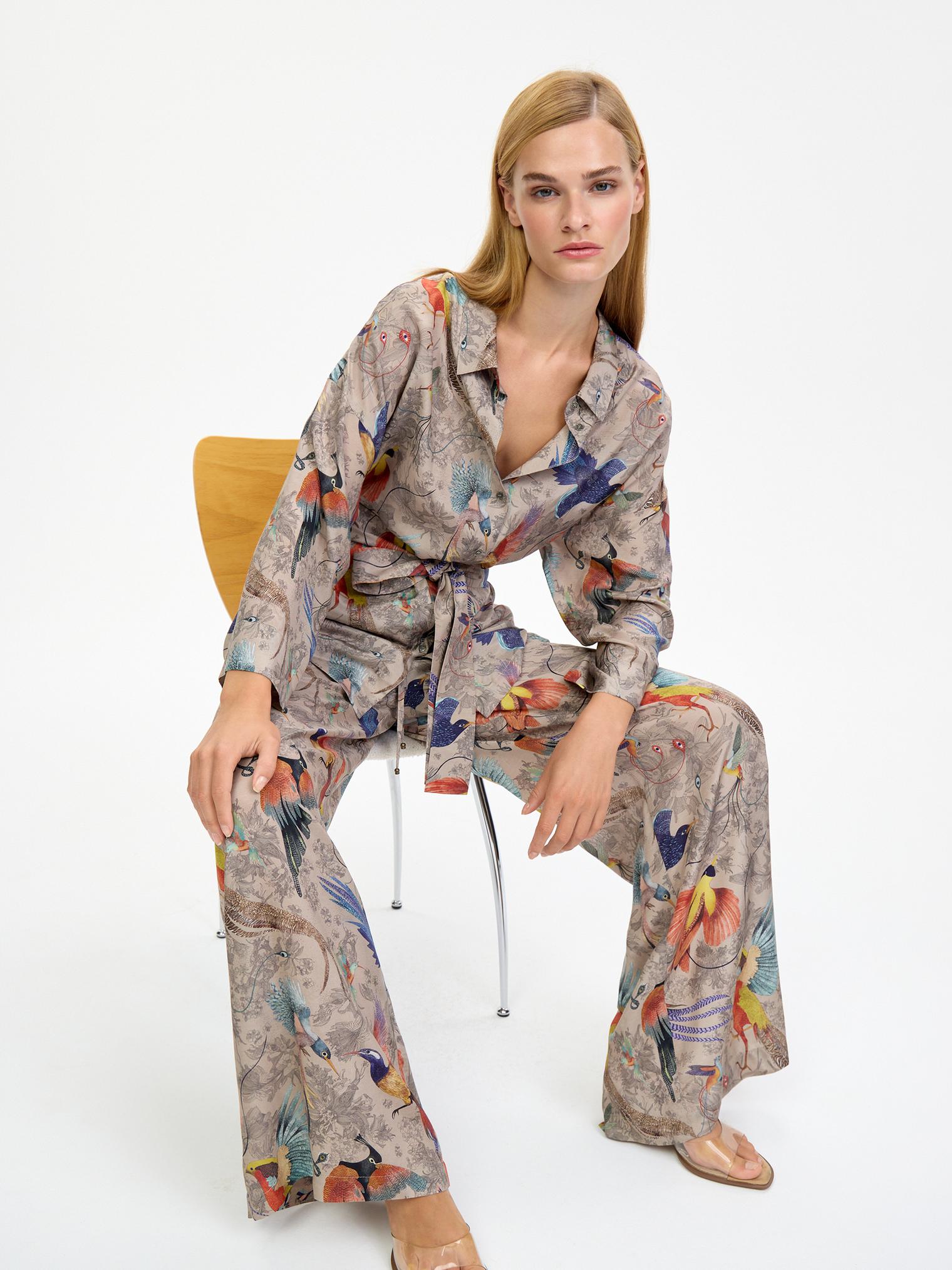 Легкий, невесомый, шелковистый костюм в нежном бежевом цвете с изображением райских птиц – воплощение артистичной свободы!