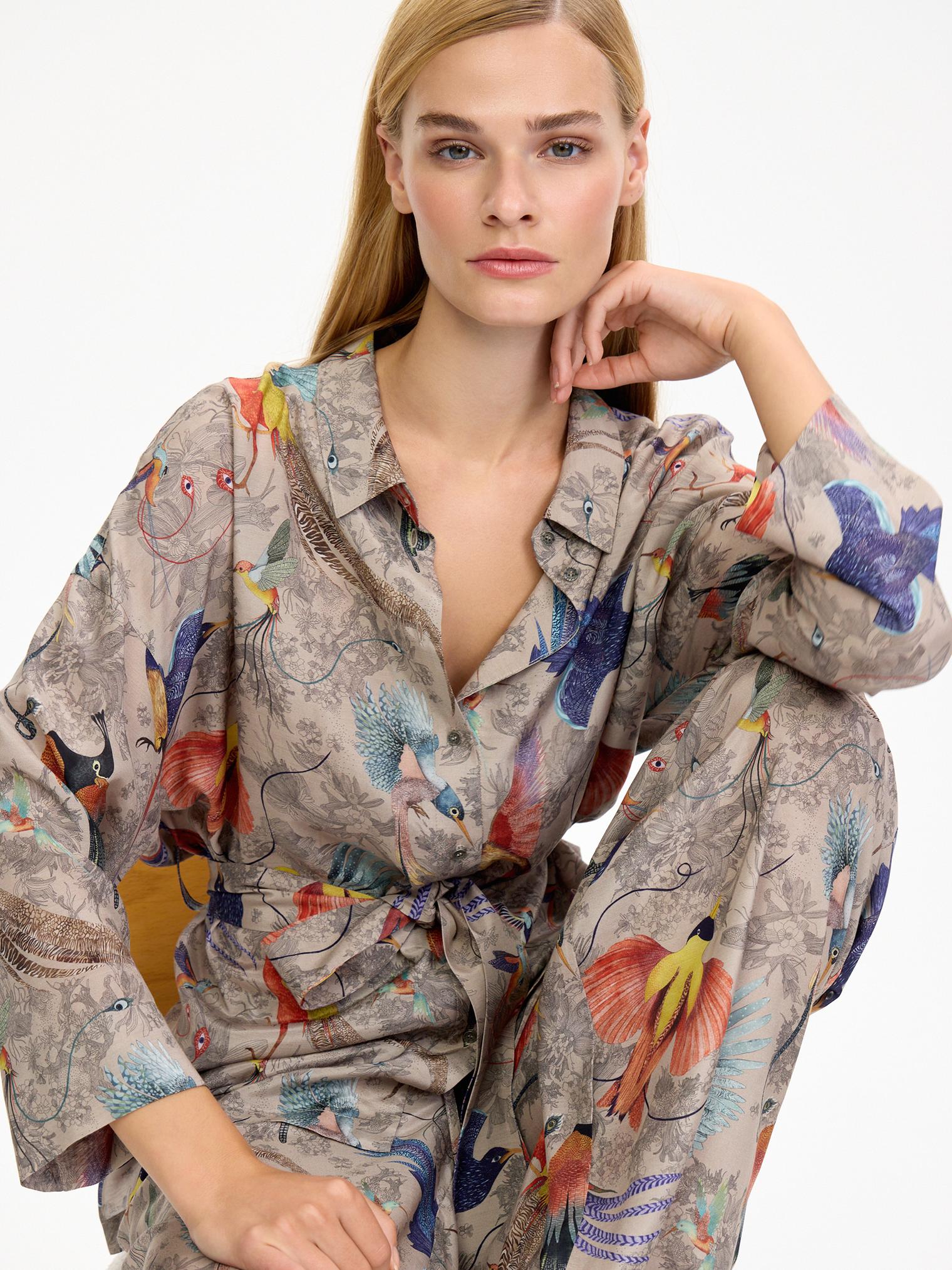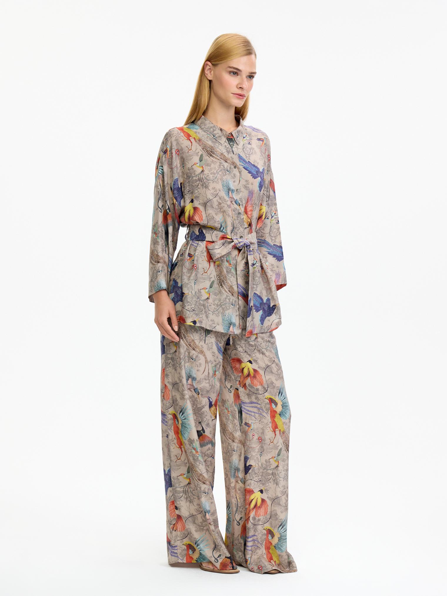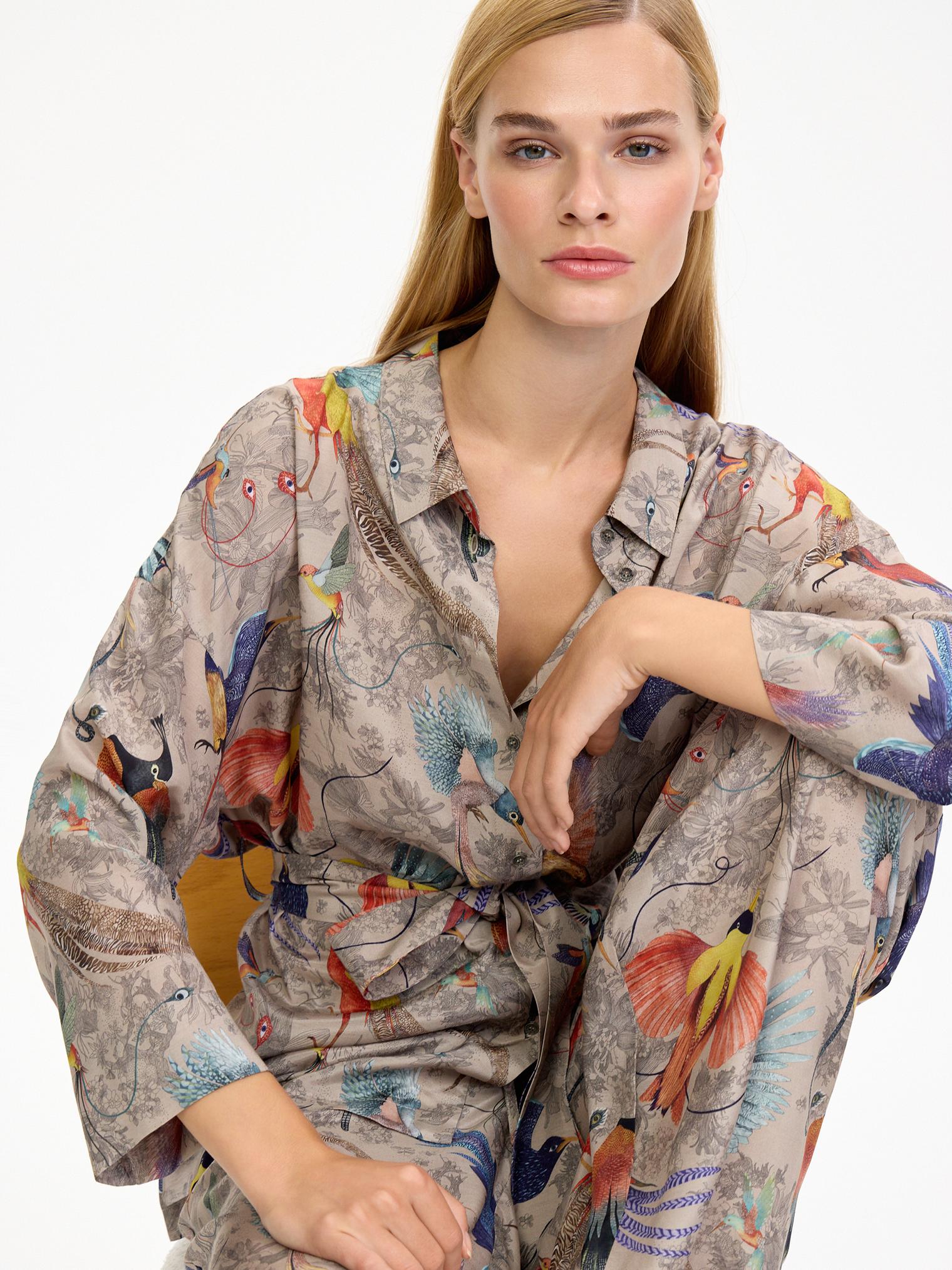 Легкий, невесомый, шелковистый костюм в нежном бежевом цвете с изображением райских птиц – воплощение артистичной свободы!