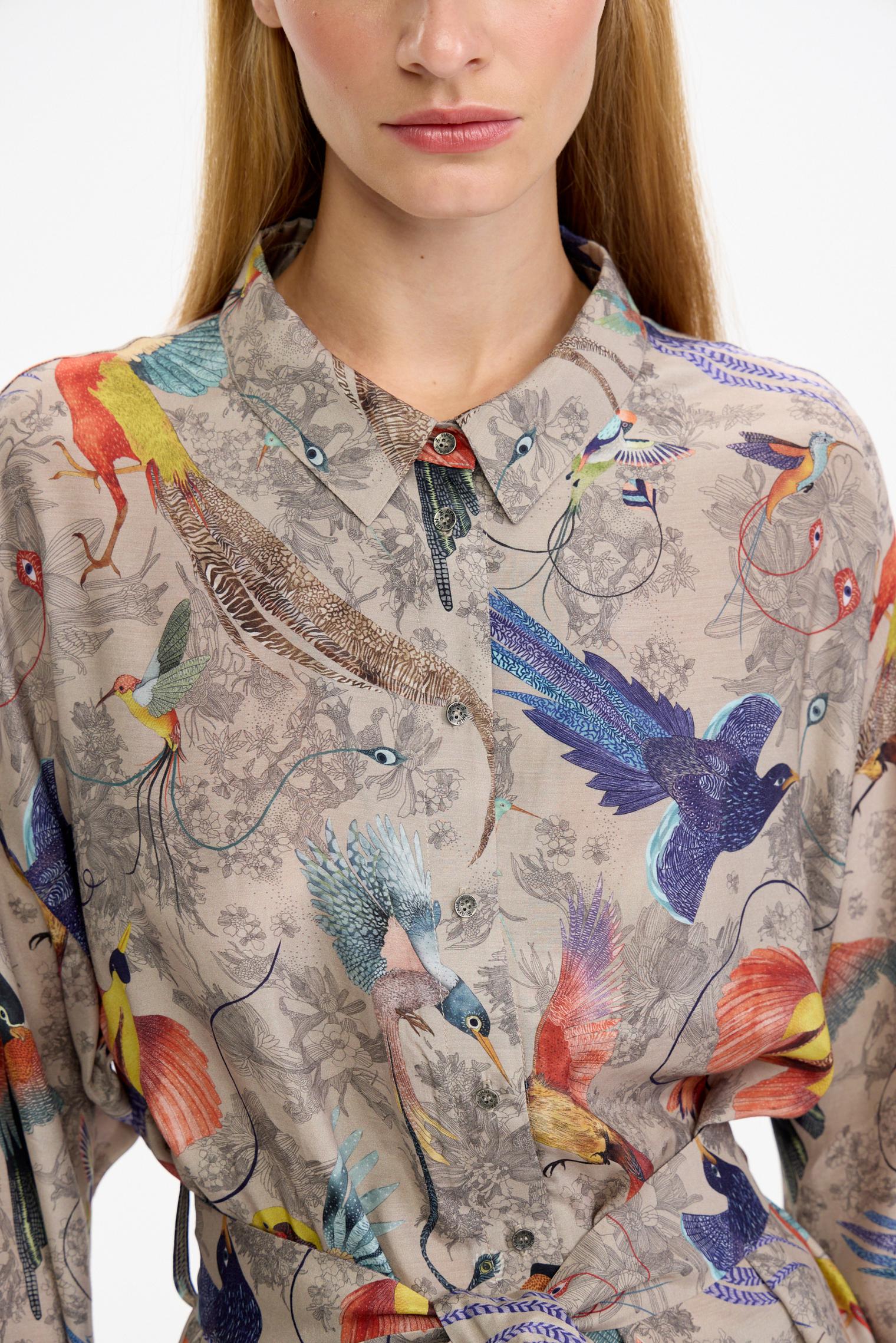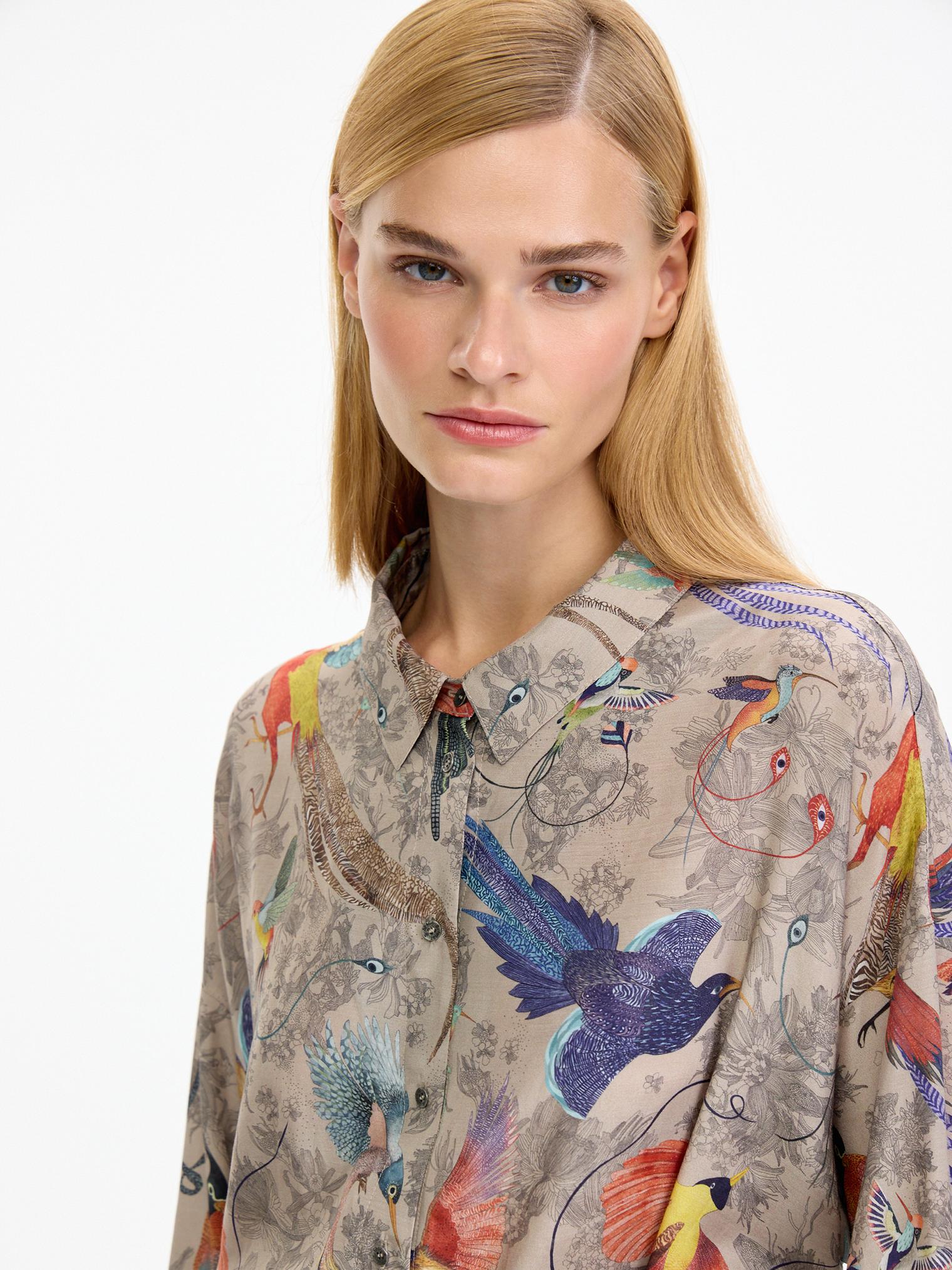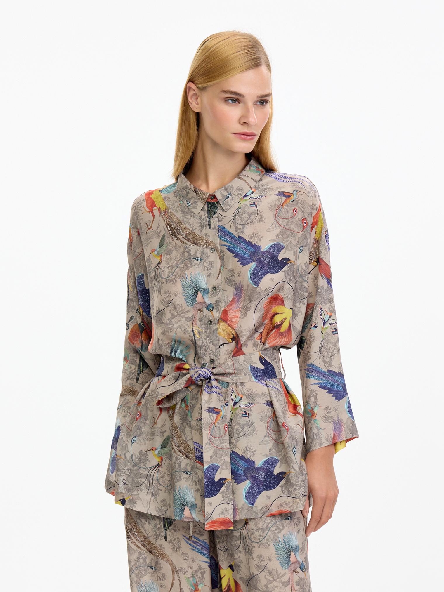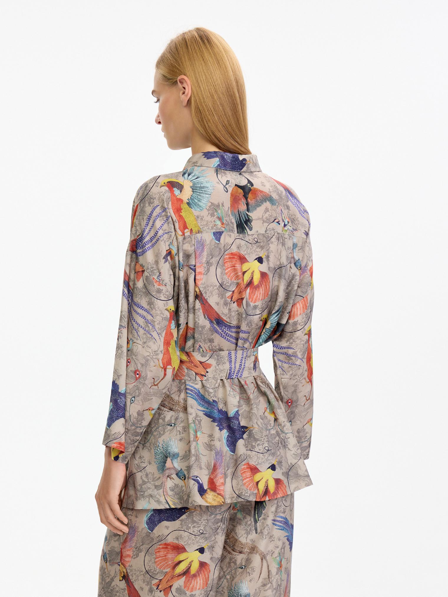 Легкий, невесомый, шелковистый костюм в нежном бежевом цвете с изображением райских птиц – воплощение артистичной свободы!