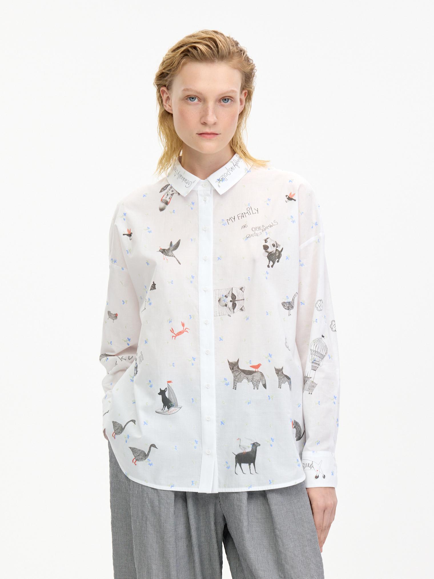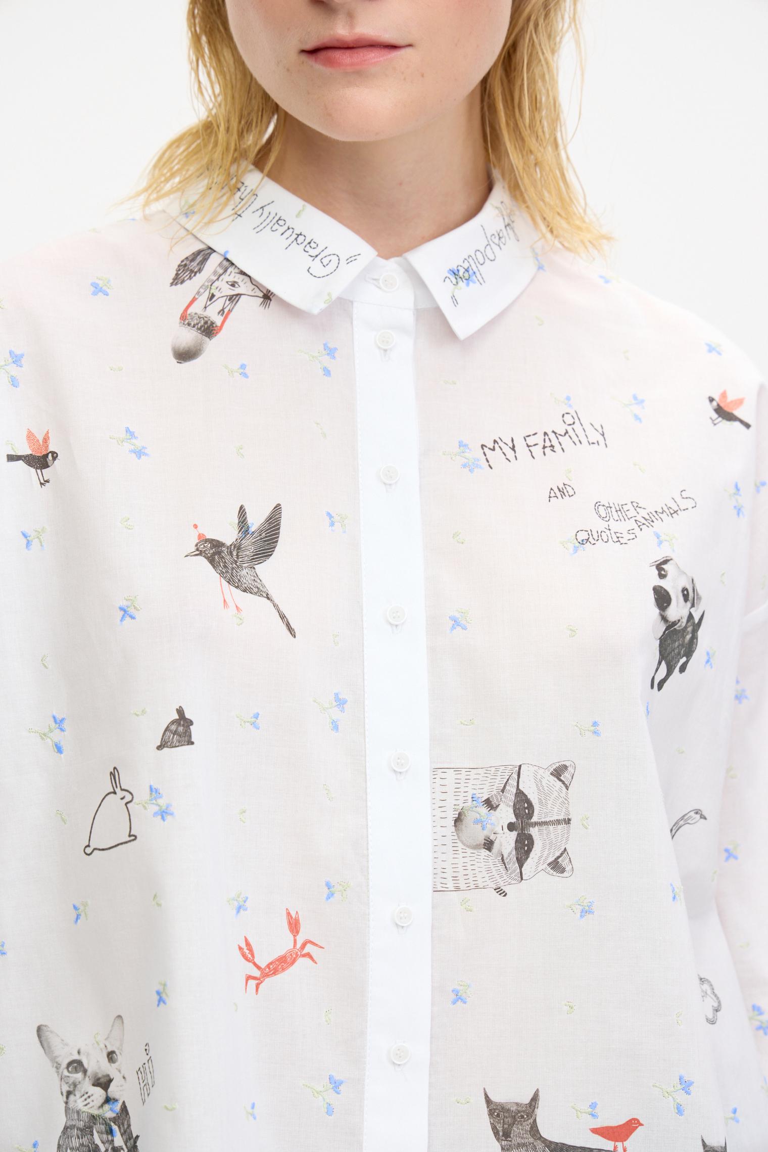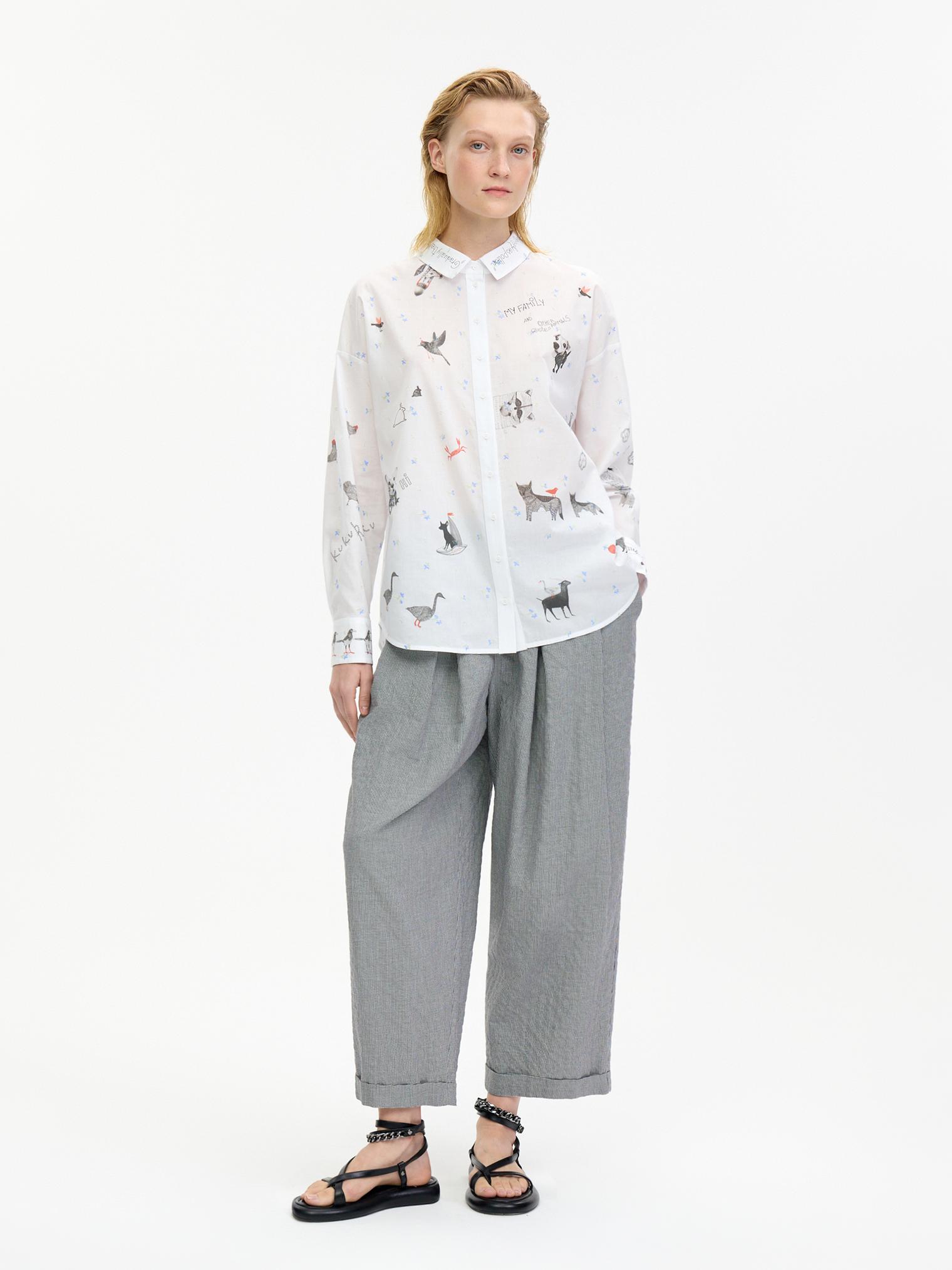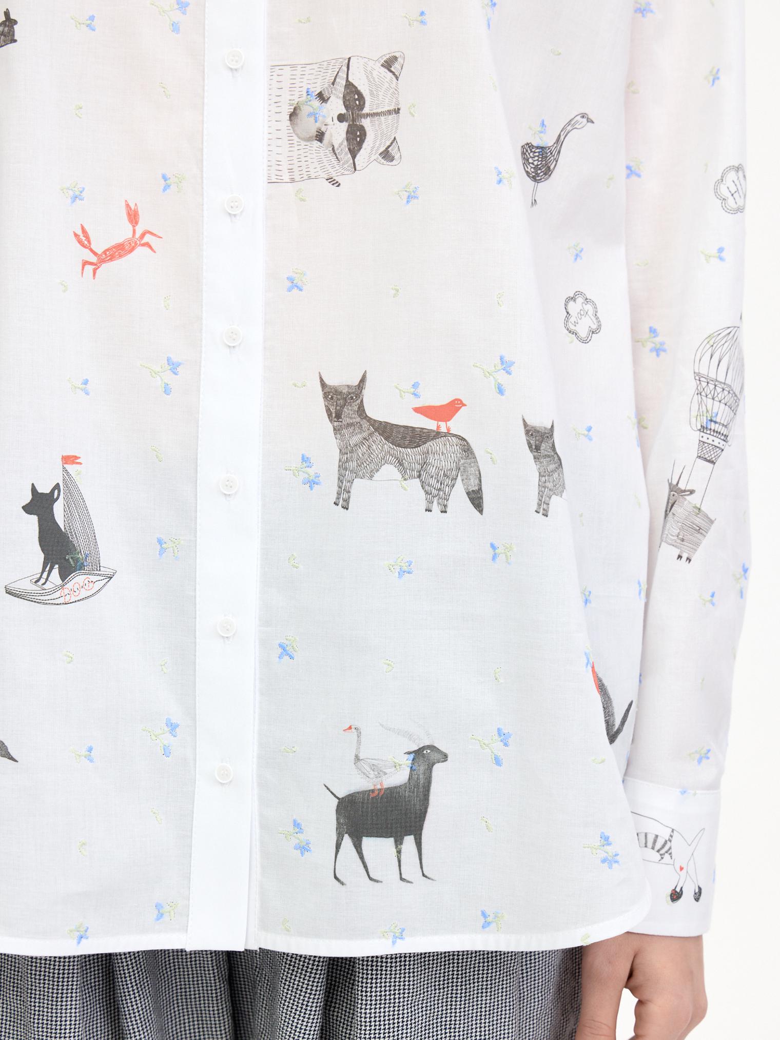 Воздушная блузка свободного объема украшена аккуратной вышивкой, придающей изделию женственности. Графичный принт в виде забавных животных добавляет образу актуальности и создает стильный оригинальный образ.
