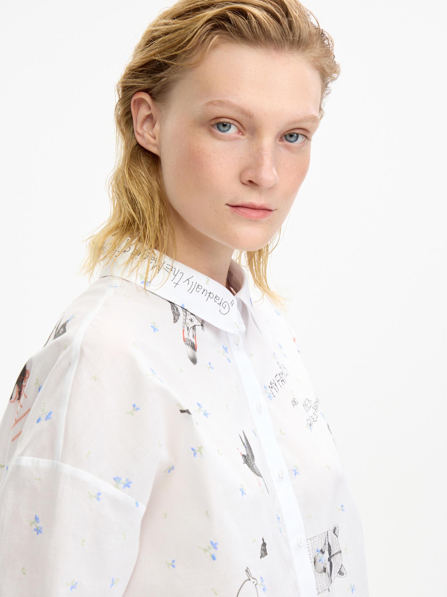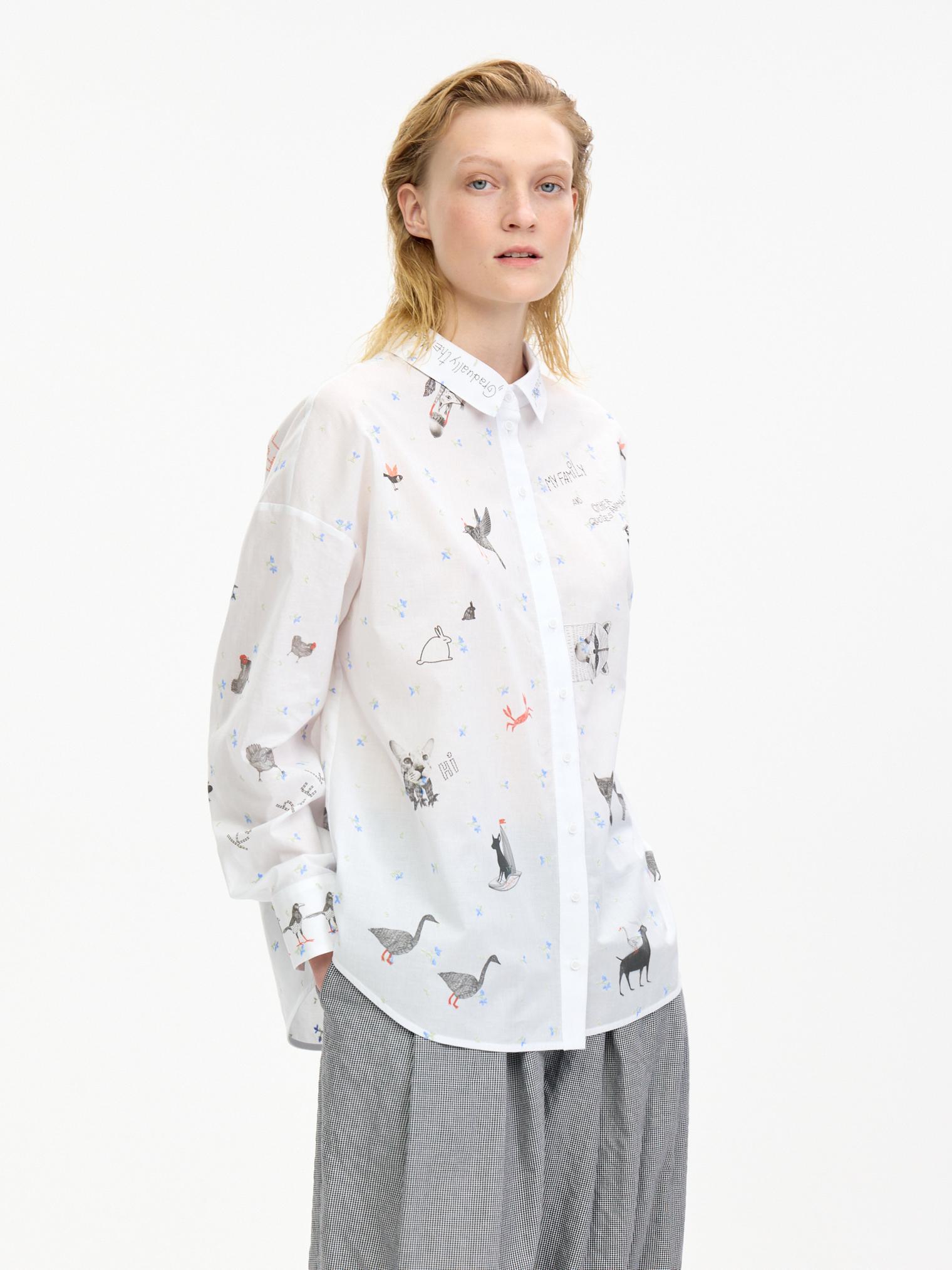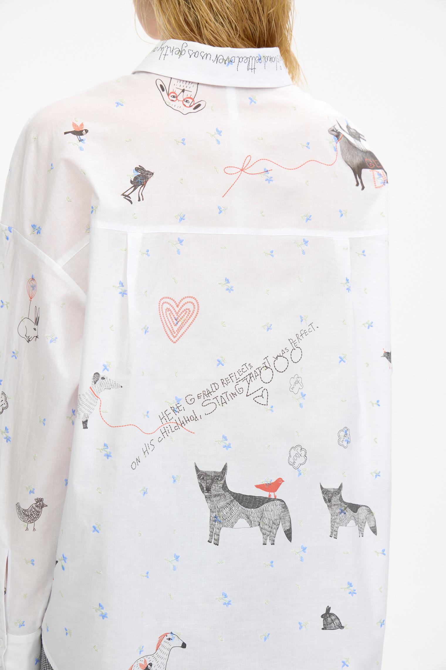 Воздушная блузка свободного объема украшена аккуратной вышивкой, придающей изделию женственности. Графичный принт в виде забавных животных добавляет образу актуальности и создает стильный оригинальный образ.