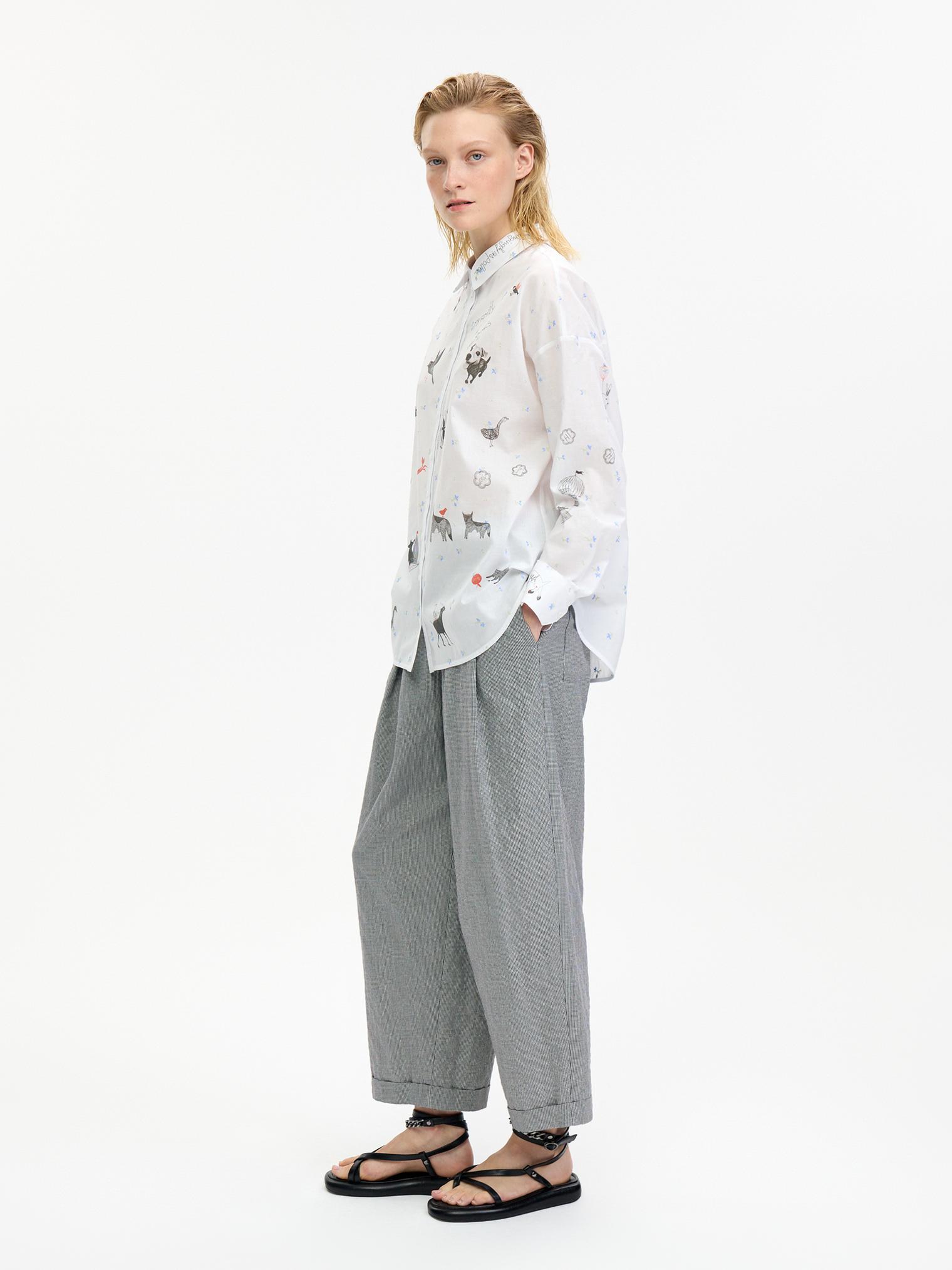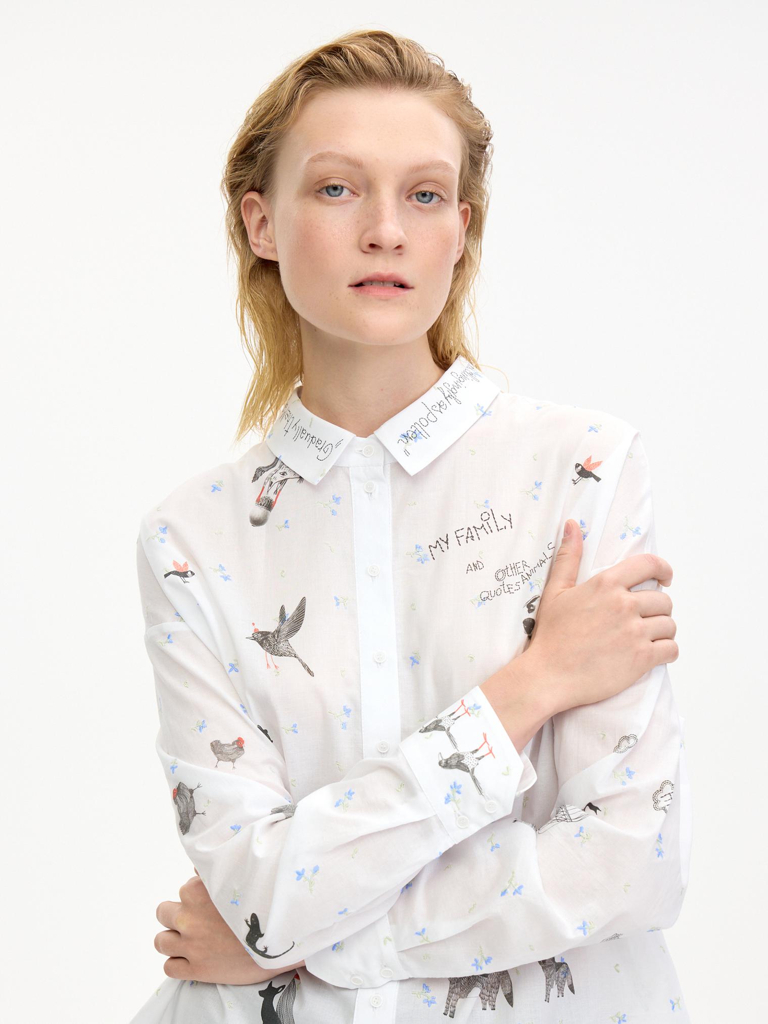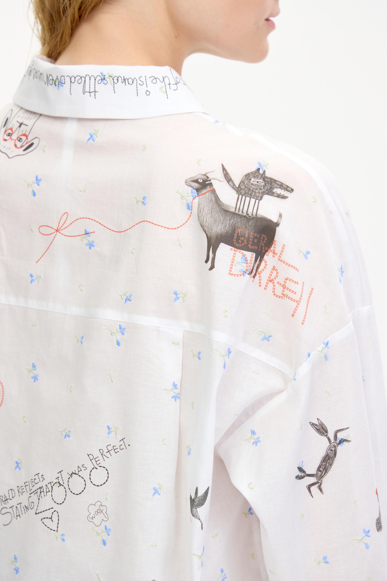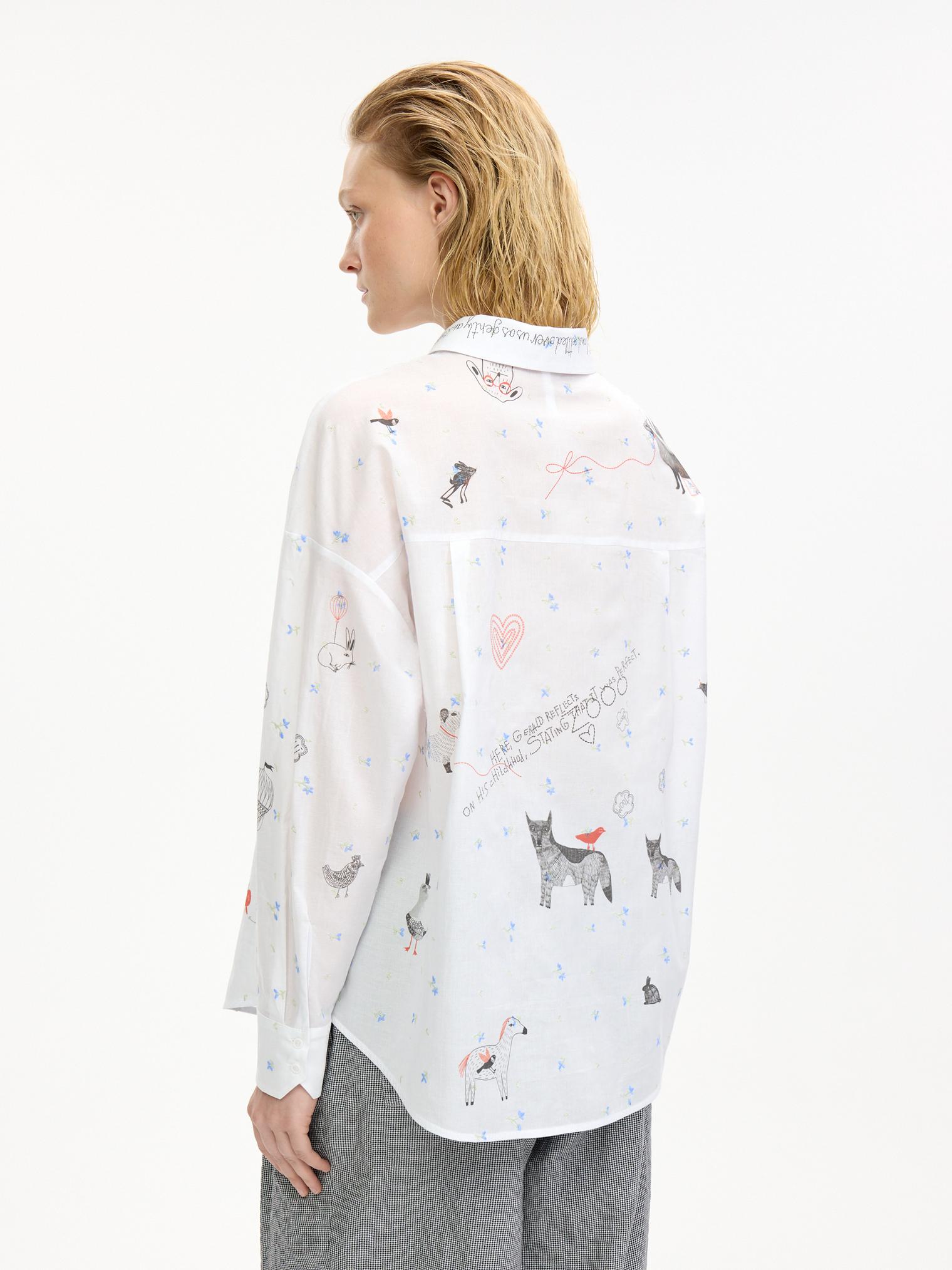Воздушная блузка свободного объема украшена аккуратной вышивкой, придающей изделию женственности. Графичный принт в виде забавных животных добавляет образу актуальности и создает стильный оригинальный образ.