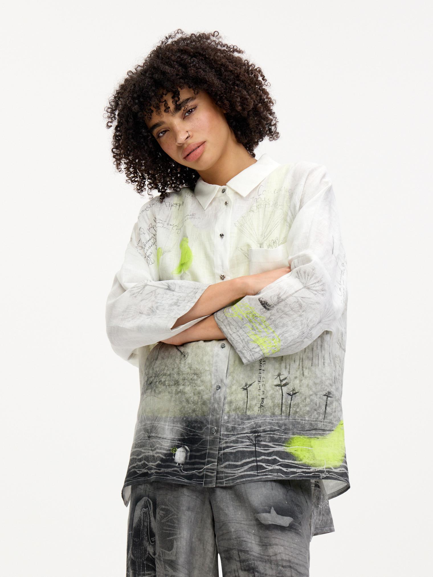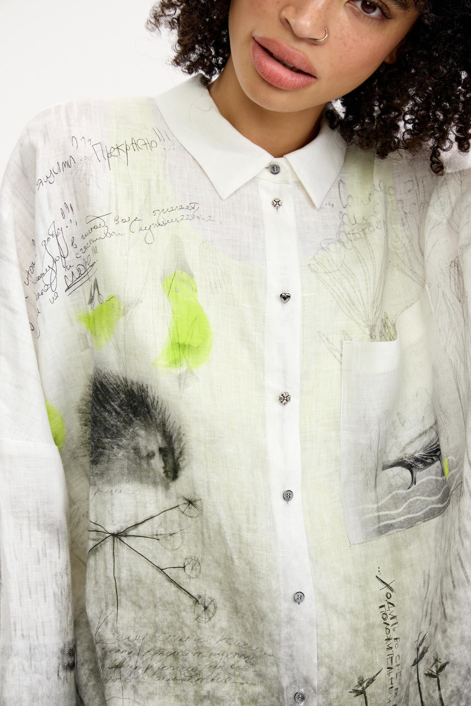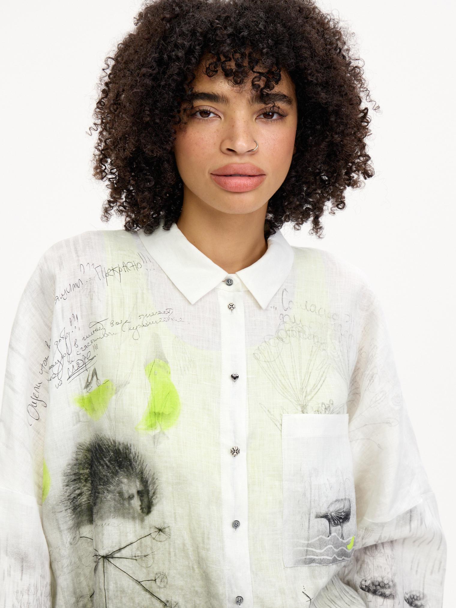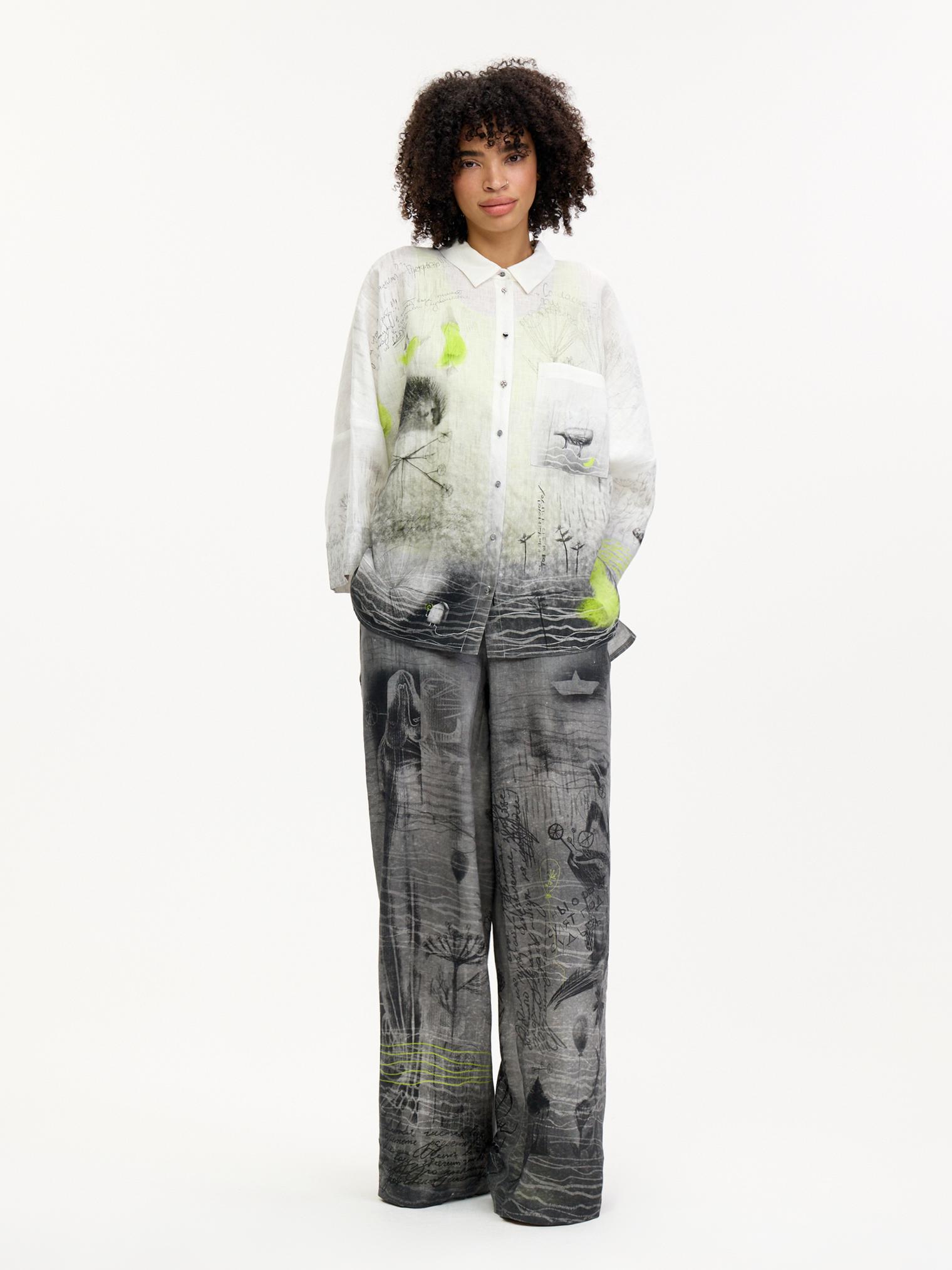 Блузка-рубашка свободного силуэта, выполненная из мягкого дышащего льна. Один из основных акцентов коллекции благодаря своему эксклюзивному дизайнерскому принту. Сочетание настолько идеальное, что достаточно одного взгляда – и вы не сможете с ней расстаться) От дизайнера Лизы: «Эта блузка и брюки 7026-085-09 – история гигантского печального птенца-призрака, который во время потопа нашел свой уплывший дом… Зато его дети несутся радостно за ним. Птенец, кстати, снится к новой жизни…»