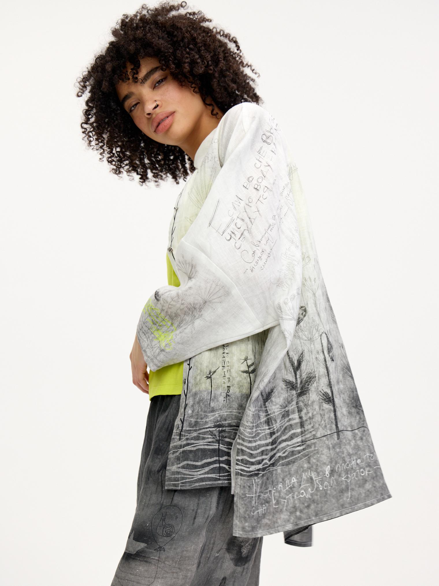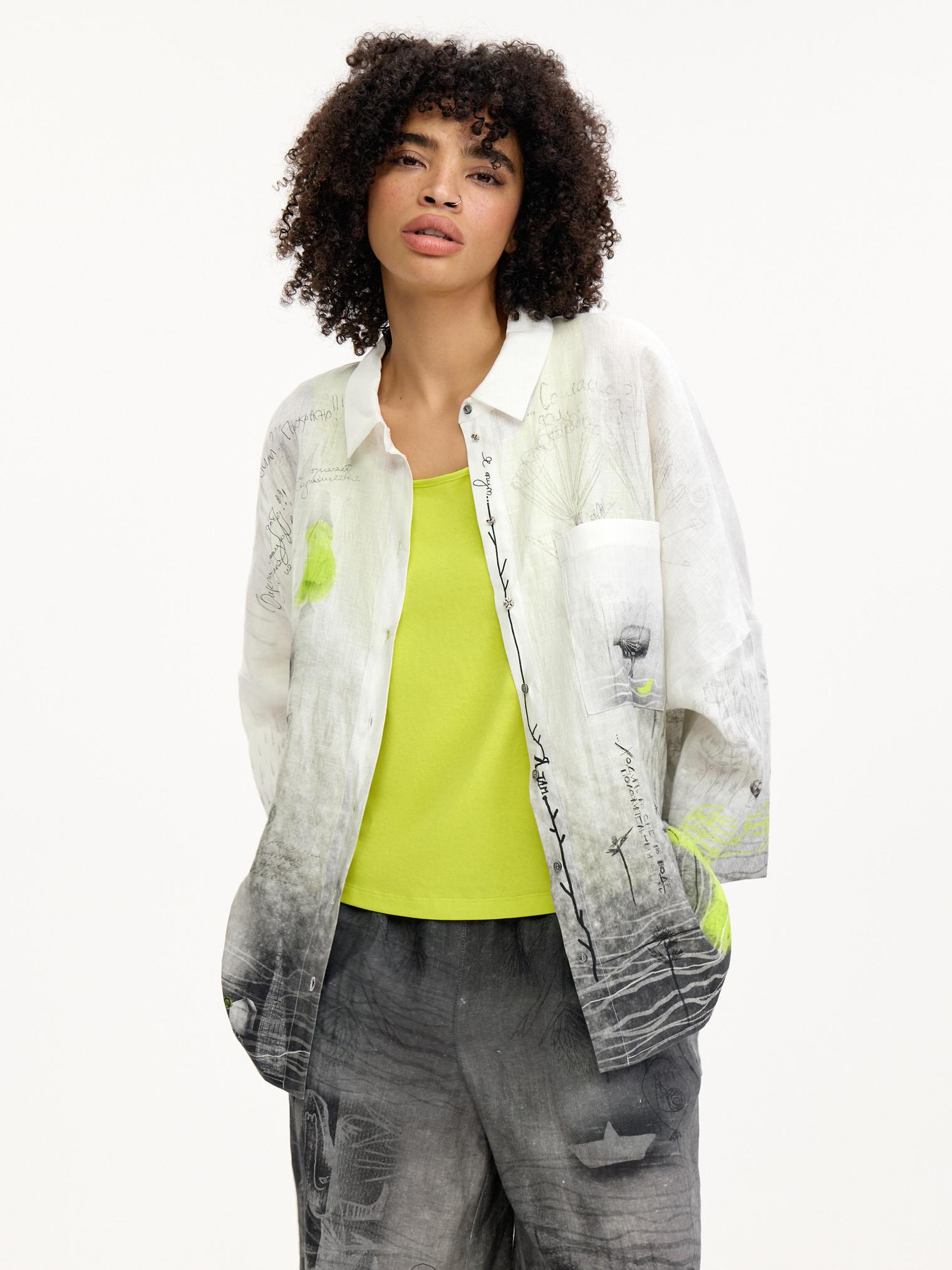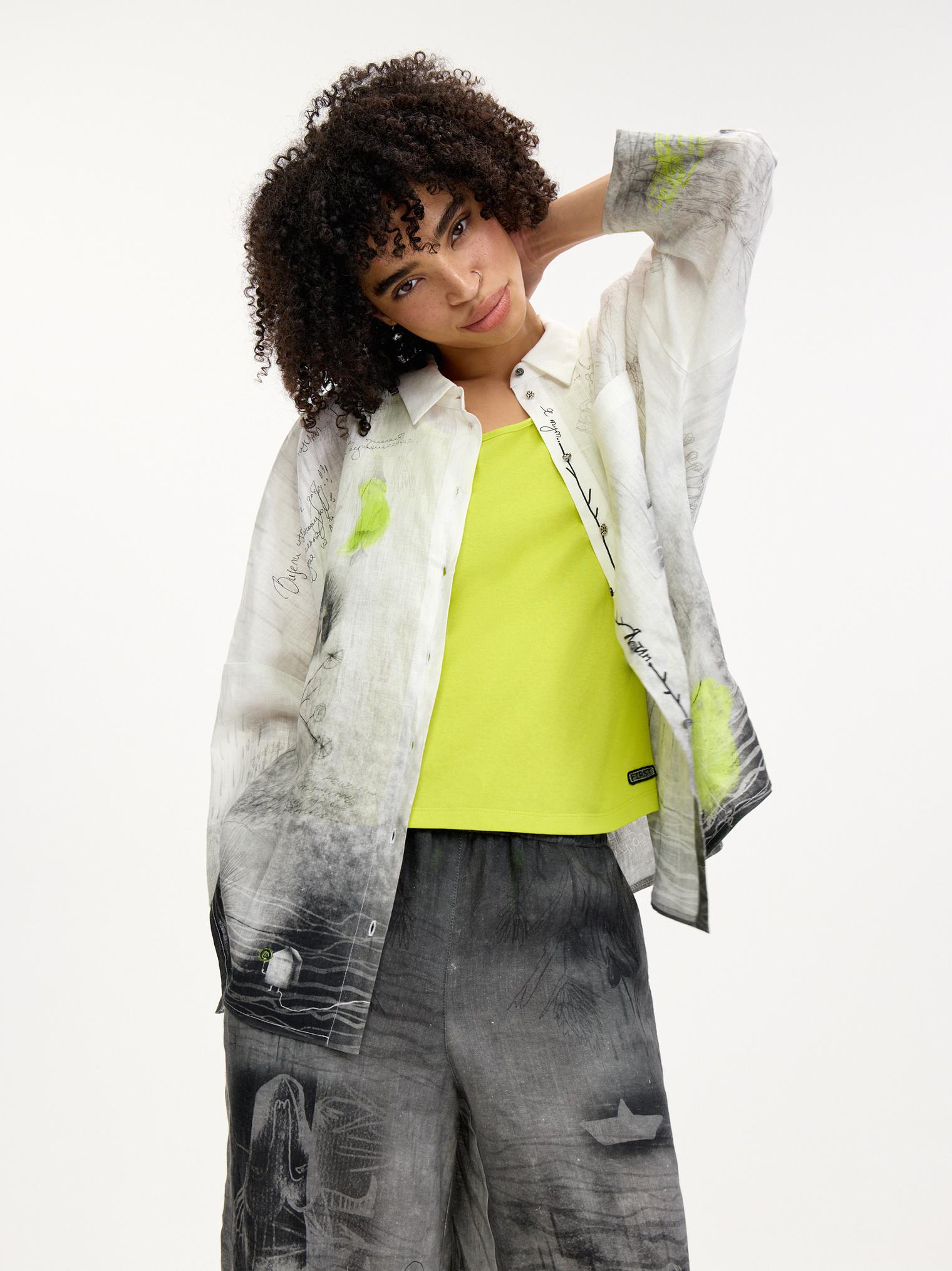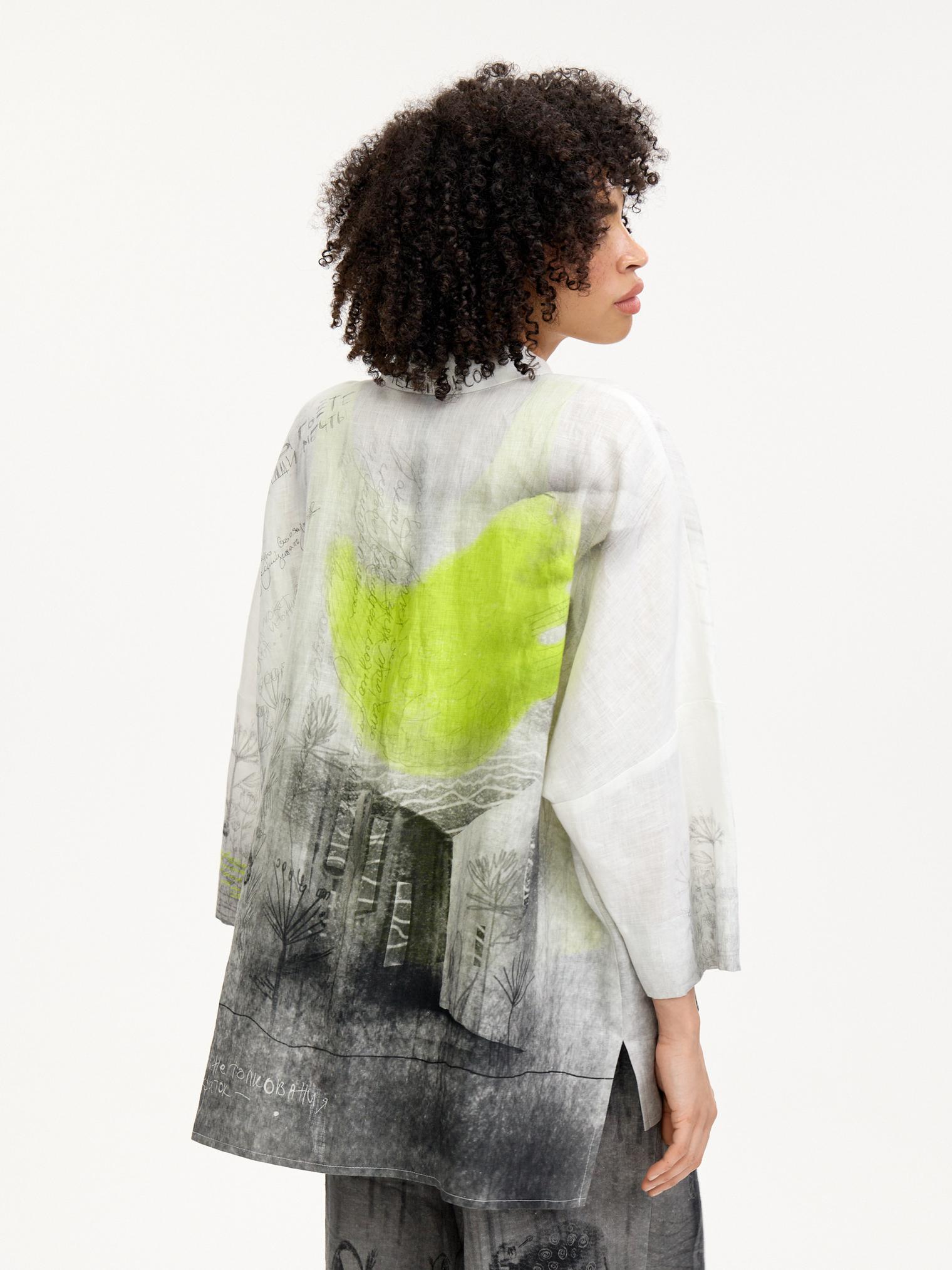 Блузка-рубашка свободного силуэта, выполненная из мягкого дышащего льна. Один из основных акцентов коллекции благодаря своему эксклюзивному дизайнерскому принту. Сочетание настолько идеальное, что достаточно одного взгляда – и вы не сможете с ней расстаться) От дизайнера Лизы: «Эта блузка и брюки 7026-085-09 – история гигантского печального птенца-призрака, который во время потопа нашел свой уплывший дом… Зато его дети несутся радостно за ним. Птенец, кстати, снится к новой жизни…»
