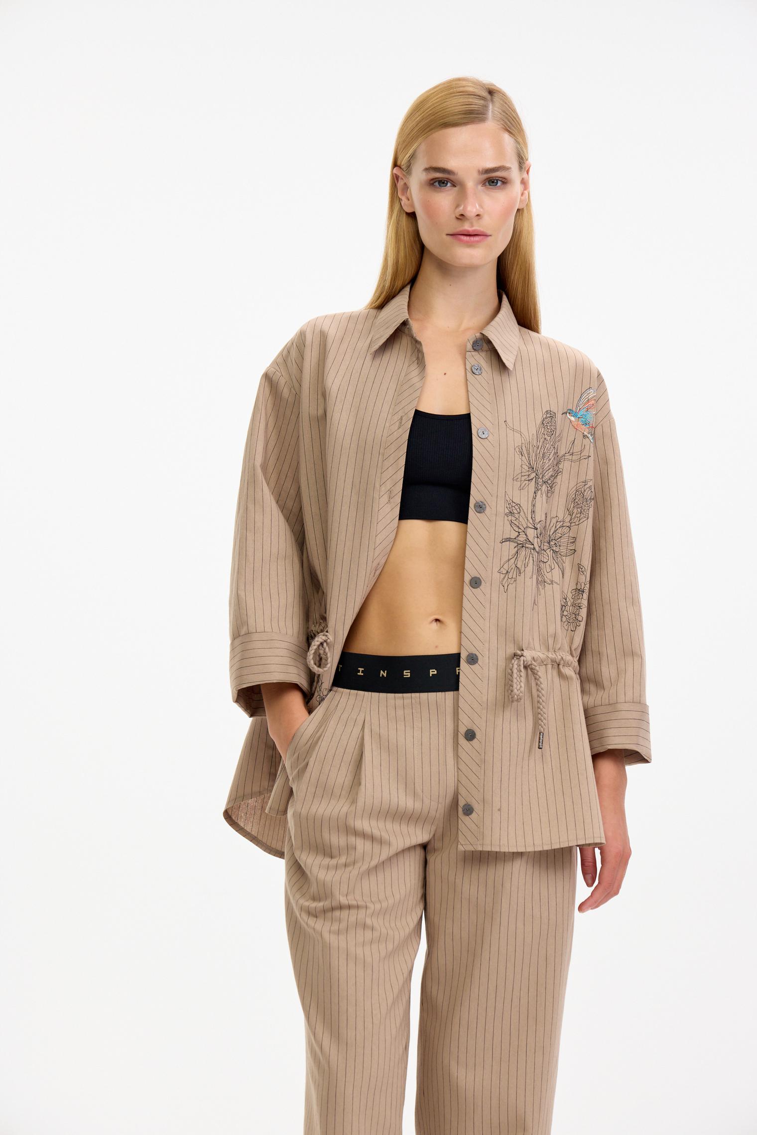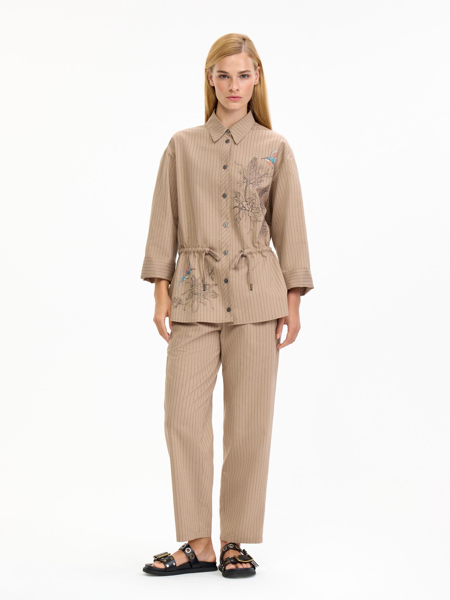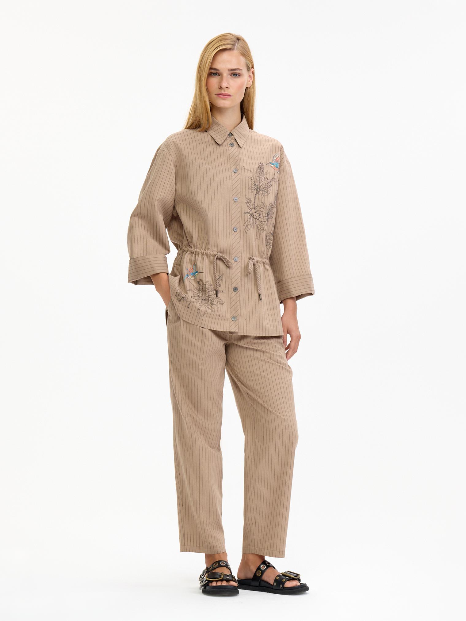 Костюм в классической гамме: бежевый фон оживлен едва заметной полоской. Блузка-жакет объемного силуэта, спущенная линия плеча, застежка на пуговицы. Кулиска по линии талии позволяет трансформировать силуэт. Центральный элемент дизайна - роскошная вышивка, привносящая в образ ноту экзотики и изысканность ручной работы.
