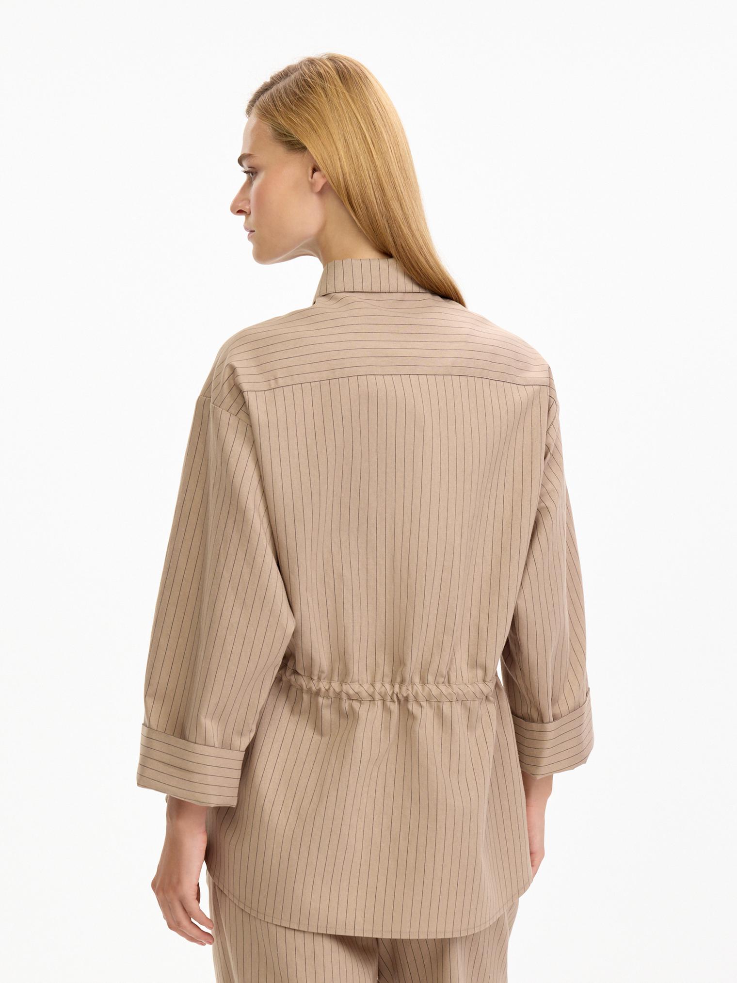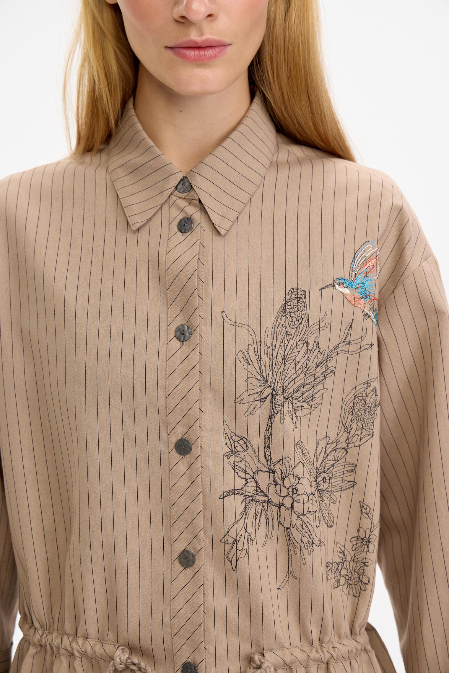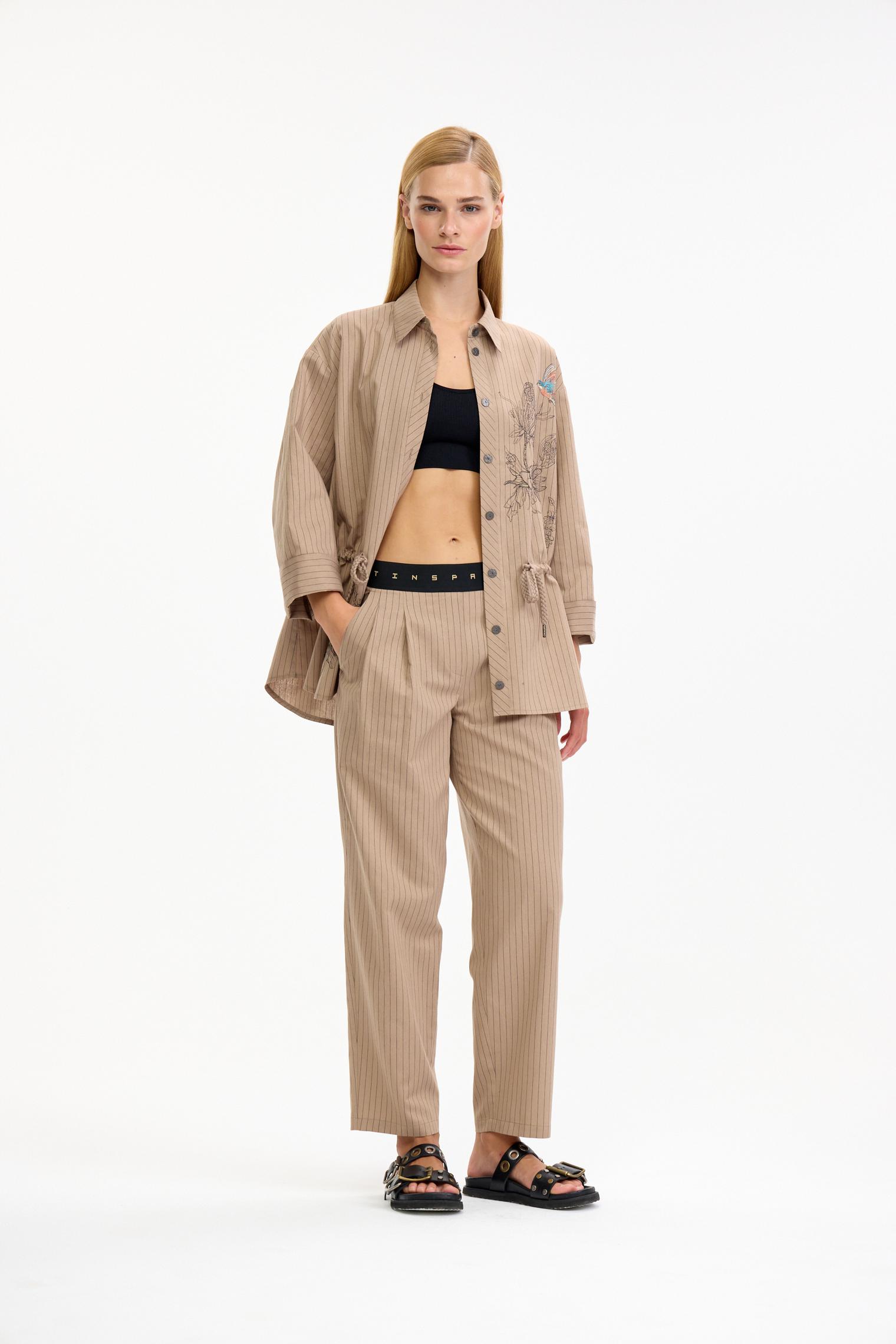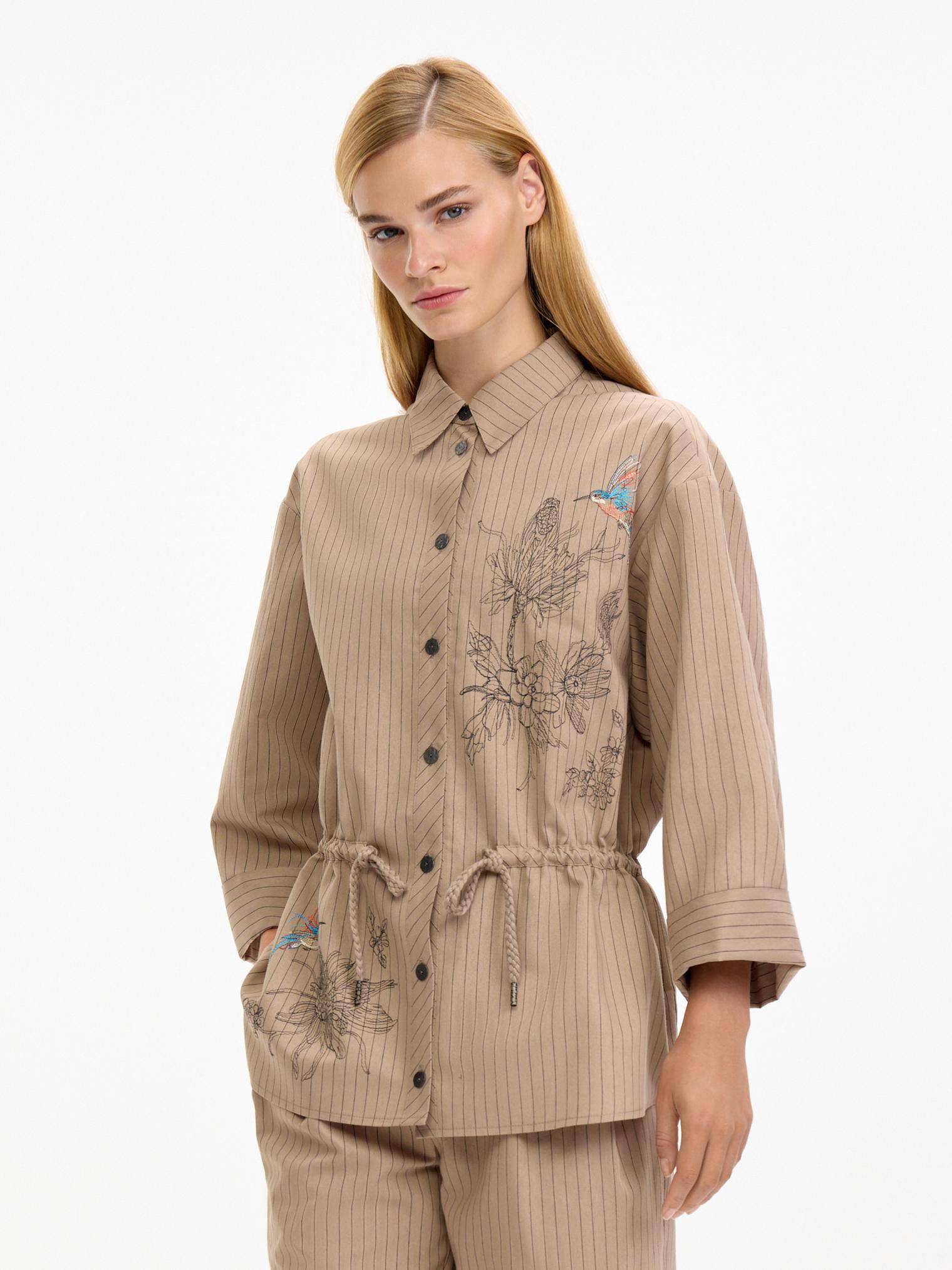 Костюм в классической гамме: бежевый фон оживлен едва заметной полоской. Блузка-жакет объемного силуэта, спущенная линия плеча, застежка на пуговицы. Кулиска по линии талии позволяет трансформировать силуэт. Центральный элемент дизайна - роскошная вышивка, привносящая в образ ноту экзотики и изысканность ручной работы.