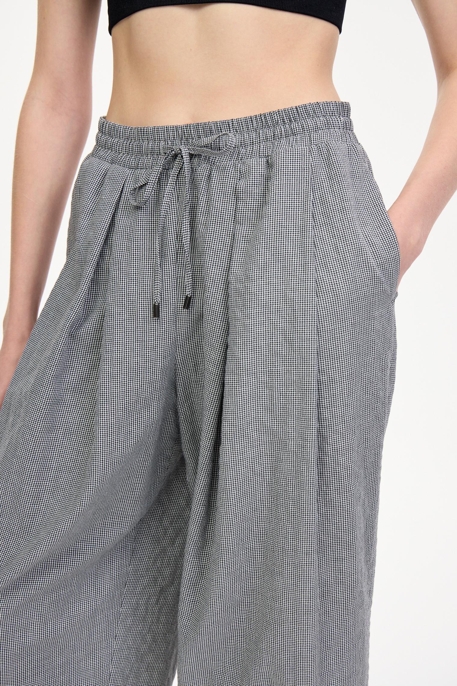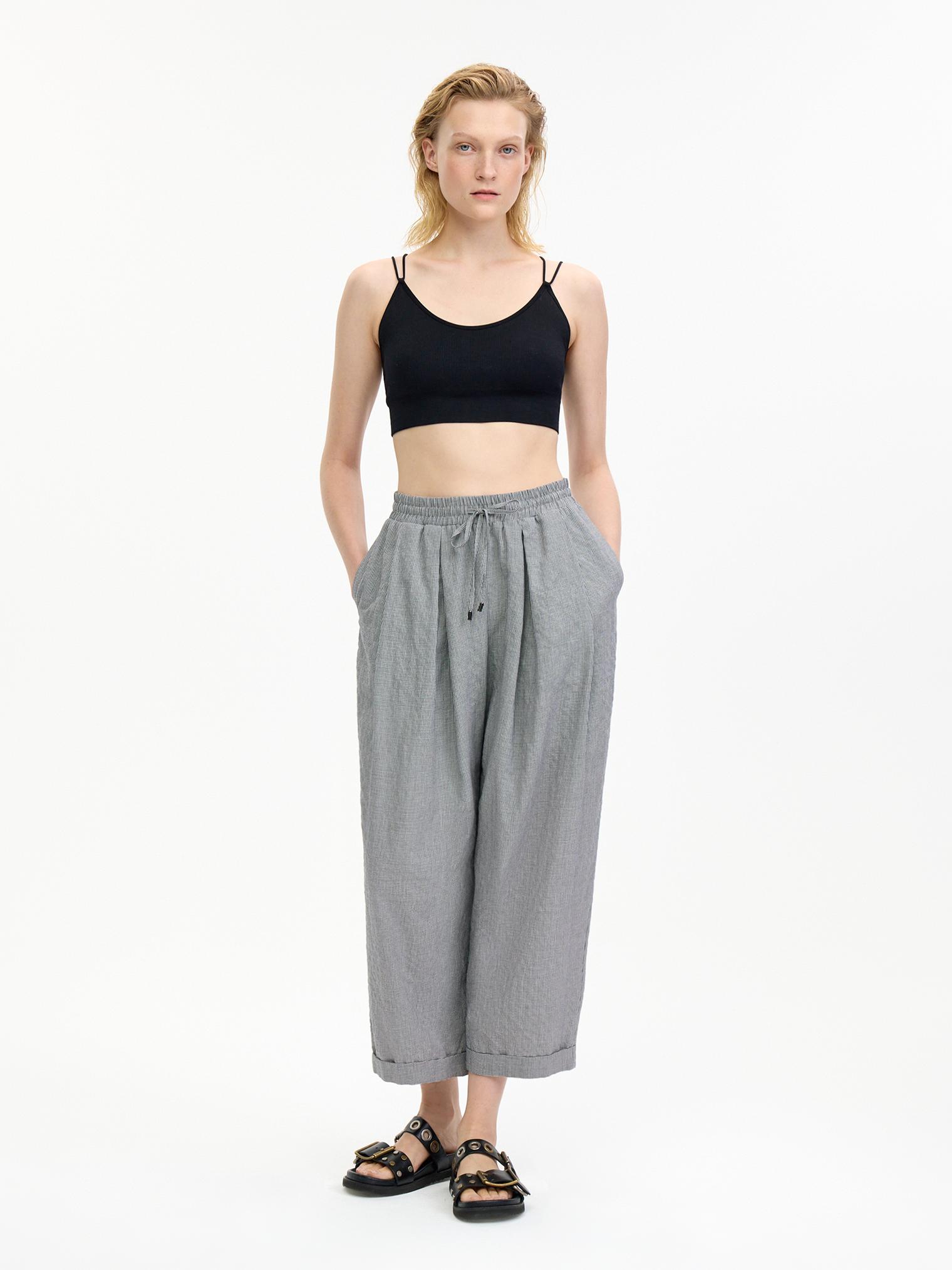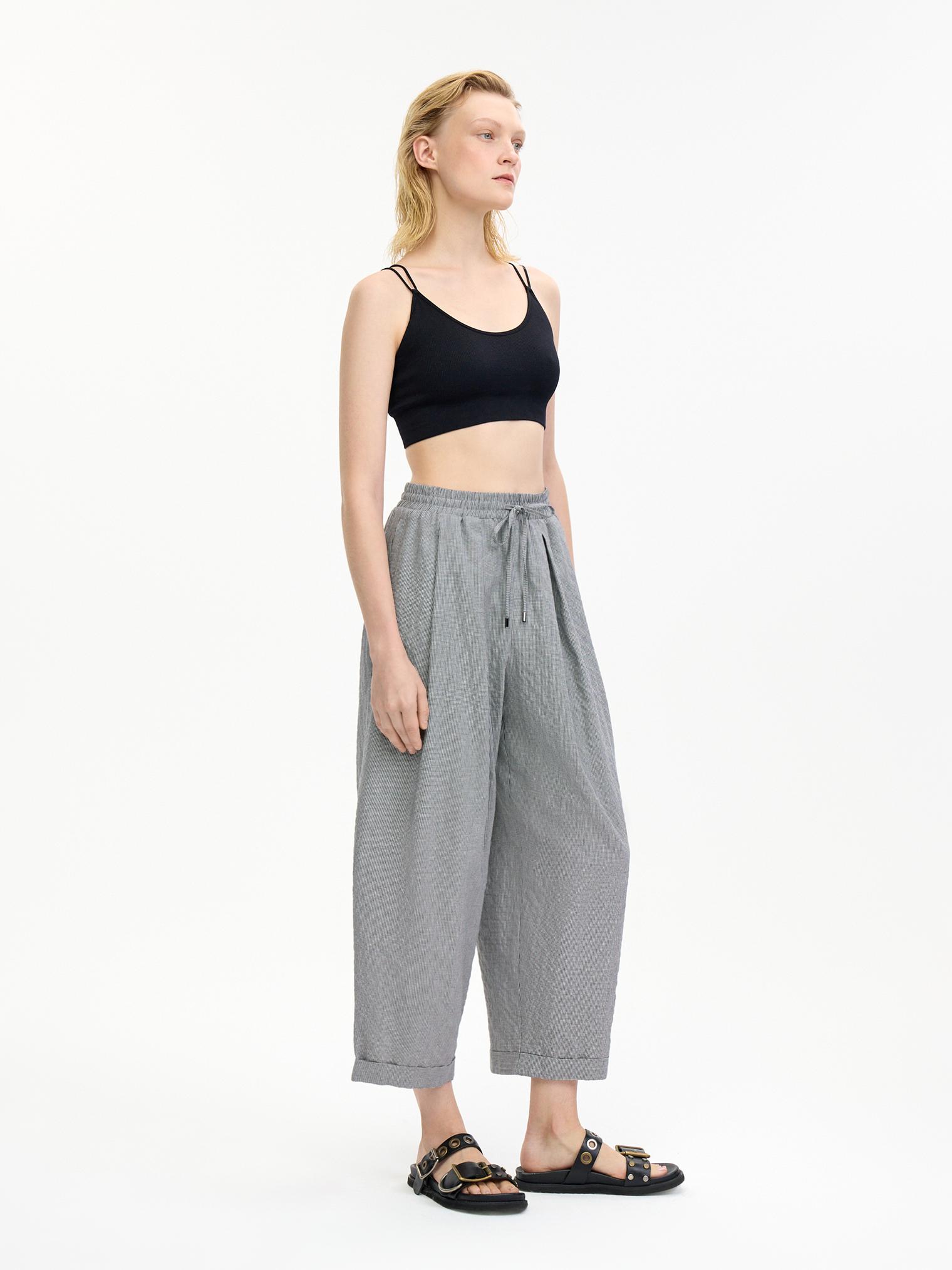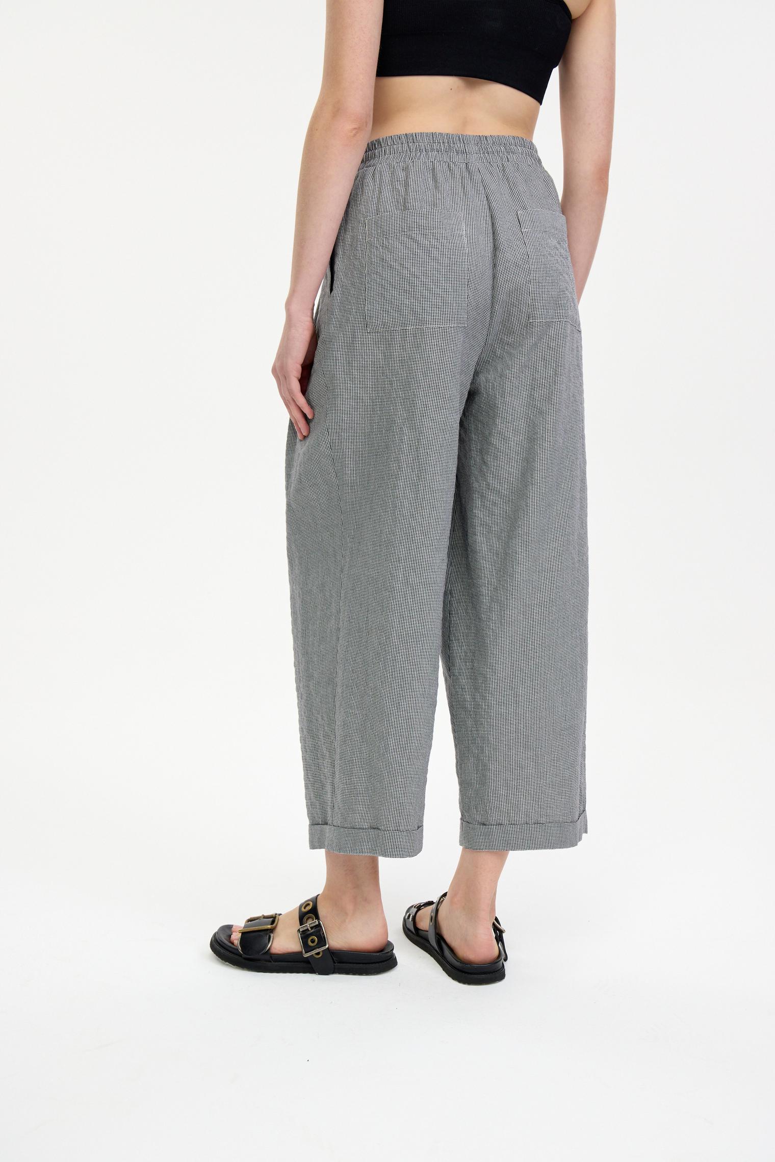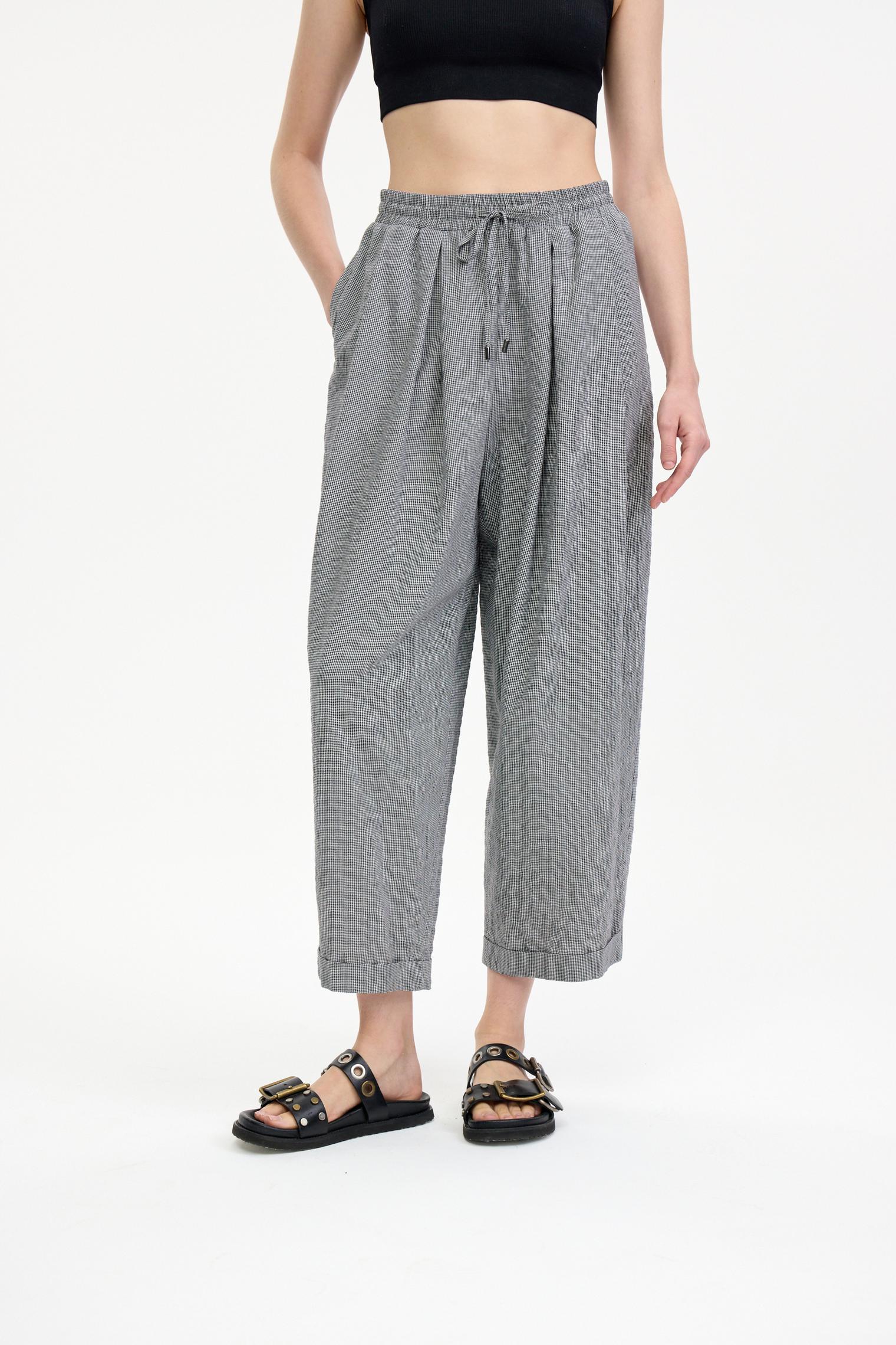 Стильные брюки из легкой хлопковой ткани с эффектом "крэш" и кулиской, регулирующей посадку на талии – идеальный выбор для создания расслабленного летнего образа. Складки на передних половинках добавляют объем и динамику, подчеркивая силуэт. Укороченная длина — актуальное летнее решение.