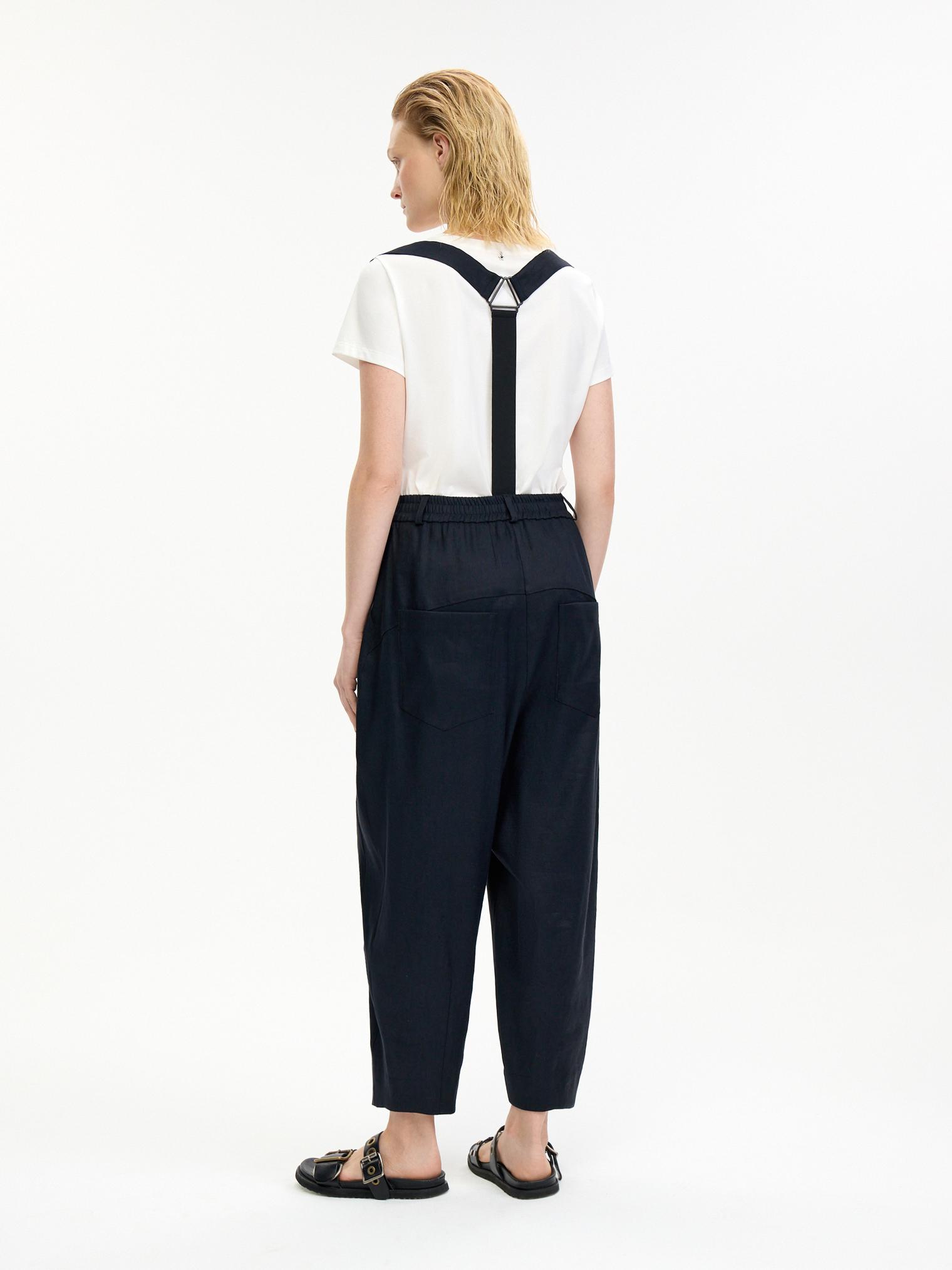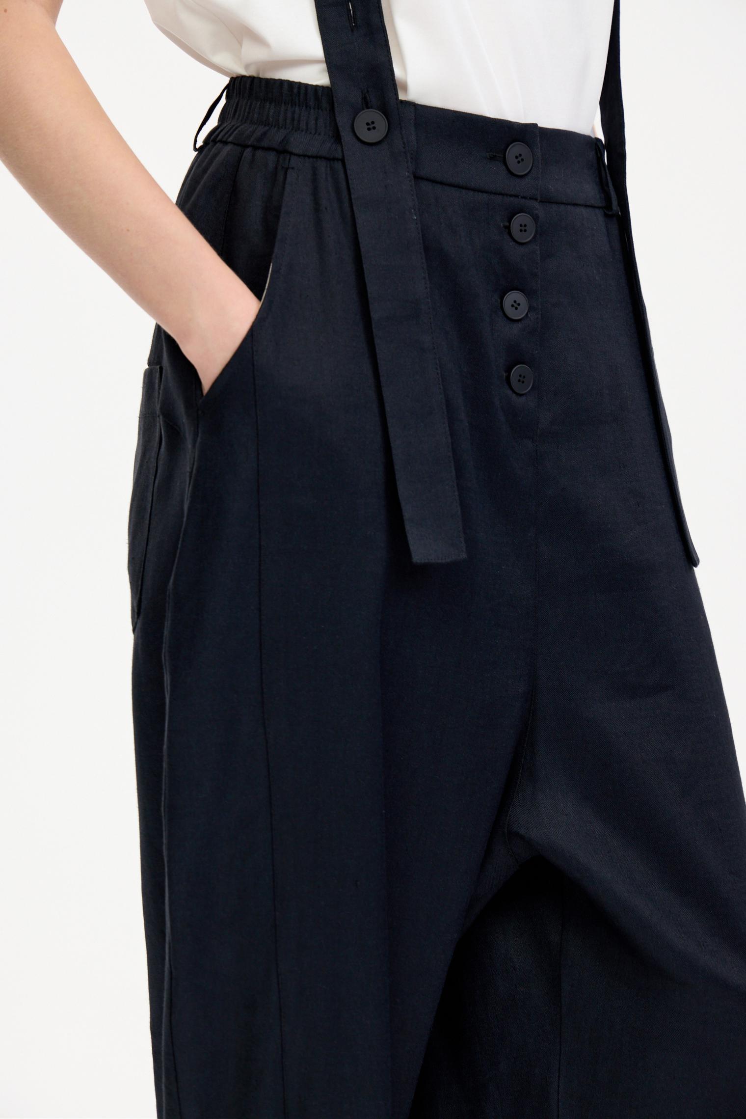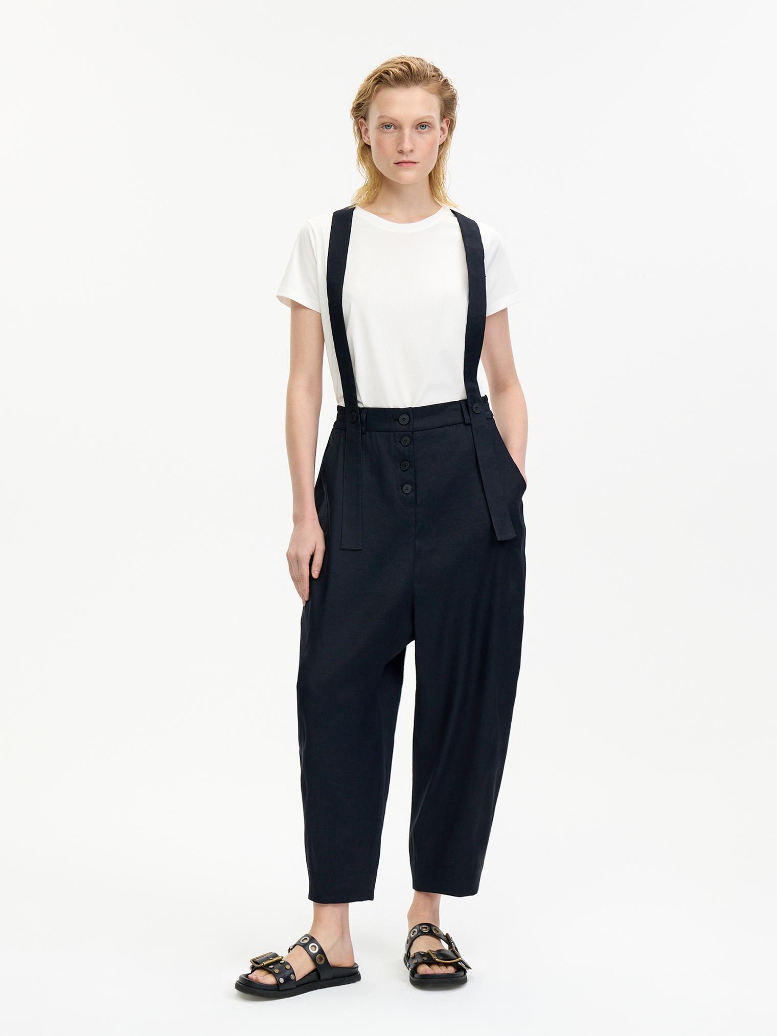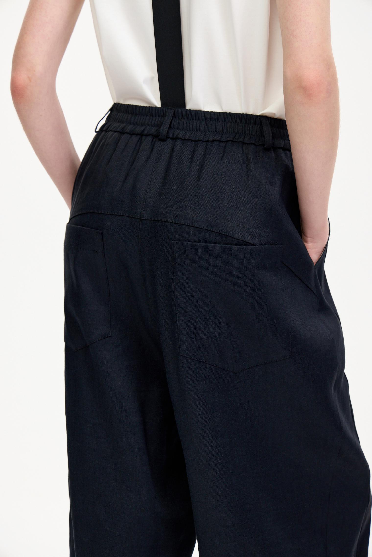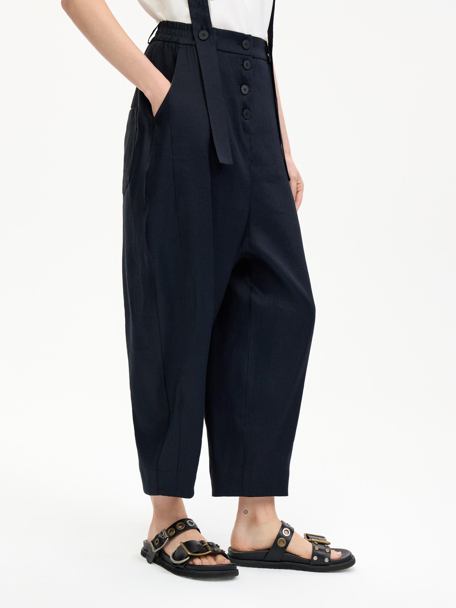 Стильные объемные брюки из пластичного смесового льняного материала, обеспечивающего комфорт и благородный блеск. Брюки с боковыми карманами, эластичным поясом и гульфиком на пуговицах. Стильный элемент – съемные подтяжки. Укороченный крой и заниженная слонка создают современный образ.