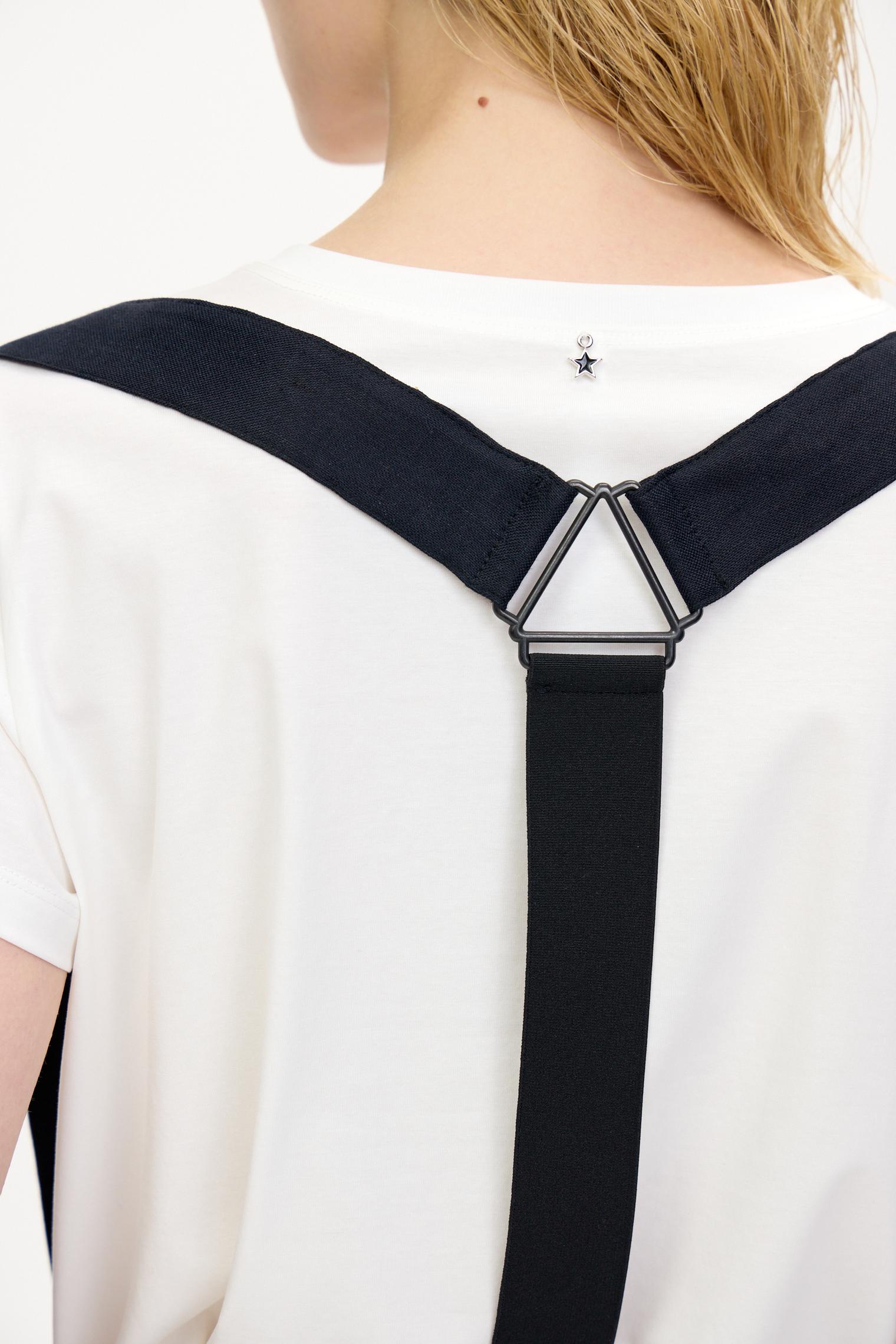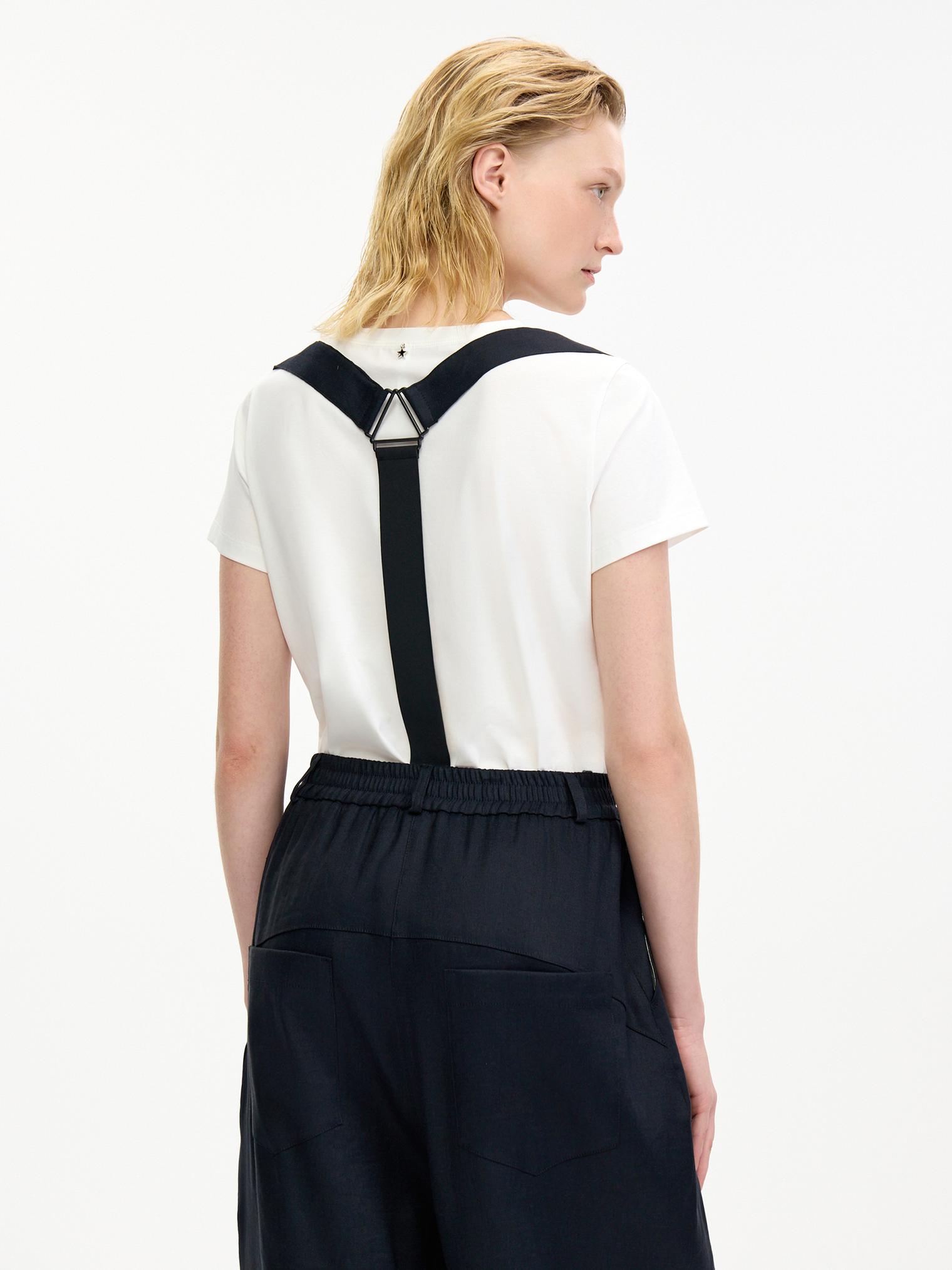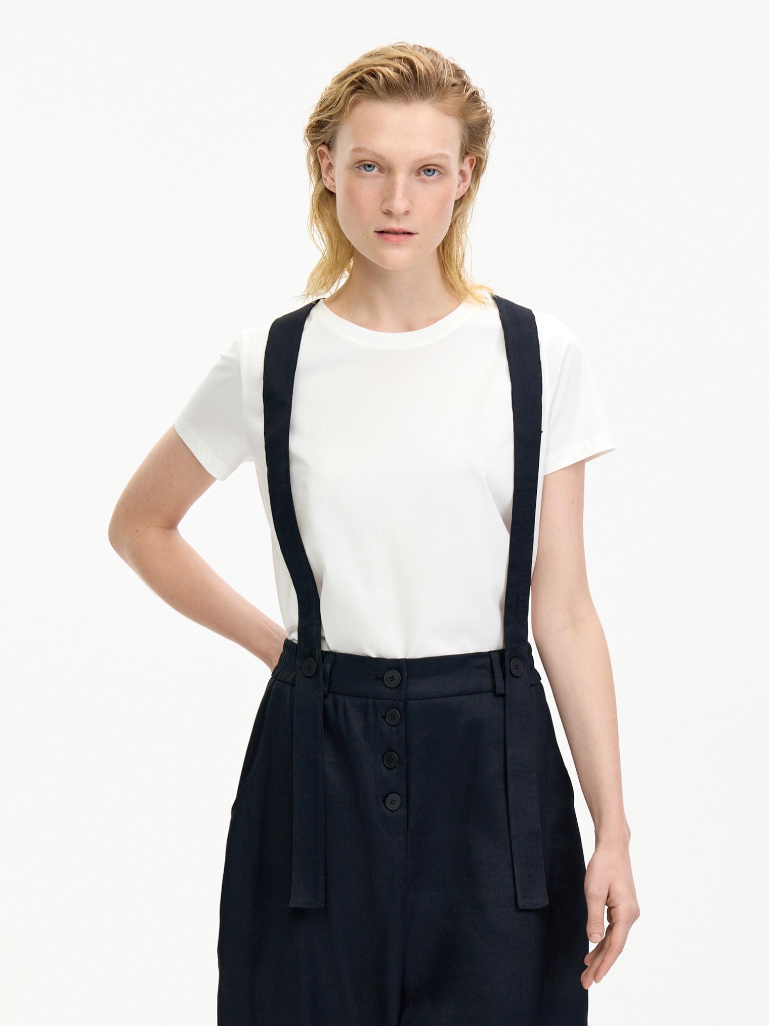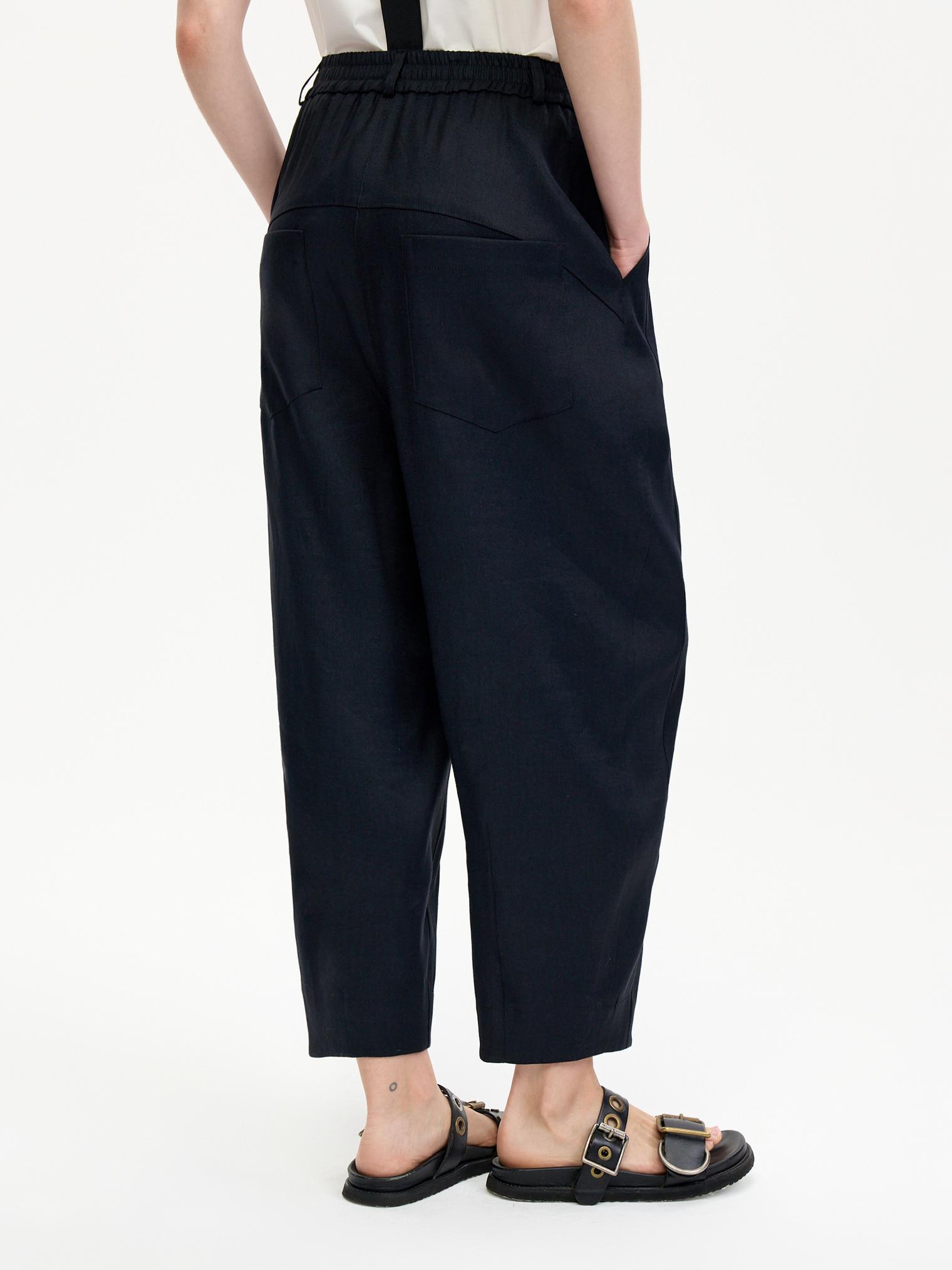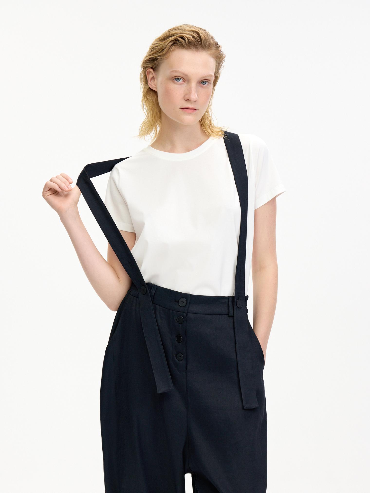 Стильные объемные брюки из пластичного смесового льняного материала, обеспечивающего комфорт и благородный блеск. Брюки с боковыми карманами, эластичным поясом и гульфиком на пуговицах. Стильный элемент – съемные подтяжки. Укороченный крой и заниженная слонка создают современный образ.