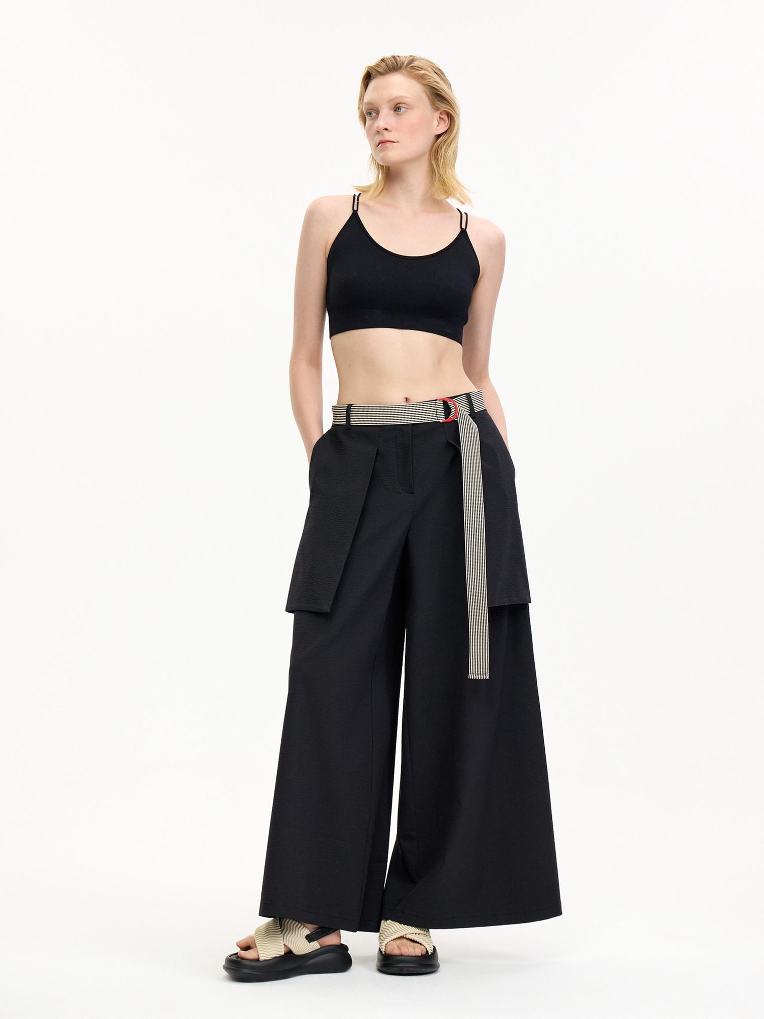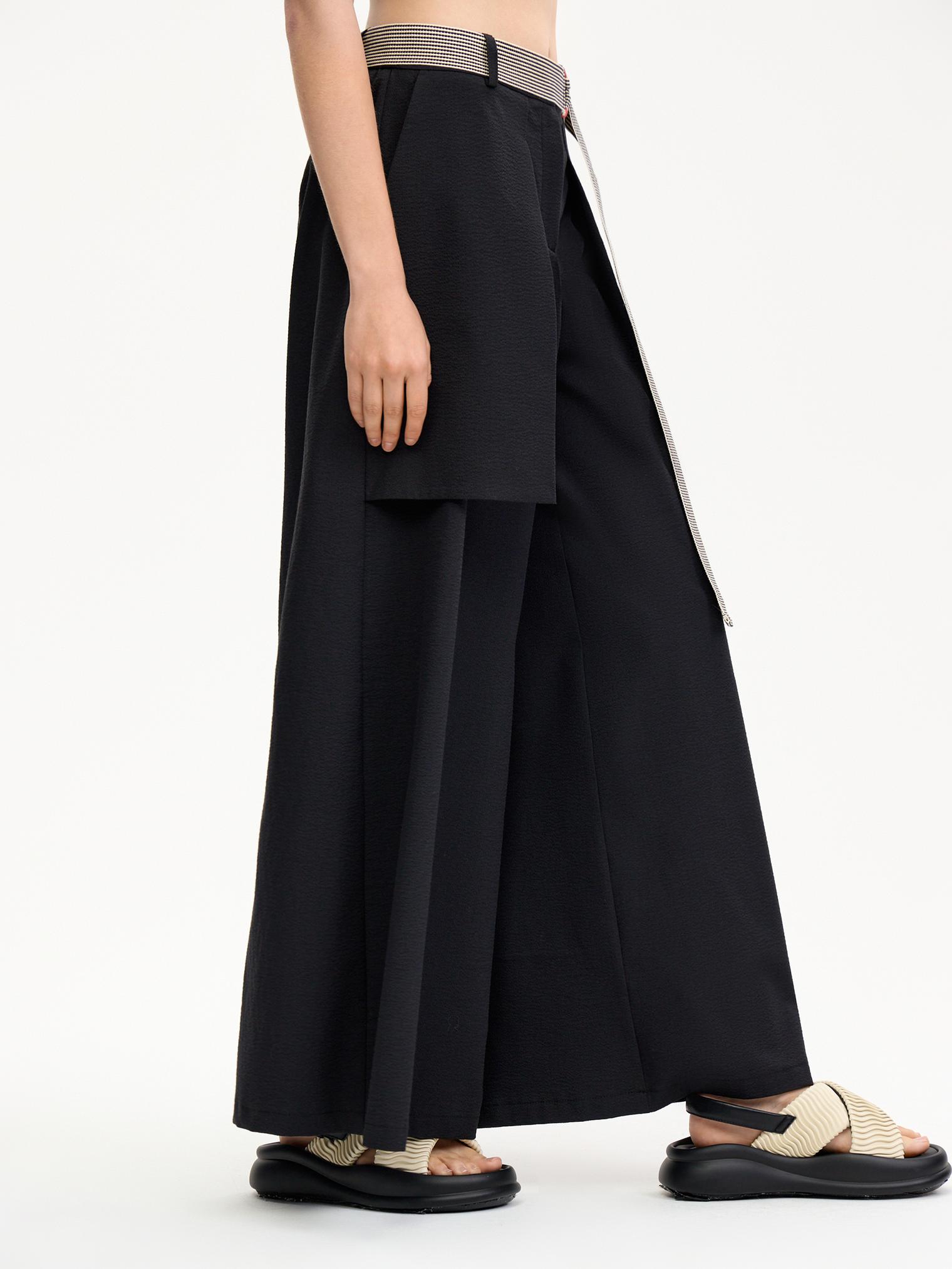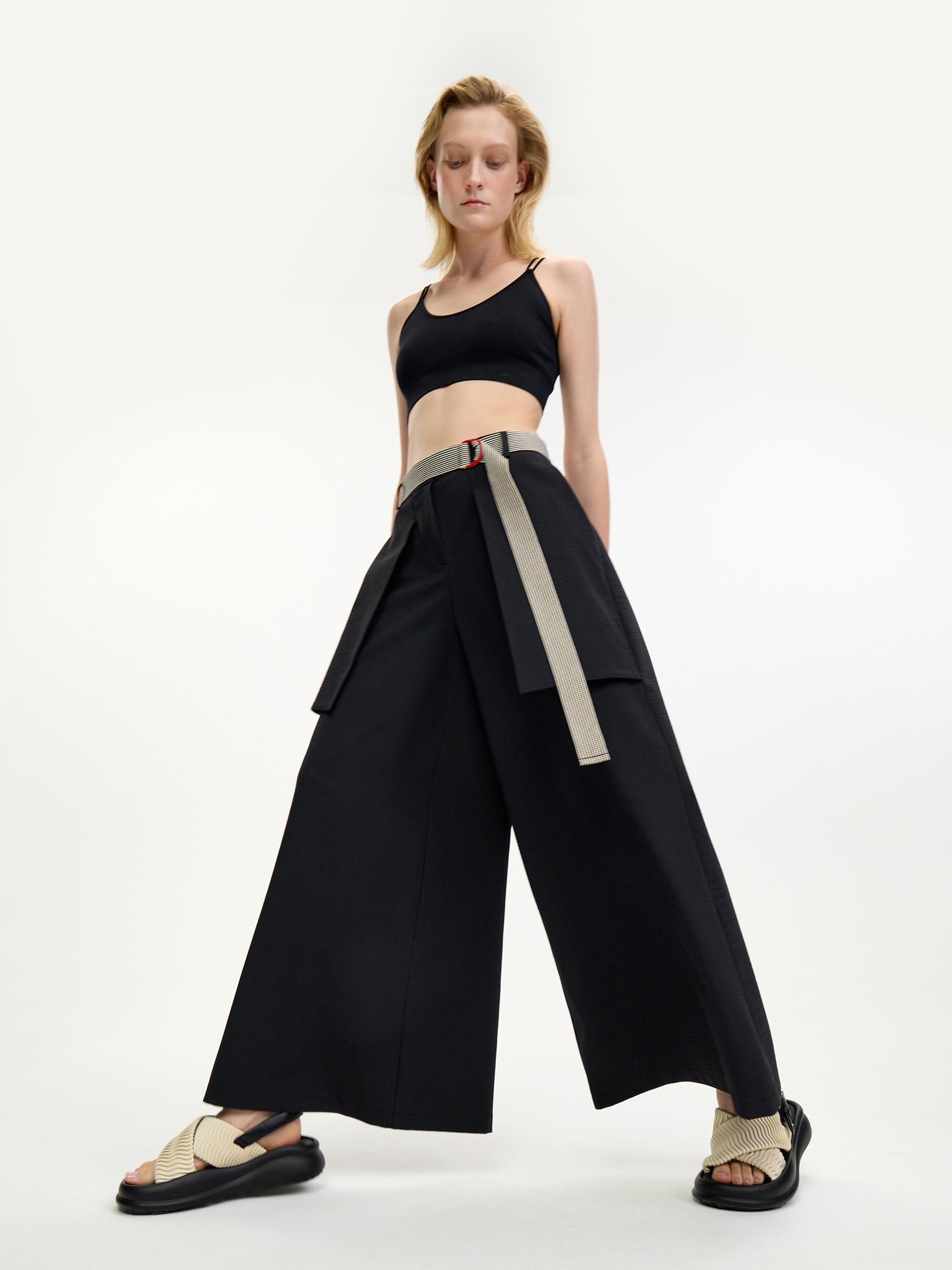 Широкие , расклешенные брюки из формоустойчивой хлопковой ткани с эффектом "крэш" – универсальные и вариативные. Современный силуэт позволяет создавать стильные динамичные образы. Отлетные карманы и контрастный ремень из стропы на яркой пряжке – завершающий акцент.
