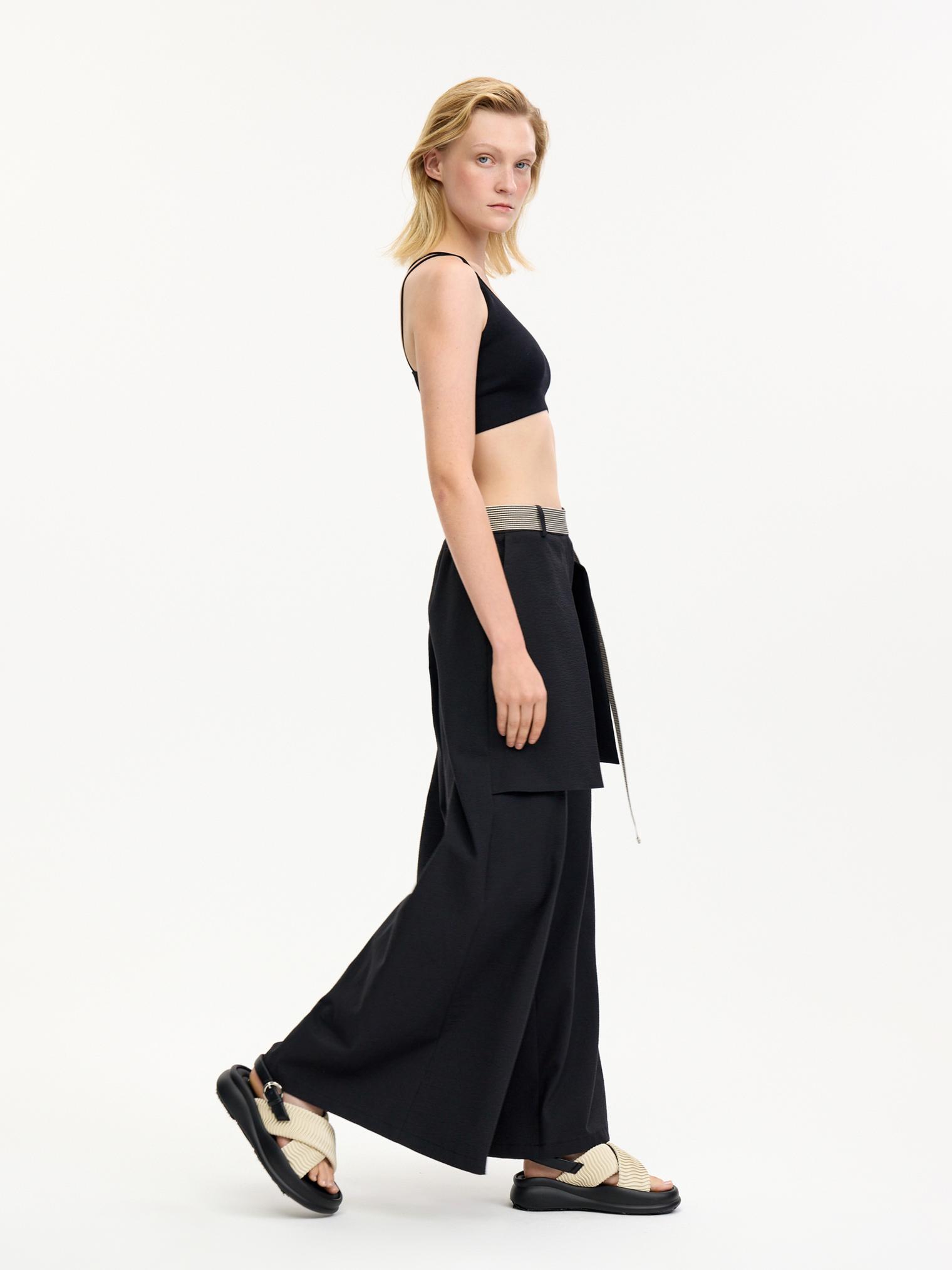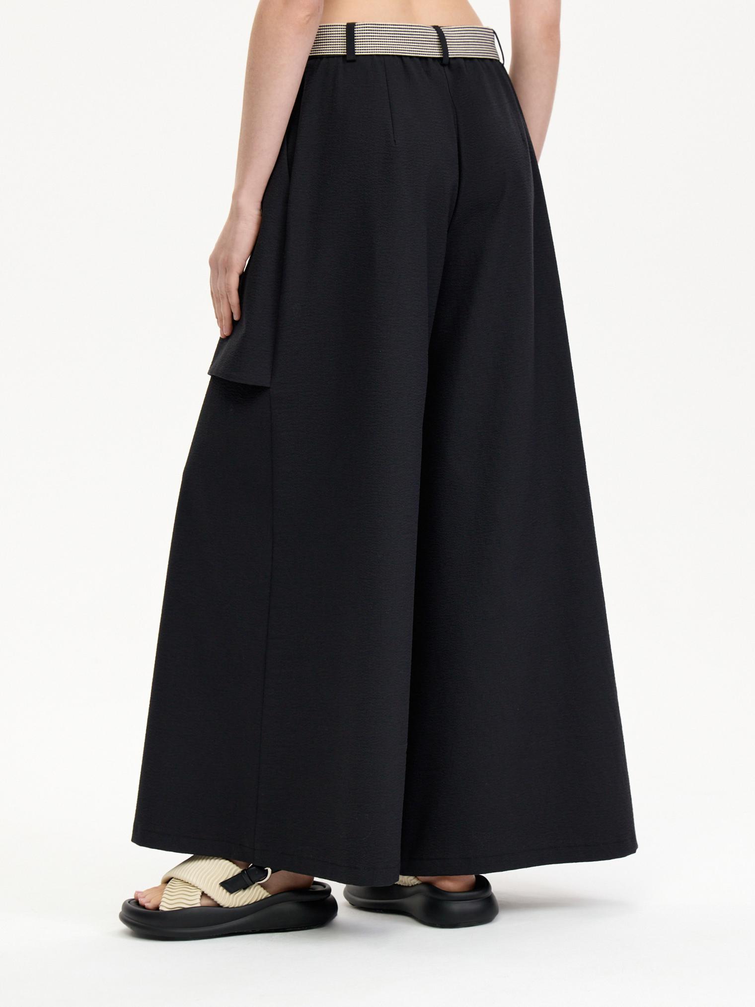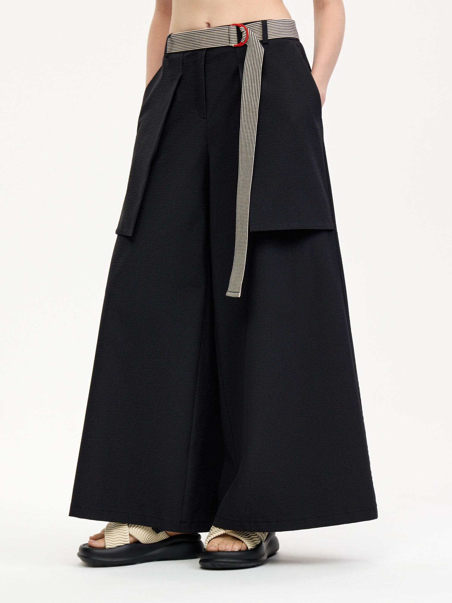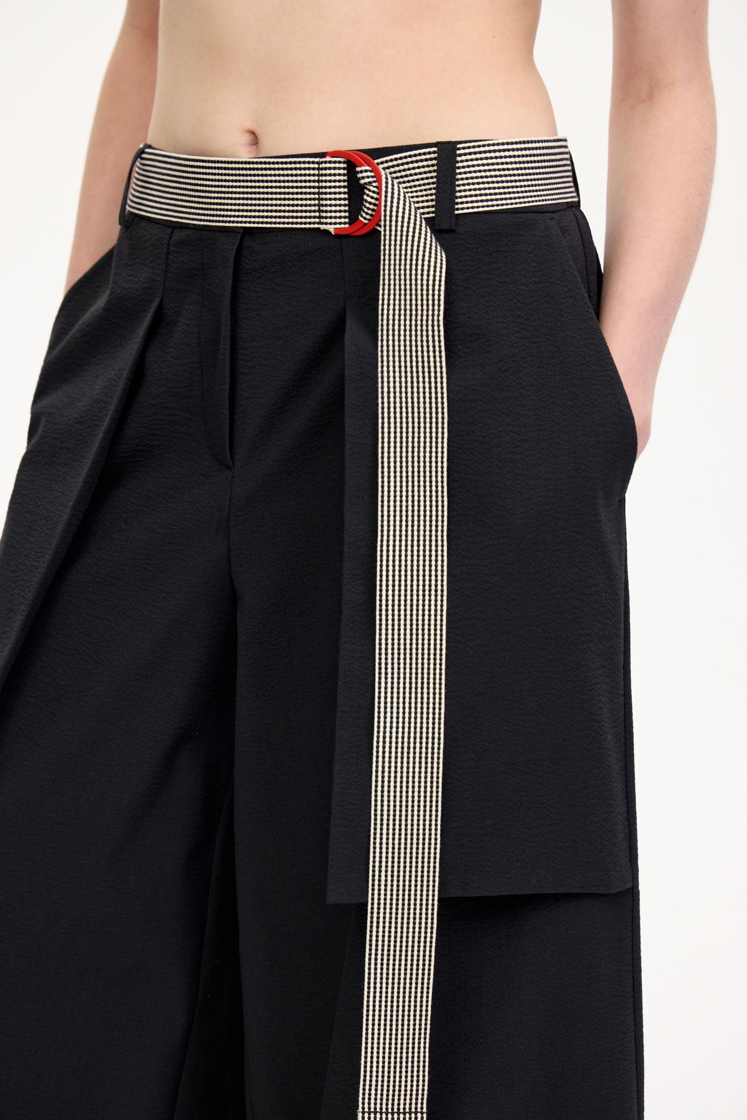 Широкие , расклешенные брюки из формоустойчивой хлопковой ткани с эффектом "крэш" – универсальные и вариативные. Современный силуэт позволяет создавать стильные динамичные образы. Отлетные карманы и контрастный ремень из стропы на яркой пряжке – завершающий акцент.