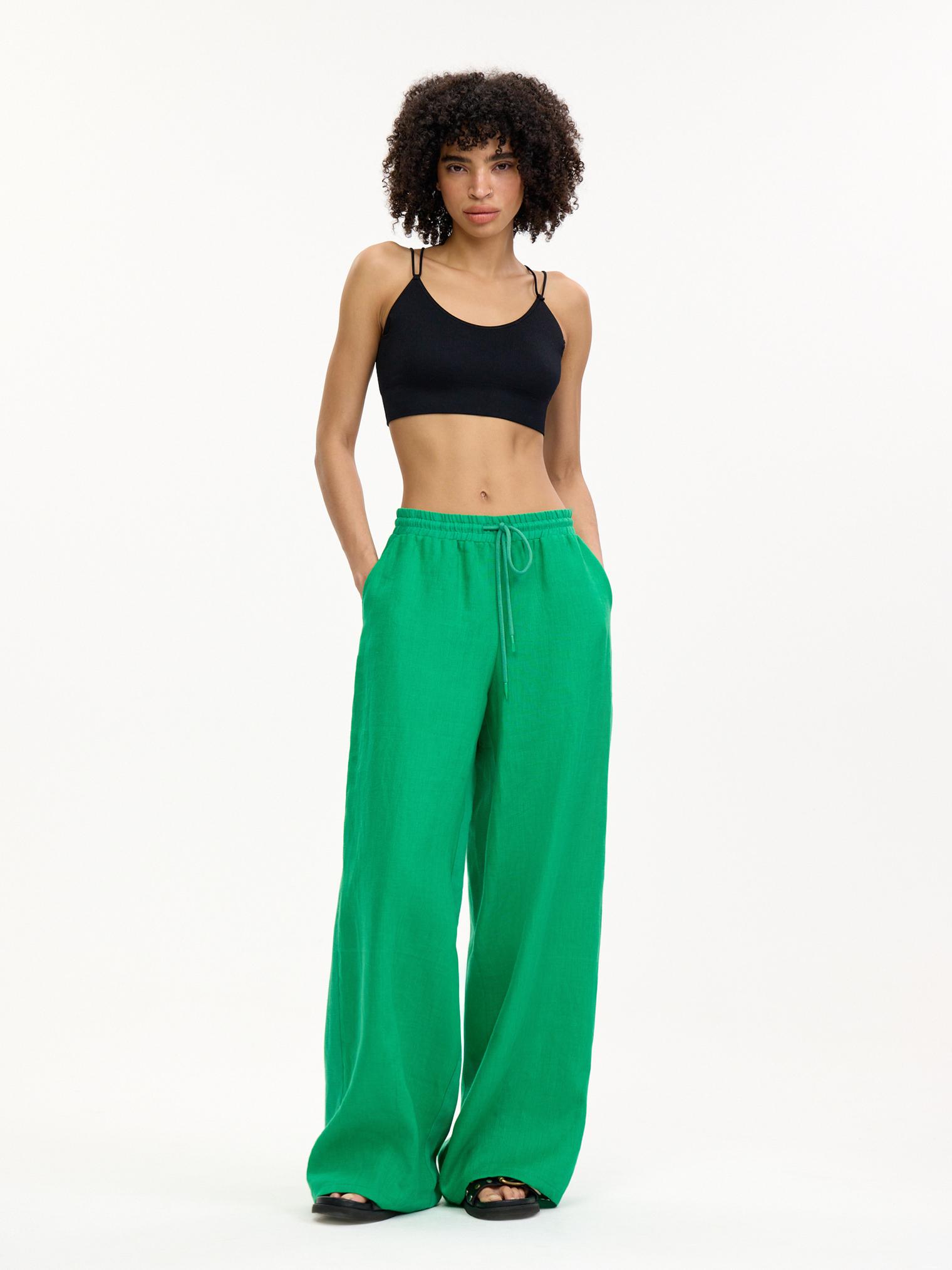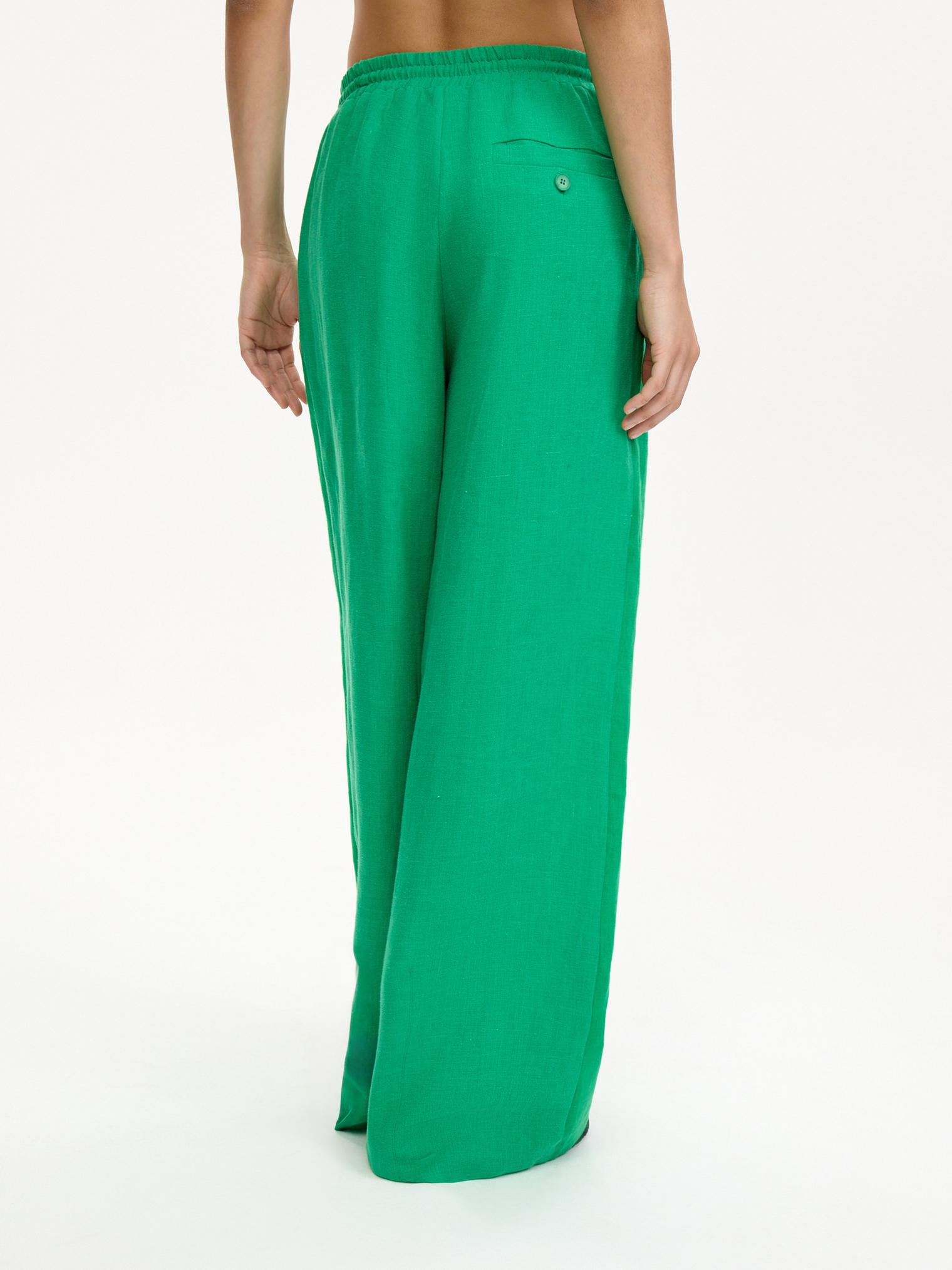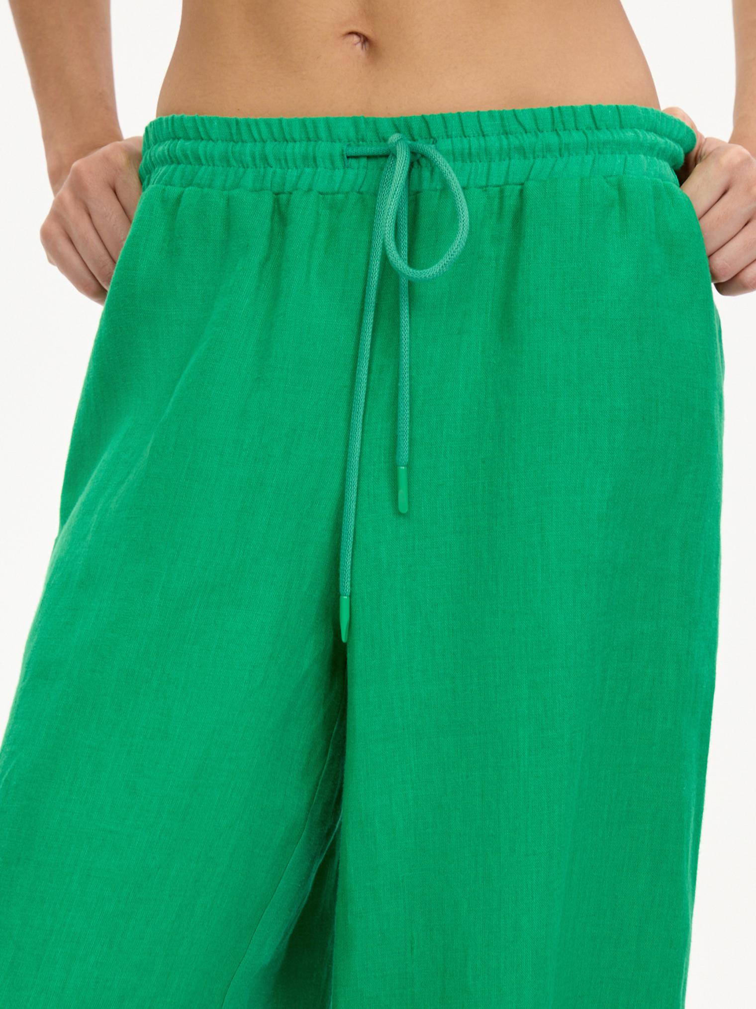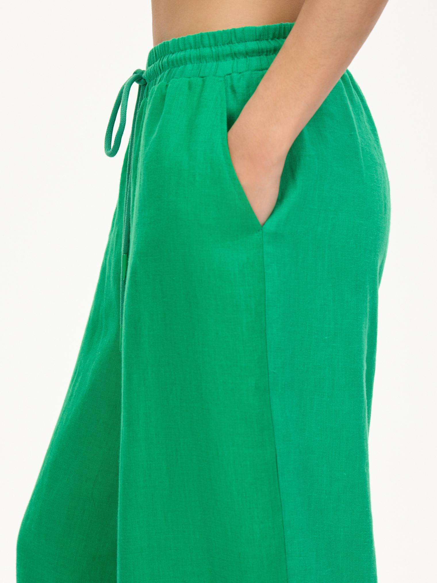 Широкие брюки-палаццо из комфортного пластичного льна насыщенного зеленого цвета – летняя классика, созданная для комфортных и стильных образов. Пояс на резинке с кулиской и декоративным шнуром позволяет регулировать посадку и добавляет образу расслабленности.