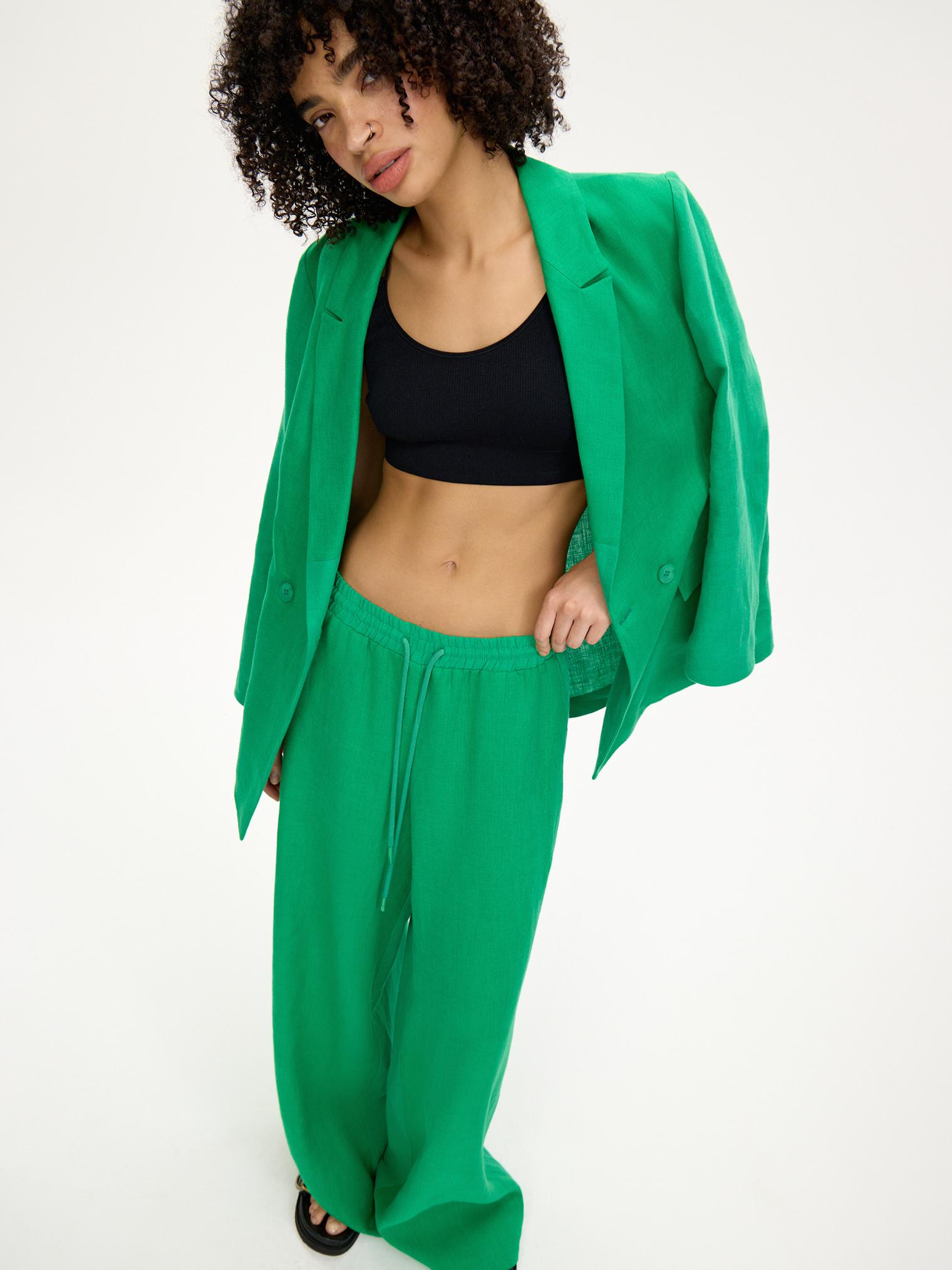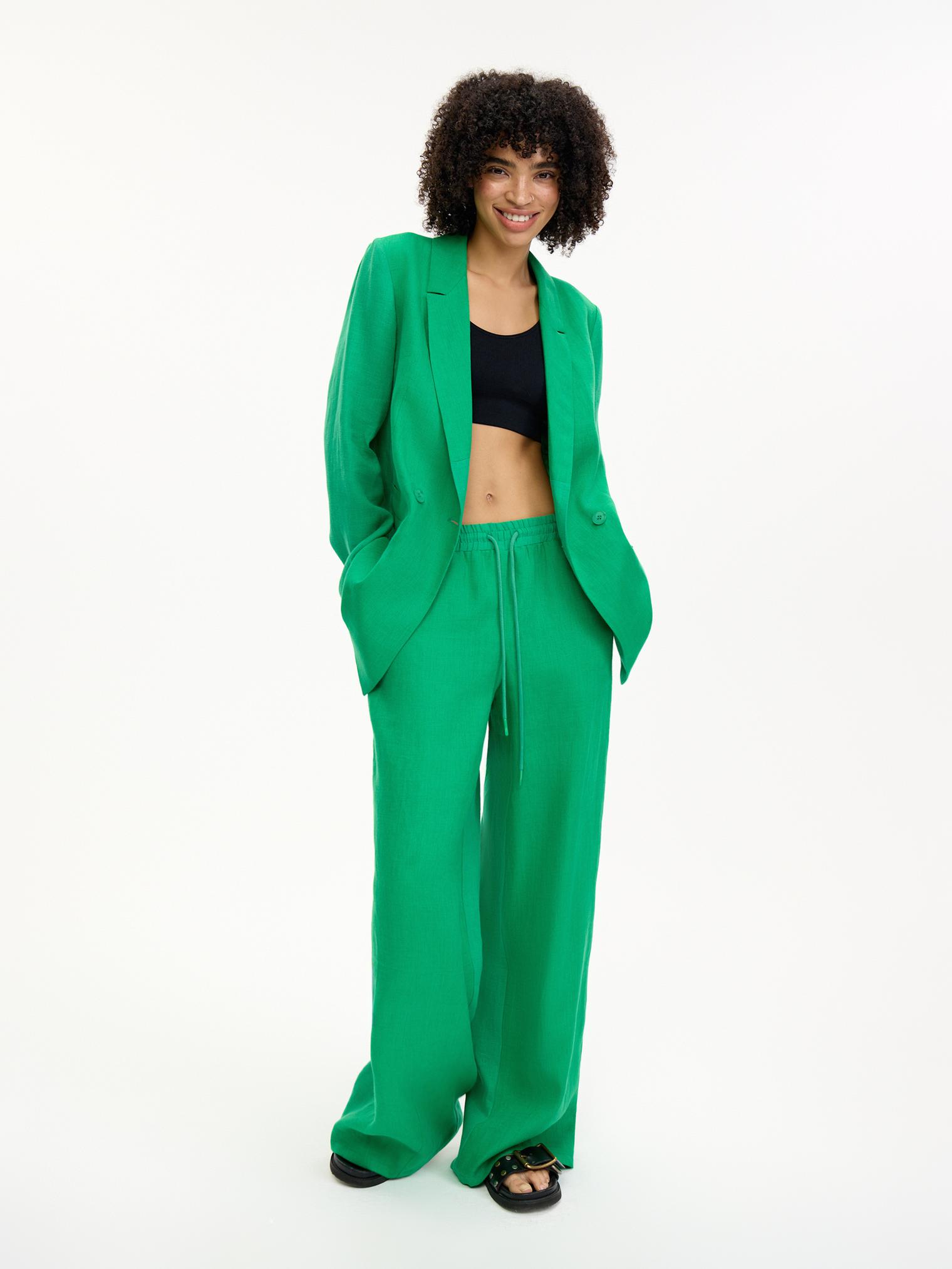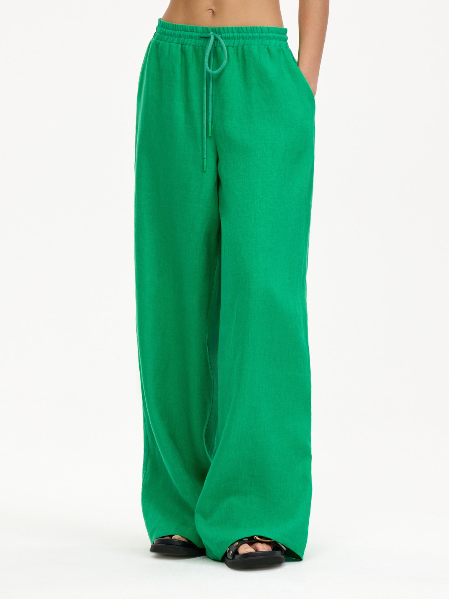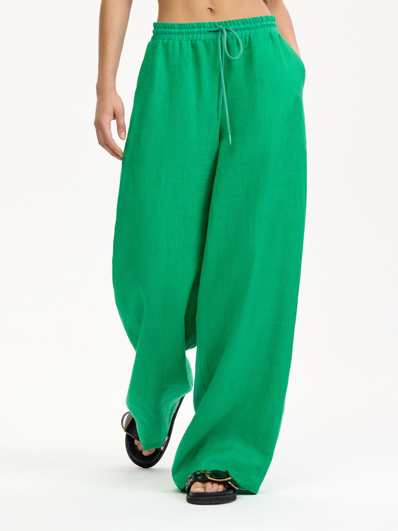 Широкие брюки-палаццо из комфортного пластичного льна насыщенного зеленого цвета – летняя классика, созданная для комфортных и стильных образов. Пояс на резинке с кулиской и декоративным шнуром позволяет регулировать посадку и добавляет образу расслабленности.
