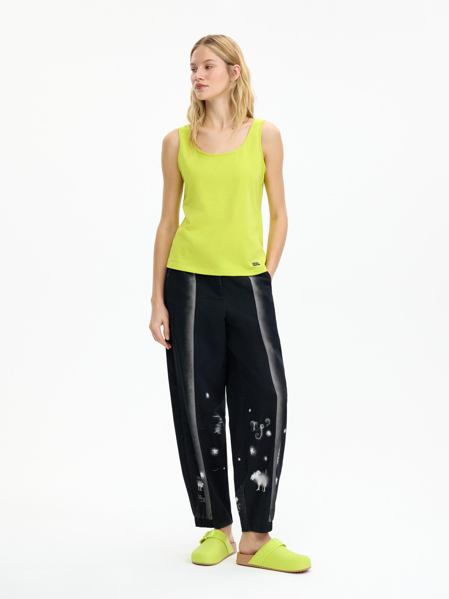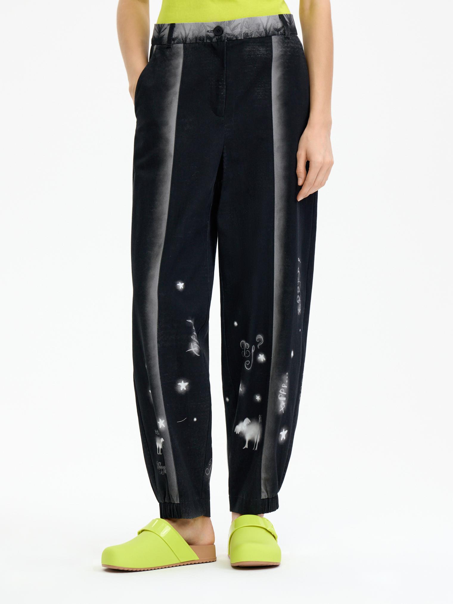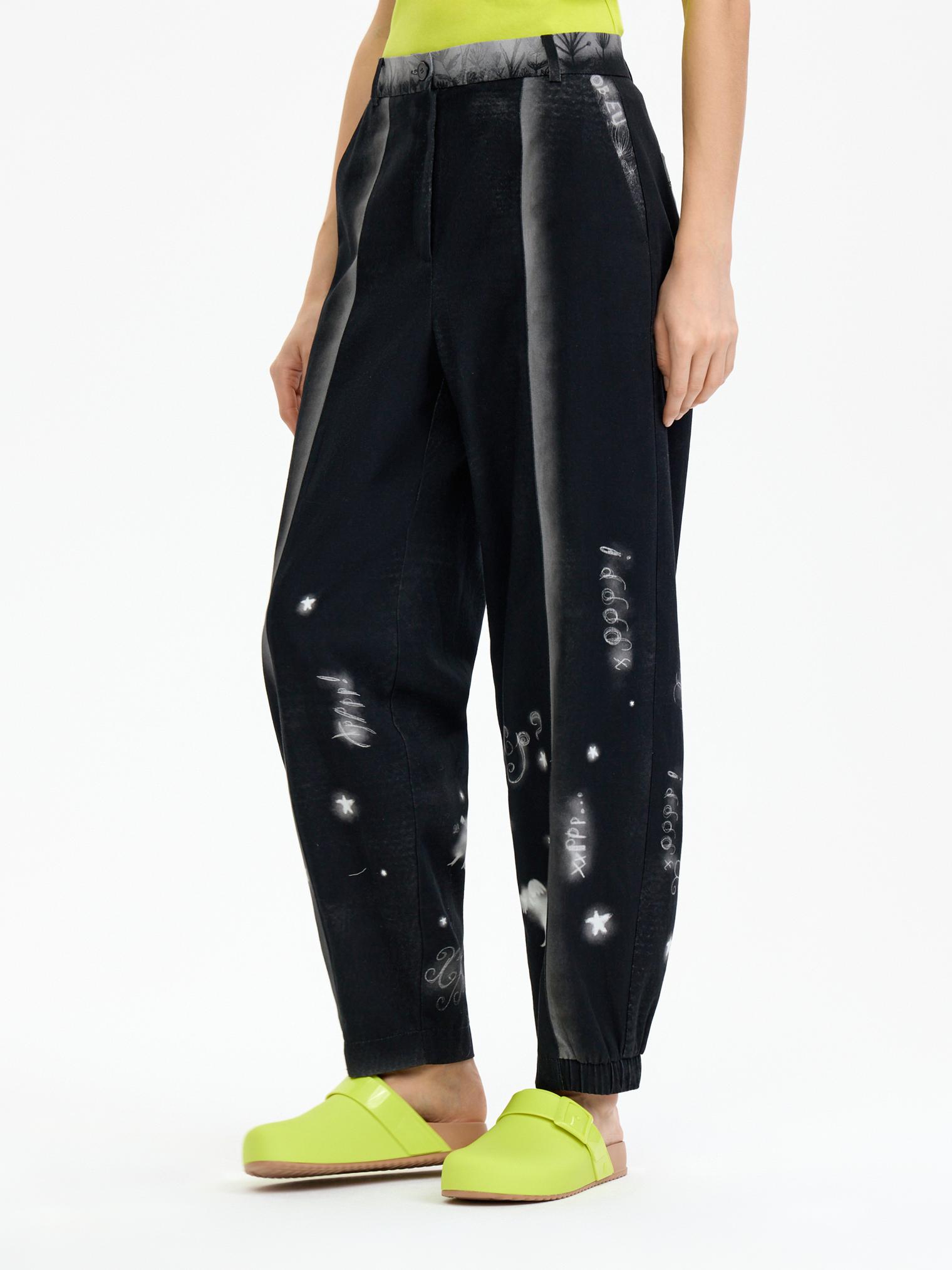 Брюки из мягкого костюмного хлопка комфортного овального силуэта незаменимы для летних образов. Выбирайте, с чем комбинировать: с жакетом – получите образ в неформальном деловом стиле, - с футболкой – кэжуал. Идеально выверенный принт стройнит силуэт и подчеркивает прекрасную посадку изделия на фигуре.