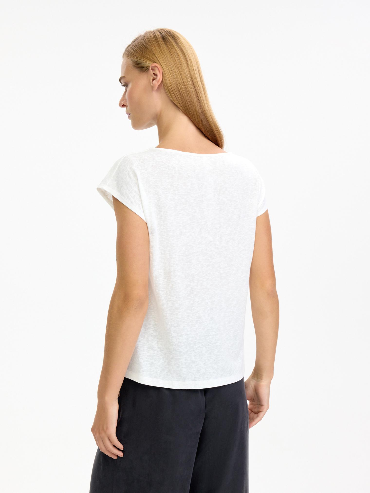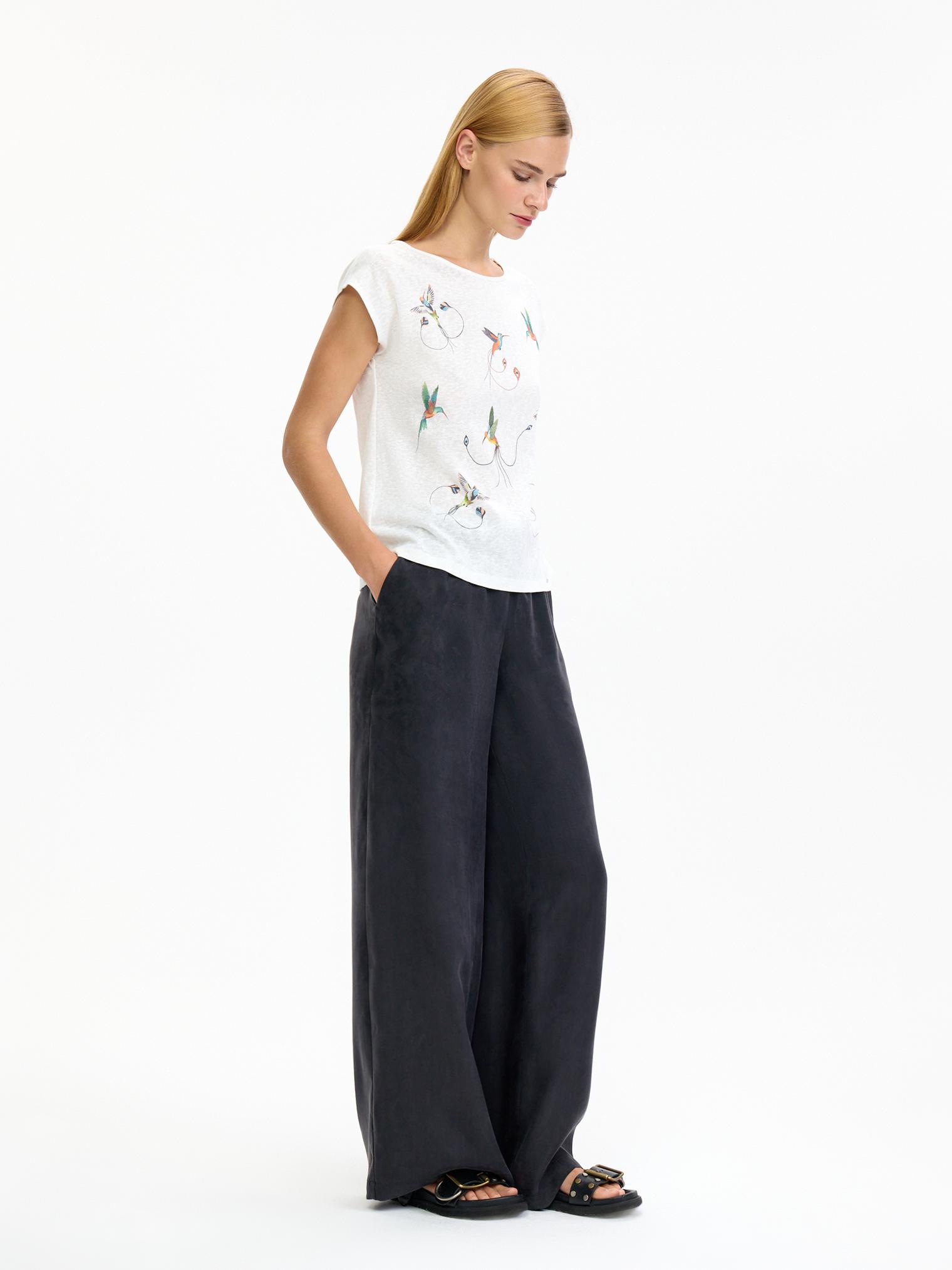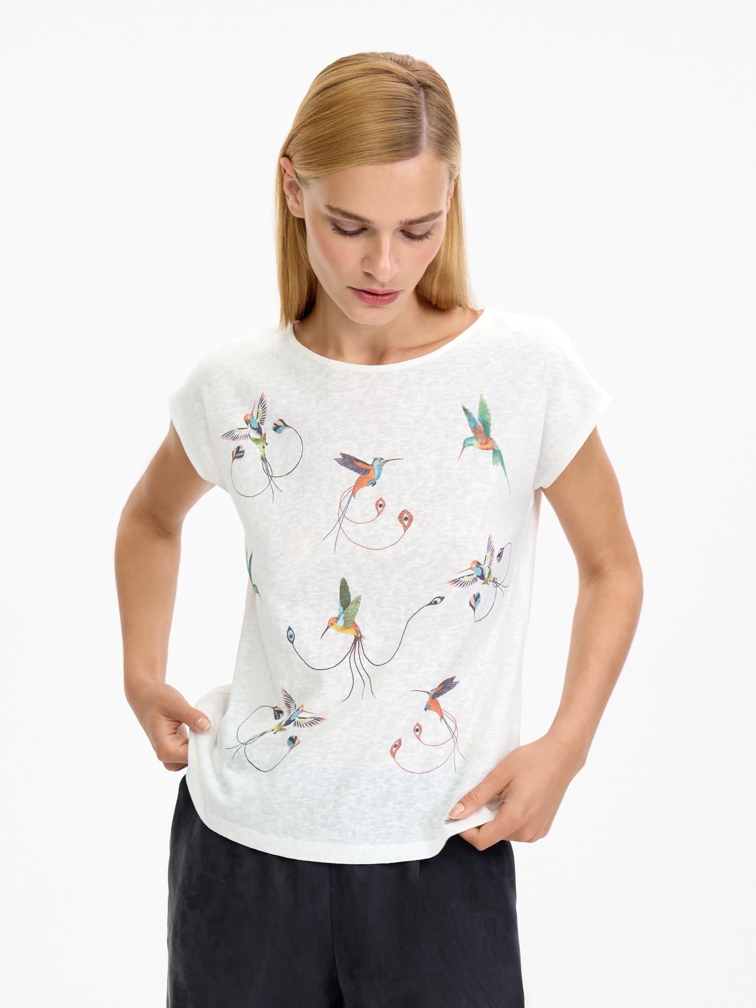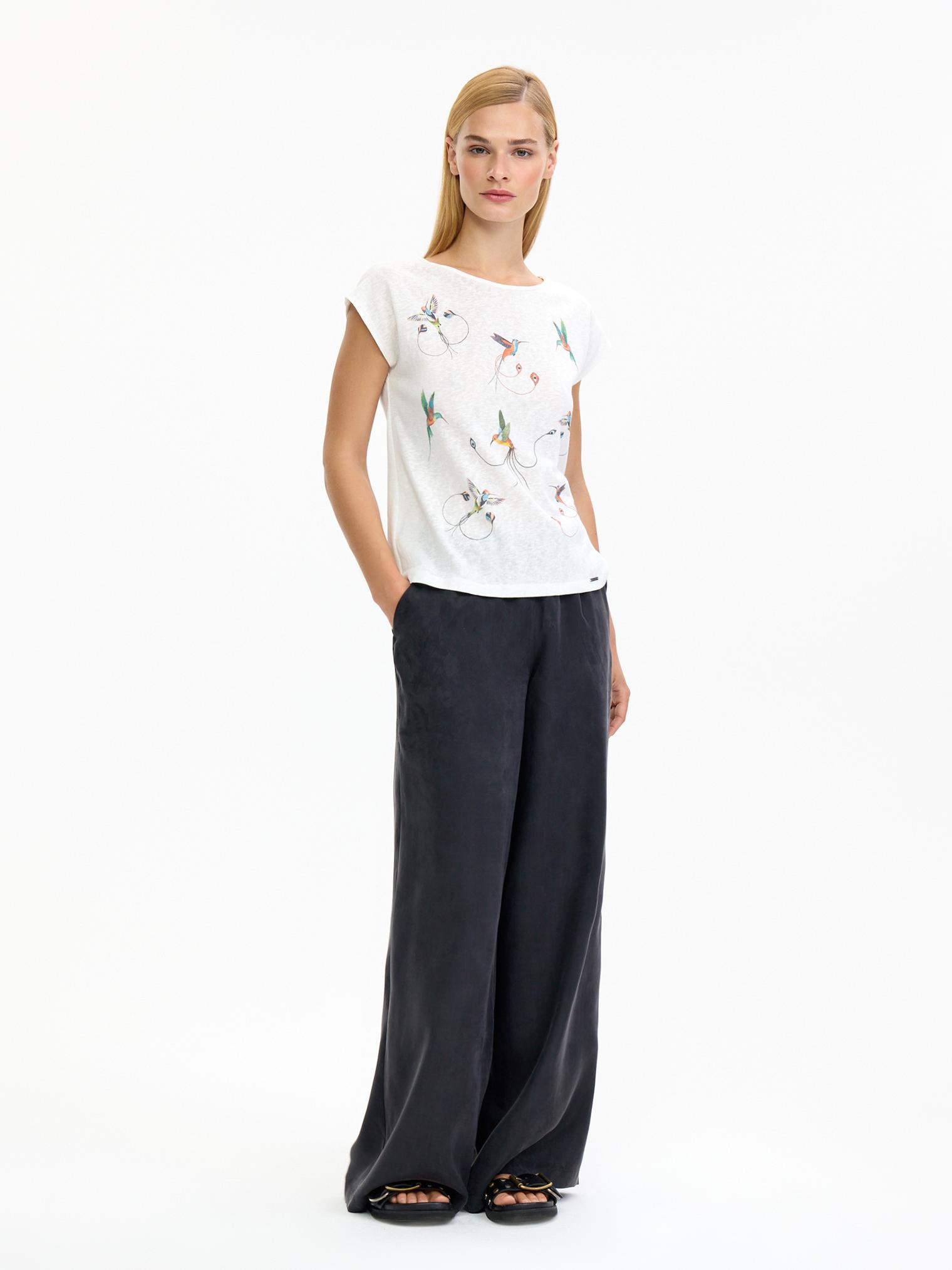 Футболка из натуральной вискозы с флам-эффектом (выраженный штриховой эффект, который достигается переплетением нитей разной плотности). Полуприлегающий силуэт, спущенная линия плеча. На полочке изображены птички колибри, которые добавят игривости и солнечного настроения в ваш образ.