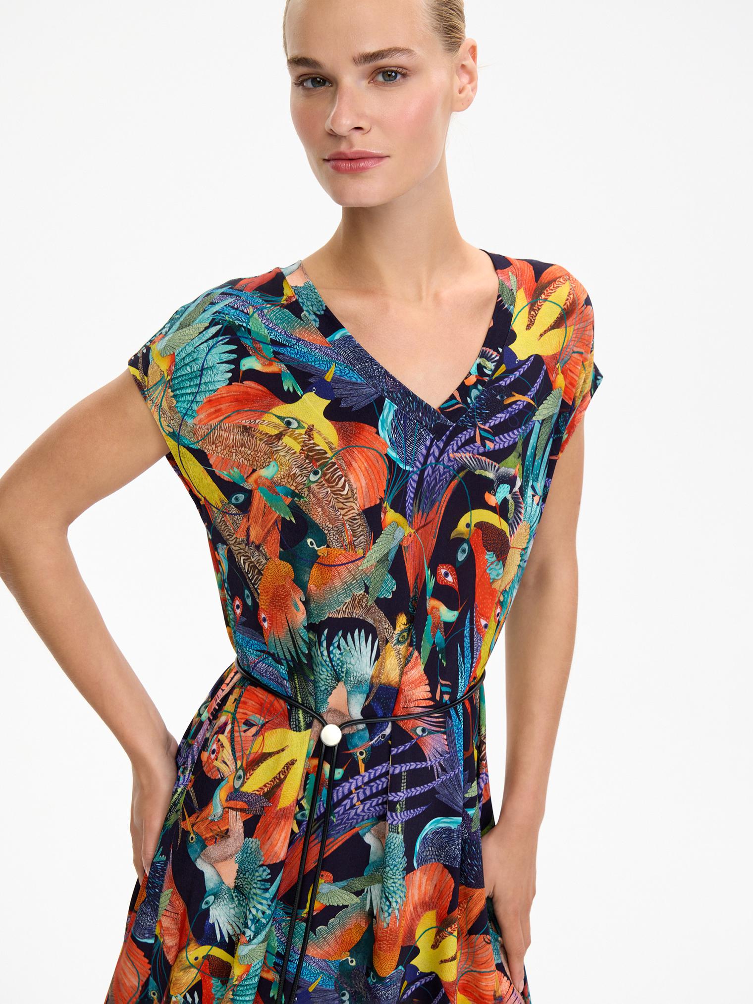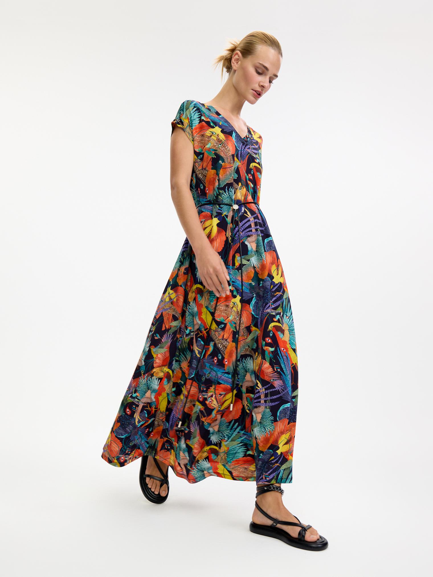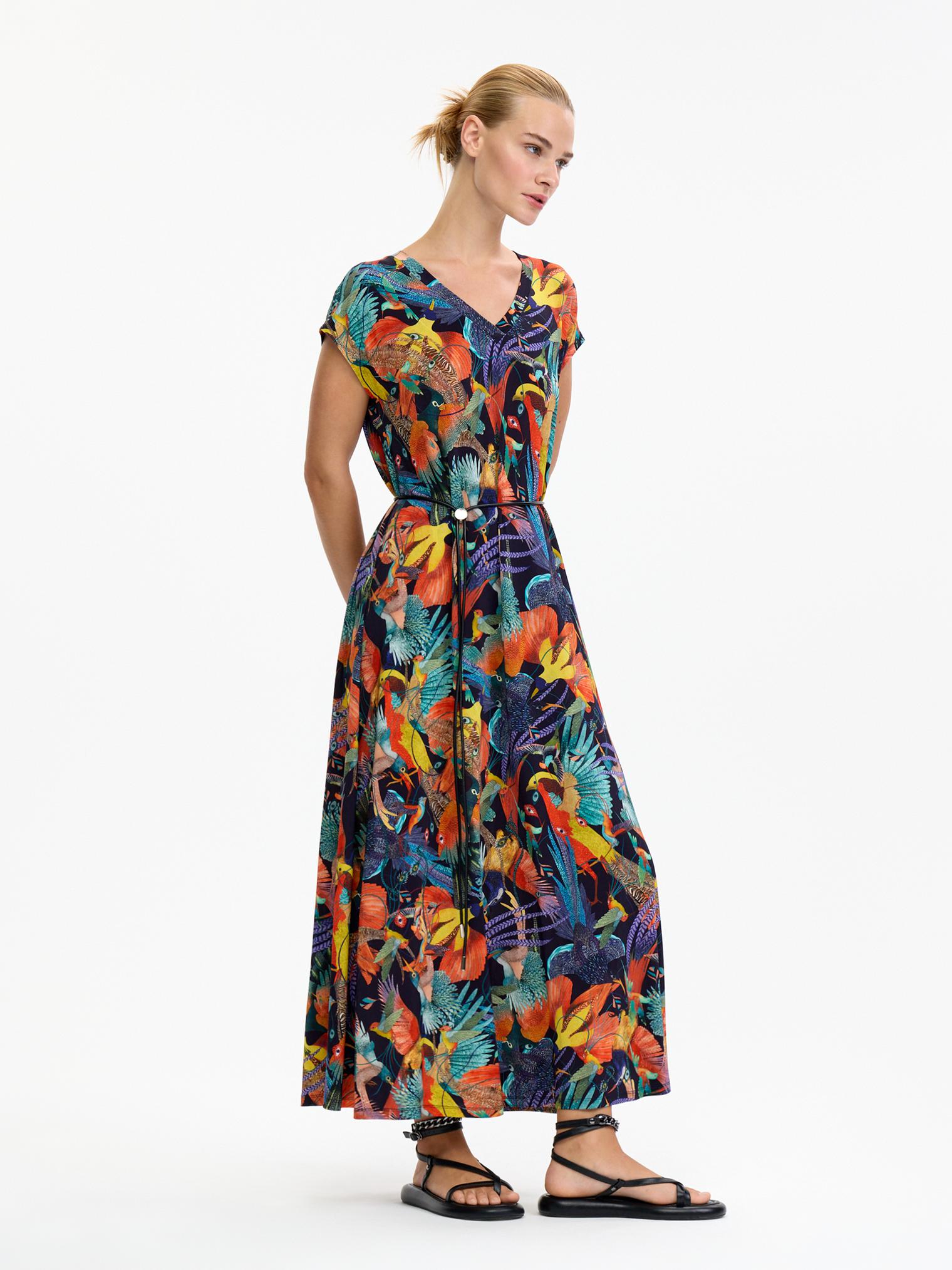 Трикотажное платье из холодной вискозы с живописным «пернатым» принтом – легкость и свобода в каждом движении. Трапециевидный силуэт длины макси подойдет для любого типа фигуры, а цельнокроенный рукав и v-образный вырез привнесут в образ гармонию.