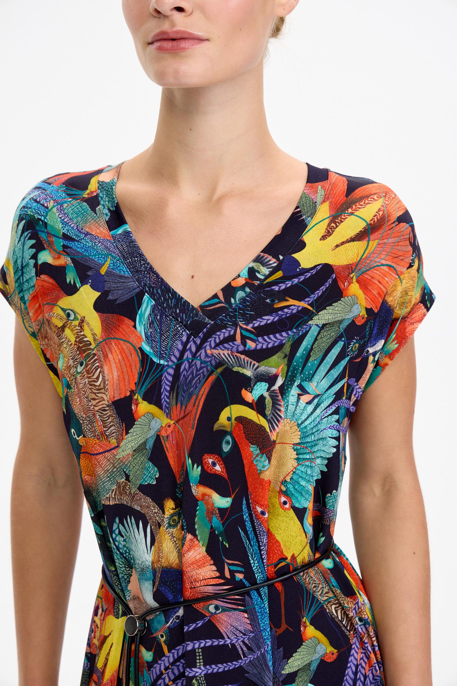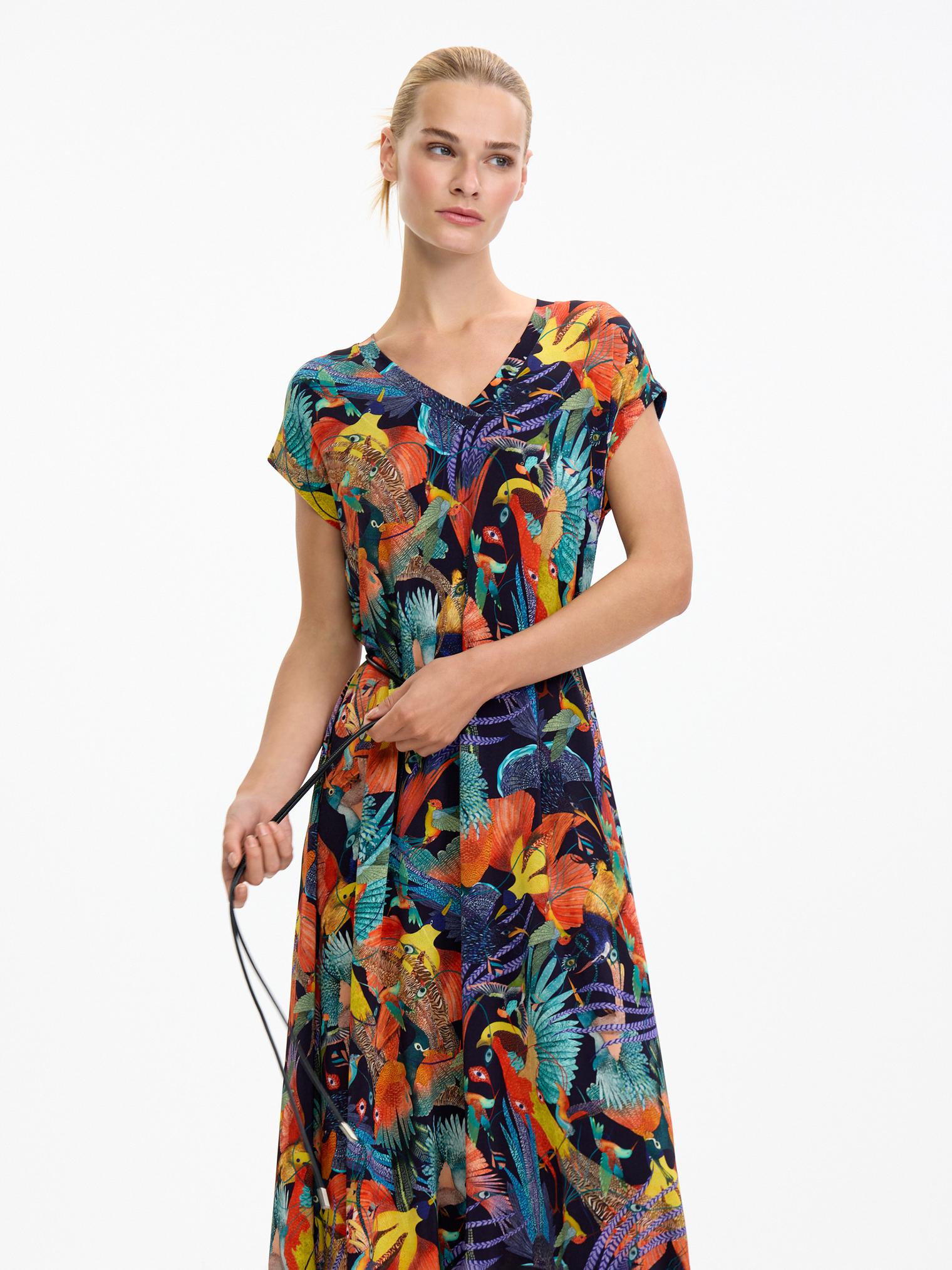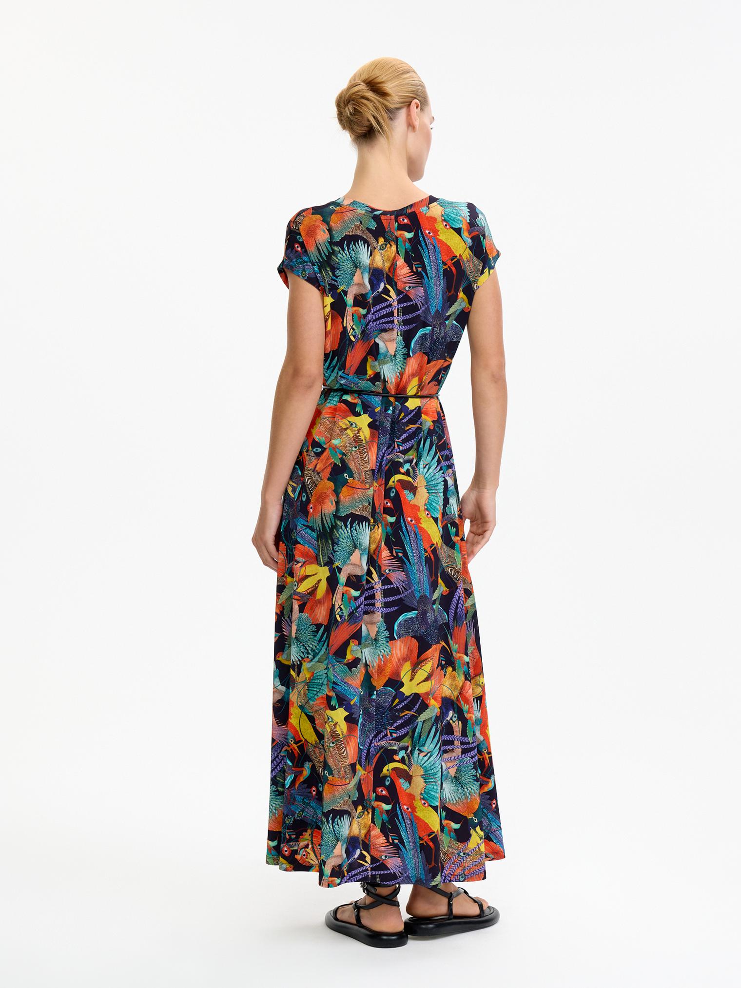 Трикотажное платье из холодной вискозы с живописным «пернатым» принтом – легкость и свобода в каждом движении. Трапециевидный силуэт длины макси подойдет для любого типа фигуры, а цельнокроенный рукав и v-образный вырез привнесут в образ гармонию.
