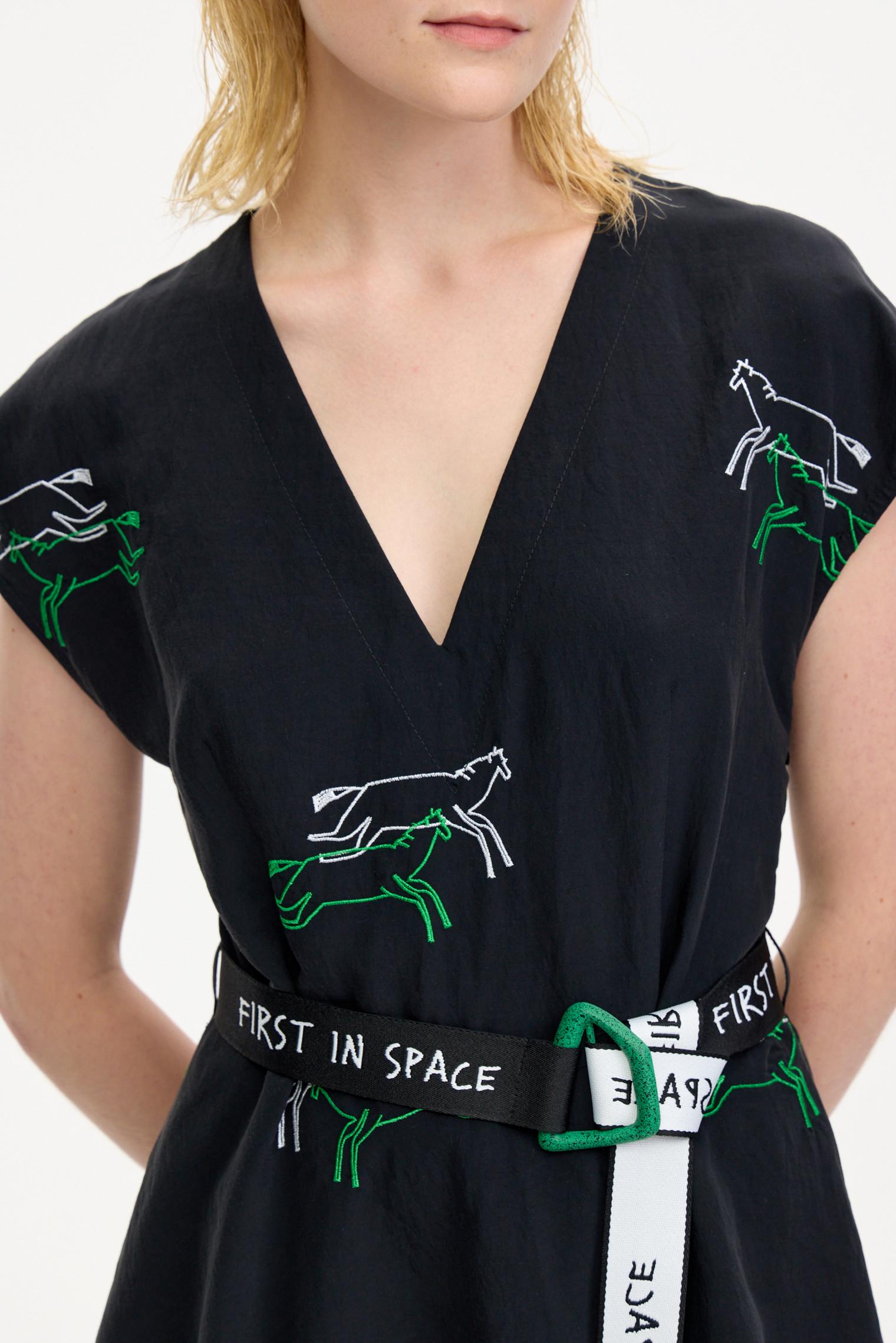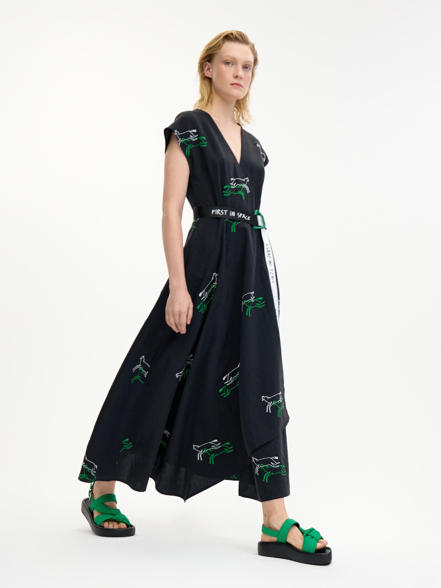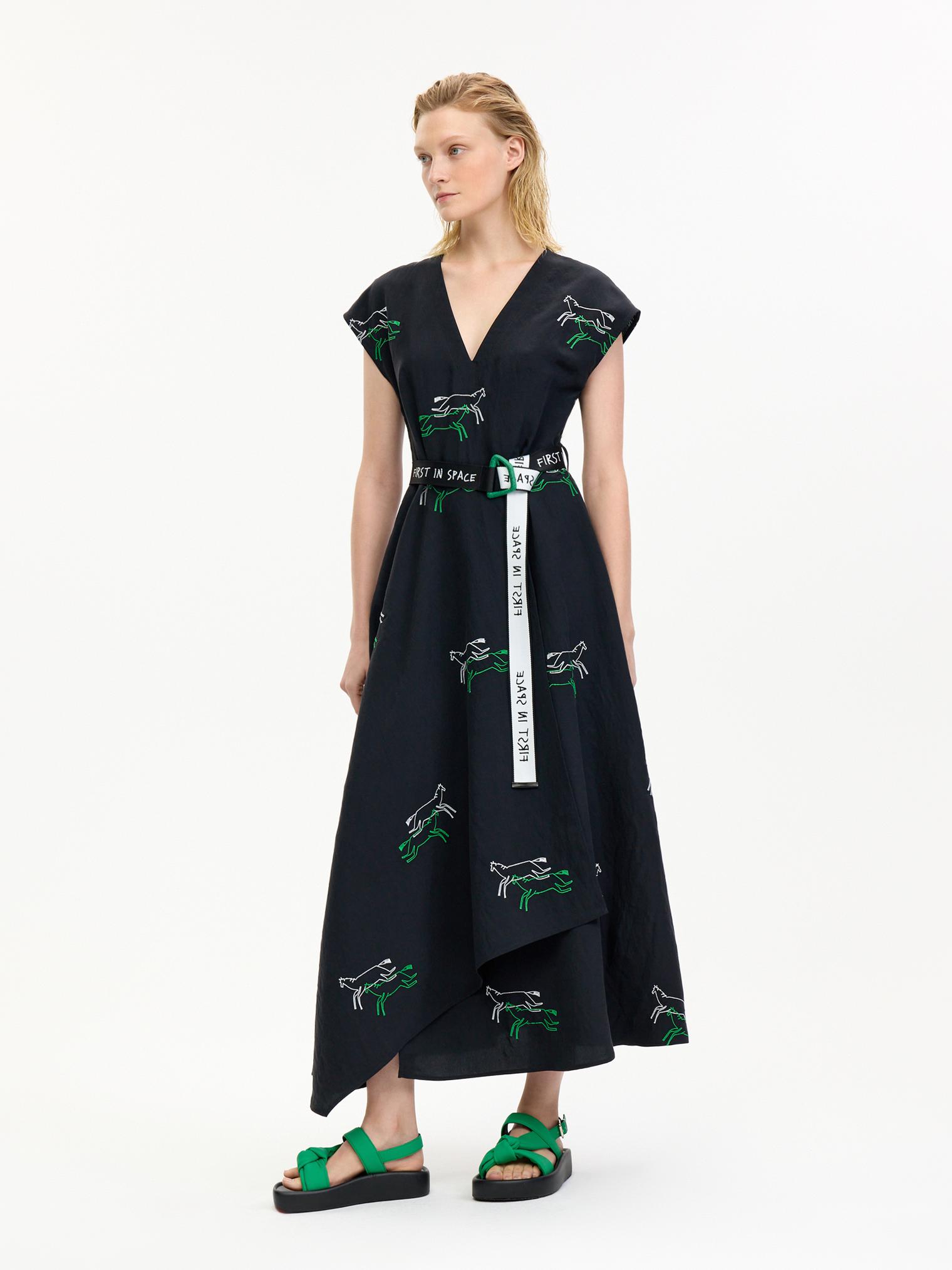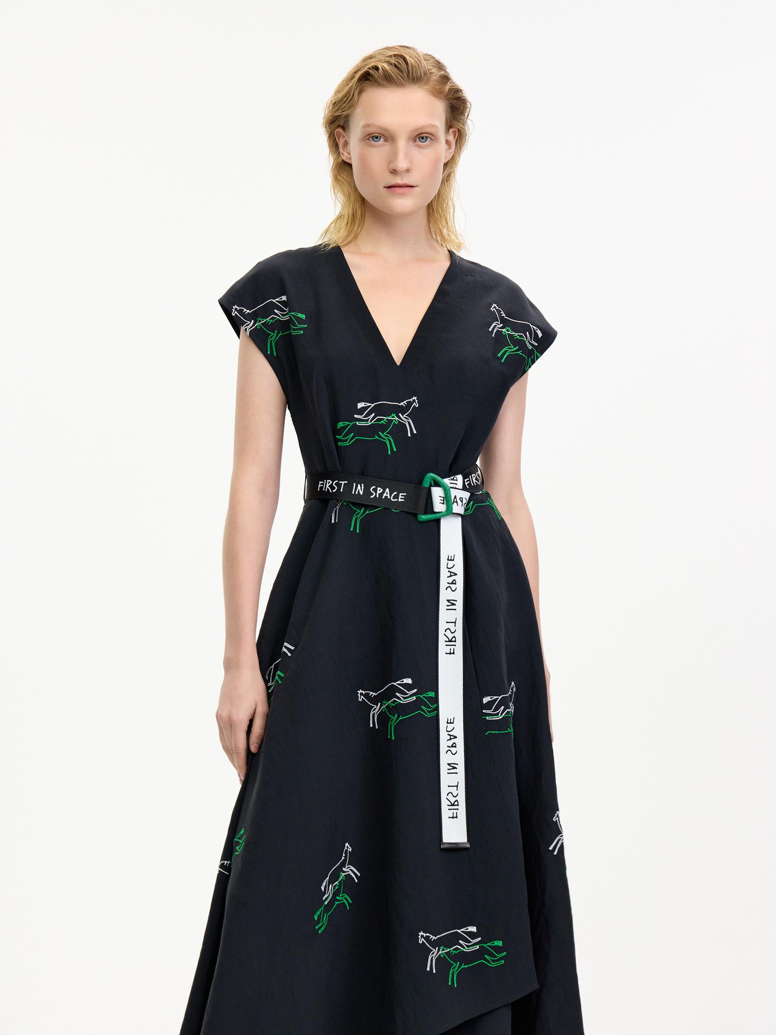 Приталенное платье длины макси с эффектом запаха и асимметричной фигурной линией низа. Выполнено из струящейся благородной бархатистой ткани с контрастной вышивкой. Элегантности придаёт V-образный вырез горловины. Платье дополнено брендированным ремнем из контрастной стропы с фиксацией на яркой декоративной пряжке.