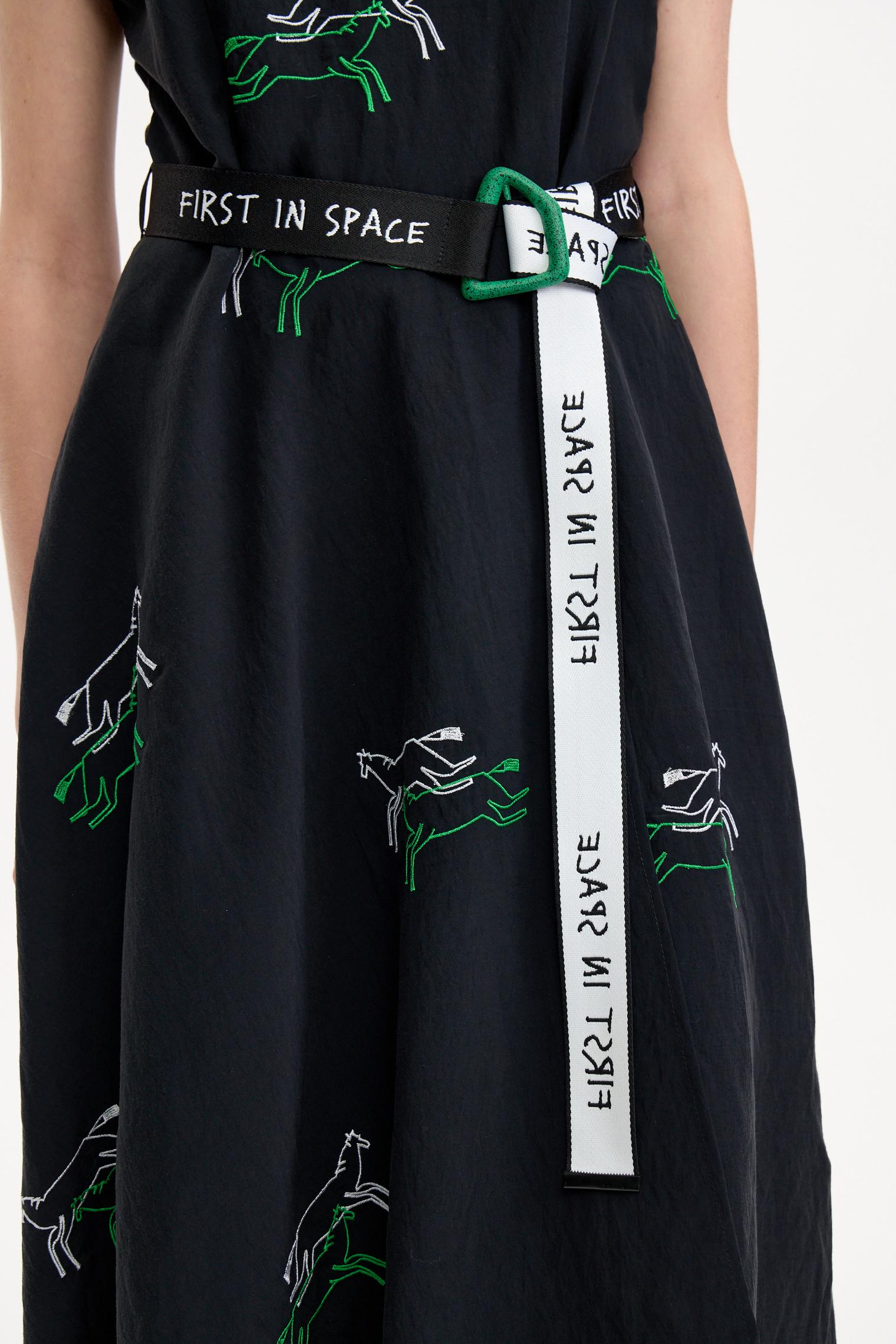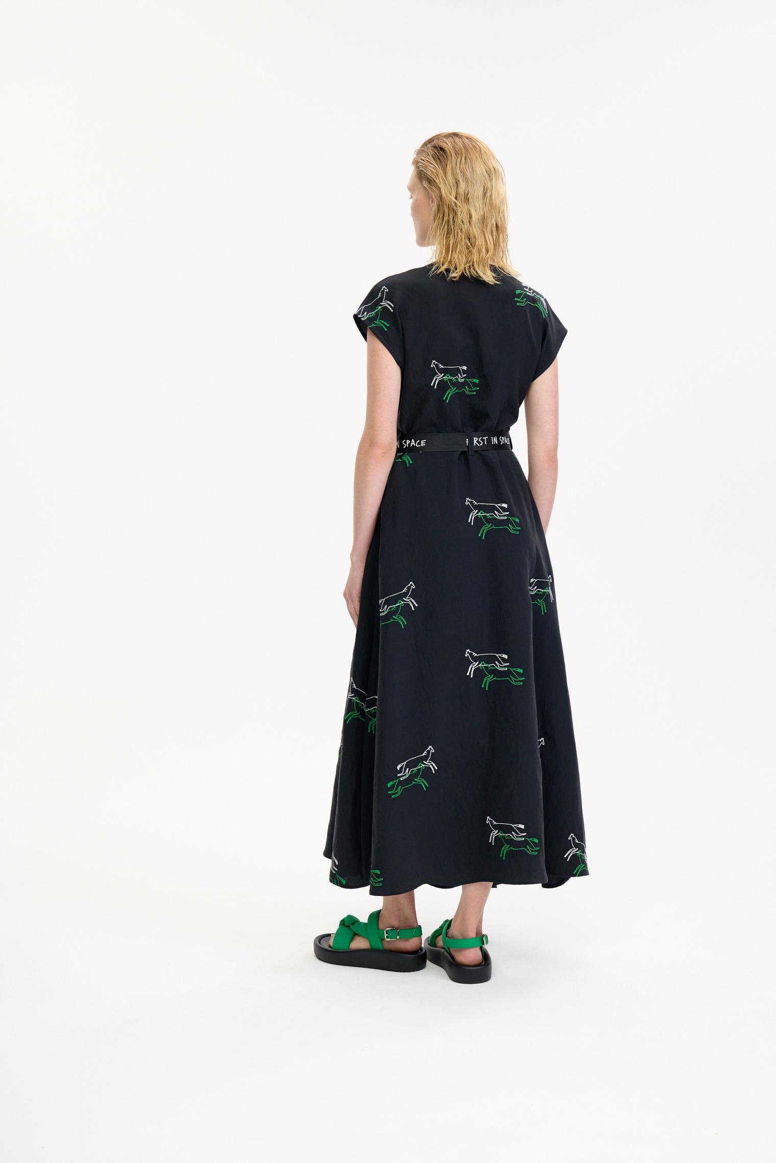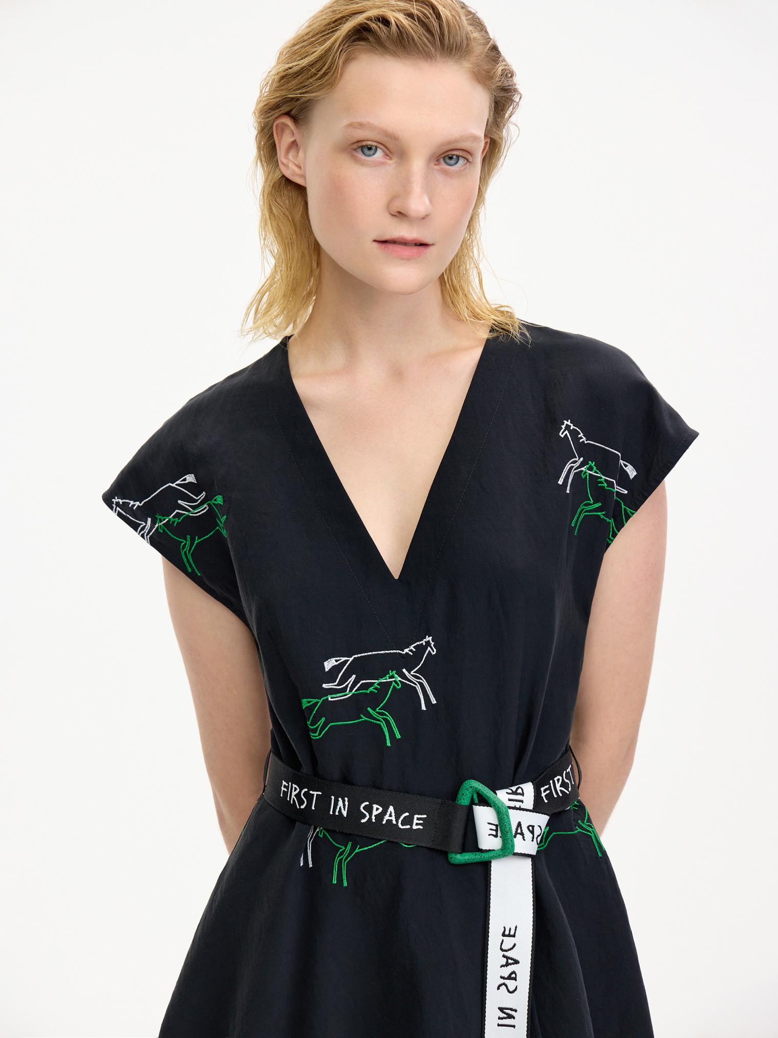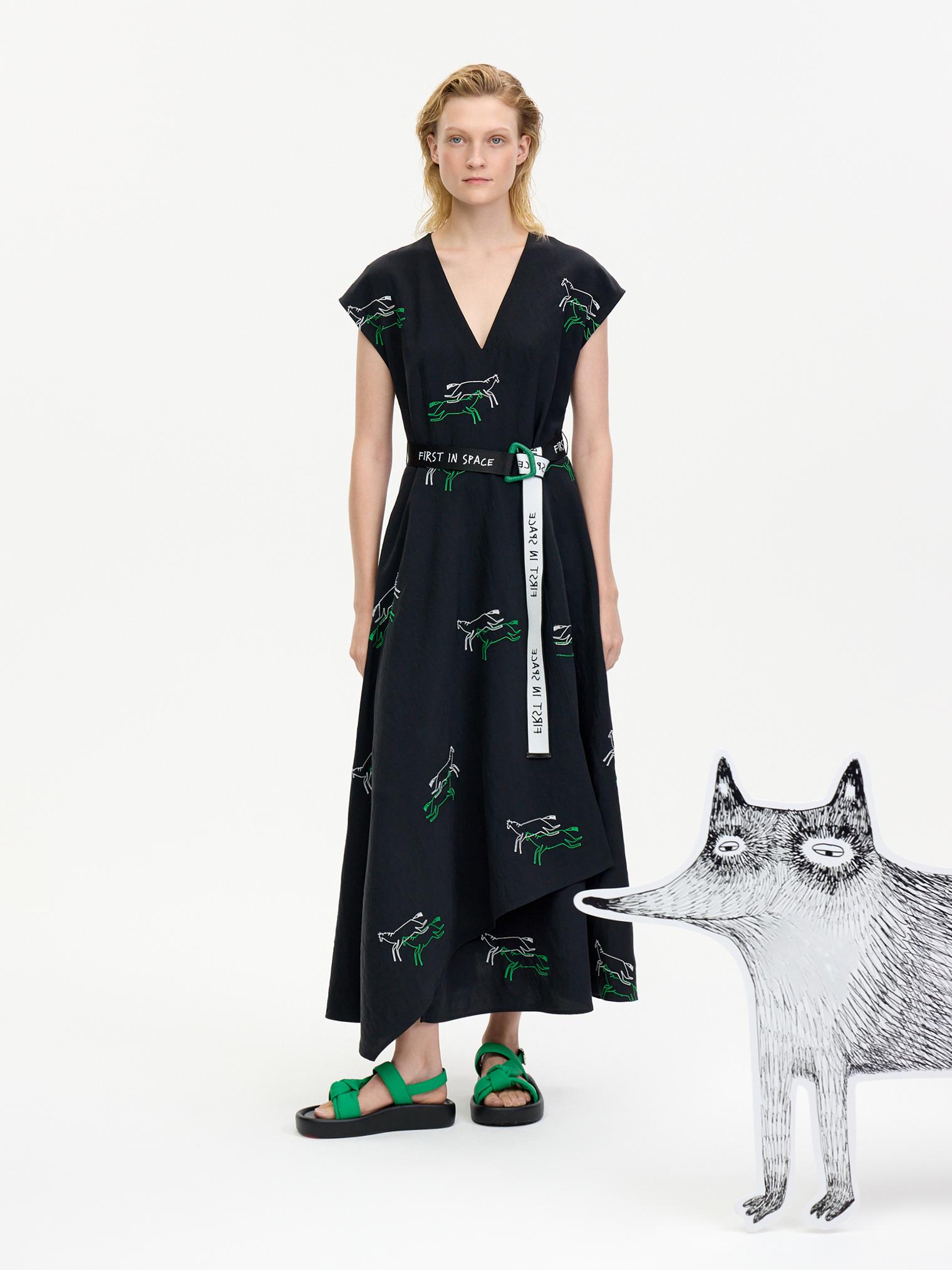 Приталенное платье длины макси с эффектом запаха и асимметричной фигурной линией низа. Выполнено из струящейся благородной бархатистой ткани с контрастной вышивкой. Элегантности придаёт V-образный вырез горловины. Платье дополнено брендированным ремнем из контрастной стропы с фиксацией на яркой декоративной пряжке.