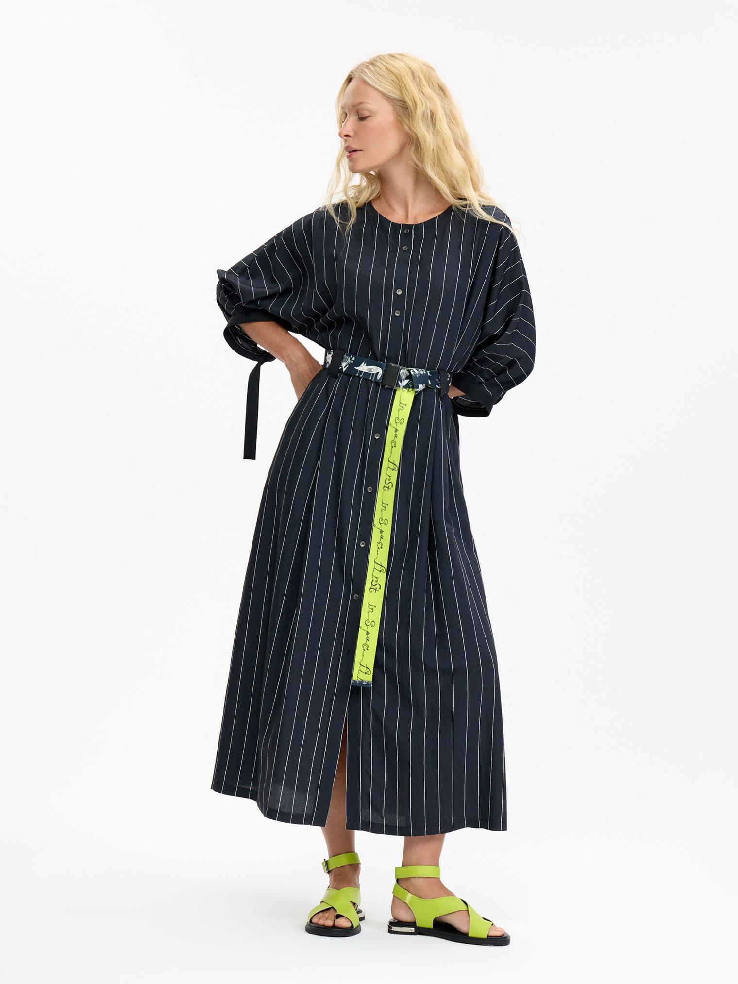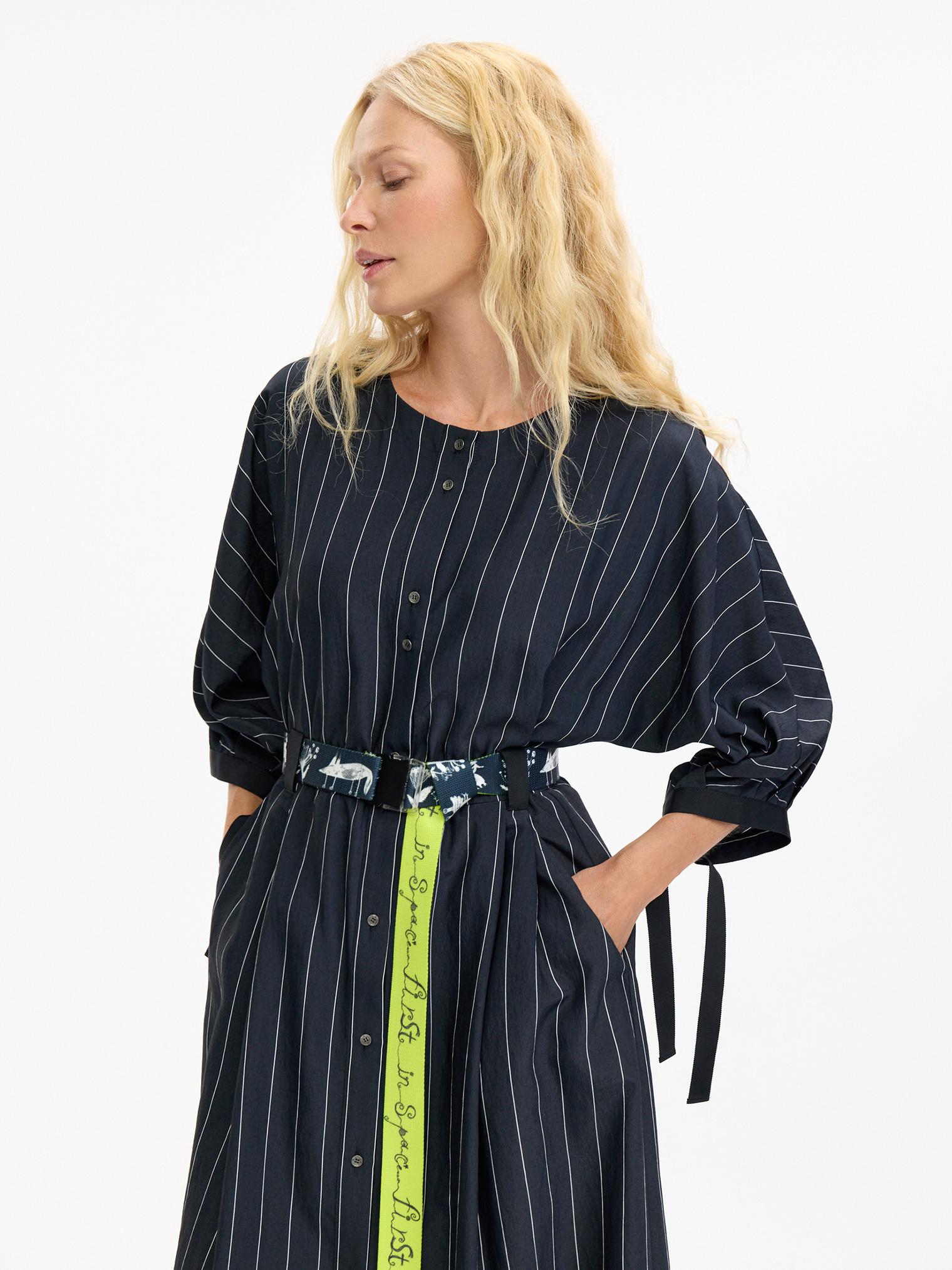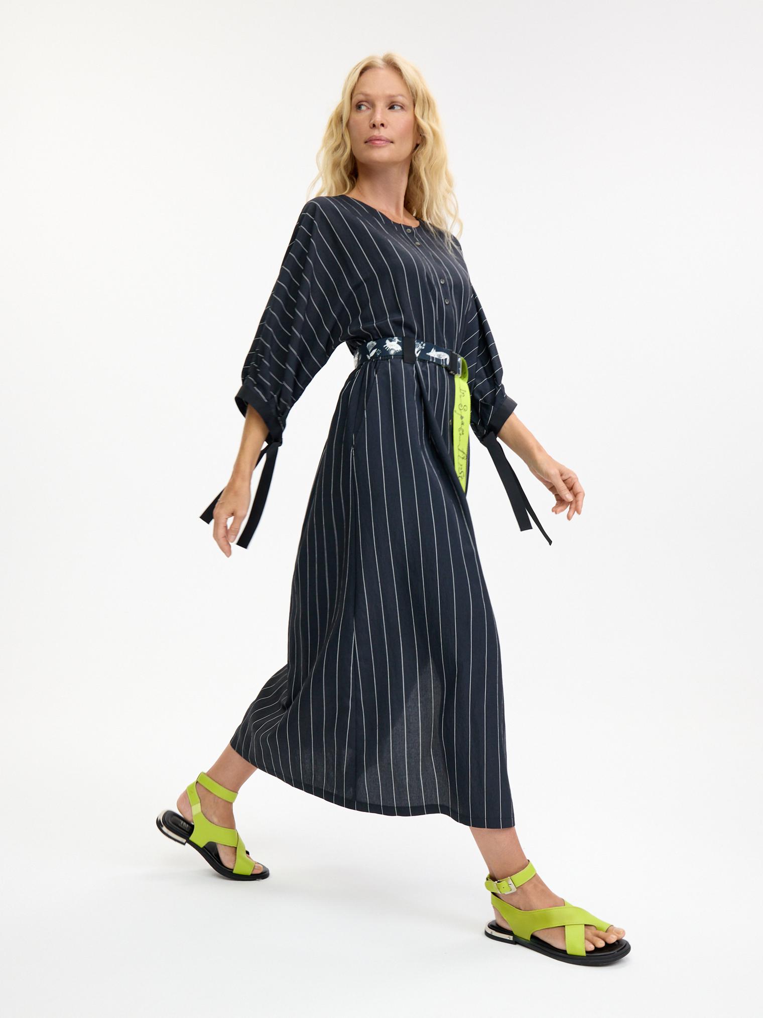 Деликатная белая полоска придает платью из мягкой смесовой вискозы цвета графит изысканную геометричность. Но не бойтесь, что будет скучно – акцентом здесь служат необычные объемные рукава с длинными манжетами-завязками и контрастный пояс-стропа, который окружит сказочными образами, чтобы удивить вас)