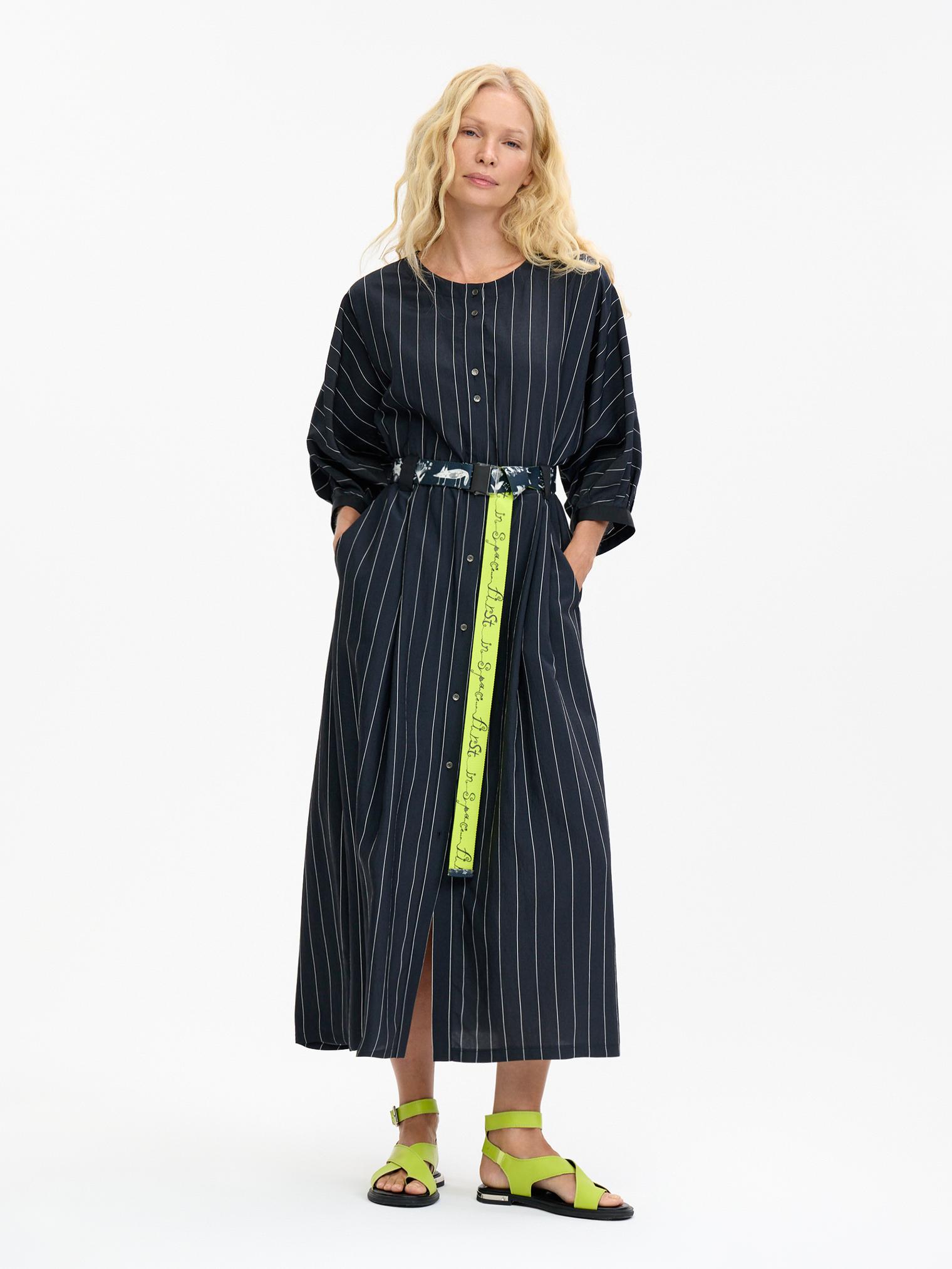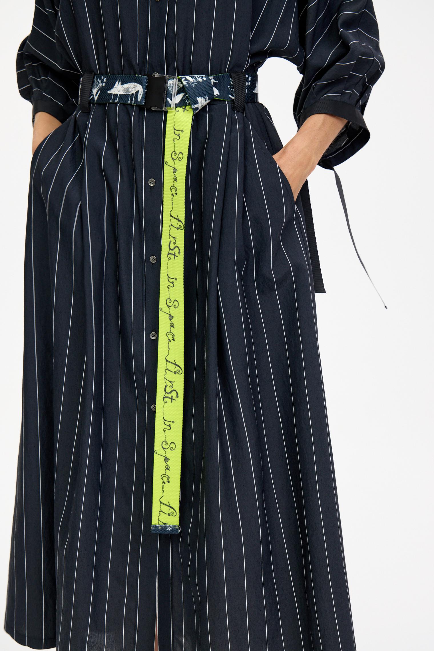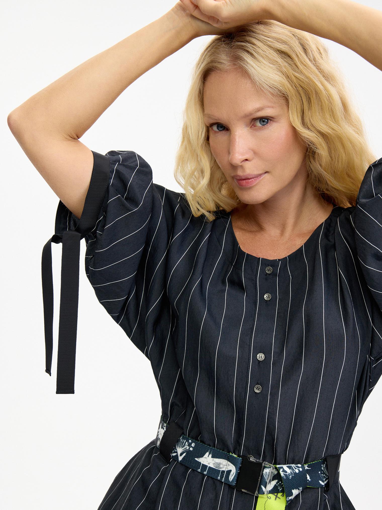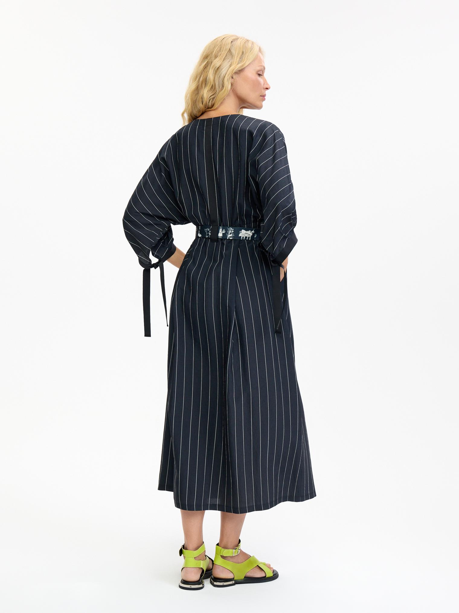 Деликатная белая полоска придает платью из мягкой смесовой вискозы цвета графит изысканную геометричность. Но не бойтесь, что будет скучно – акцентом здесь служат необычные объемные рукава с длинными манжетами-завязками и контрастный пояс-стропа, который окружит сказочными образами, чтобы удивить вас)