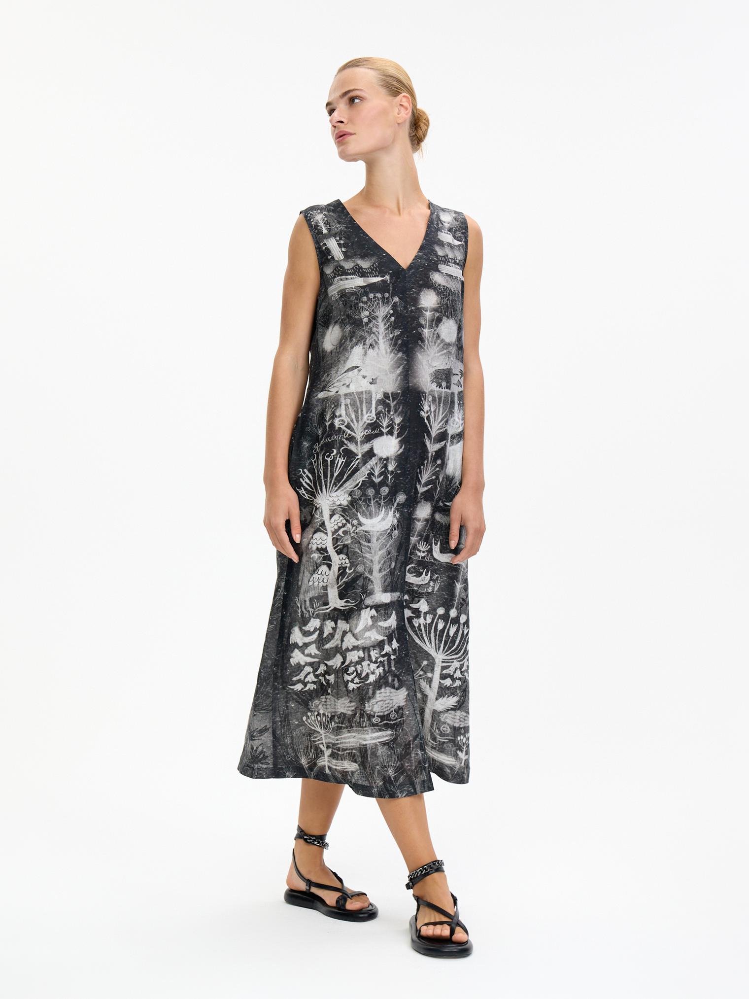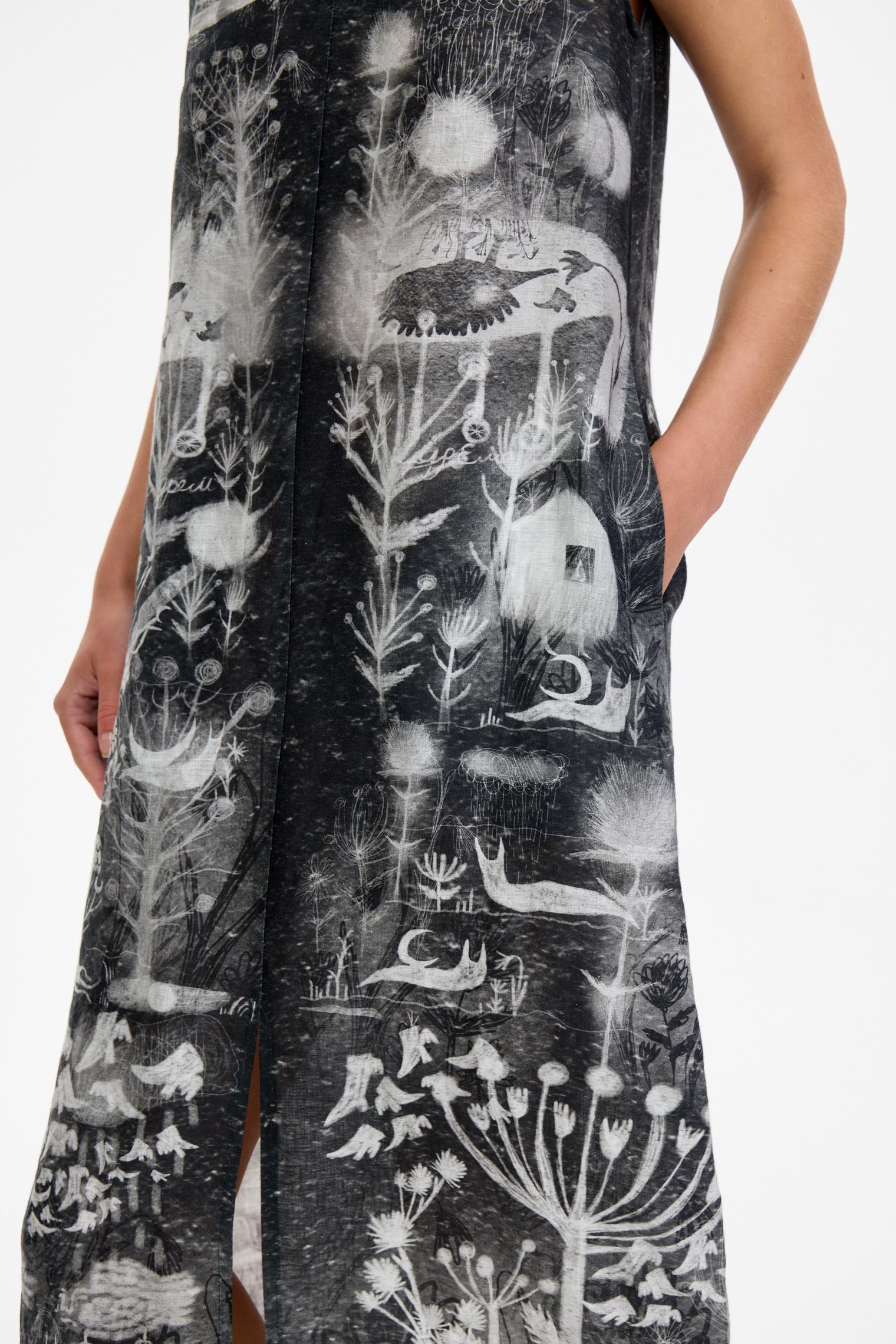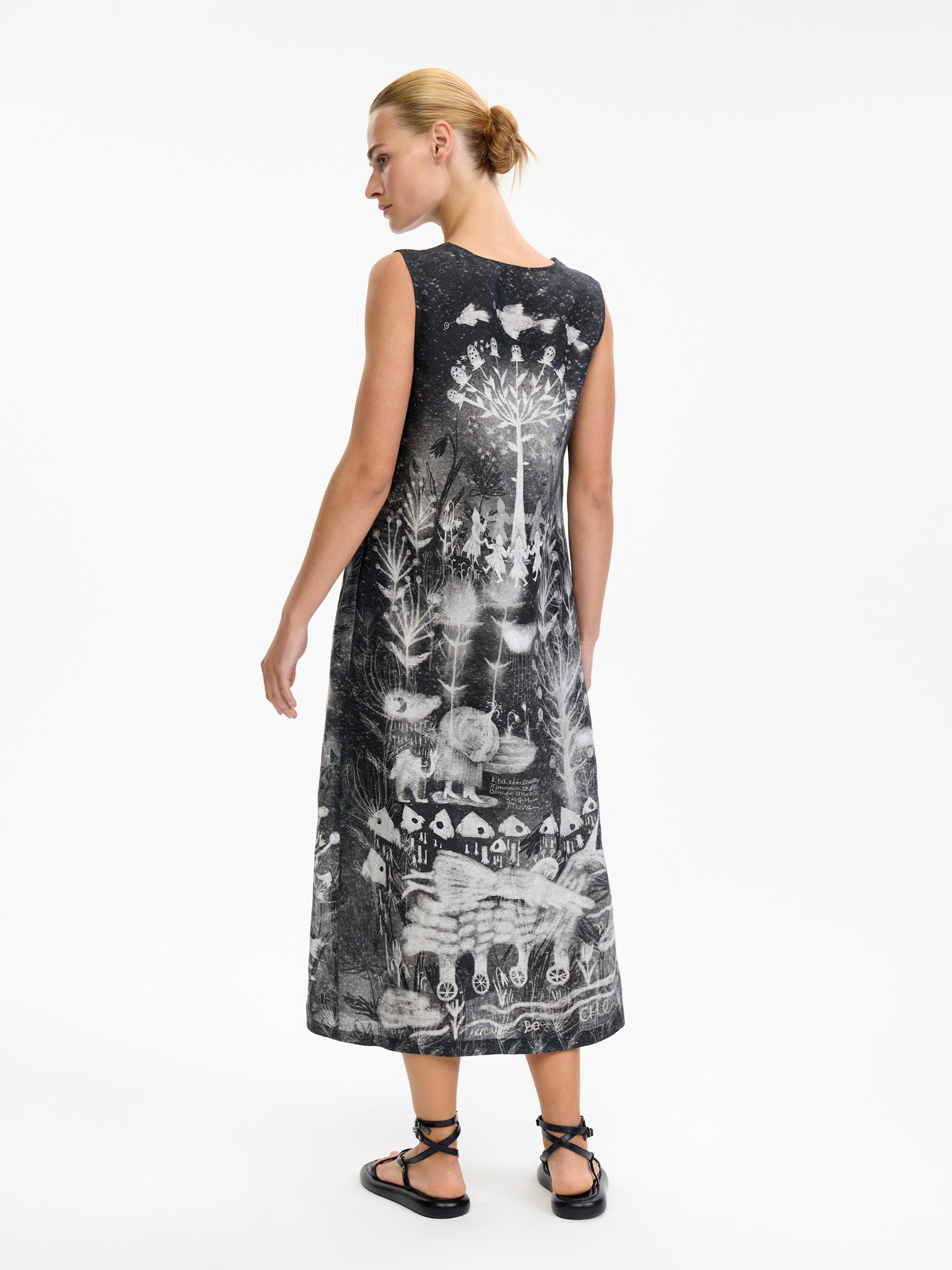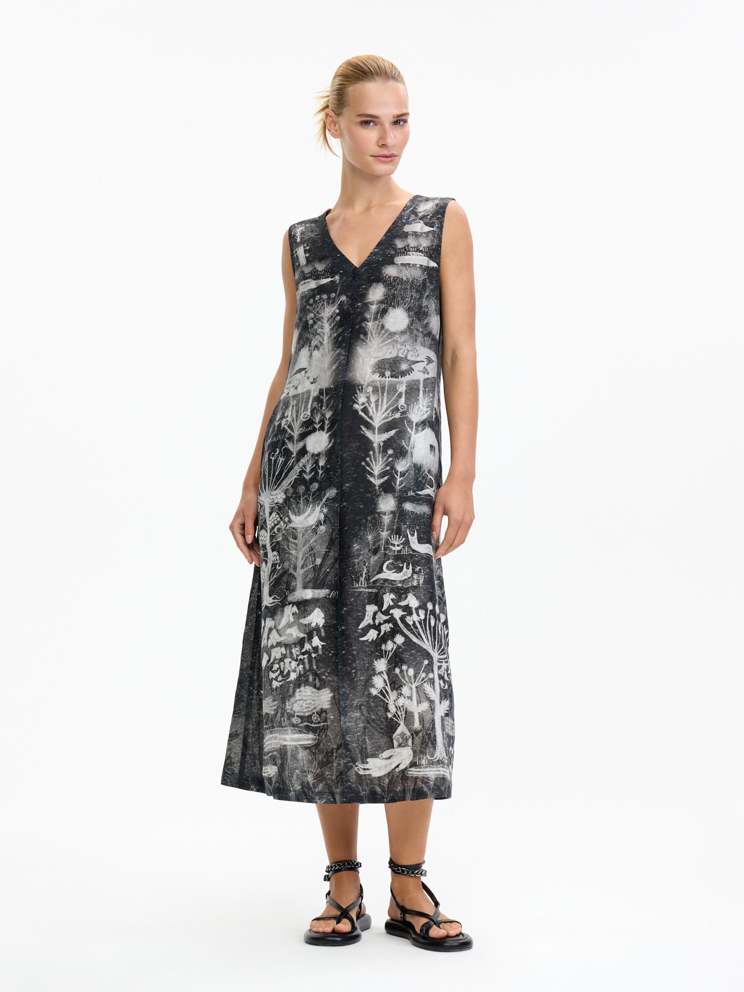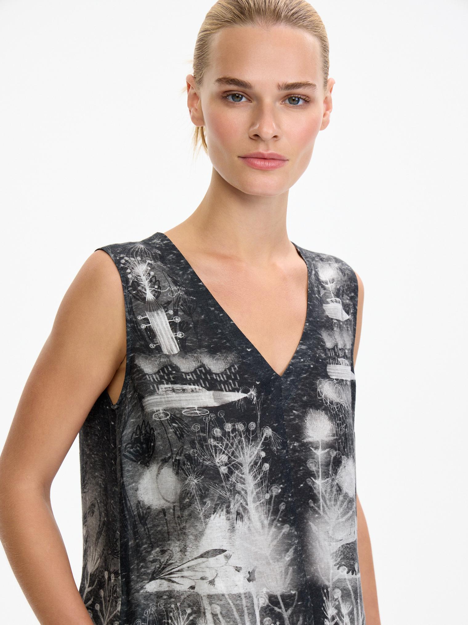 Даже не знаем, что может быть лучше платья из натурального льна? Наверное, только удлиненное платье-майка из натурального льна со сказочно красивым принтом! Его изысканная графика заставит забыть о других цветах на какое-то время, царить будет черно-белая утонченность.