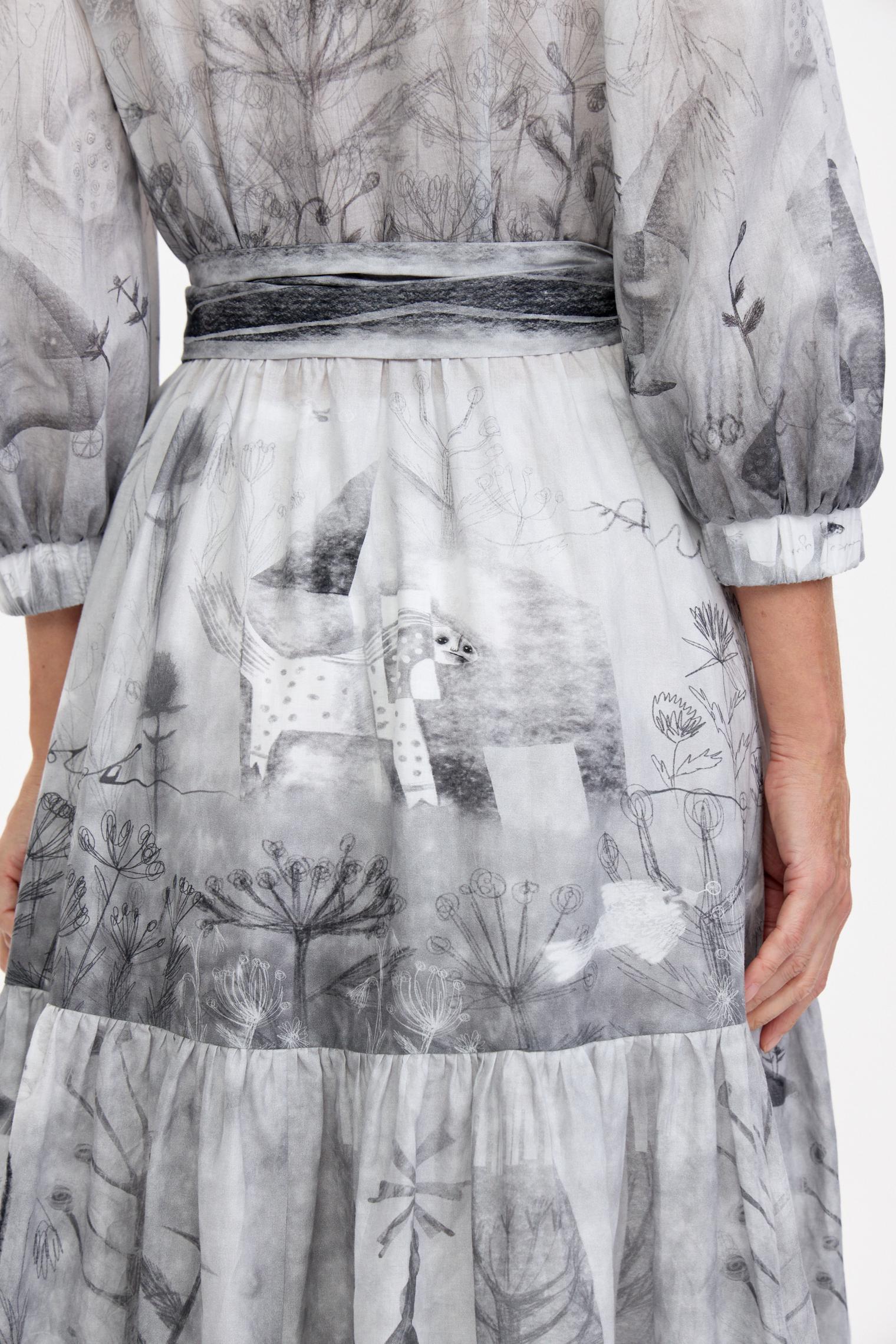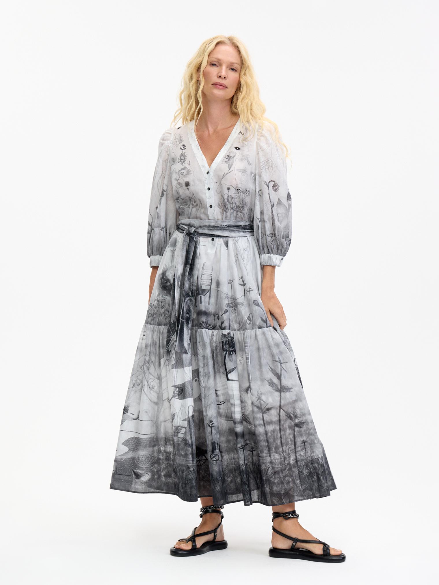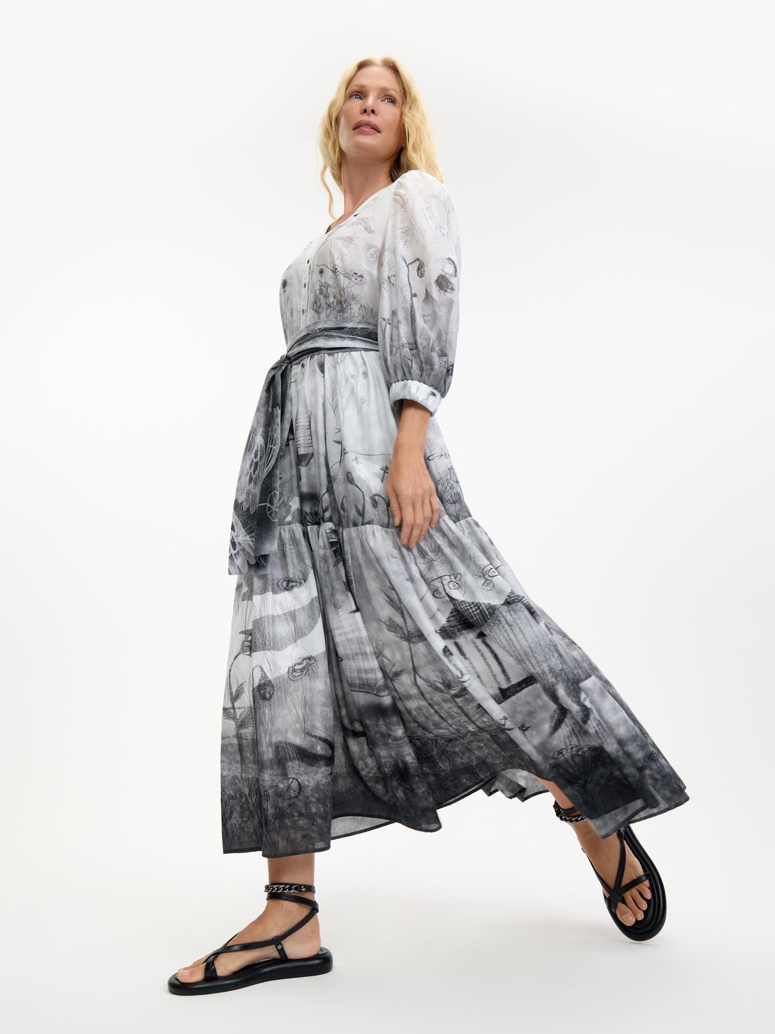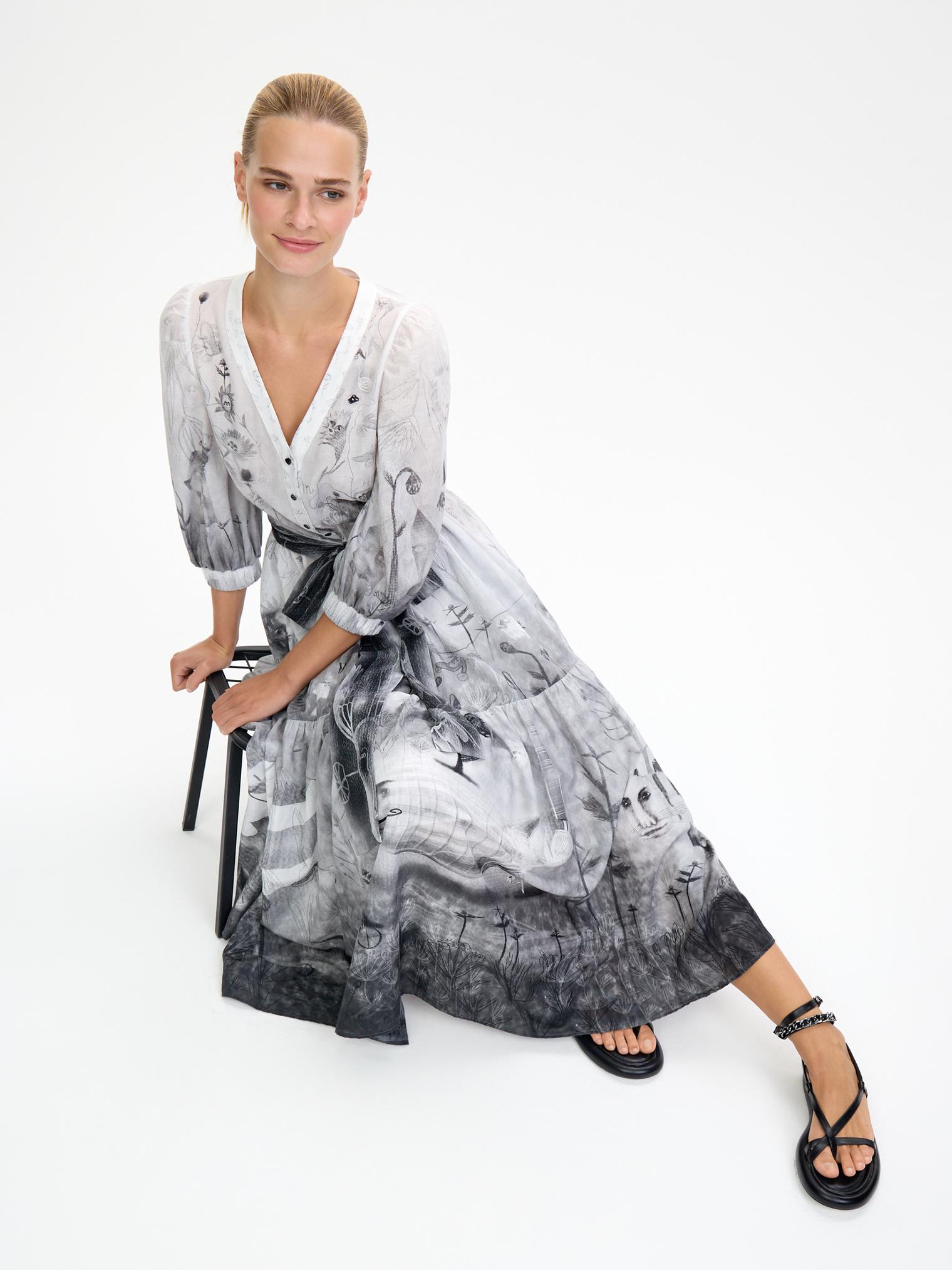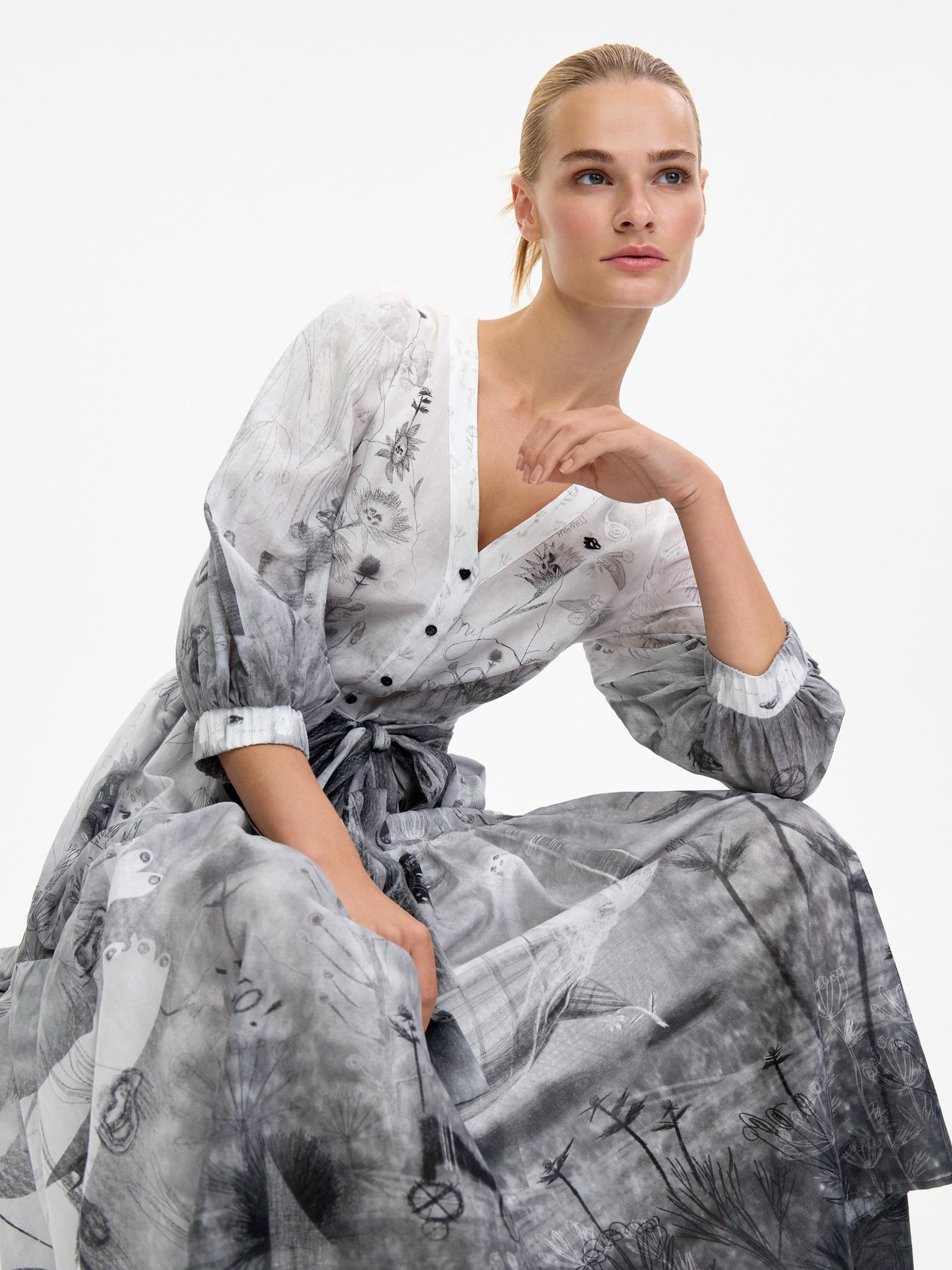 Романтичное платье летящего силуэта из нежнейшей хлопковой вуали уникально своим сложным дизайнерским принтом – присмотритесь, не правда ли завораживает и уносит в мир грез? А может, вы видели его во сне?)
