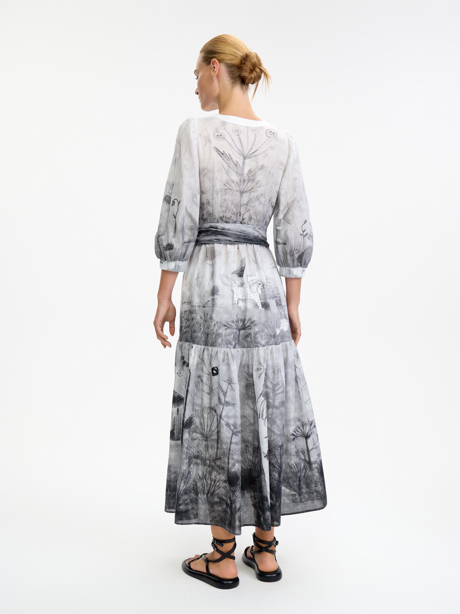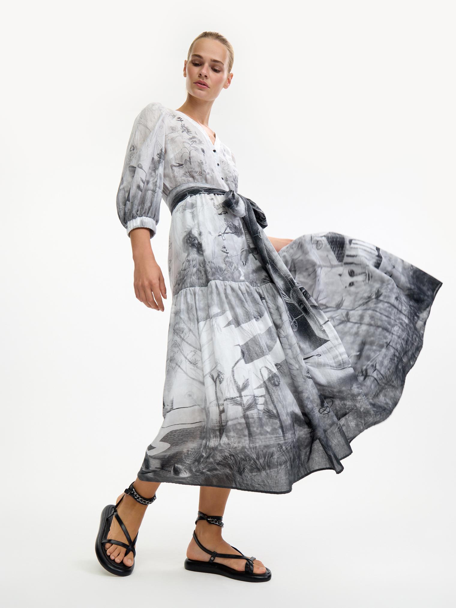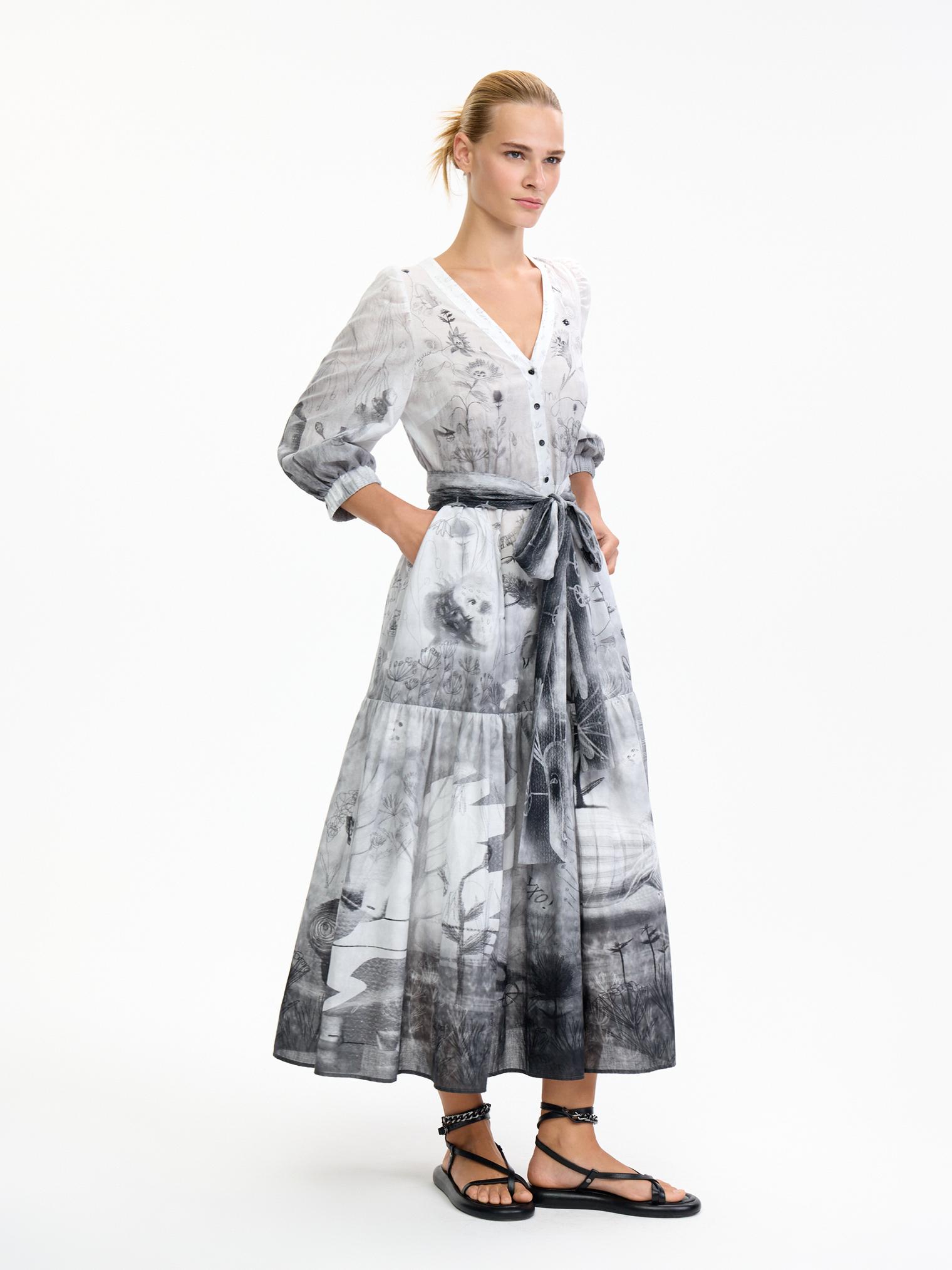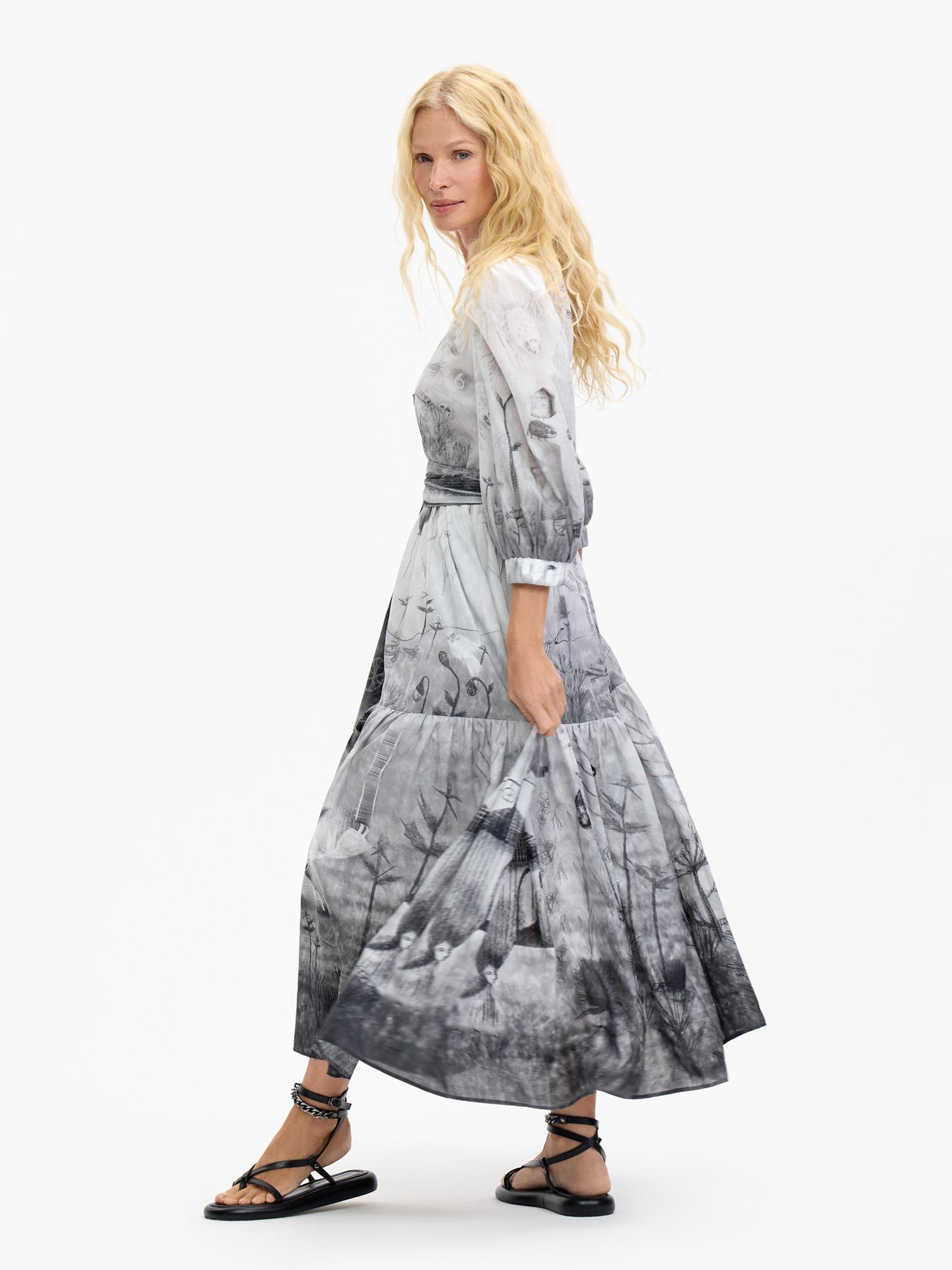 Романтичное платье летящего силуэта из нежнейшей хлопковой вуали уникально своим сложным дизайнерским принтом – присмотритесь, не правда ли завораживает и уносит в мир грез? А может, вы видели его во сне?)