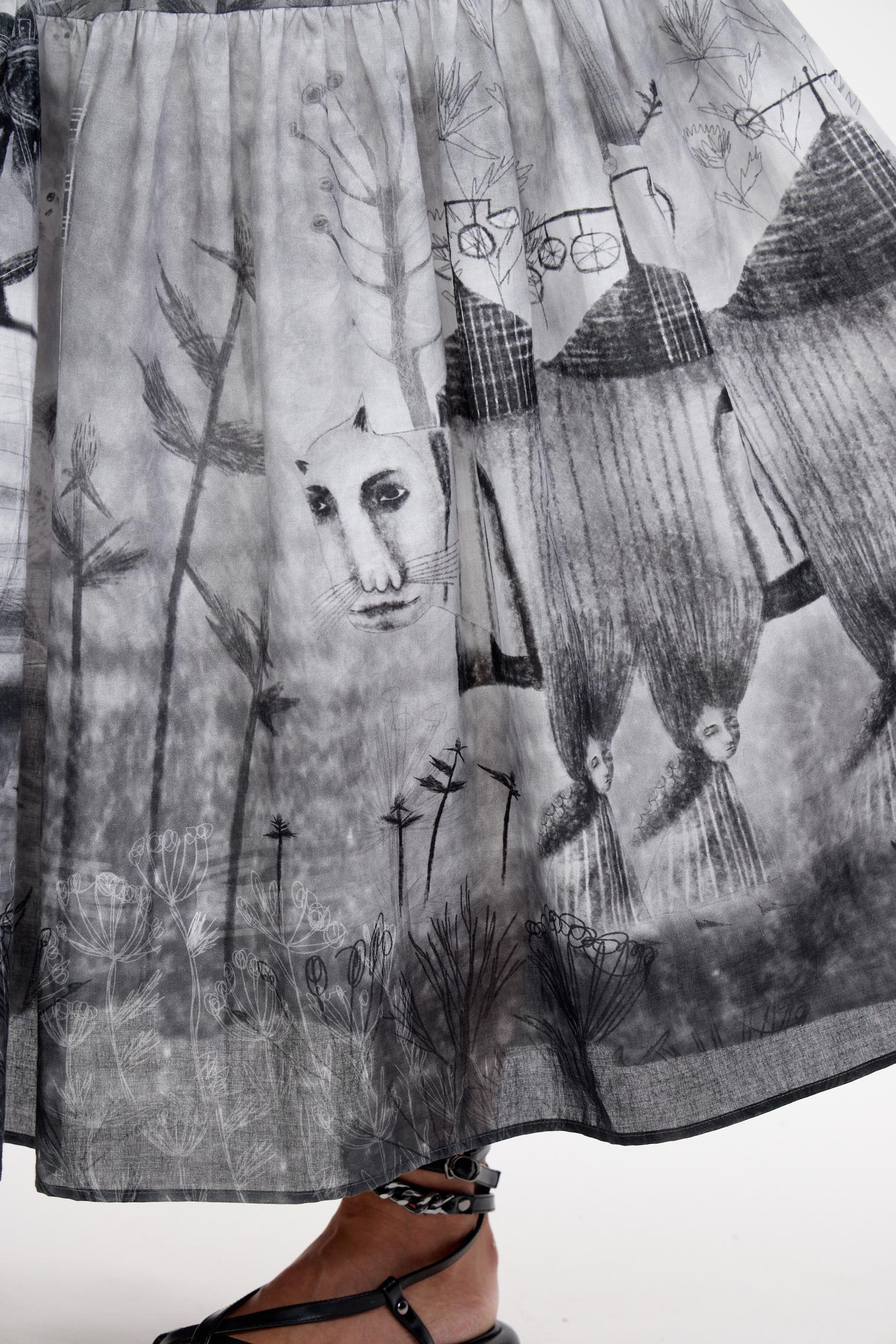 От дизайнера Лизы: «Это платье иллюстрирует переход от первой фазы сна, тонкой и прерывистой, к последней – тягучей и глубокой. В первой фазе растения обретают человеческие очертания и начинают говорить, во второй (промежуточной и самой спокйной) одинокая клубничка работает парикмахером для женщин-кустов, а лошадка селится в доме, который выпорхнул из 3 фазы – самой глубокой; в ней некий женский силуэт взращивает эти дома на плантации, пока за ней медленно плывет дирижабль и сумрачный котоног...»