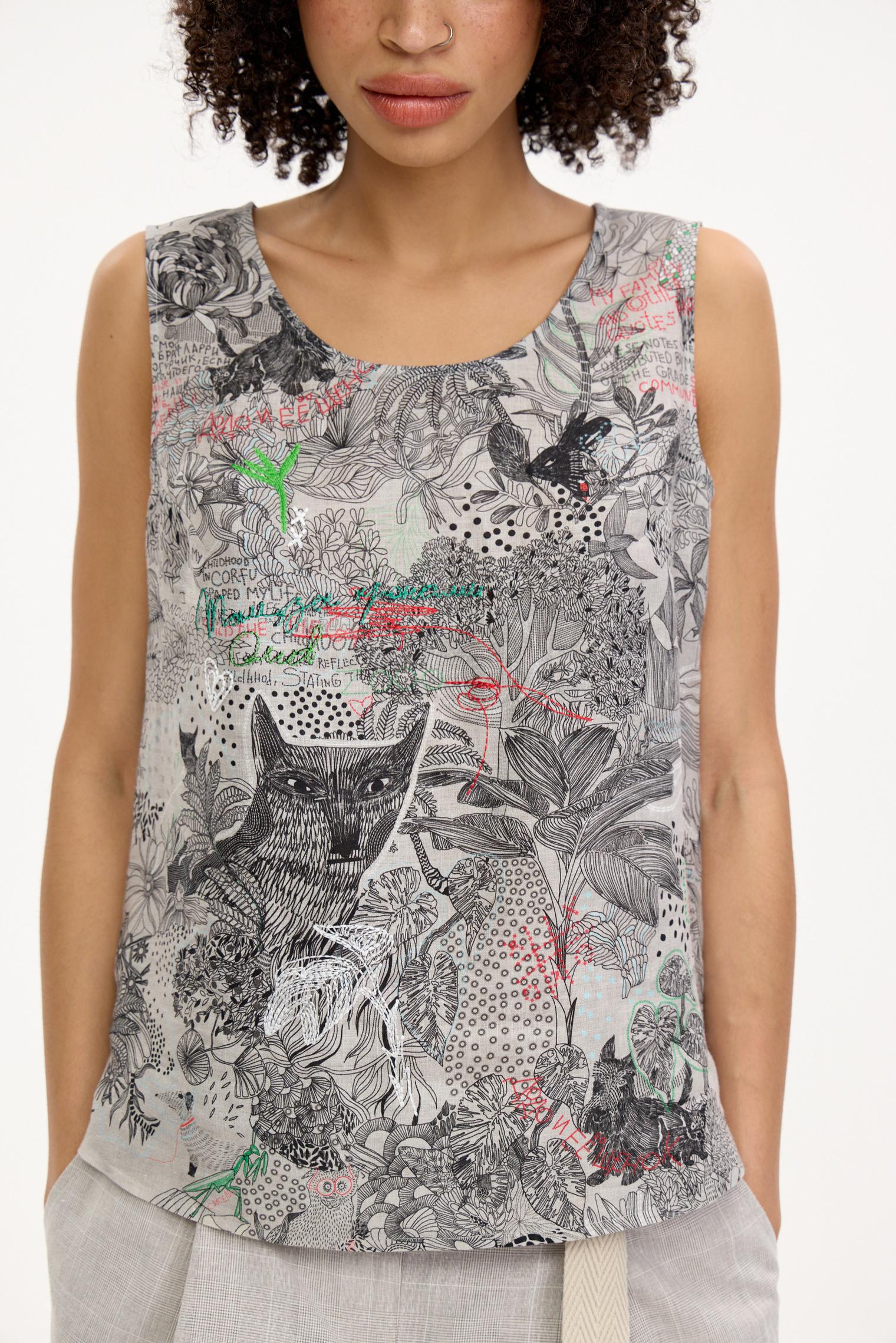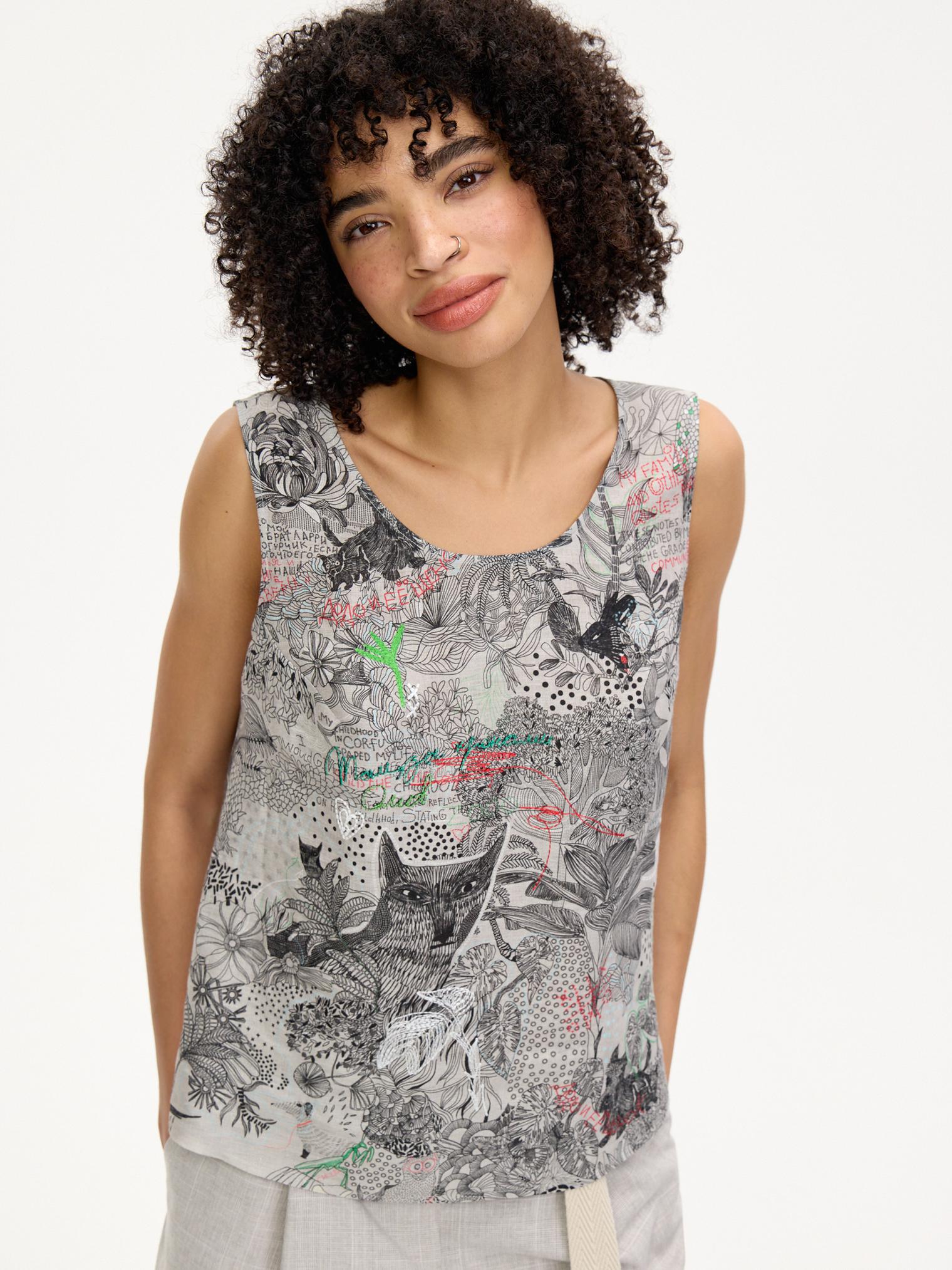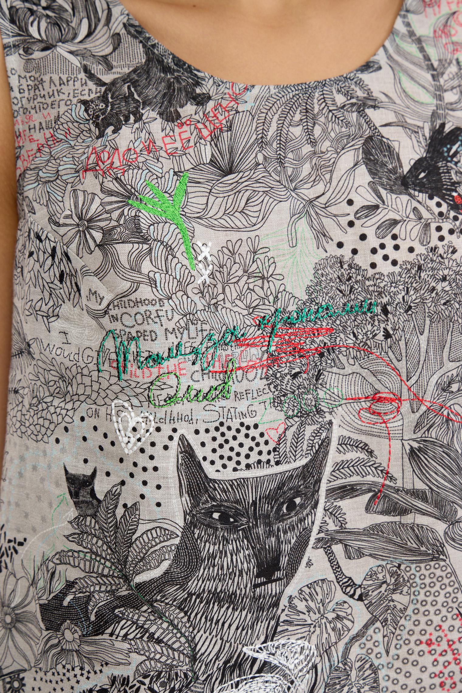 Лаконичный топ из тонкой льняной ткани серебристого цвета украшен изящным принтом и акцентными яркими вышивками.