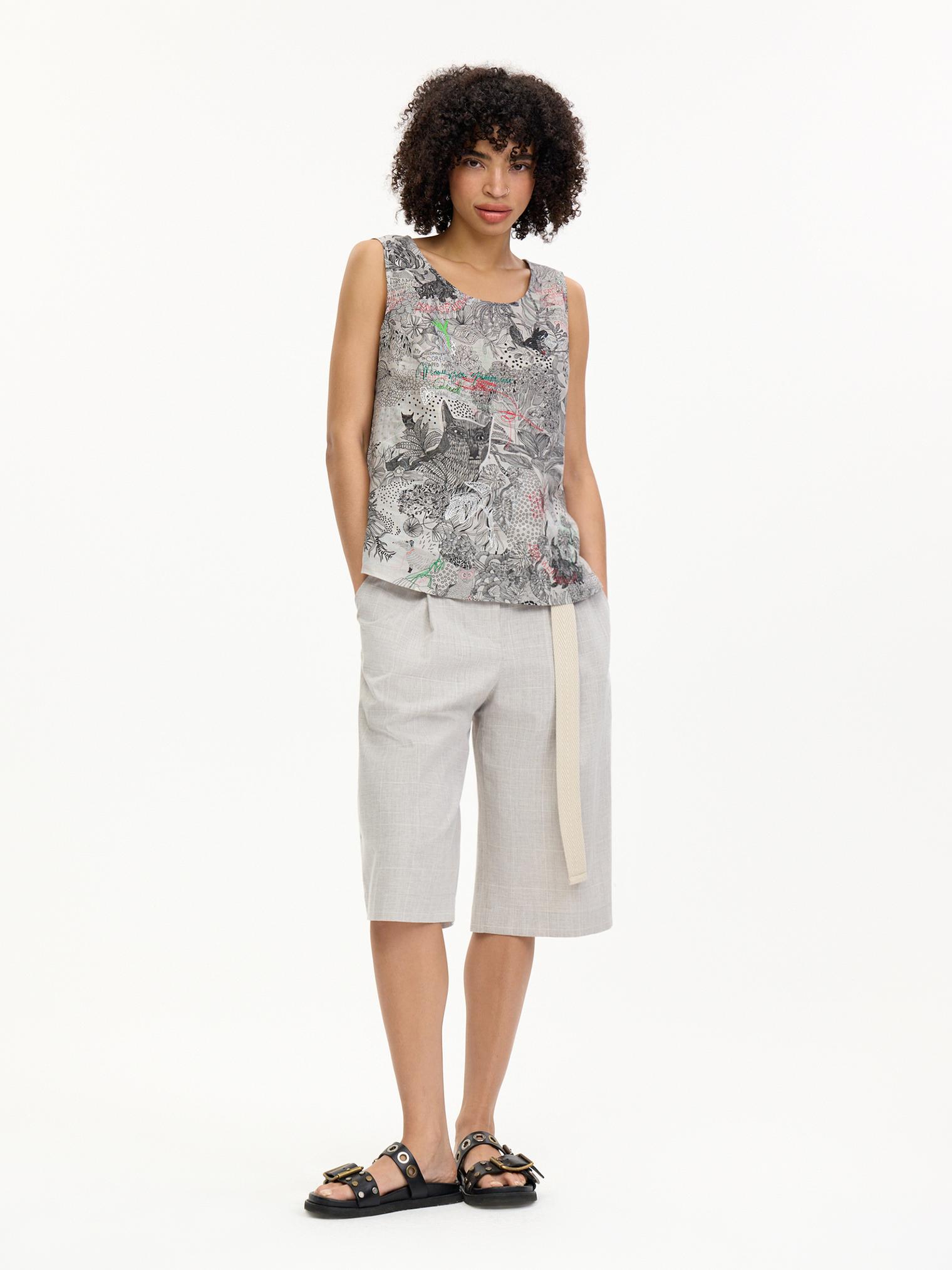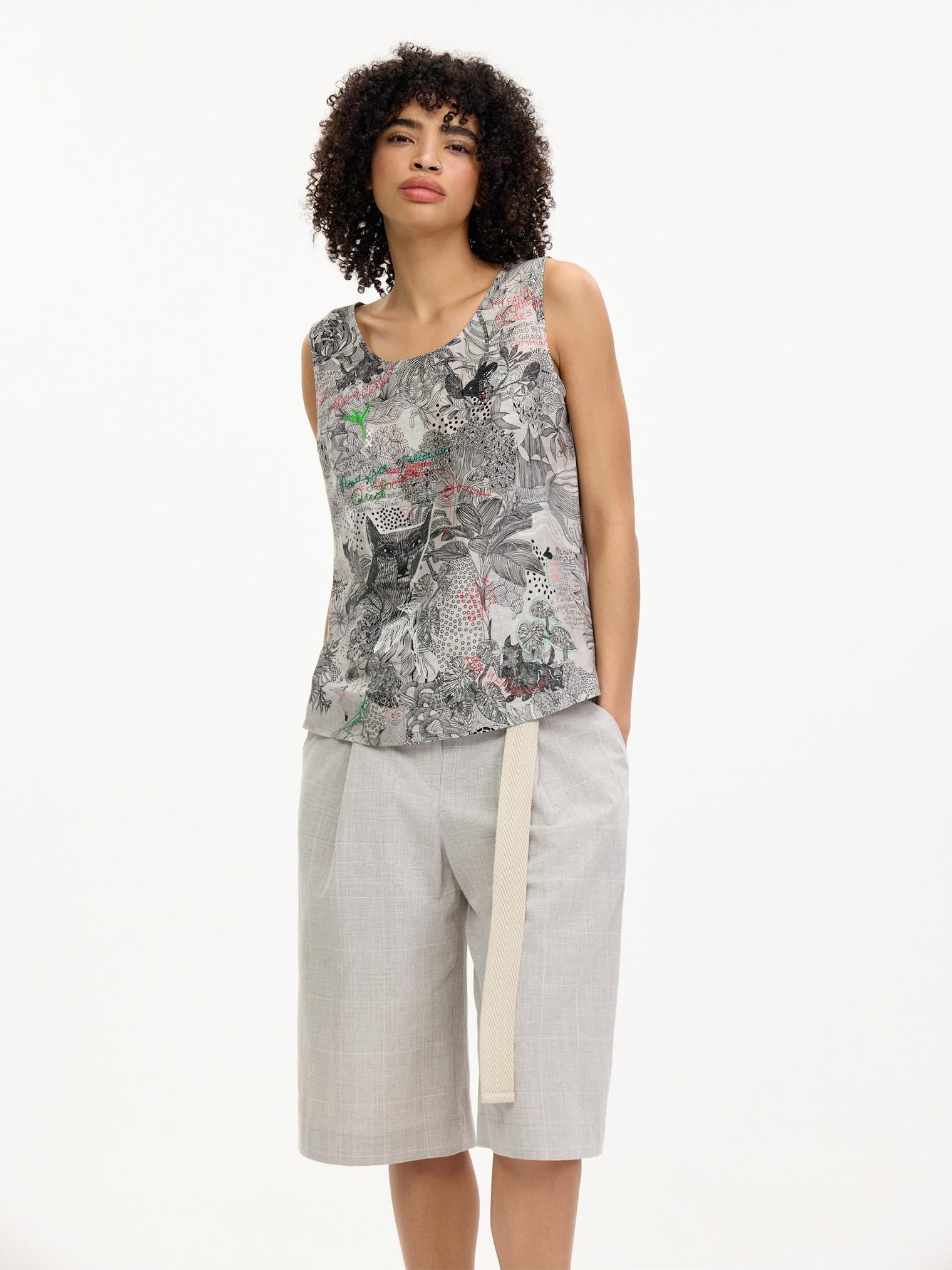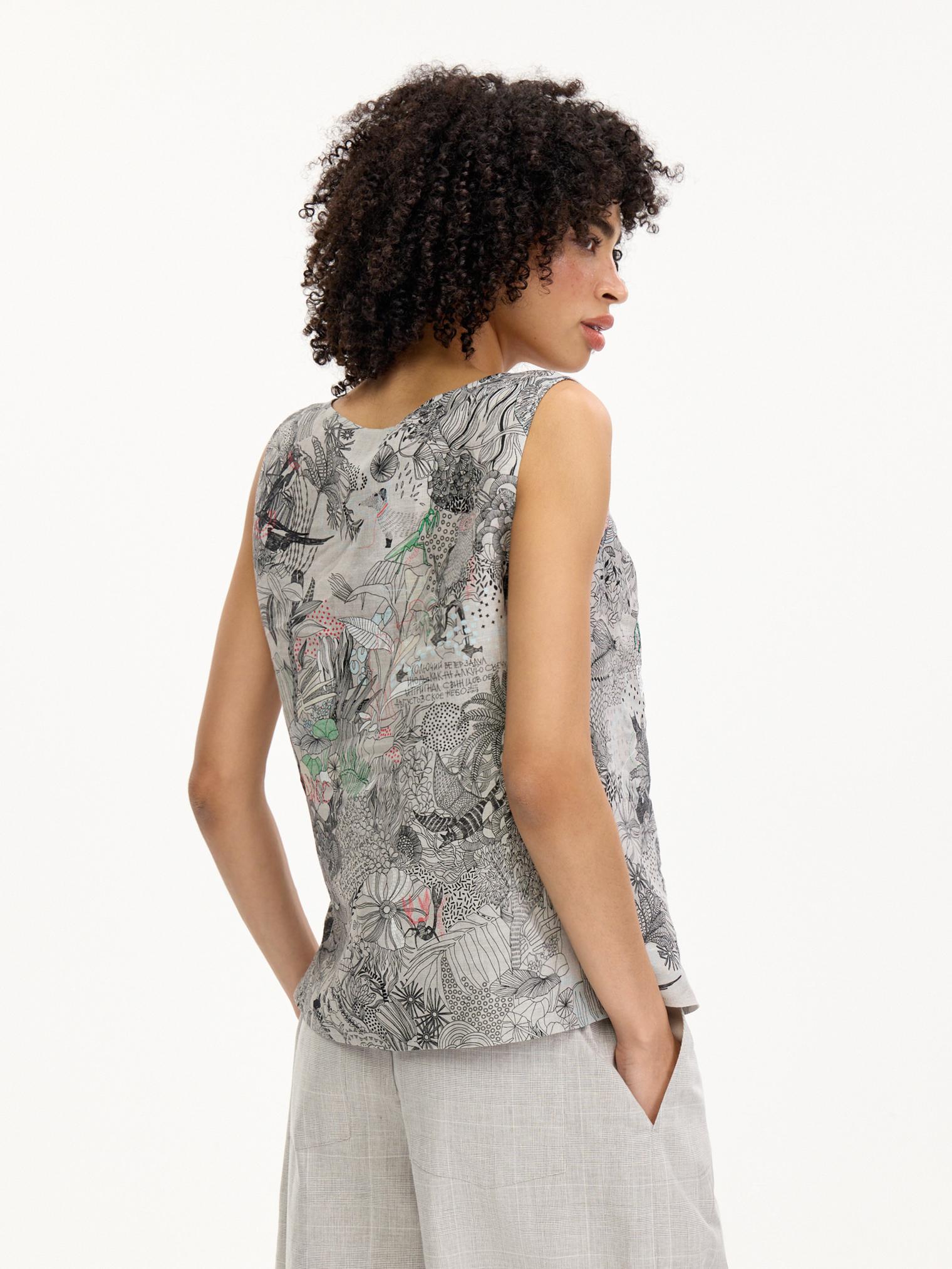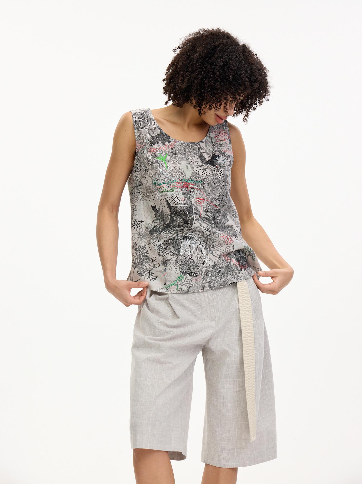 Лаконичный топ из тонкой льняной ткани серебристого цвета украшен изящным принтом и акцентными яркими вышивками.