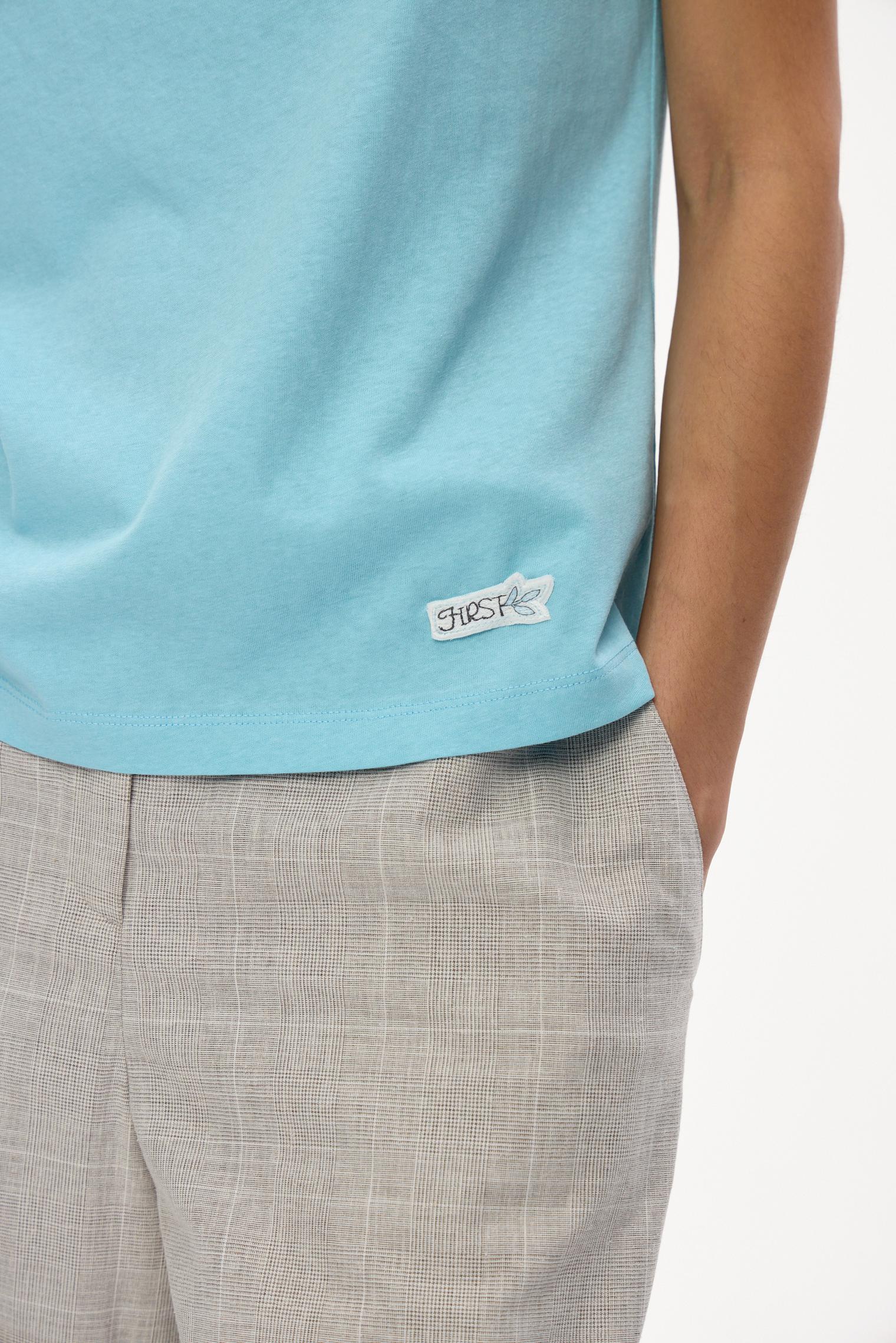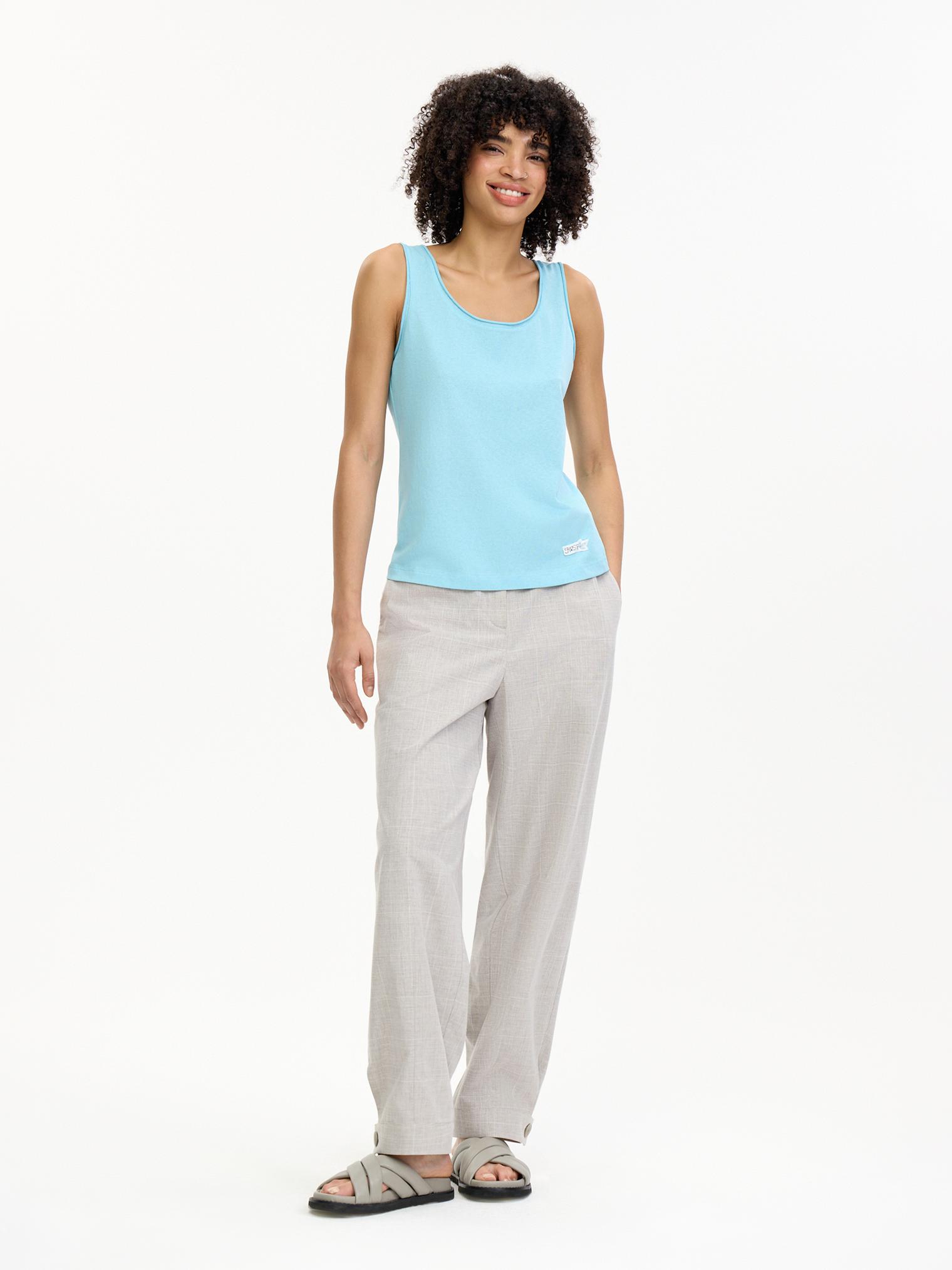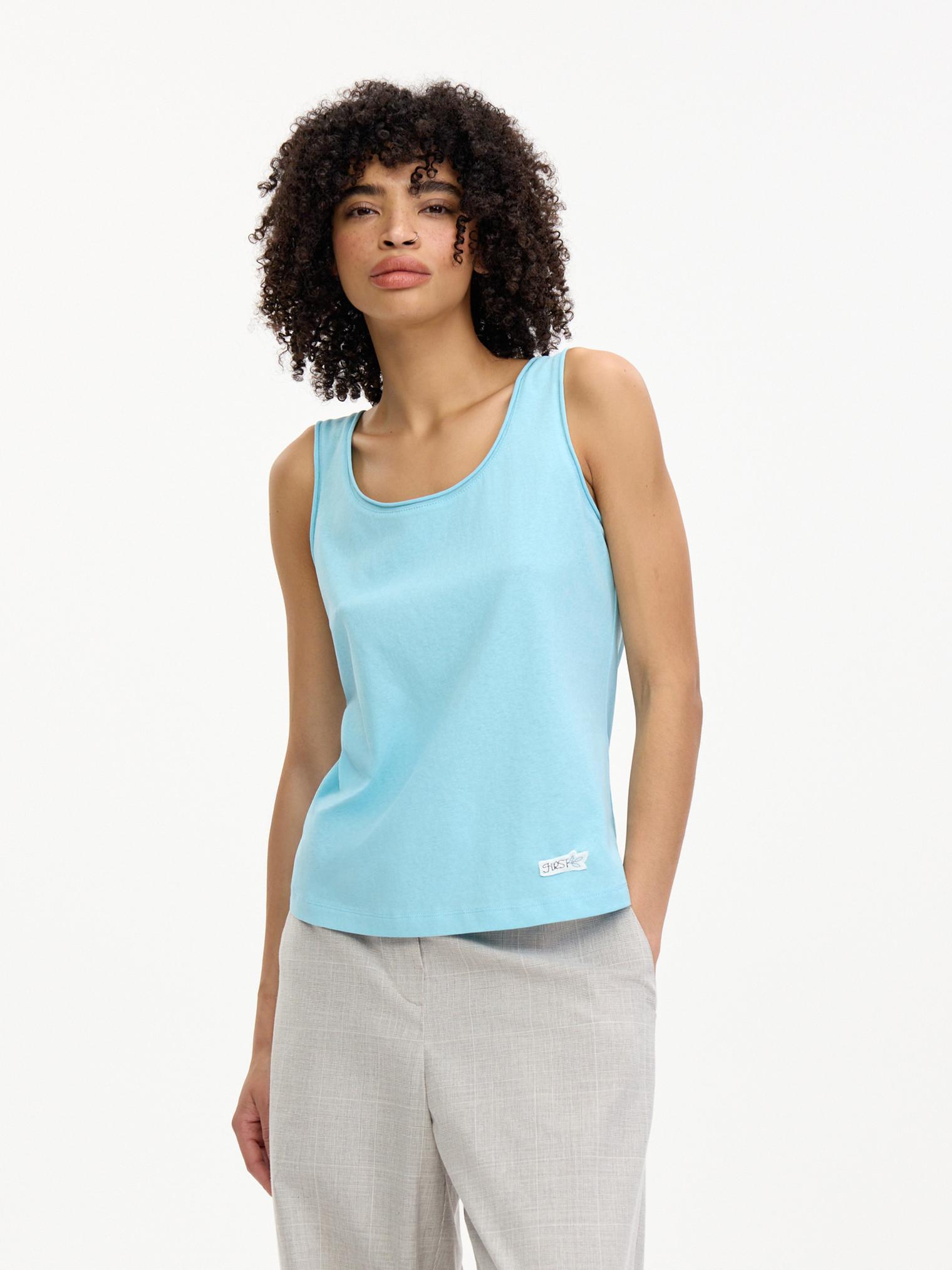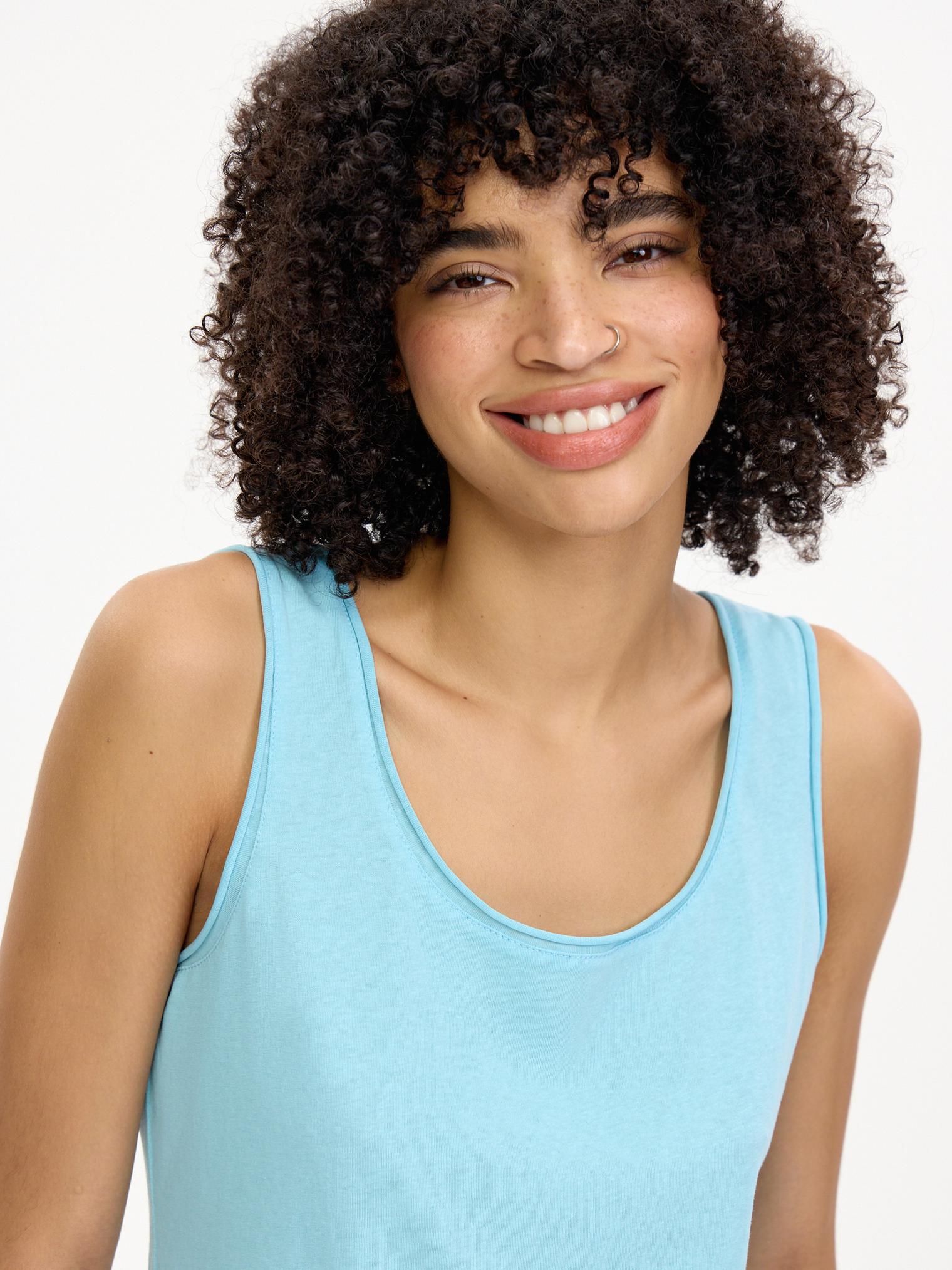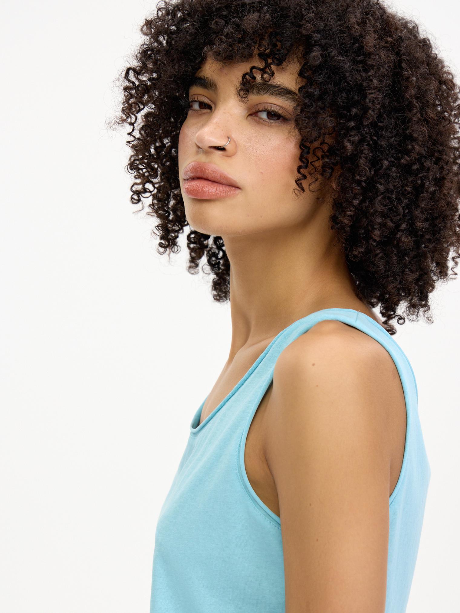 Базовый топ из комфортного хлопкового трикотажа свежего голубого цвета с выраженной фактурой станет идеальным дополнением летнего гардероба. Обработка краев пройм и горловины с открытым срезом добавляет стильный акцент.