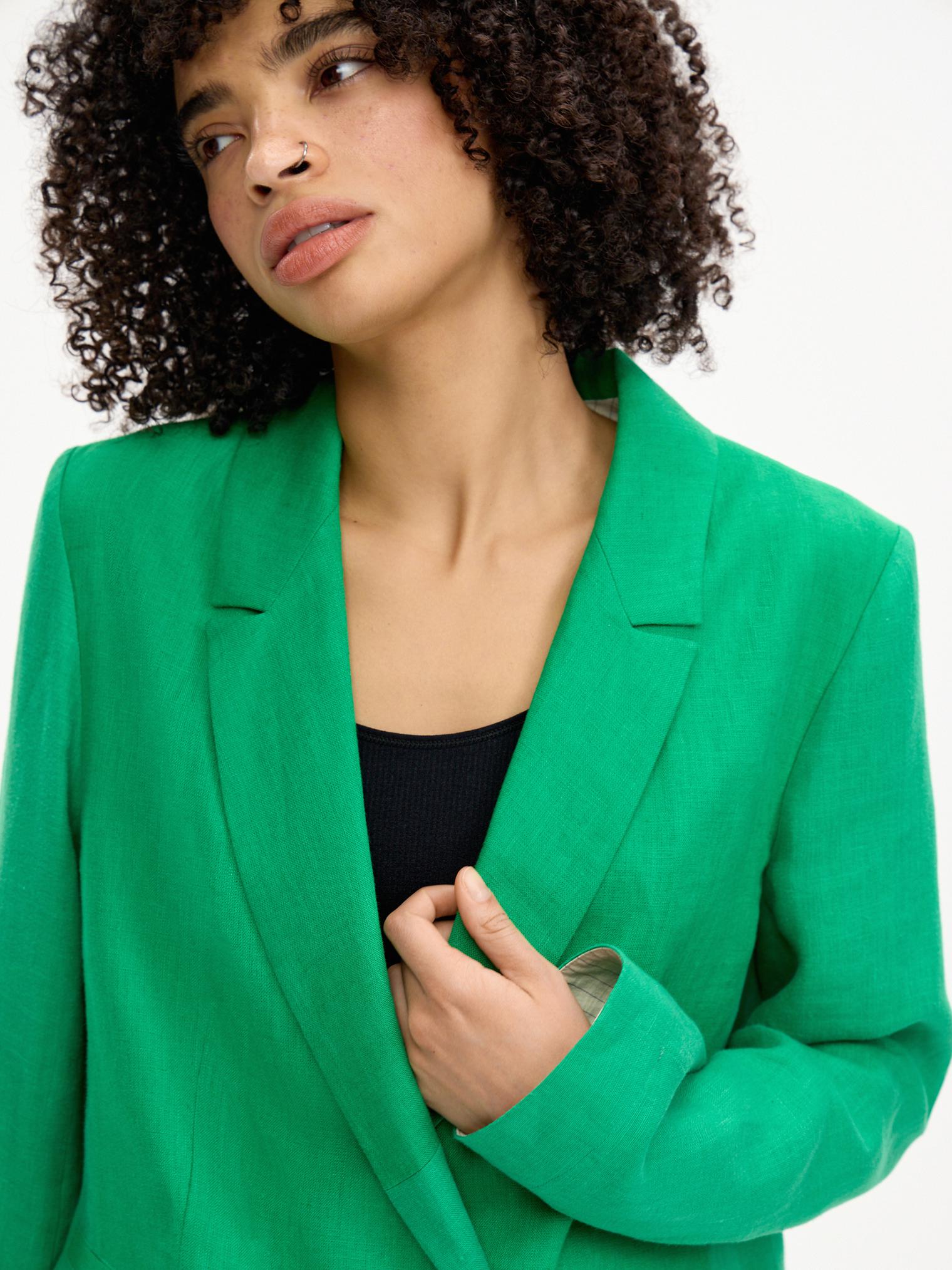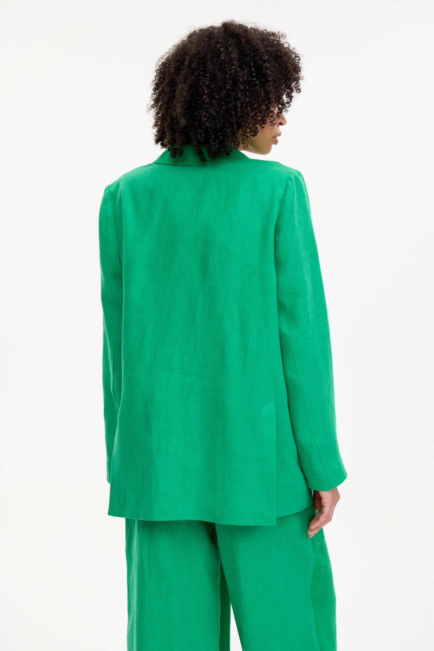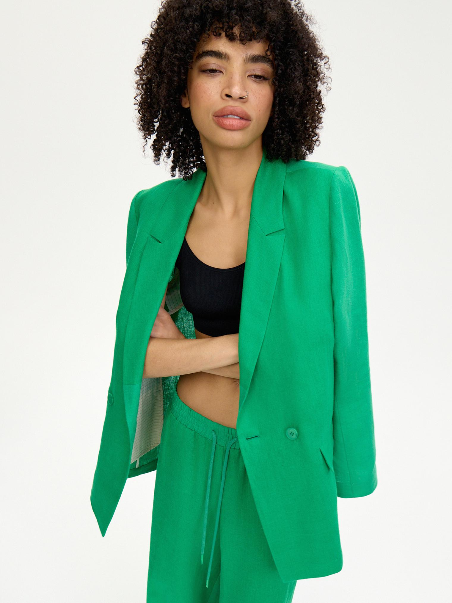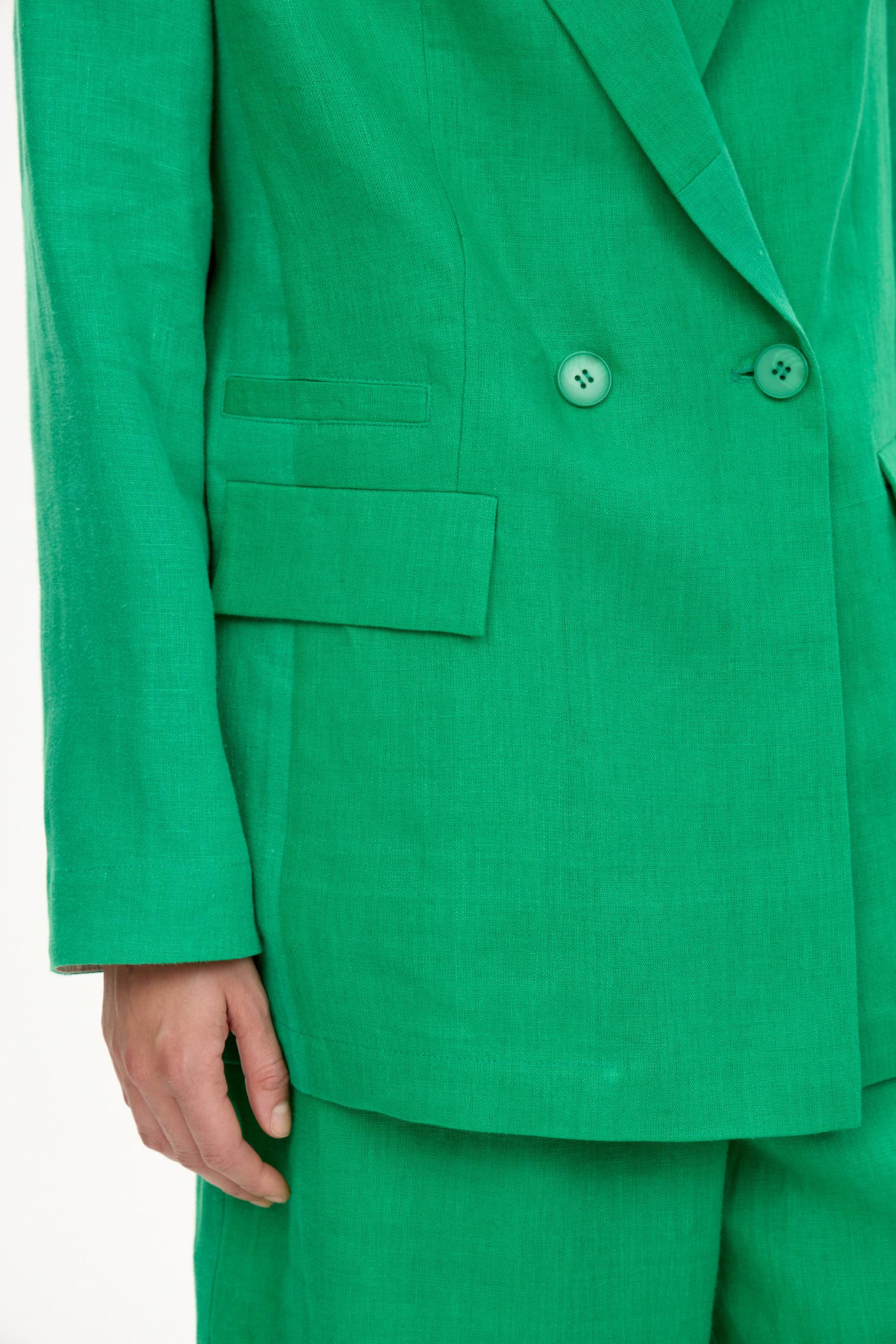 Двубортный прямой жакет из пластичного льна насыщенного зеленого цвета – стильный и универсальный элемент гардероба и изделие вне времени. Оригинальная деталь - частичная контрастная подкладка с принтом. Рекомендуем сочетать с брюками из аналогичной ткани 7026-075-06 для создания гармоничного костюма или с брюками и юбками из капсулы для более непринужденного образа.