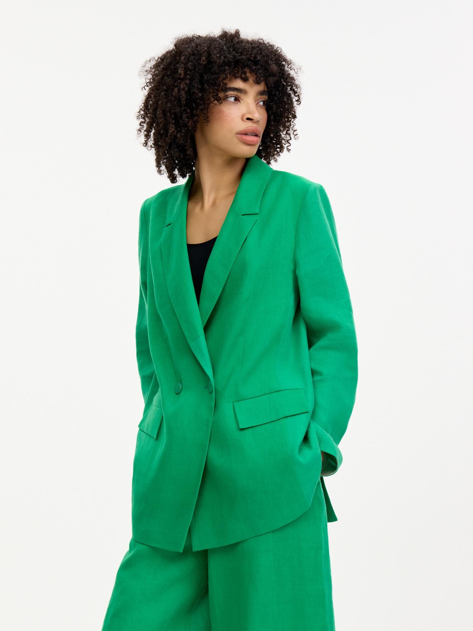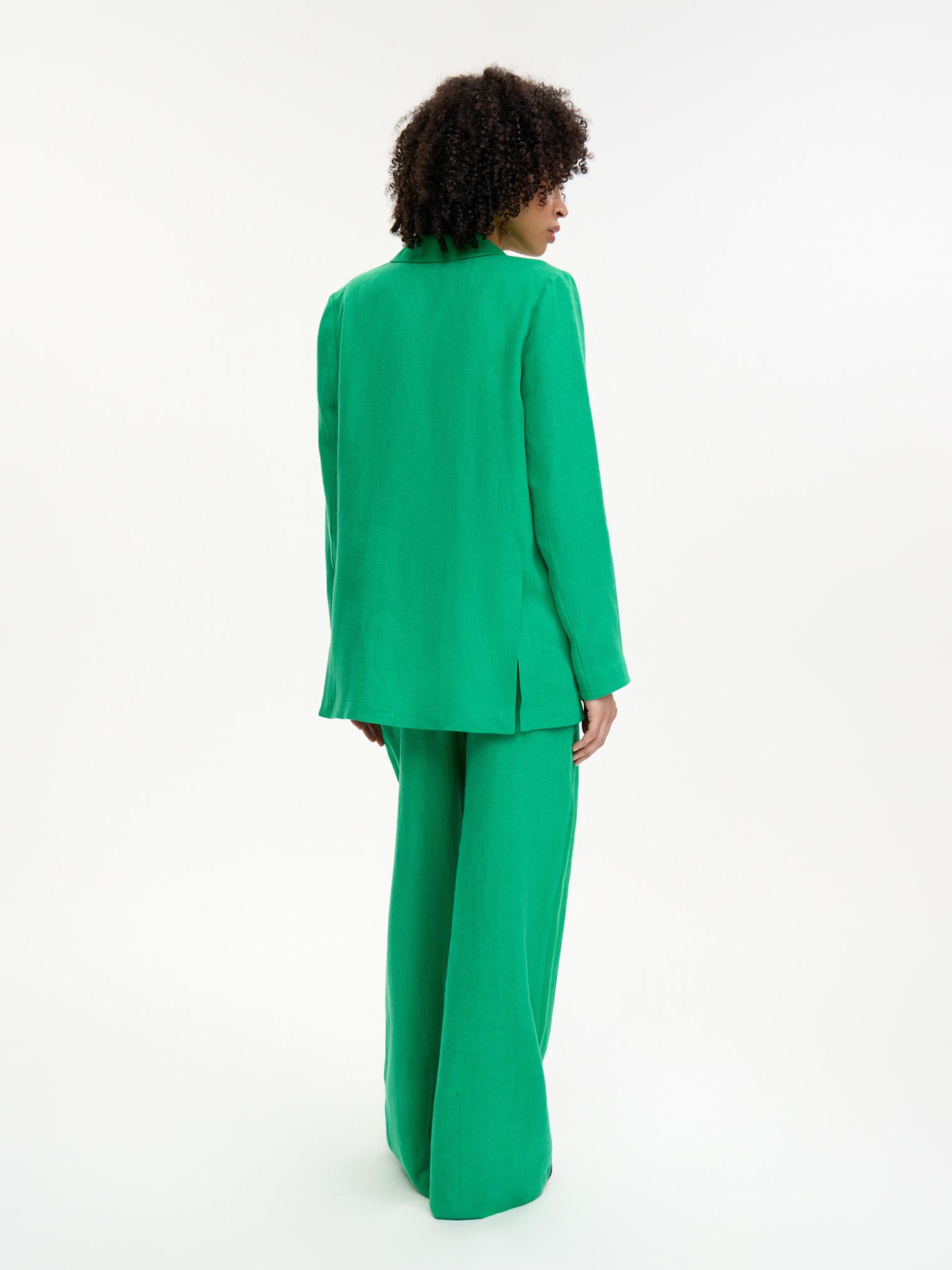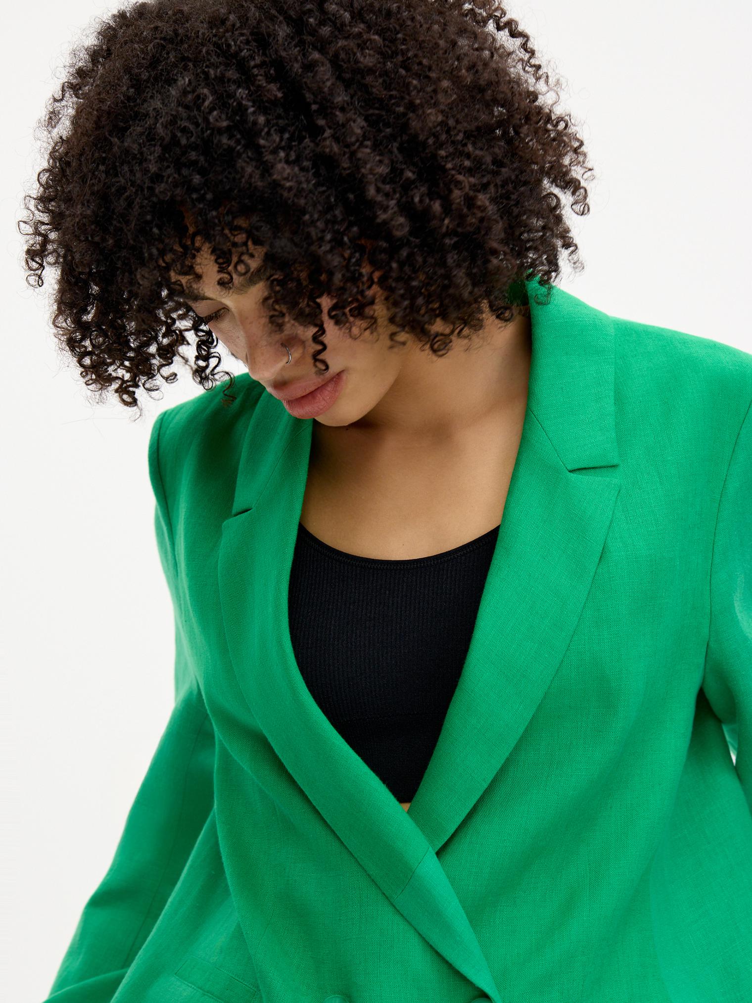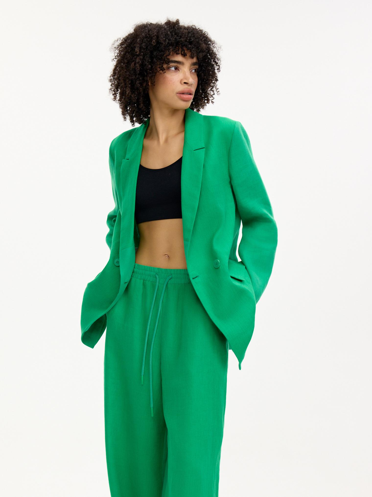 Двубортный прямой жакет из пластичного льна насыщенного зеленого цвета – стильный и универсальный элемент гардероба и изделие вне времени. Оригинальная деталь - частичная контрастная подкладка с принтом. Рекомендуем сочетать с брюками из аналогичной ткани 7026-075-06 для создания гармоничного костюма или с брюками и юбками из капсулы для более непринужденного образа.