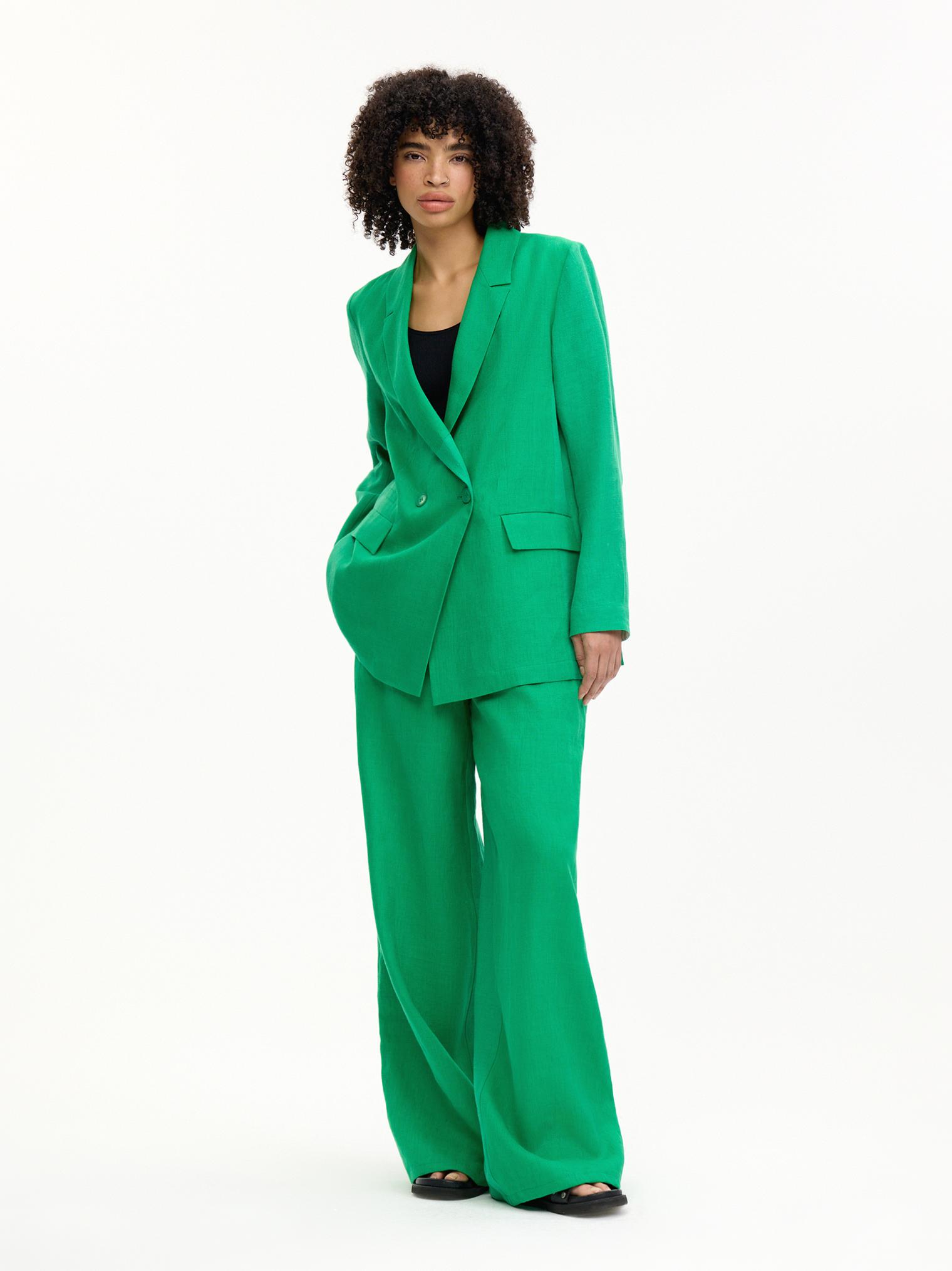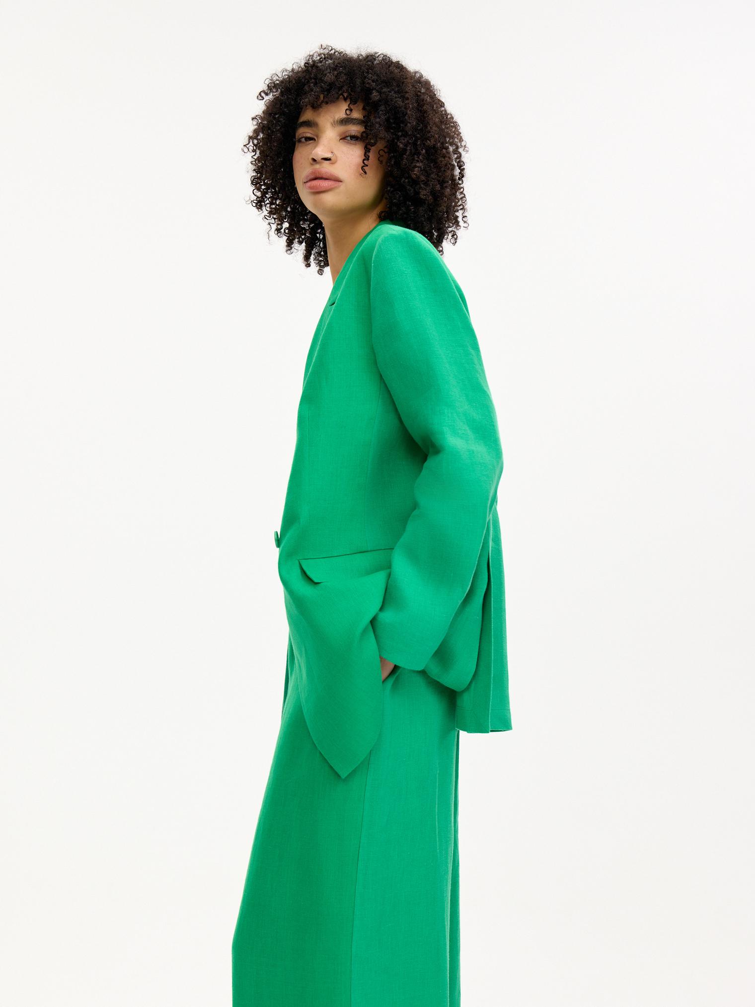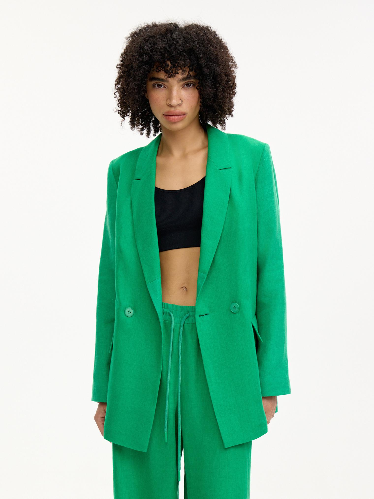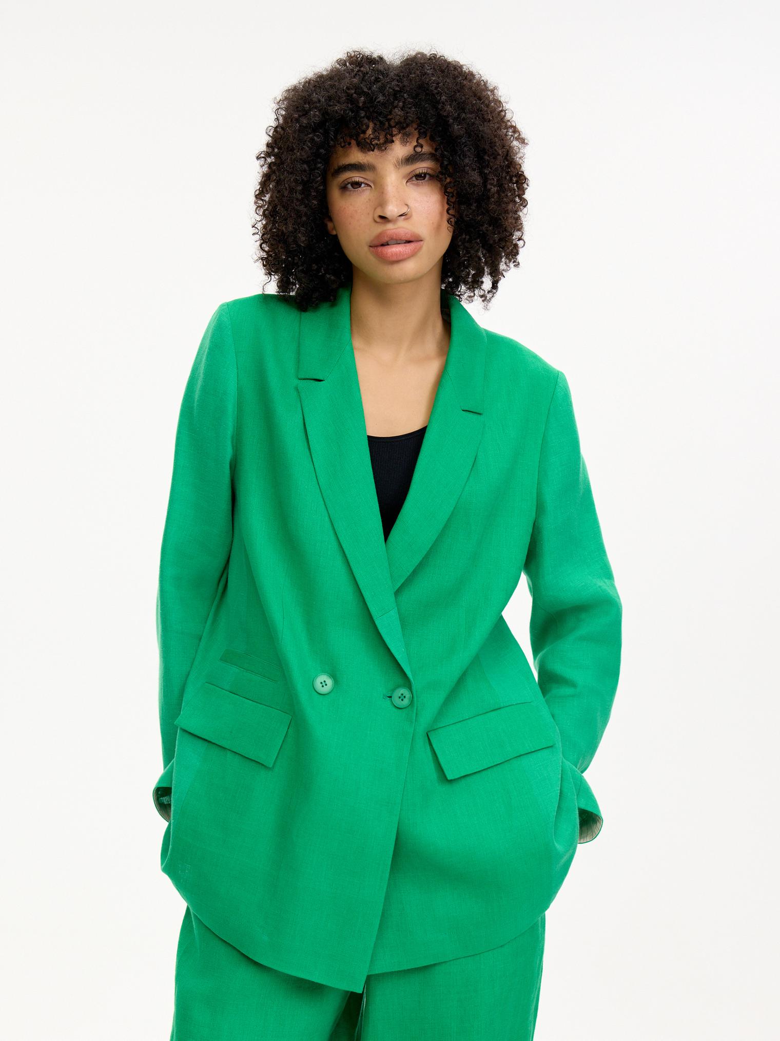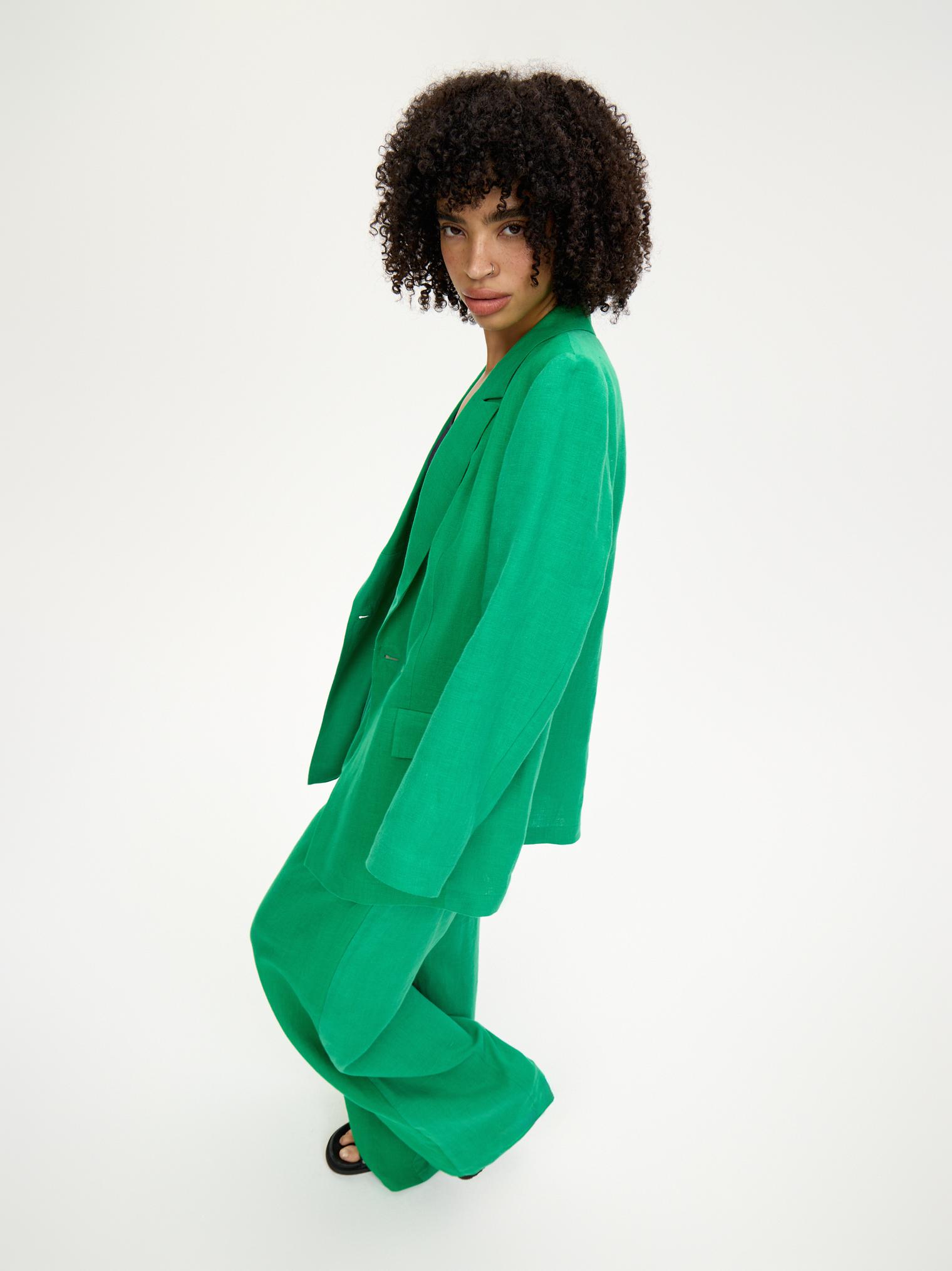 Двубортный прямой жакет из пластичного льна насыщенного зеленого цвета – стильный и универсальный элемент гардероба и изделие вне времени. Оригинальная деталь - частичная контрастная подкладка с принтом. Рекомендуем сочетать с брюками из аналогичной ткани 7026-075-06 для создания гармоничного костюма или с брюками и юбками из капсулы для более непринужденного образа.