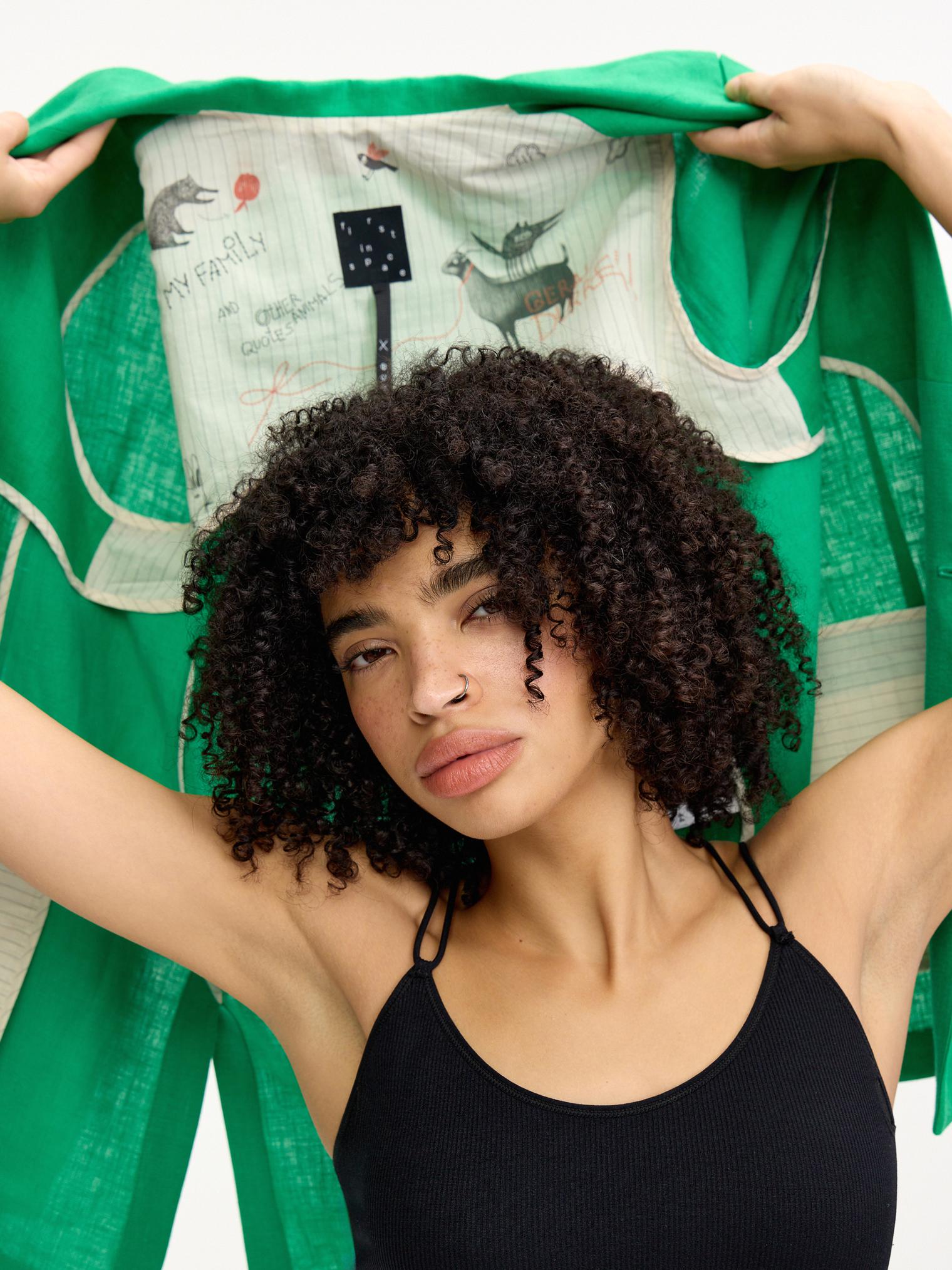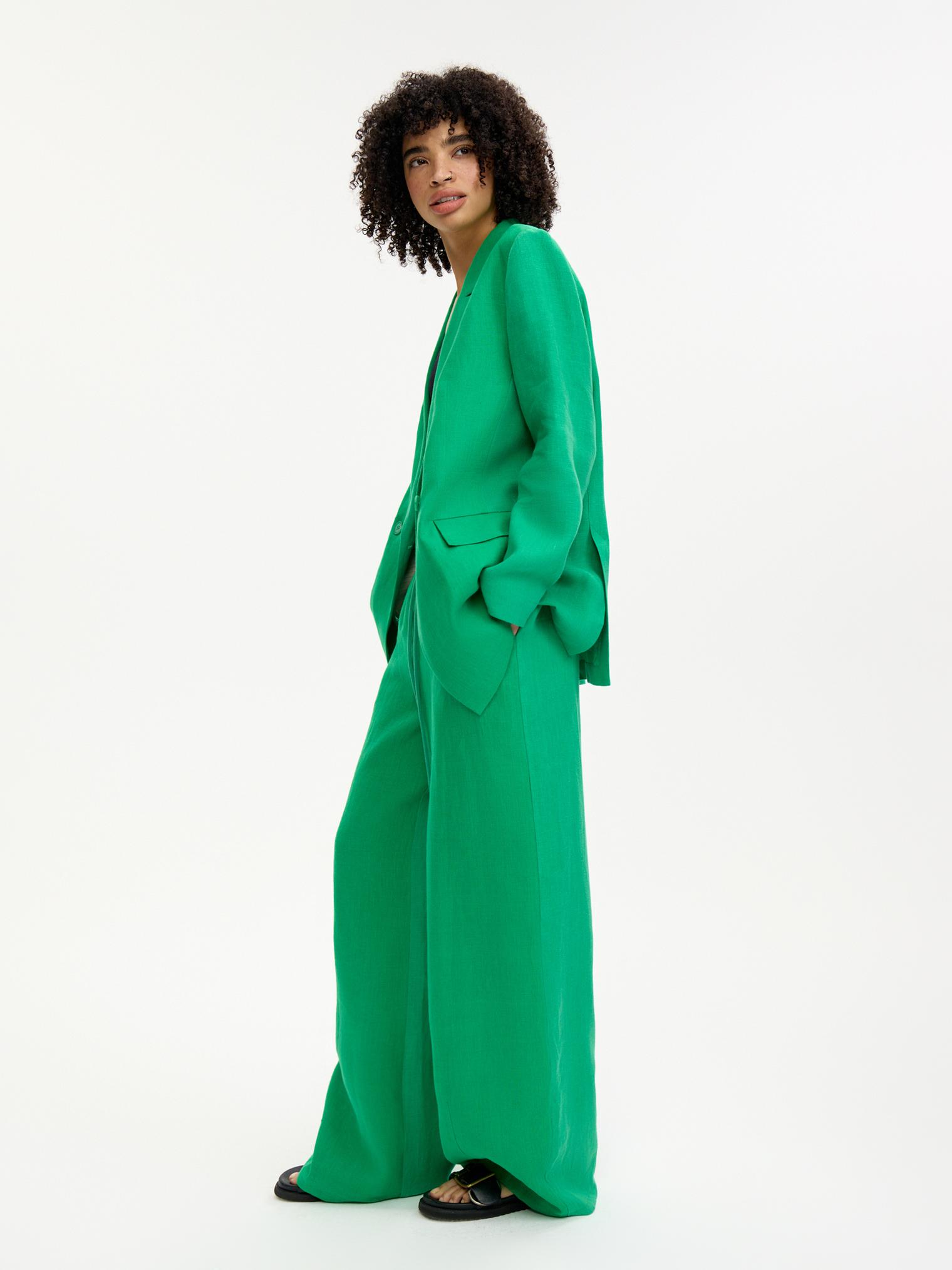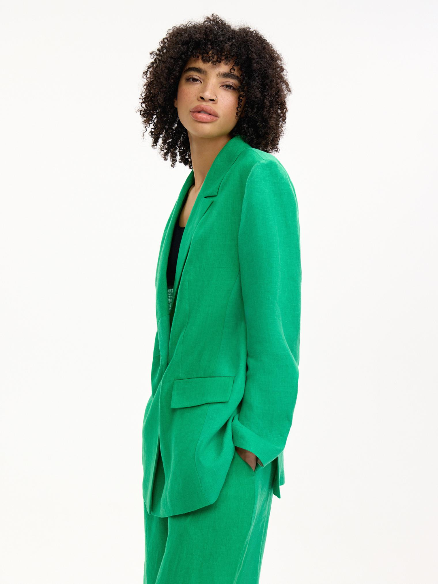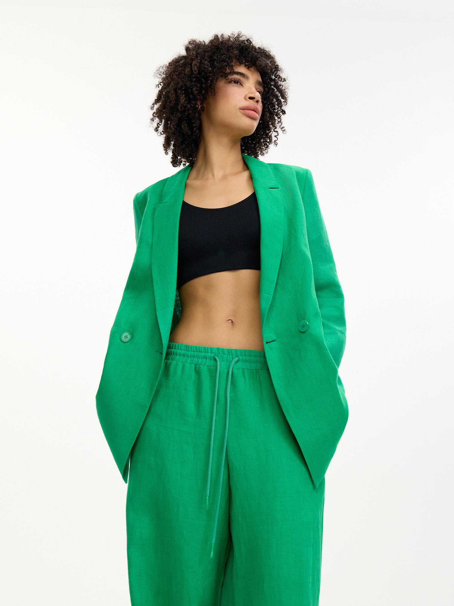 Двубортный прямой жакет из пластичного льна насыщенного зеленого цвета – стильный и универсальный элемент гардероба и изделие вне времени. Оригинальная деталь - частичная контрастная подкладка с принтом. Рекомендуем сочетать с брюками из аналогичной ткани 7026-075-06 для создания гармоничного костюма или с брюками и юбками из капсулы для более непринужденного образа.