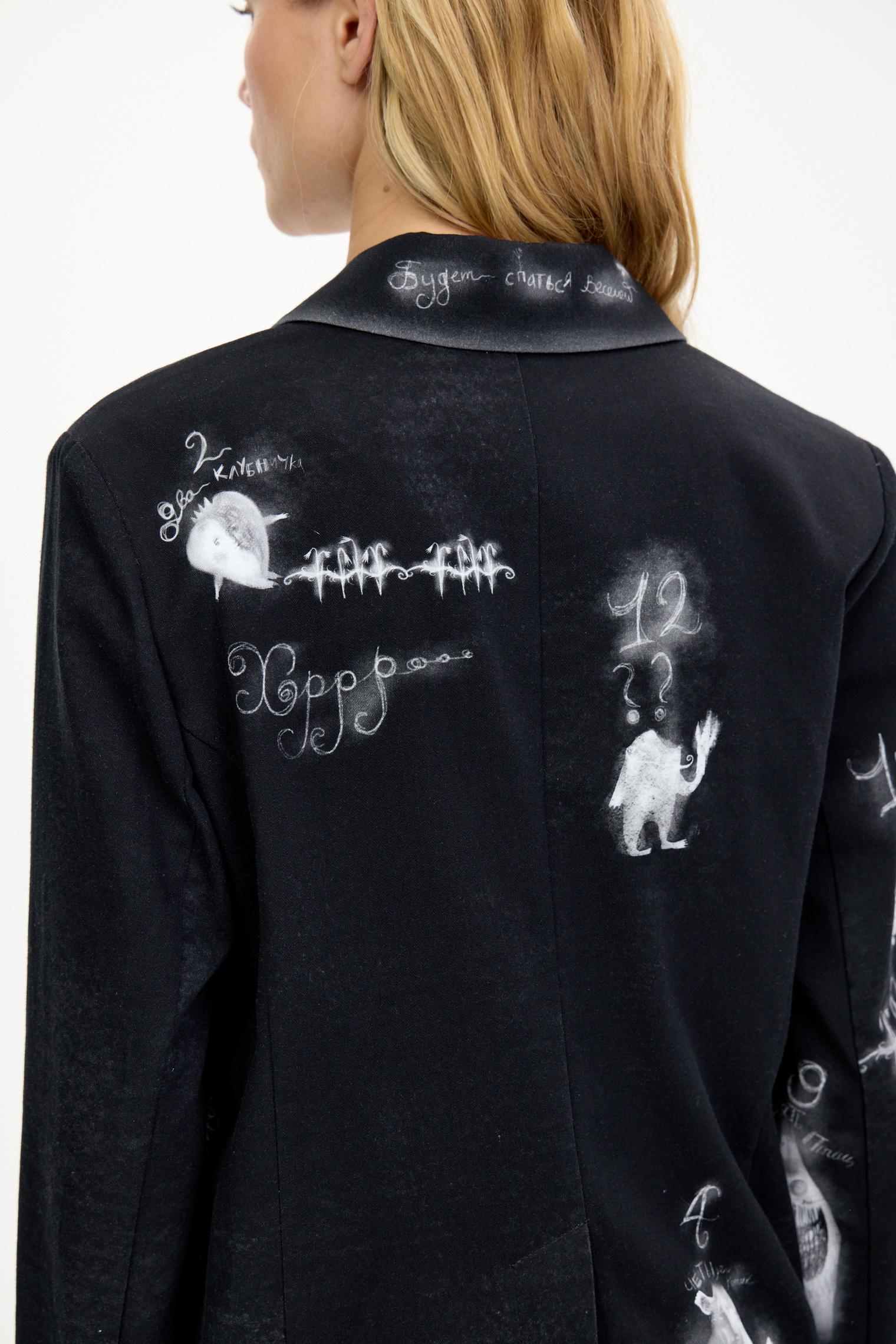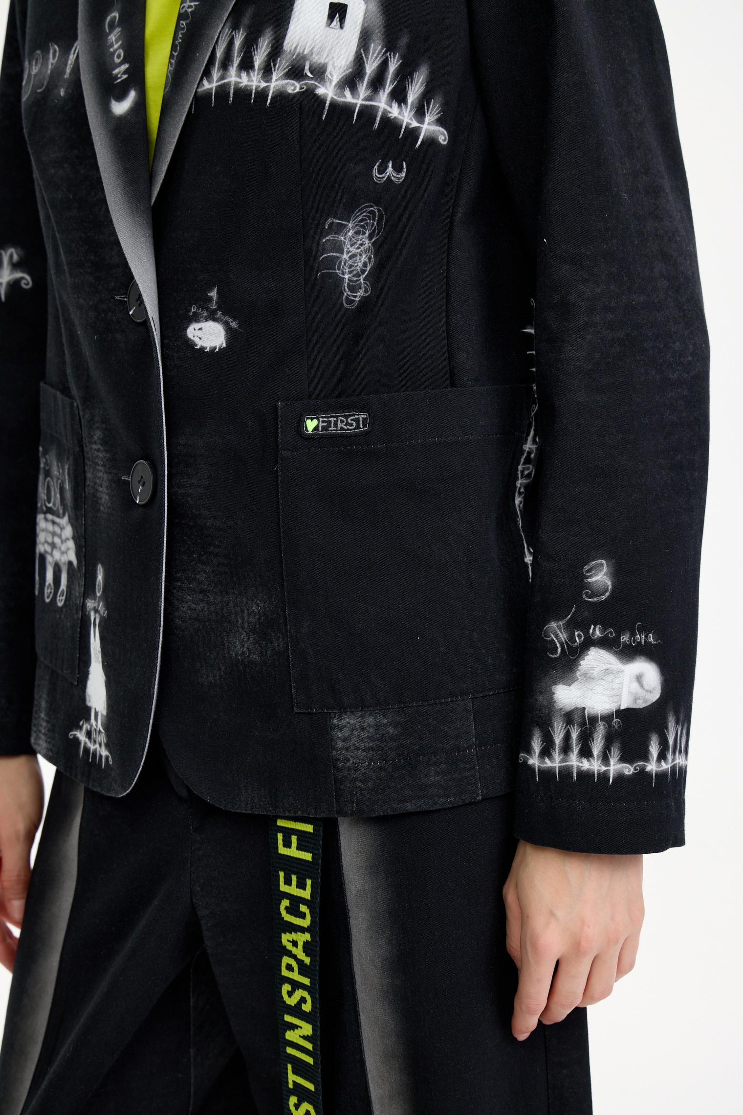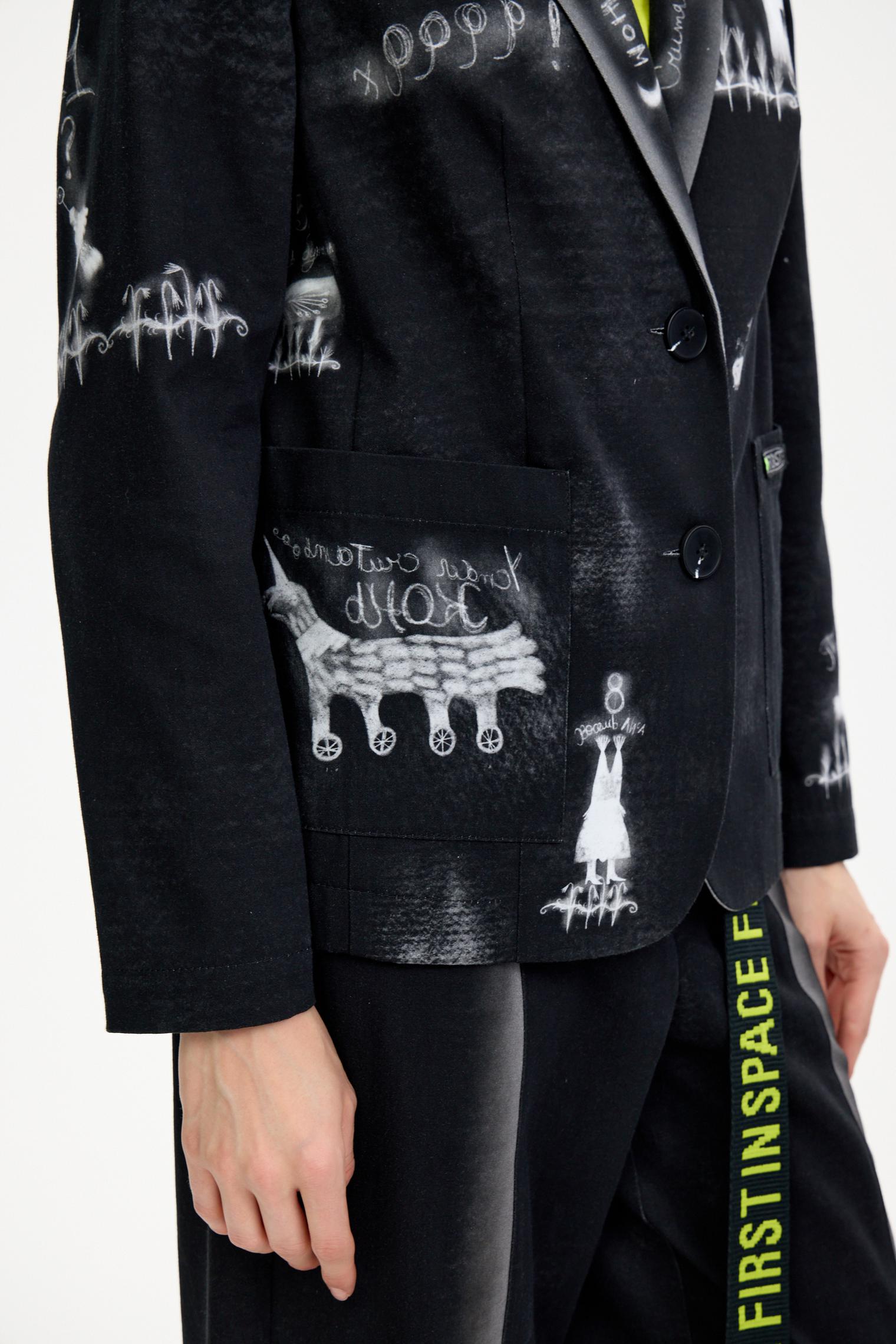 Жакет из мягкого костюмного хлопка остро актуален и соткан из противоречий: классический крой и деловой стиль сочетаются в нем с необычным креативным принтом, что позволяет сделать образ более раскованным и неформальным. Вы во сне или наяву? Не важно, главное – не скучно.