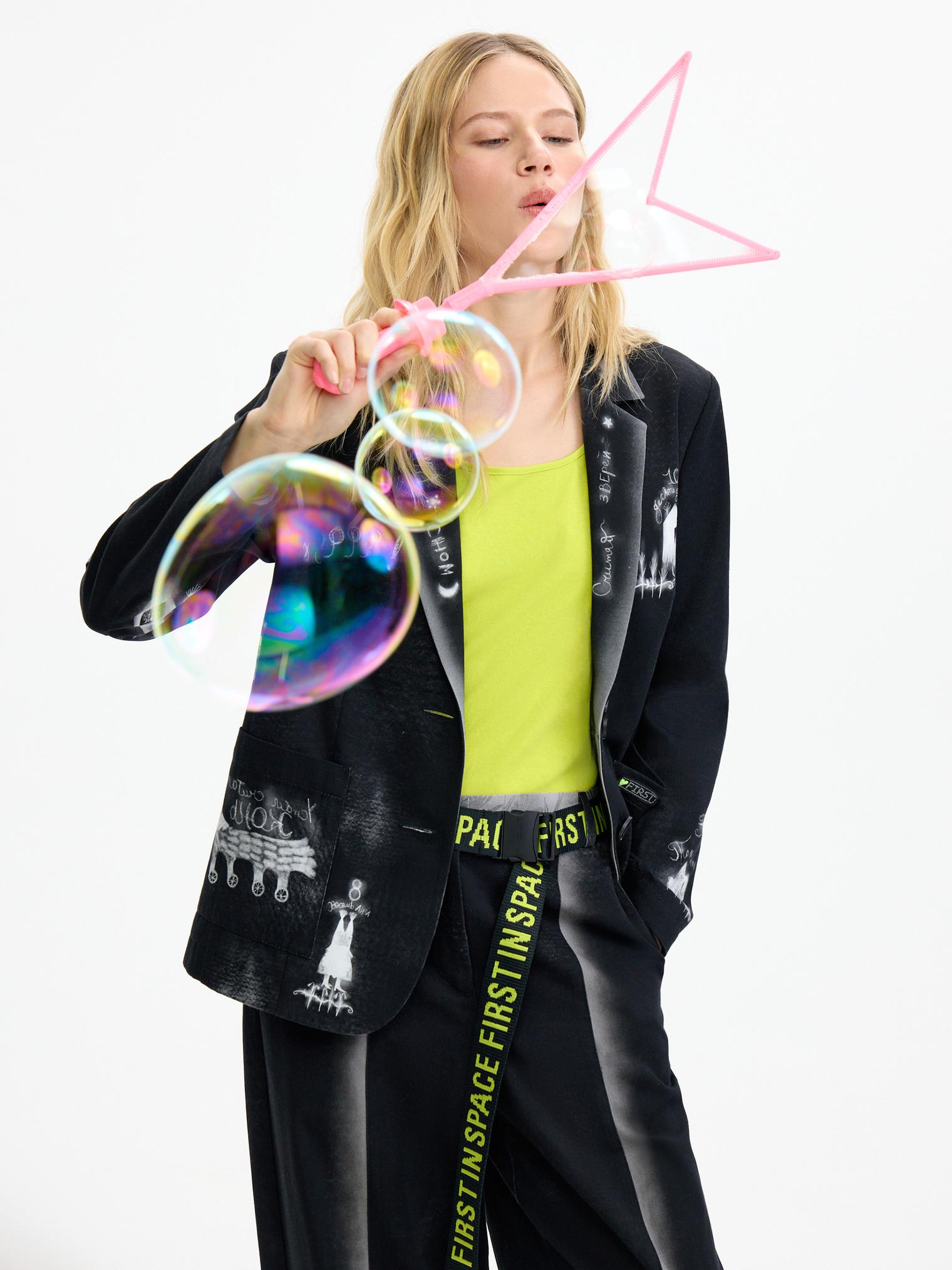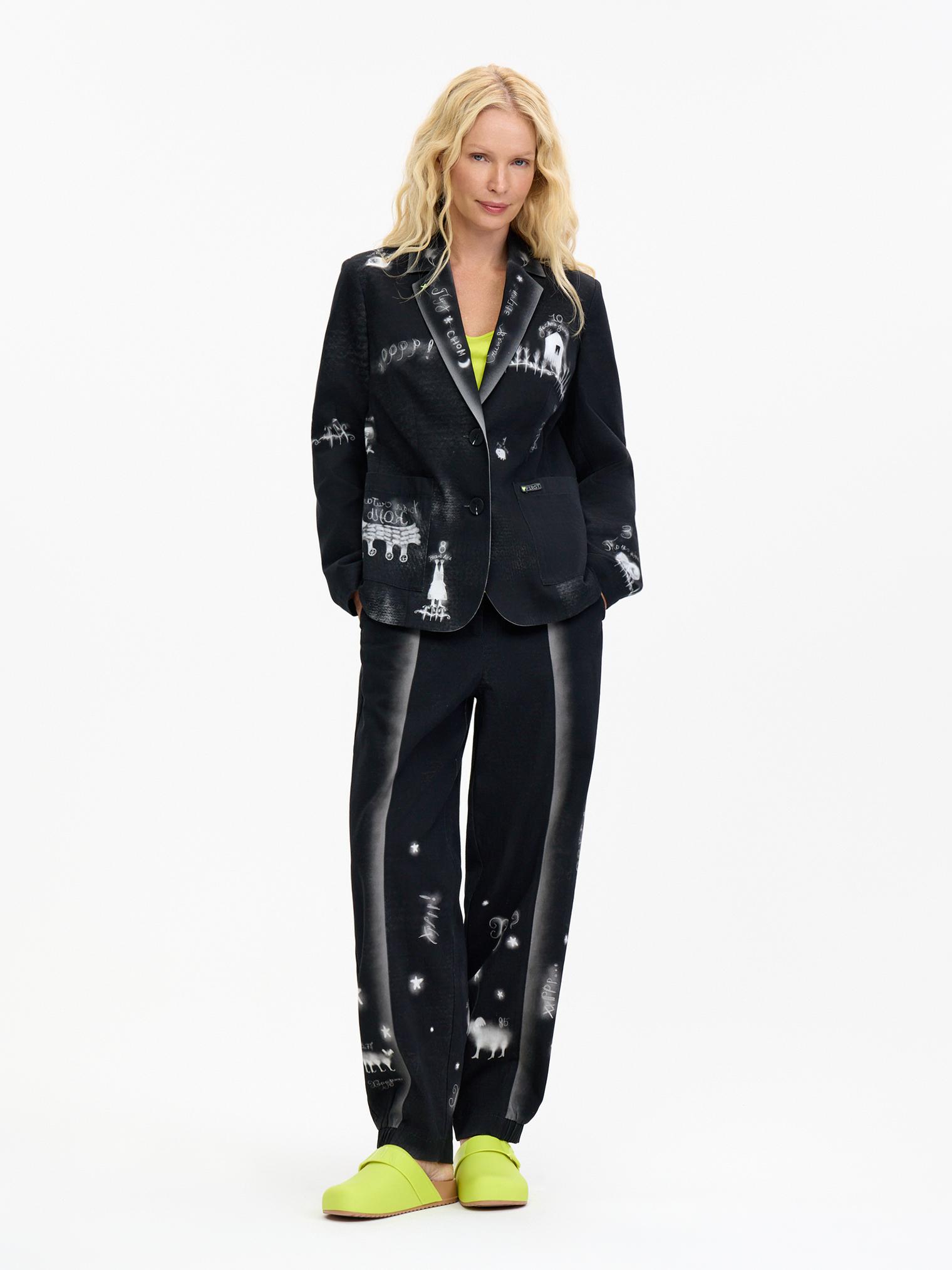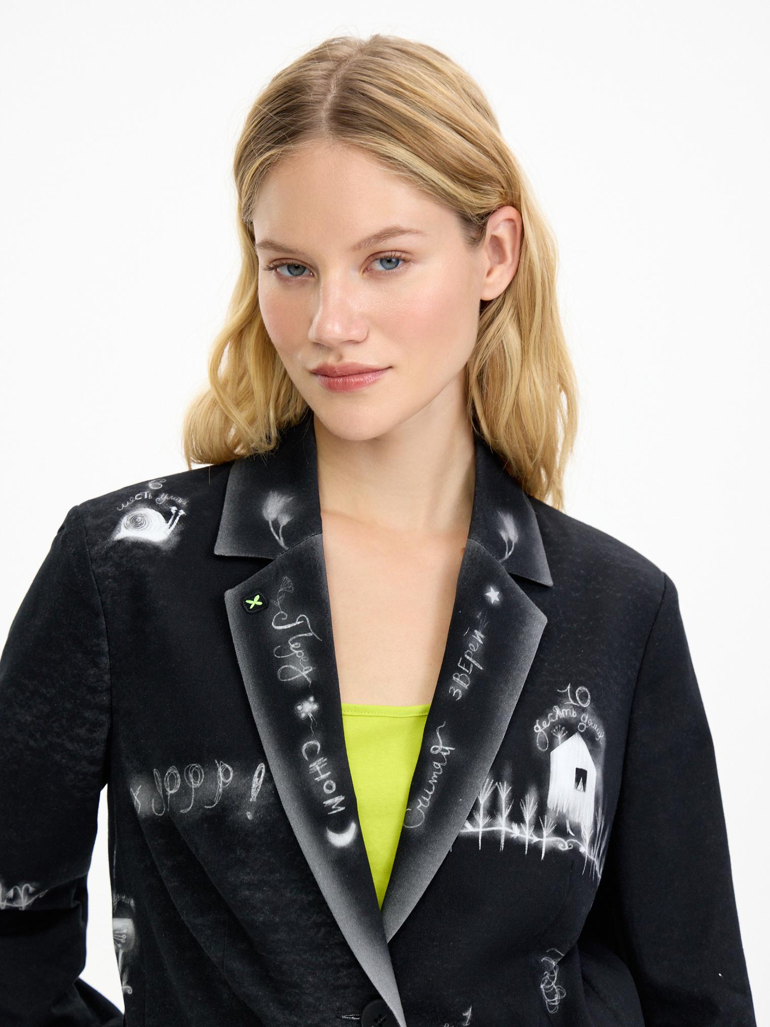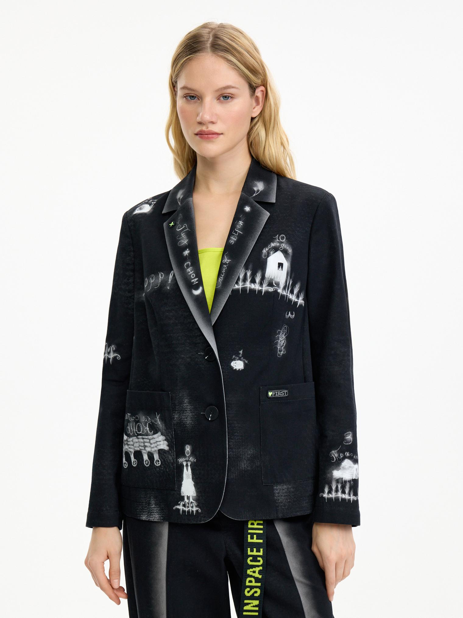 Жакет из мягкого костюмного хлопка остро актуален и соткан из противоречий: классический крой и деловой стиль сочетаются в нем с необычным креативным принтом, что позволяет сделать образ более раскованным и неформальным. Вы во сне или наяву? Не важно, главное – не скучно.