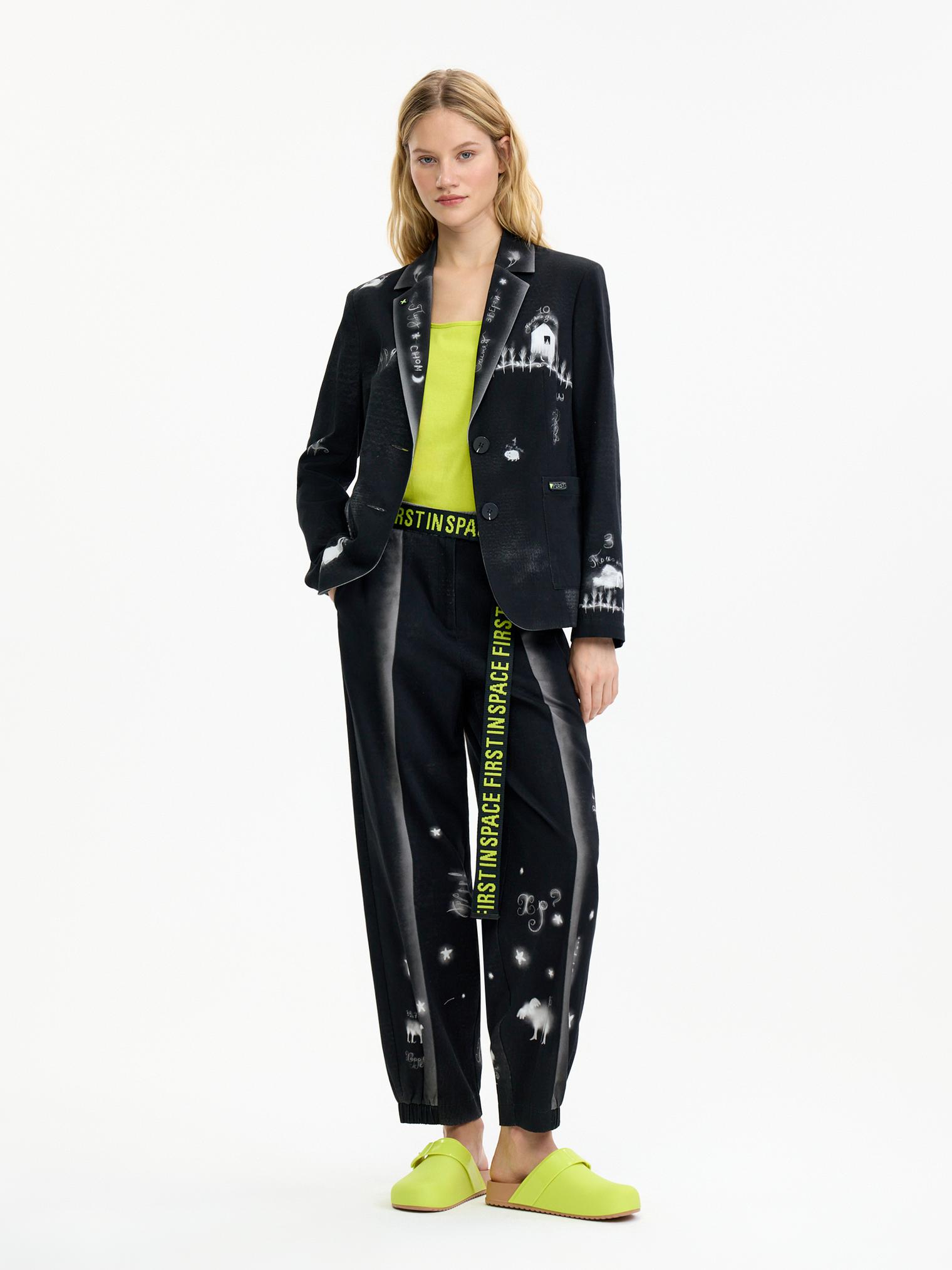 От дизайнера Лизы: «Костюм-вход в первую фазу сна. Когда лежишь в темноте и считаешь овец. Брюки 7026-082-09 – начало отсчета, в котором овцы перепрыгивают через забор, и на цифре 10000 наступает дремота, и овцы превращаются в непонятных существ на жакете 4026-082-06, будь то единорог или ходячий дом...»