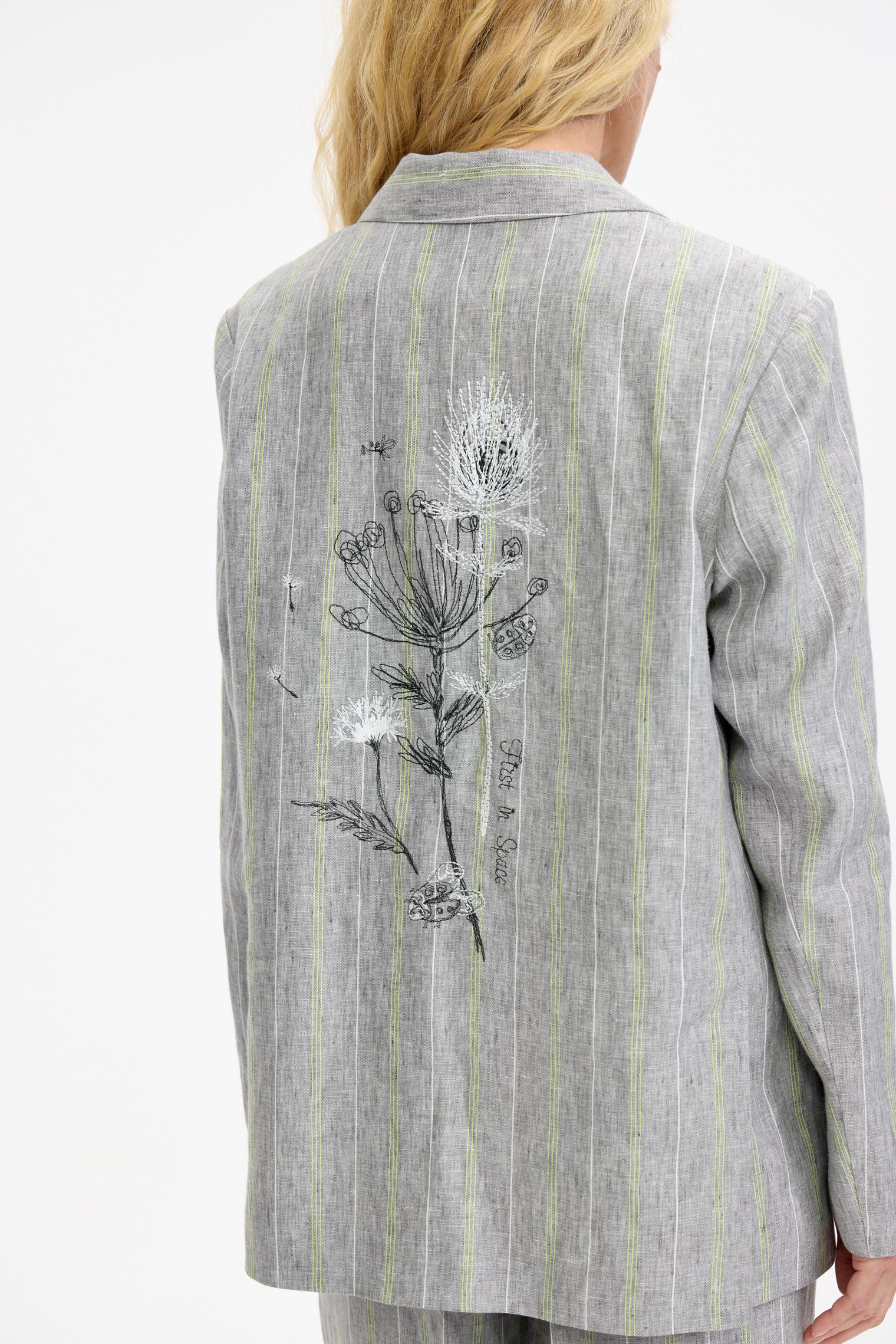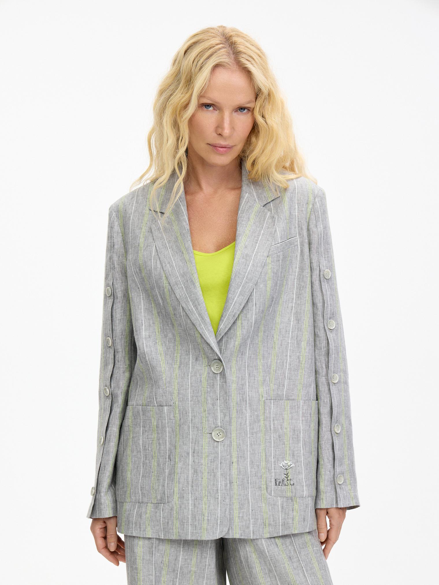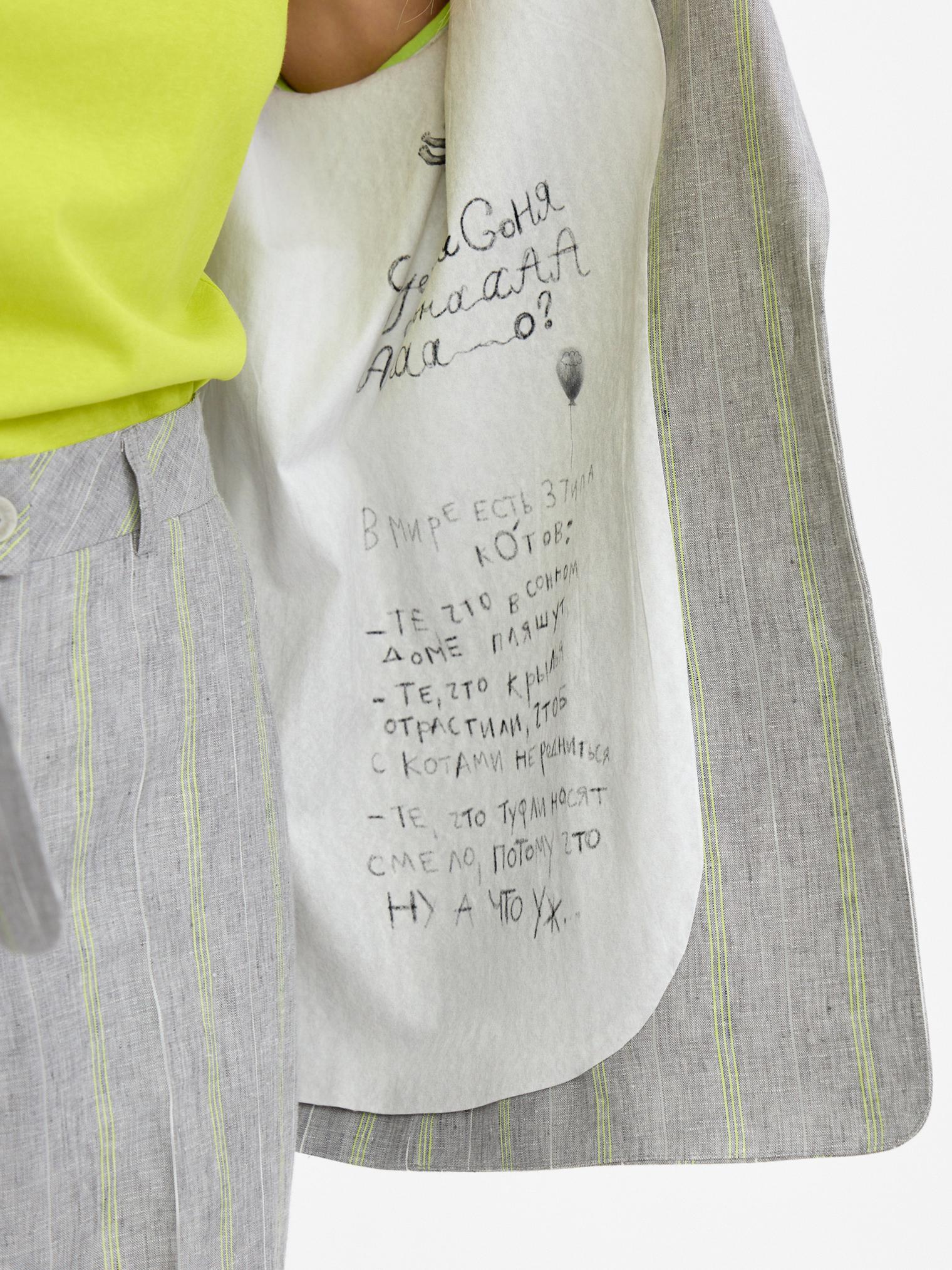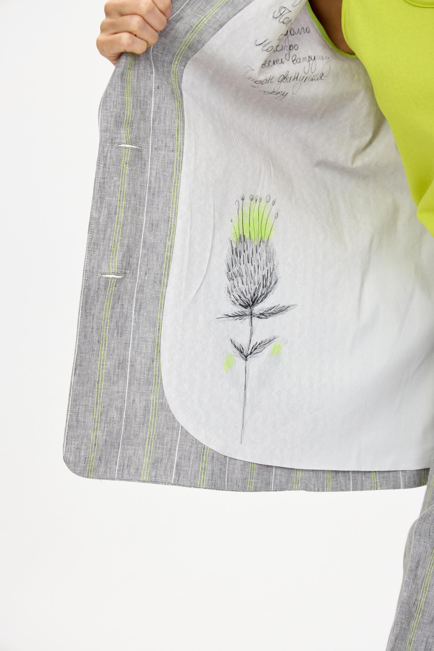 Идеальный "мужской" жакет из 100% льна в тонкую полоску – актуален всегда! Хотя в нашем жакете от мужского – лишь силуэт и некоторые детали, фантастическая вышивка на спинке и оригинальные рукава с акцентной застежкой по переднему шву подчеркивают именно женственность и утонченность своей обладательницы. Секрет: нам так понравилась эта модель, что мы решили нанести принт даже на мягкую хлопковую подкладку!)