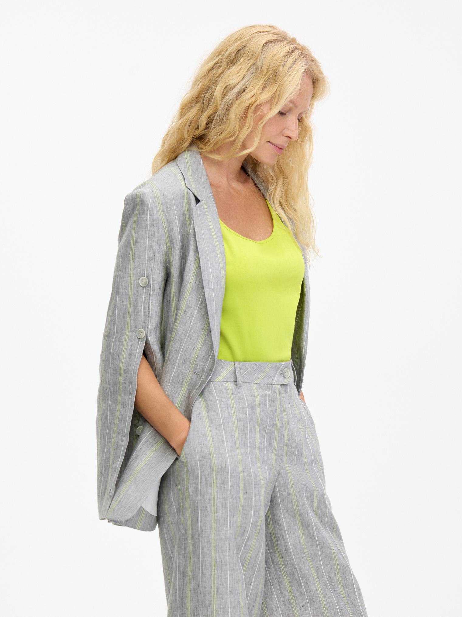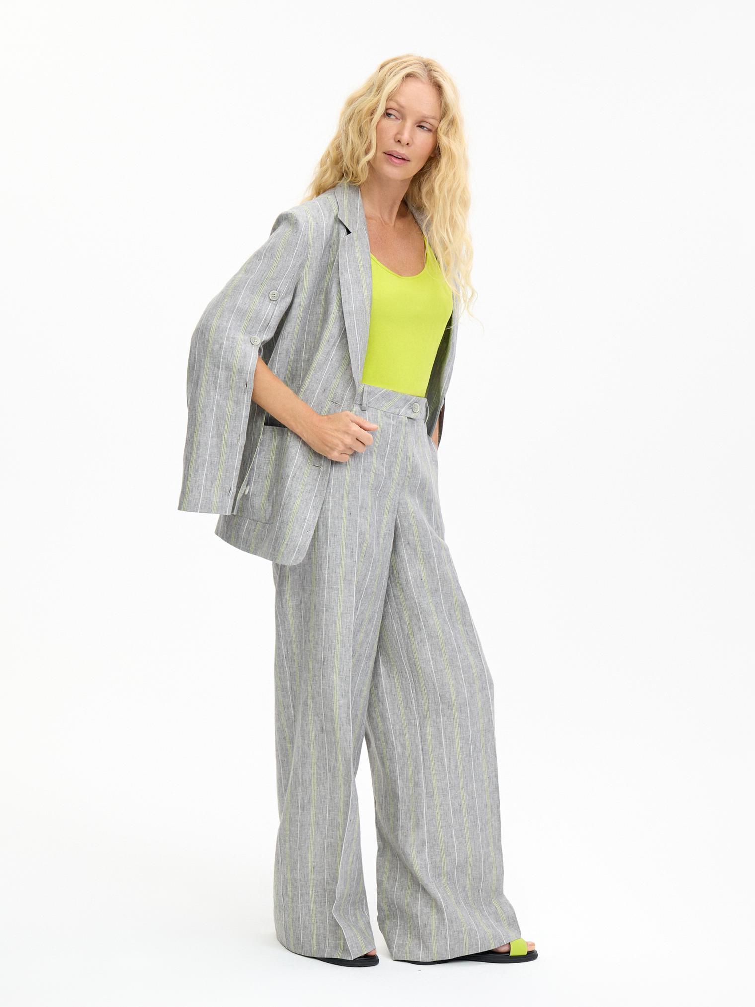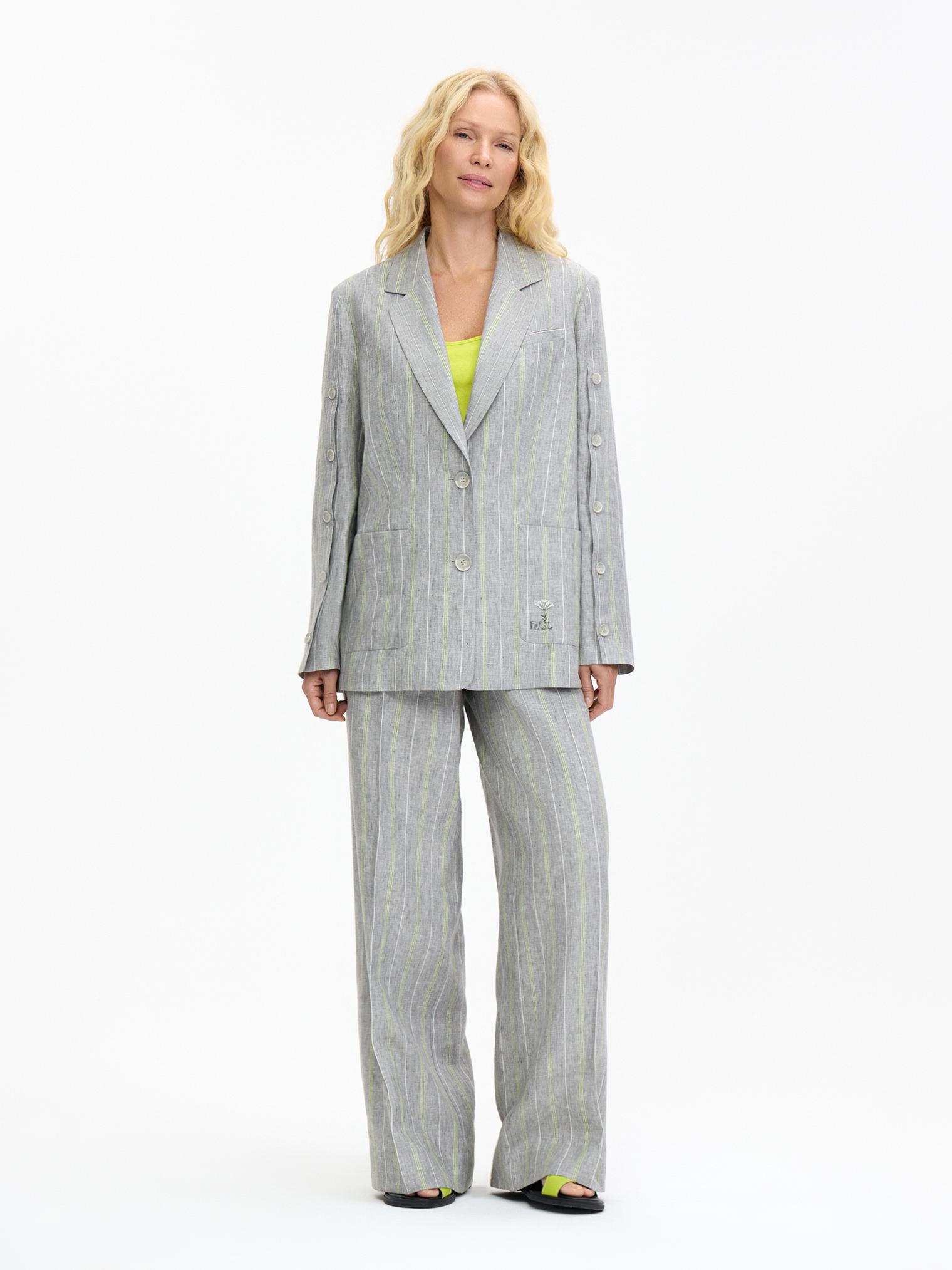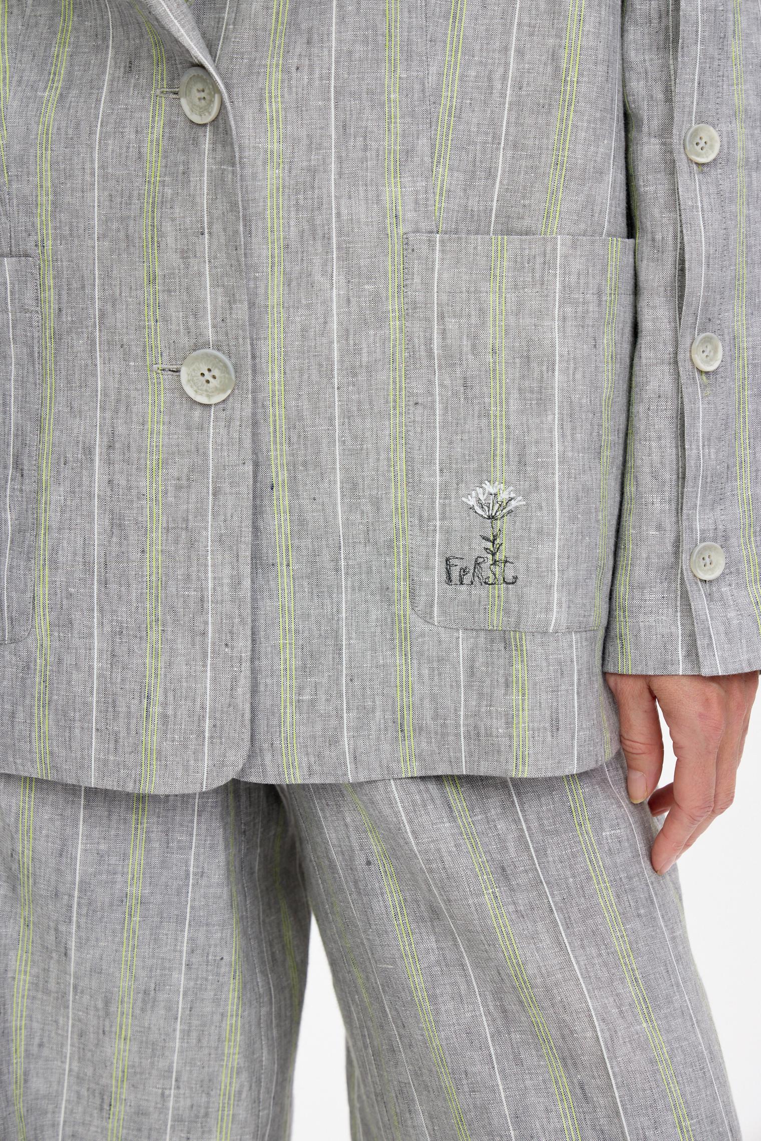 Идеальный "мужской" жакет из 100% льна в тонкую полоску – актуален всегда! Хотя в нашем жакете от мужского – лишь силуэт и некоторые детали, фантастическая вышивка на спинке и оригинальные рукава с акцентной застежкой по переднему шву подчеркивают именно женственность и утонченность своей обладательницы. Секрет: нам так понравилась эта модель, что мы решили нанести принт даже на мягкую хлопковую подкладку!)