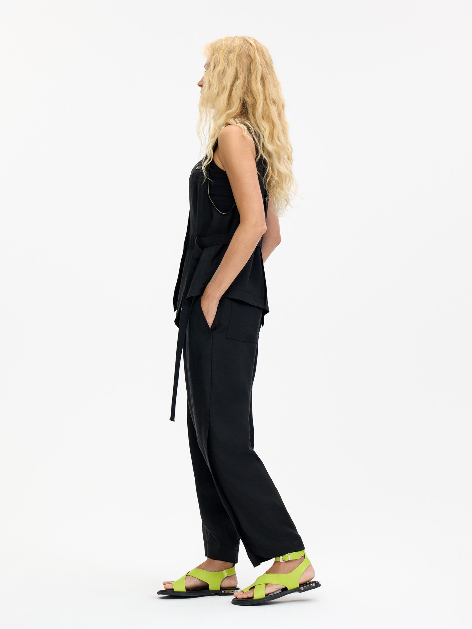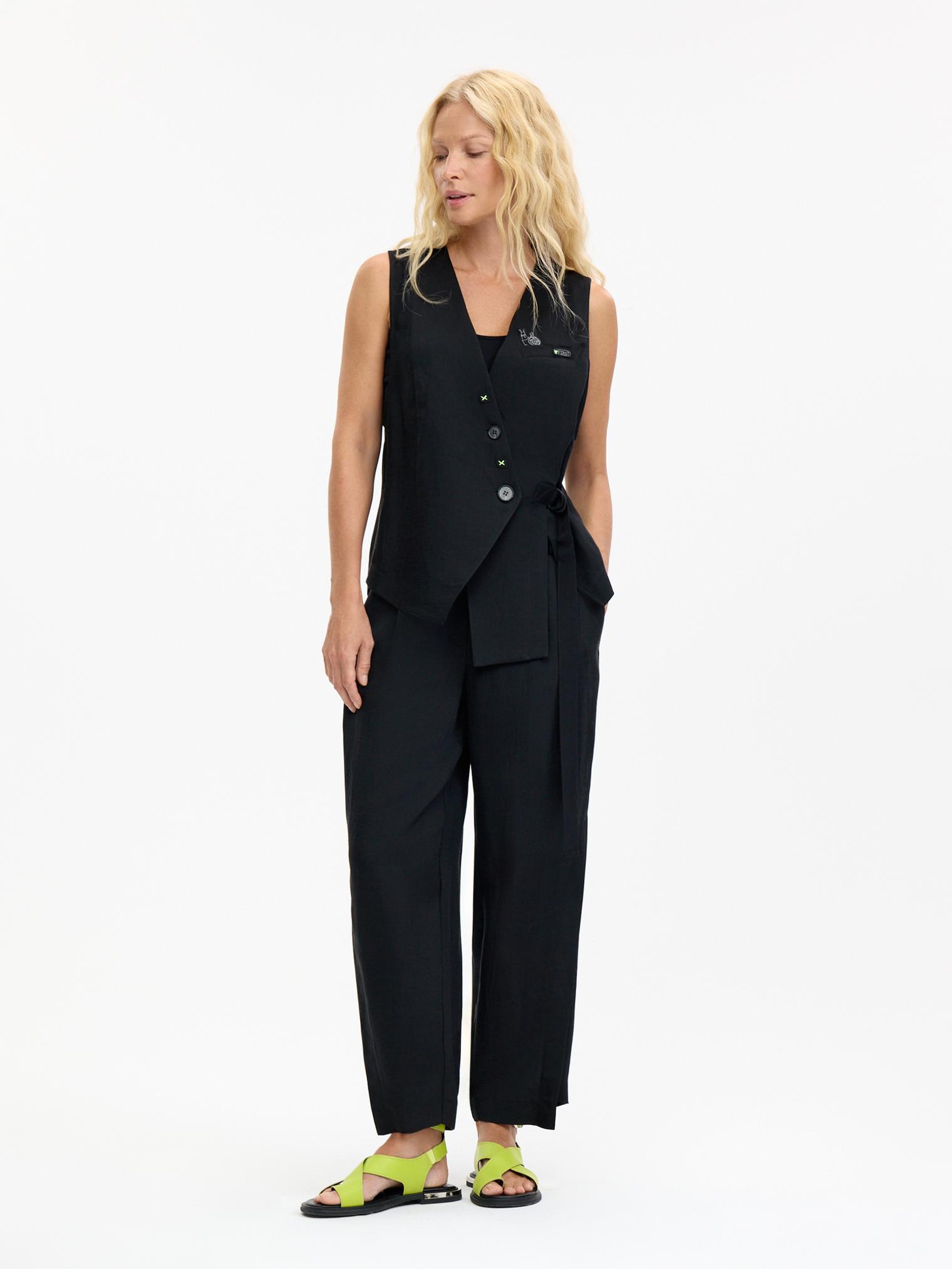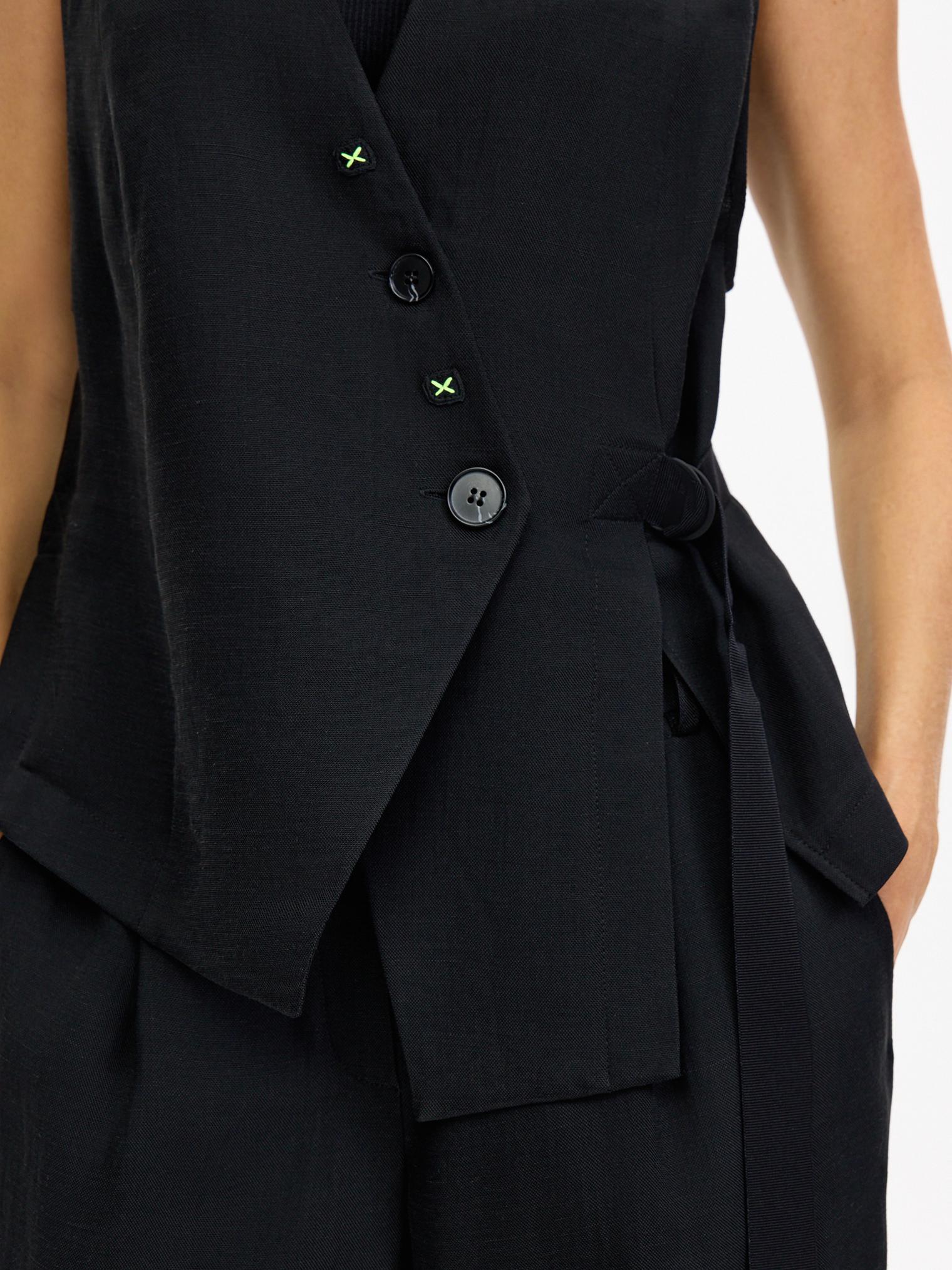 Маленький черный жилет из смесовой льно-вискозной ткани благодаря своей продуманной асимметричности станет идеальной основой для создания креативных образов.