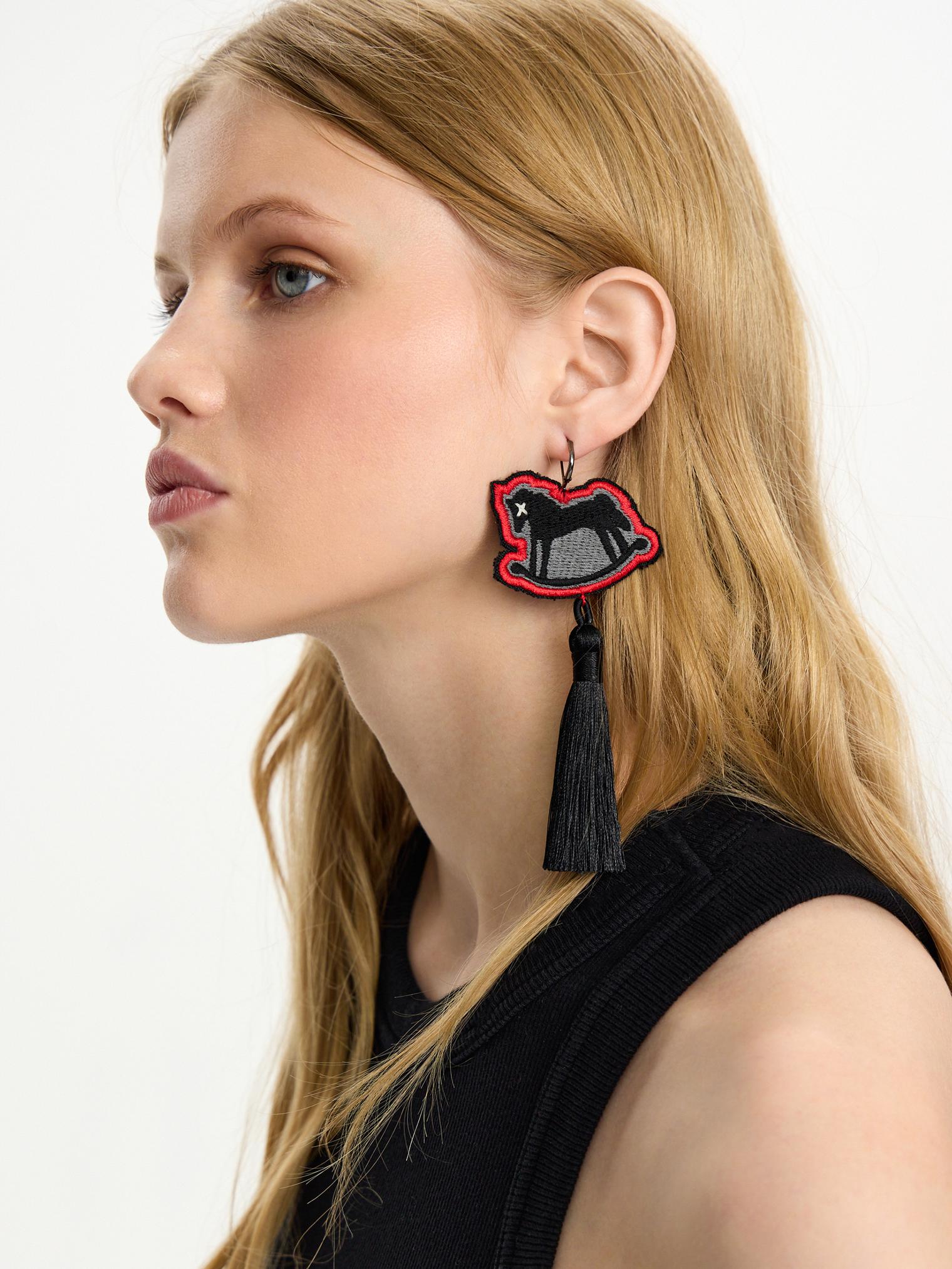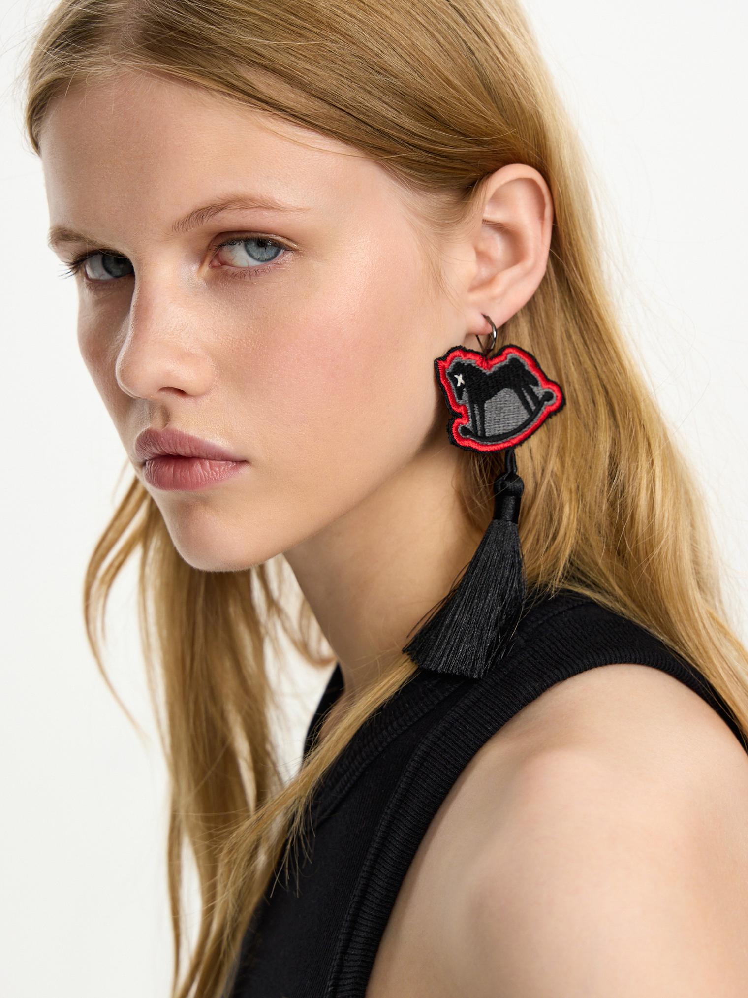 Моносерьга в виде качающейся лошадки и длинной кисточки с бахромой.