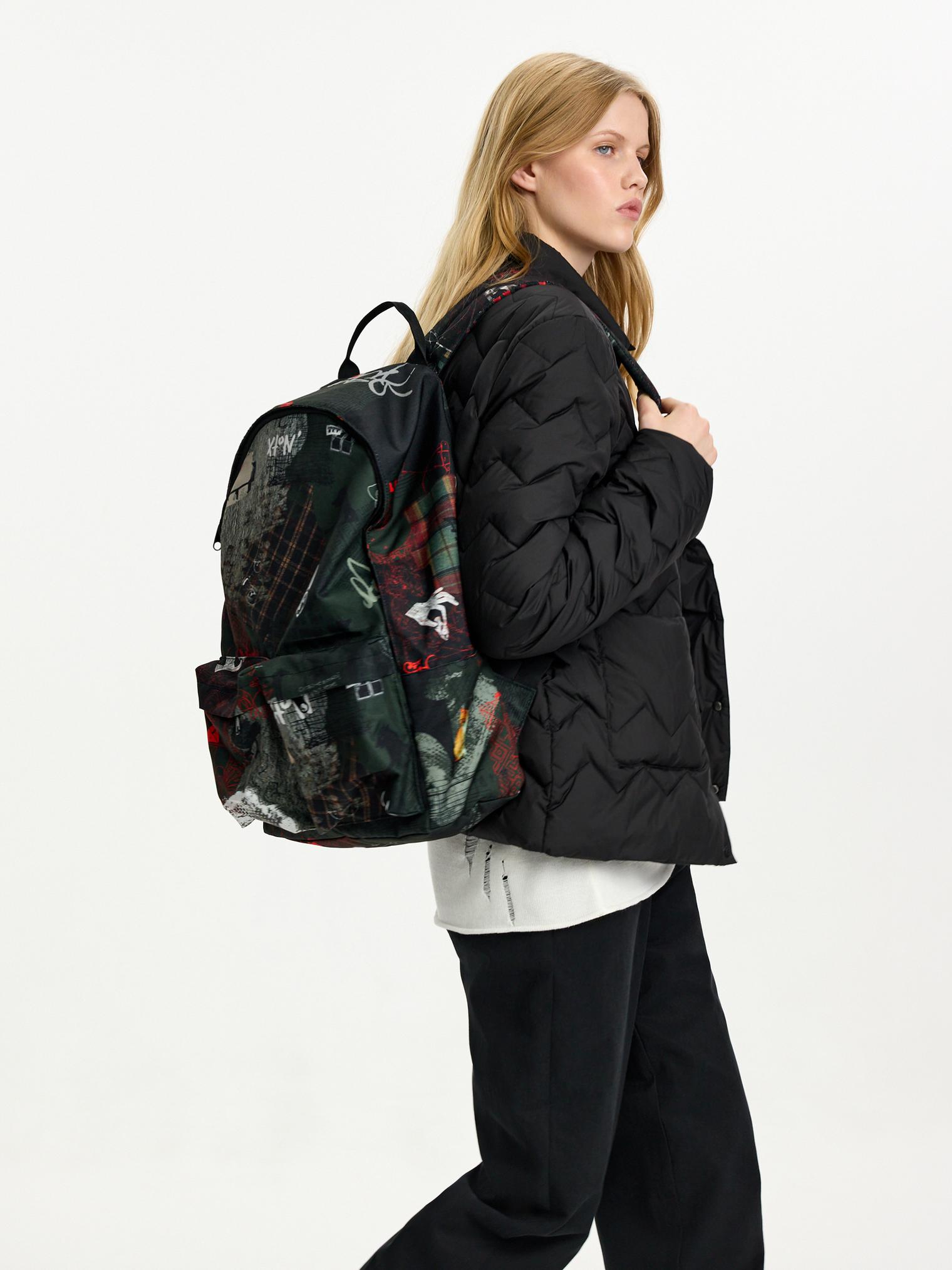 Объемный рюкзак из износостойкого водоотталкивающего полиэстера. Модель украшена принтом из капсулы Кудыкина гора. Есть внутреннее отделение для ноутбука, внешние карманы на молниях, подклад красный