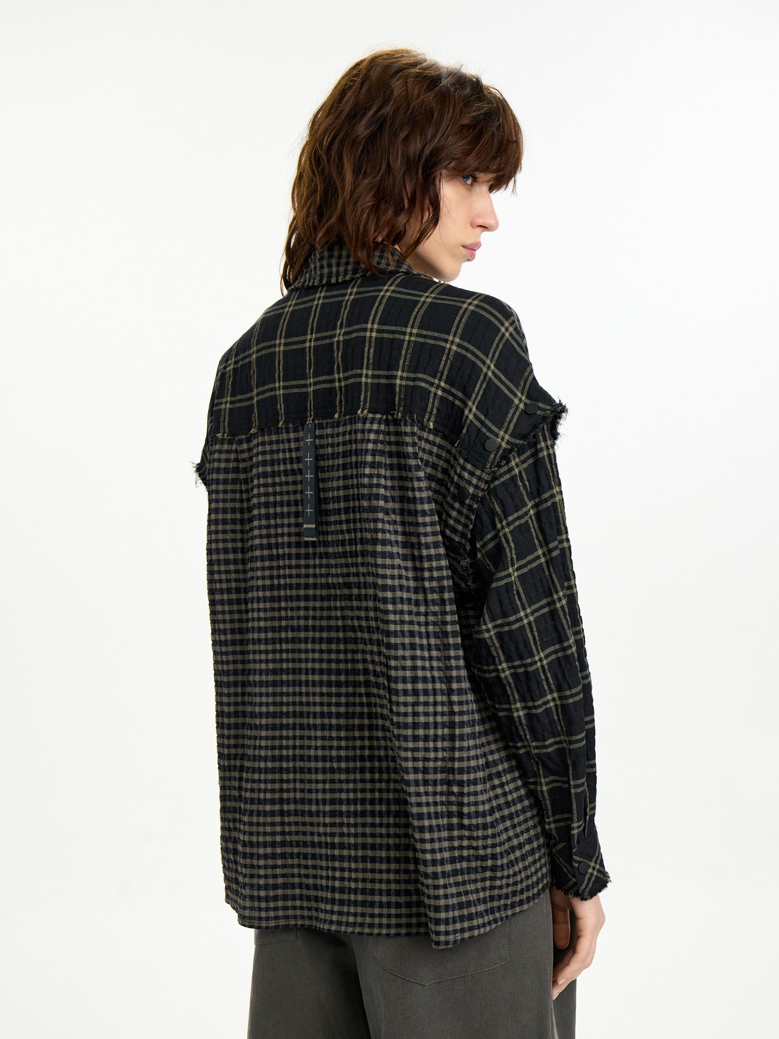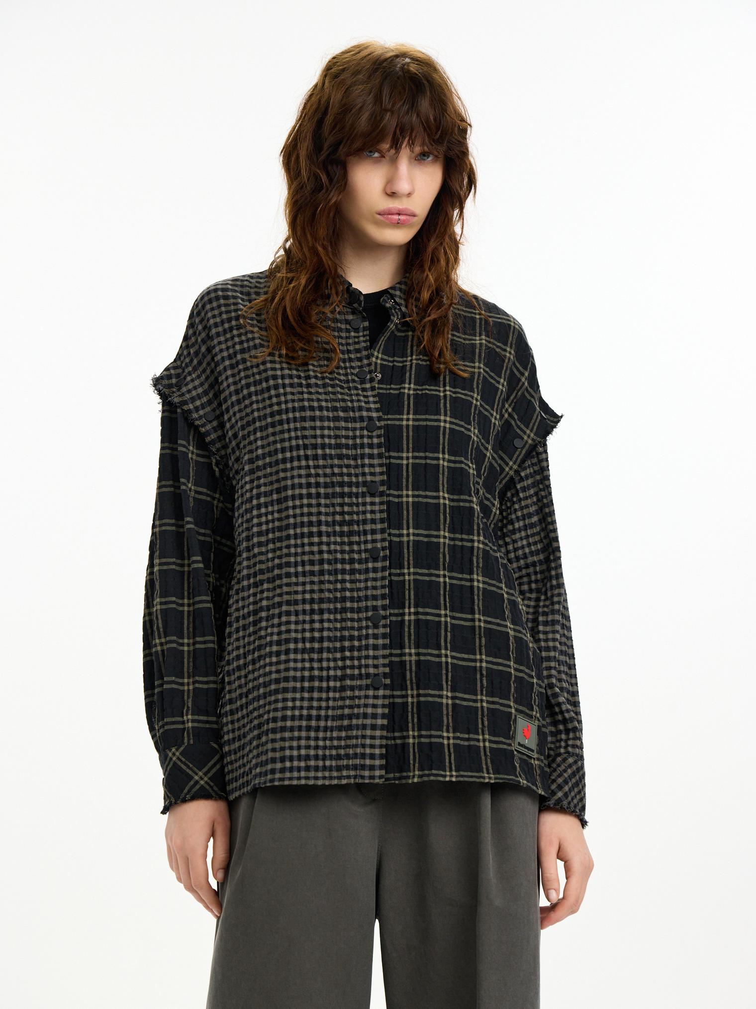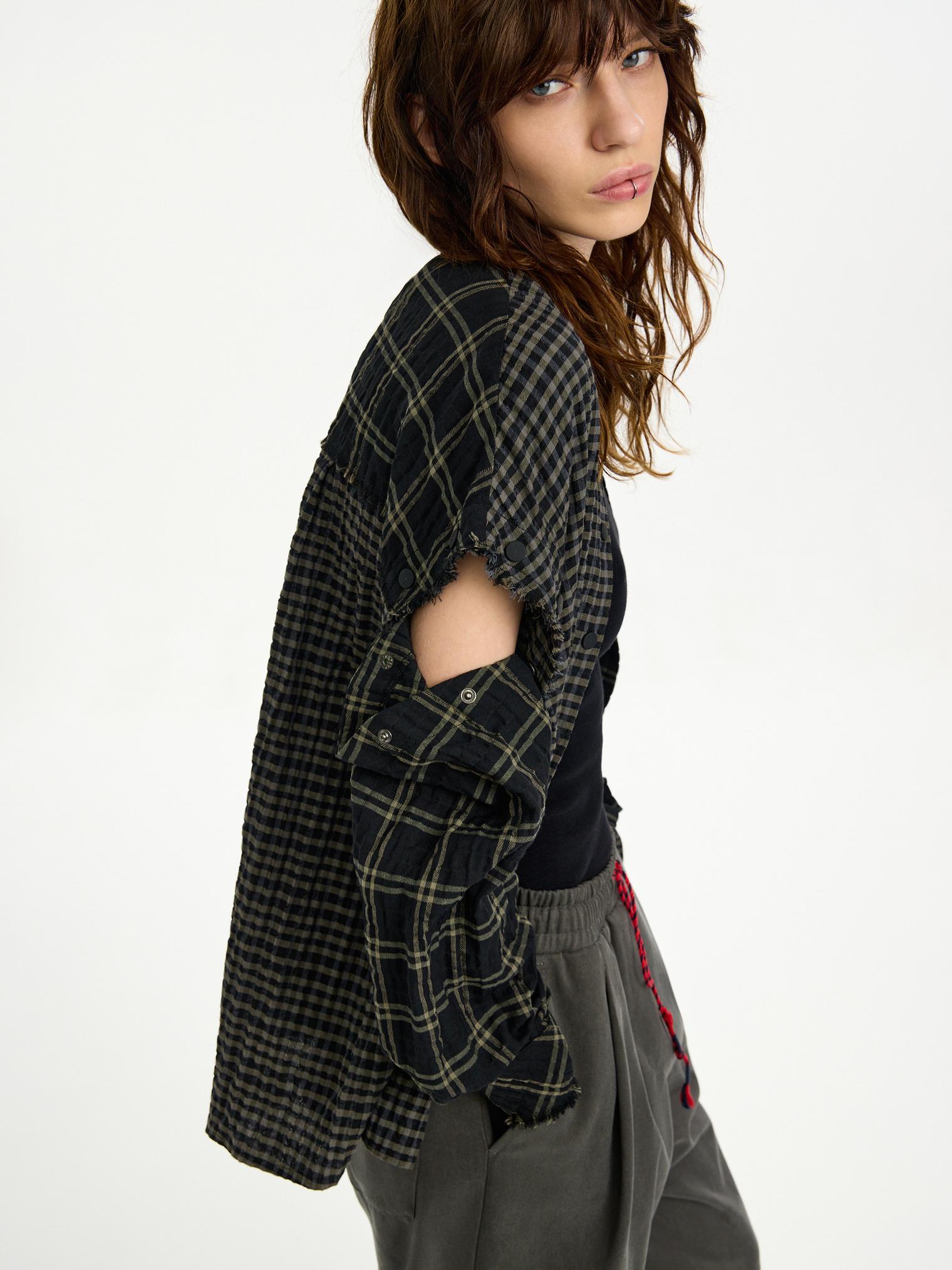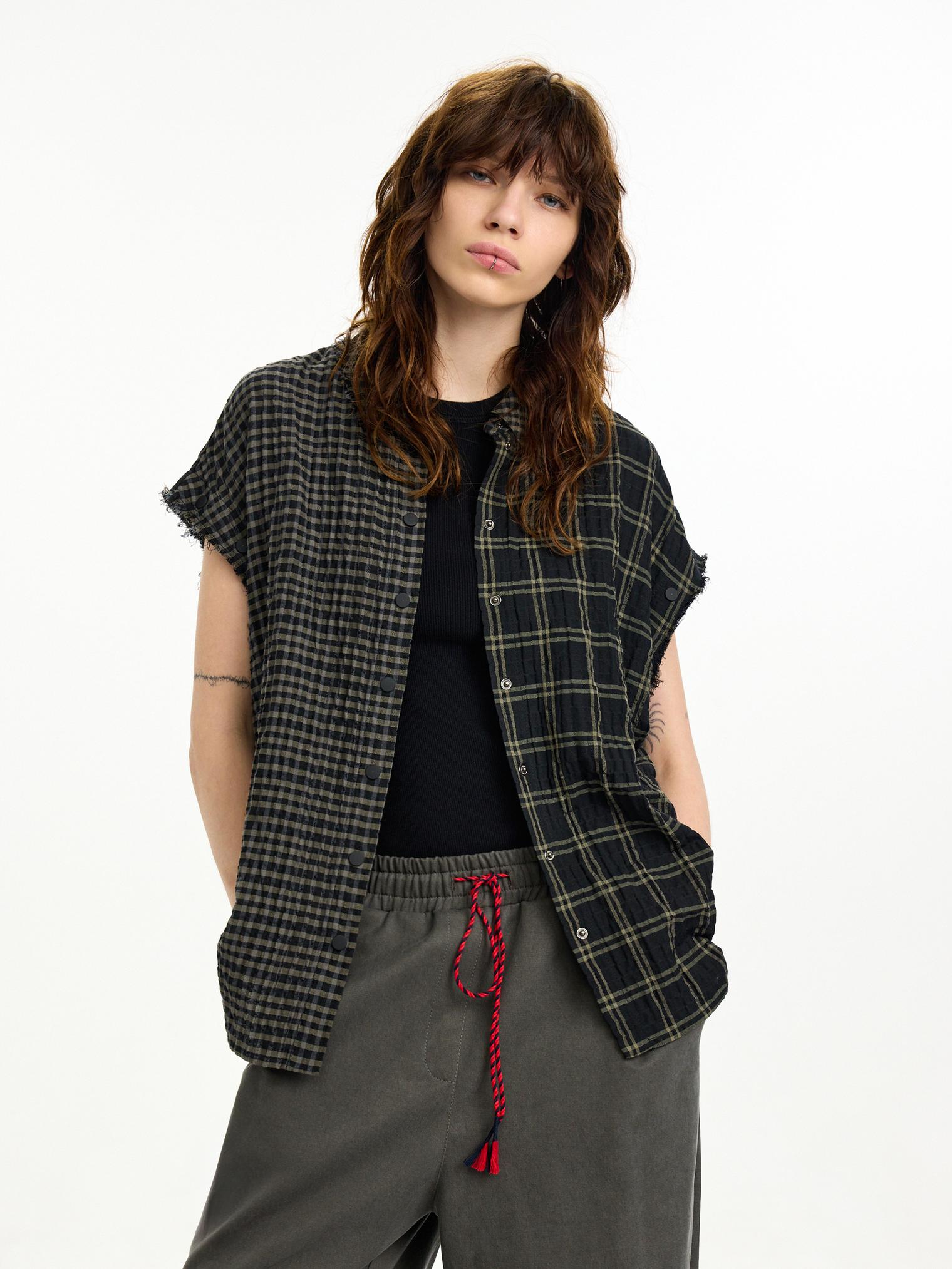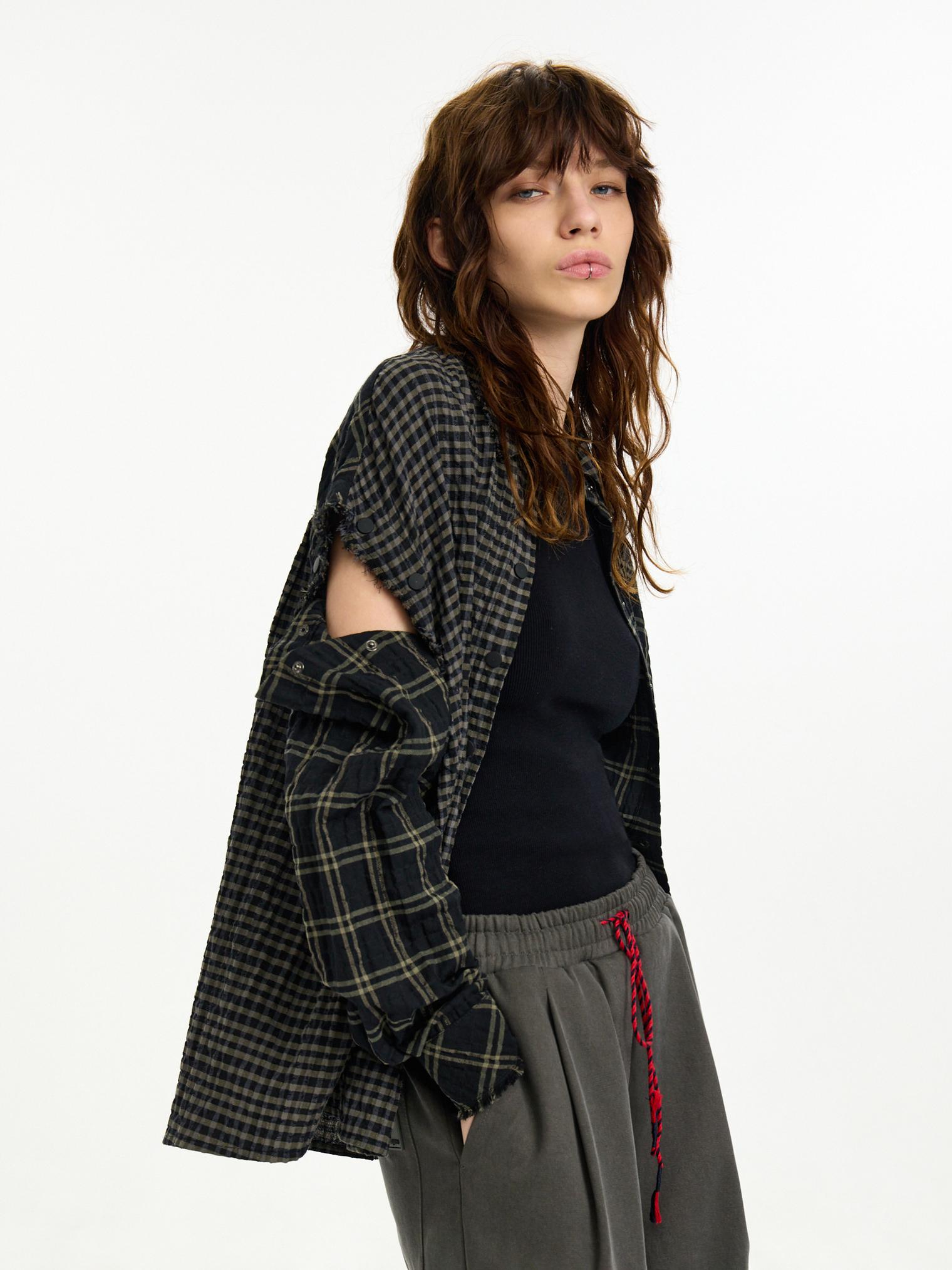 Рубашка-трансформер с отстегивающимися рукавами - новинка для First in Space. Модель из мягкого, комфортного хлопка в разномастную фактурную клетку отсылает к гранжевой эстетике. Эффект помятости, необработанные швы и застежка на кнопках завершают дизайн изделия.