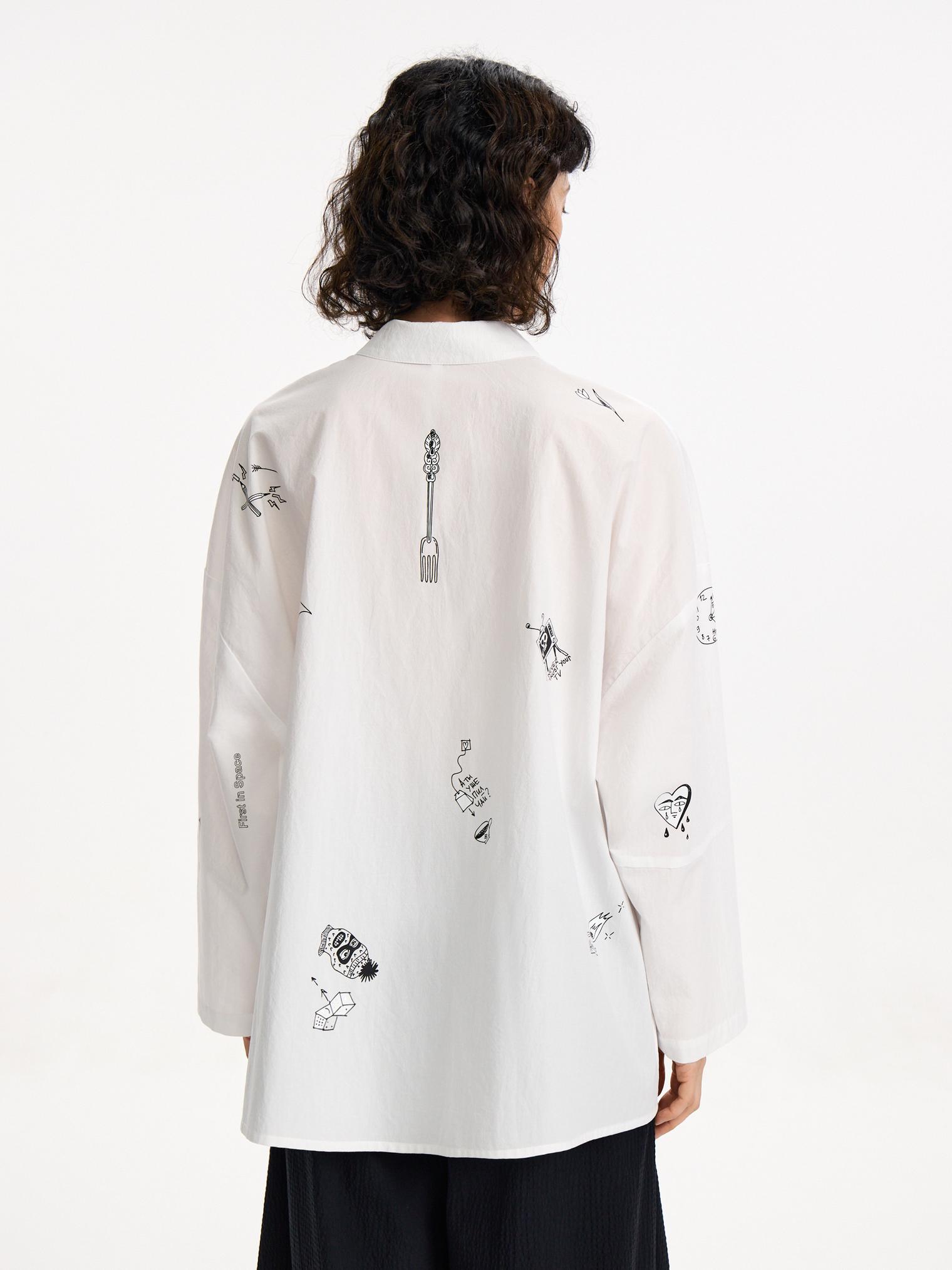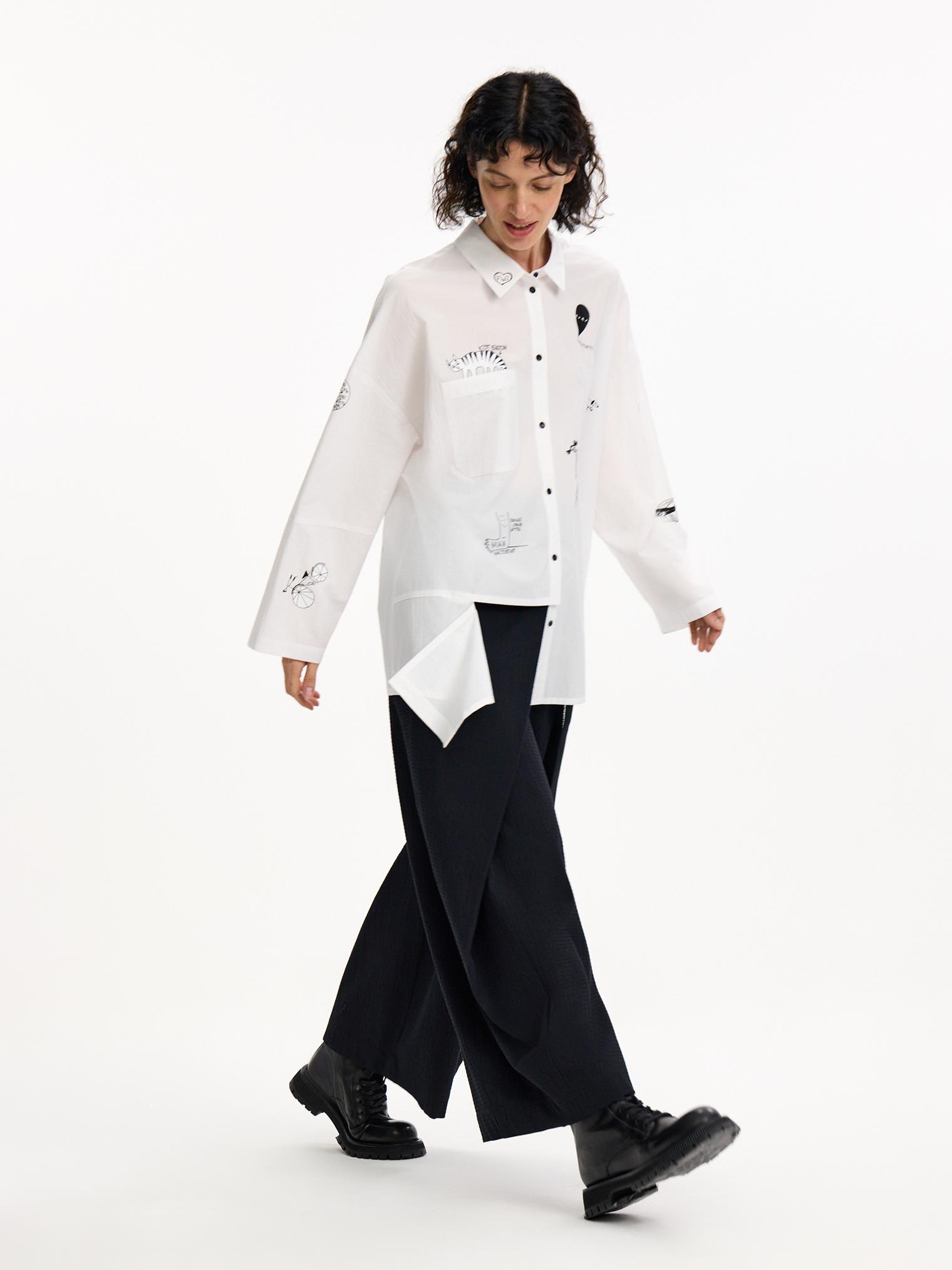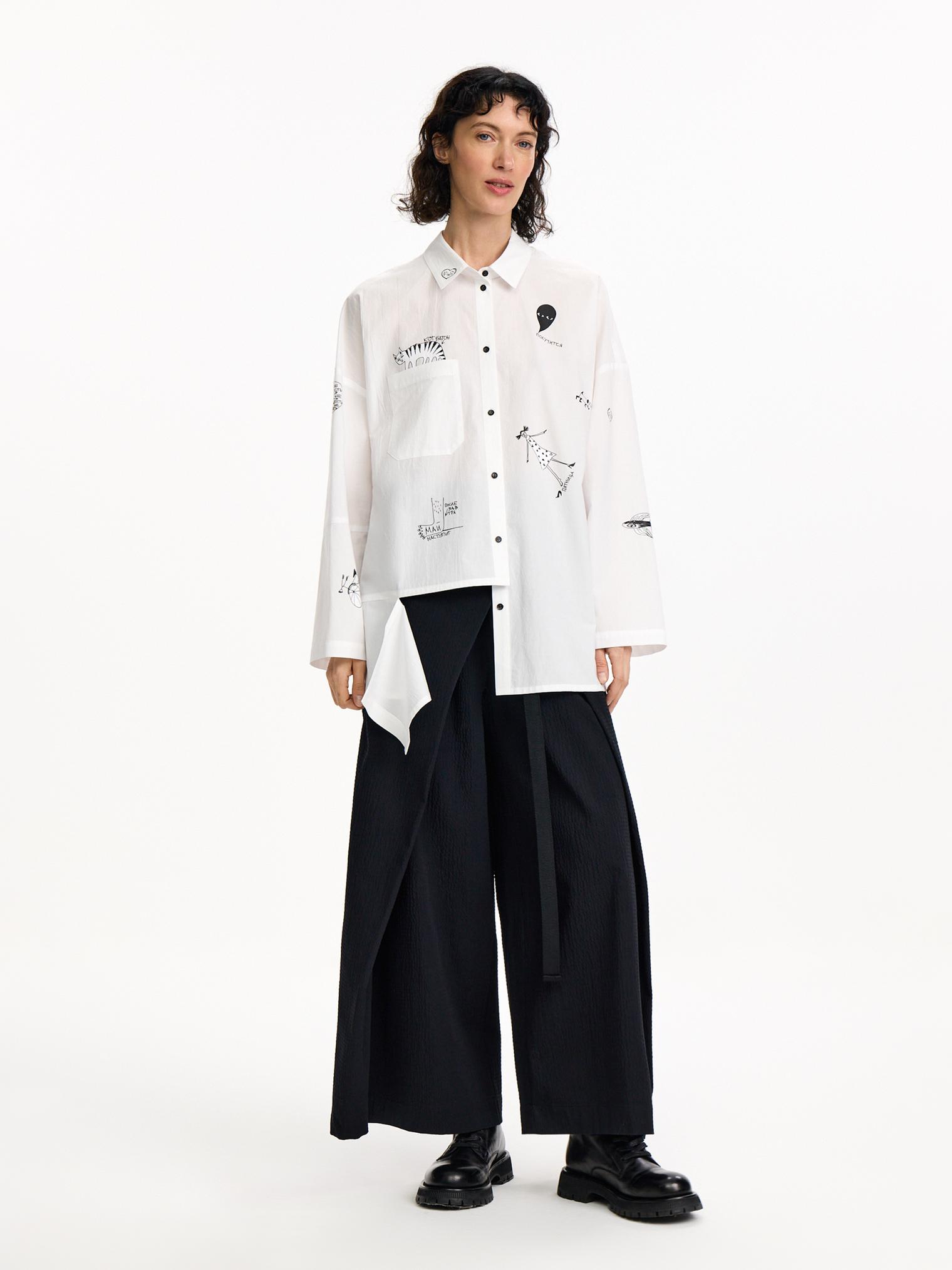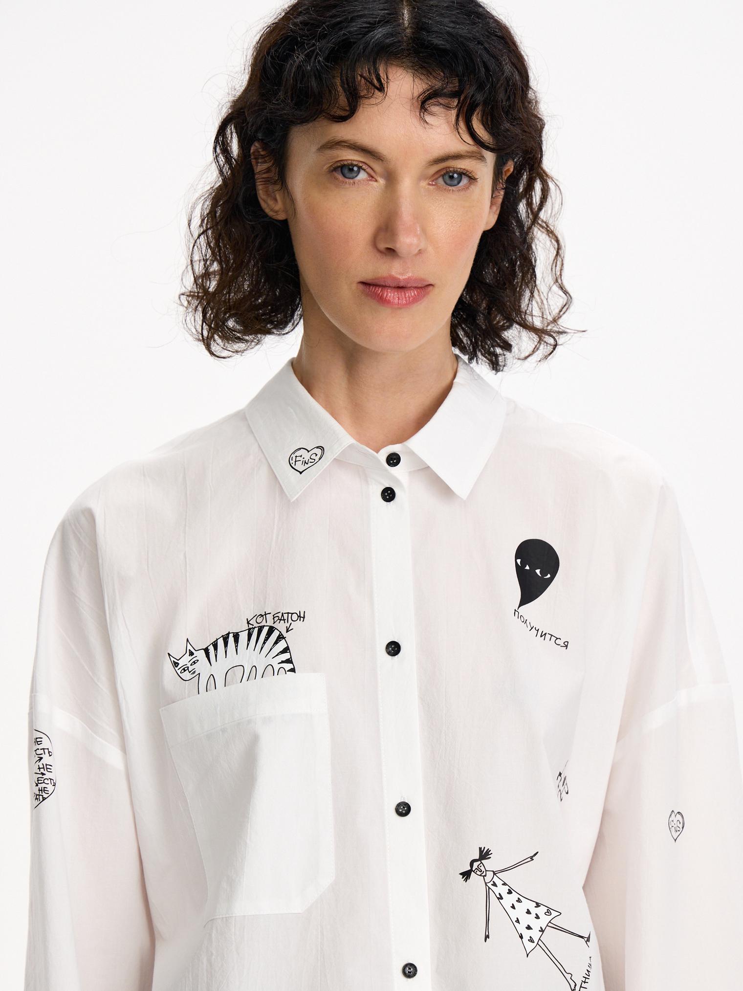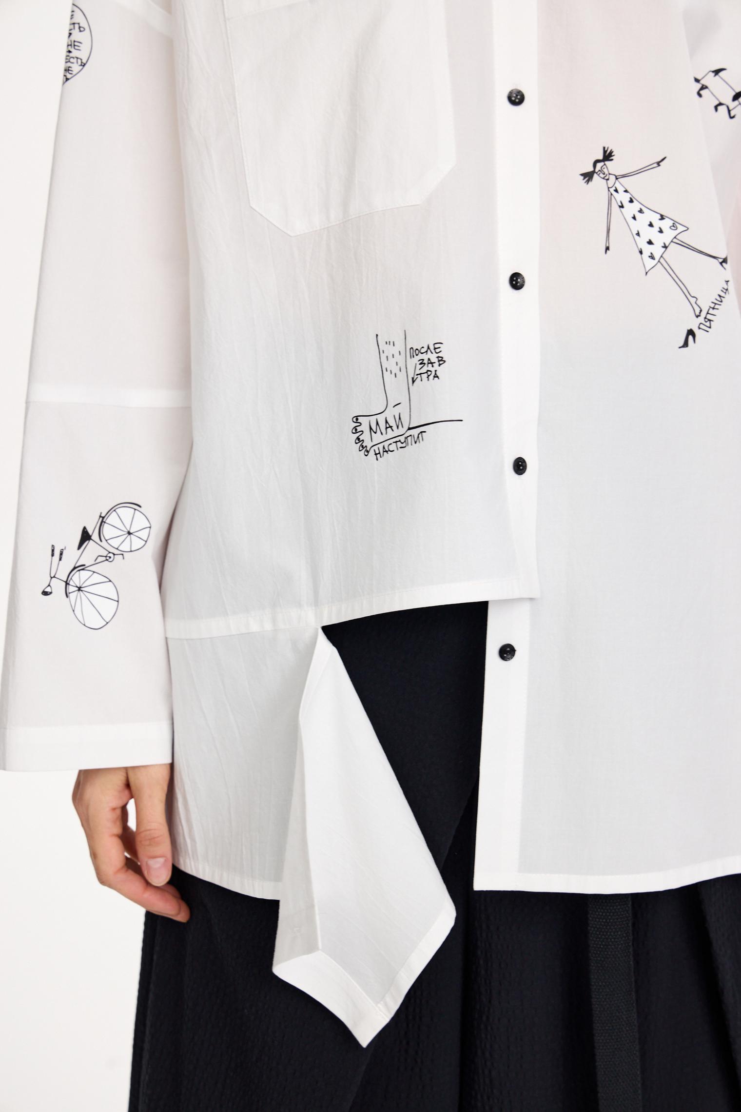 Новая небазовая блузка из хлопка stone wash c черно-белыми принтами и отлетной деталью. Зарисовки с авторским принтом расставляют акценты.