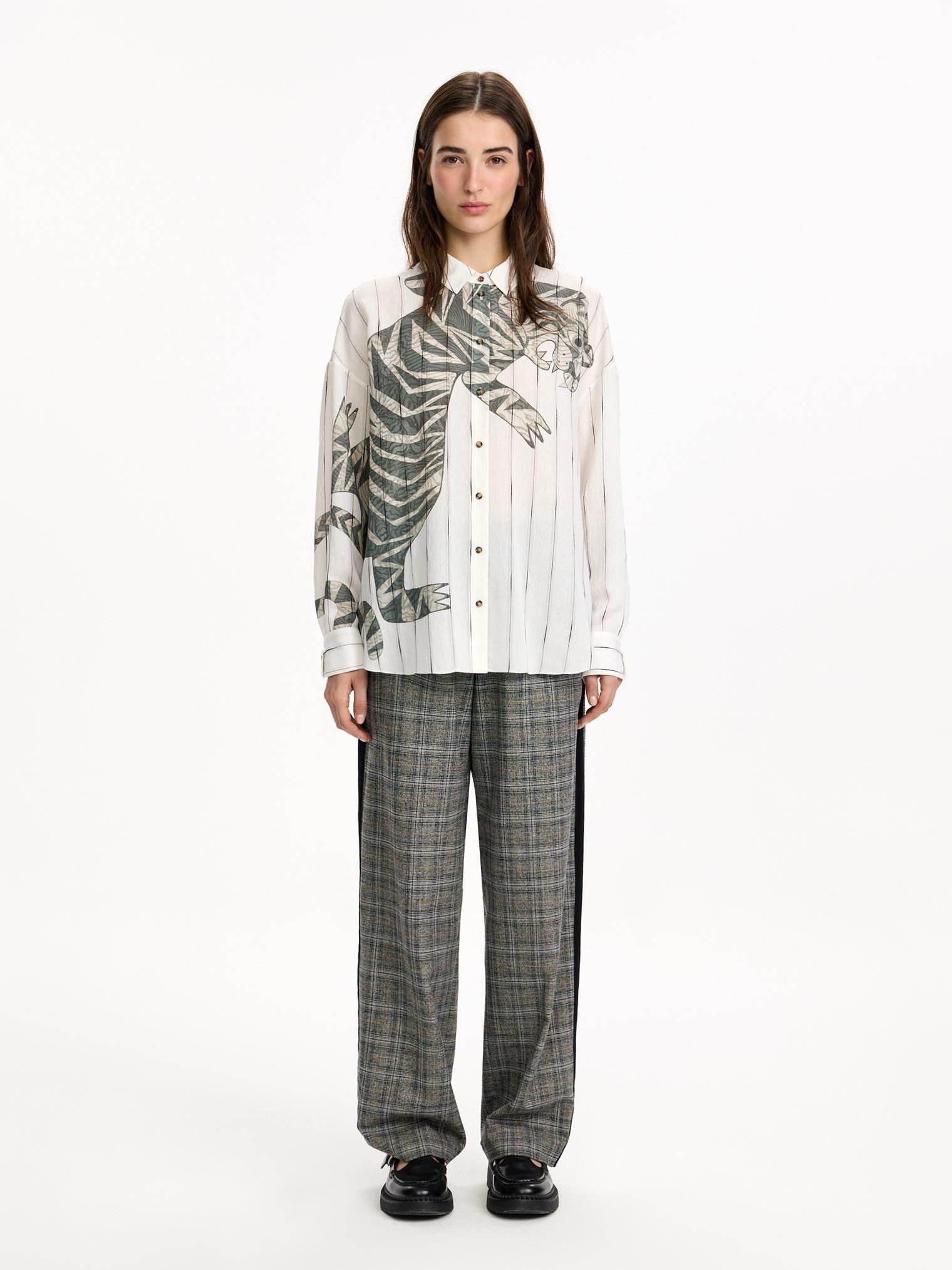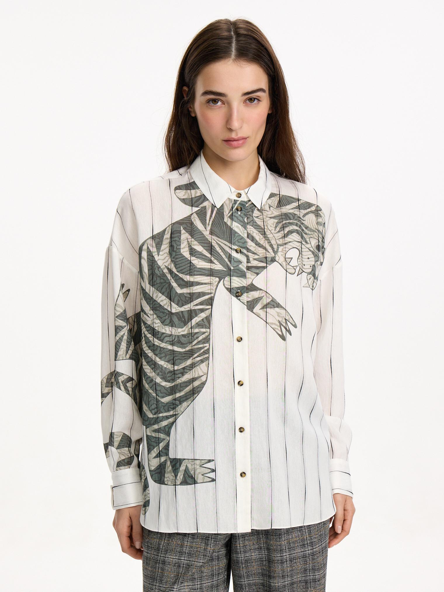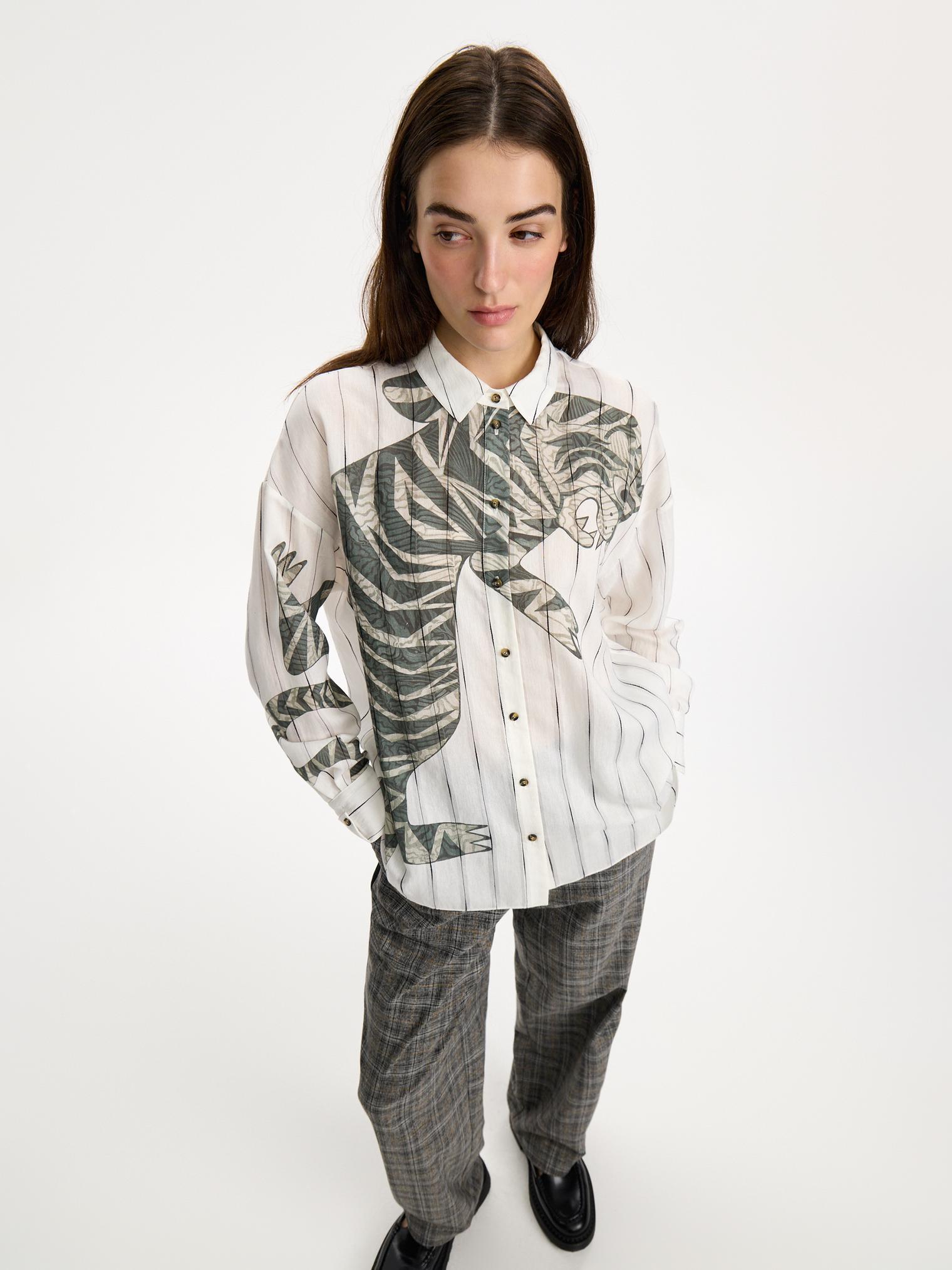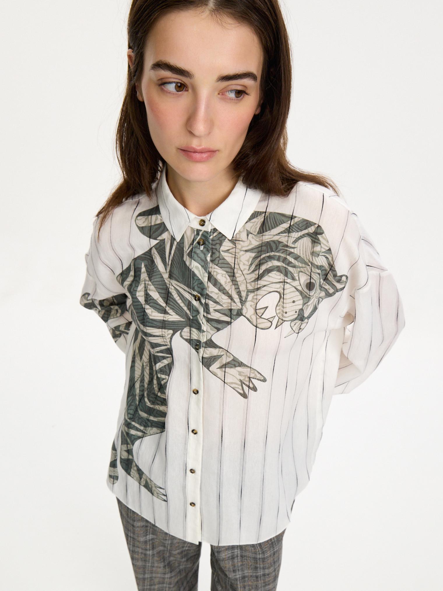 Струящаяся блузка я из вискозной ткани. Тонкая полоска встречается с принтом в виде огромного тигра. Необычные манжеты добавляют изюминку, а роговые пуговицы расставляют акценты.