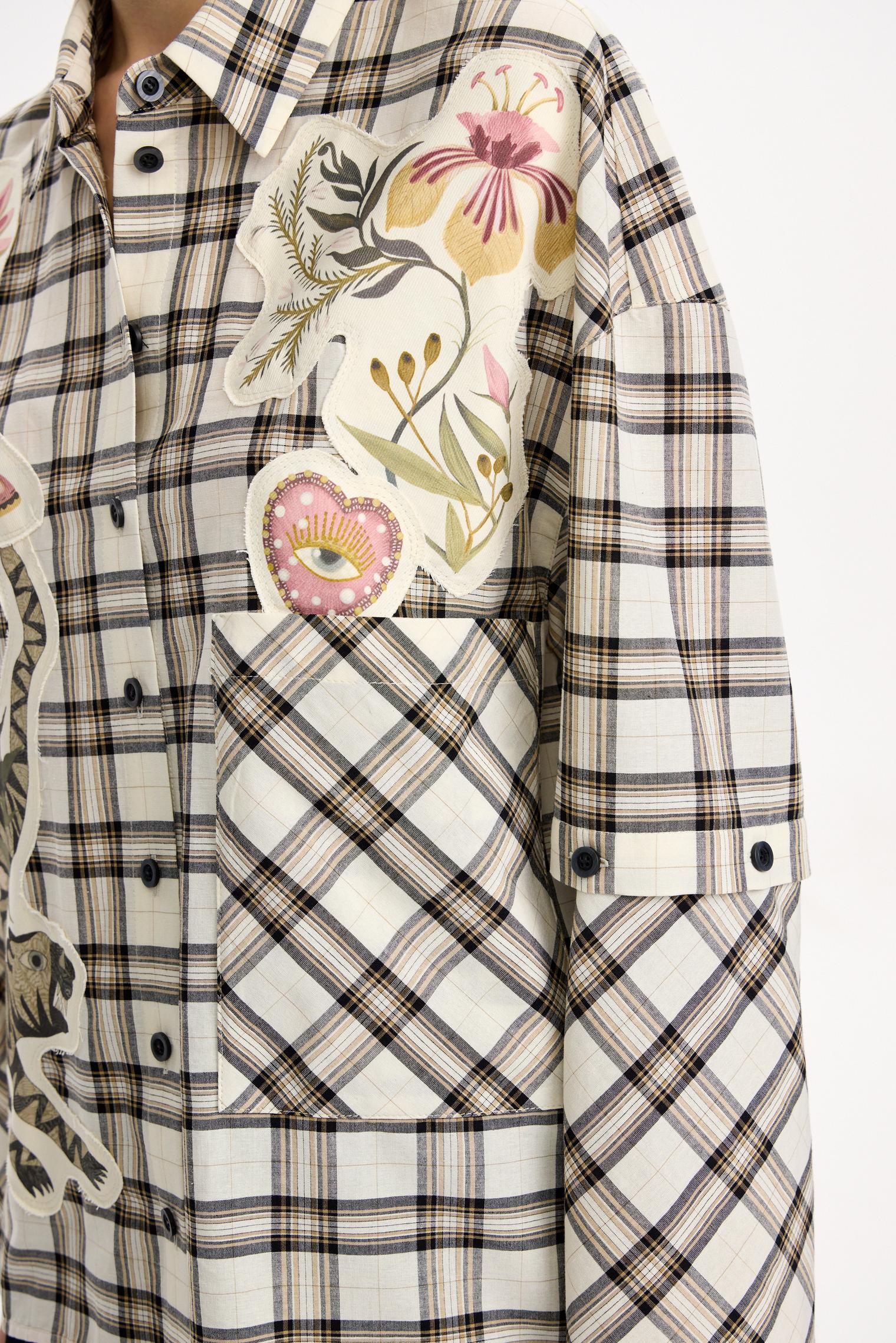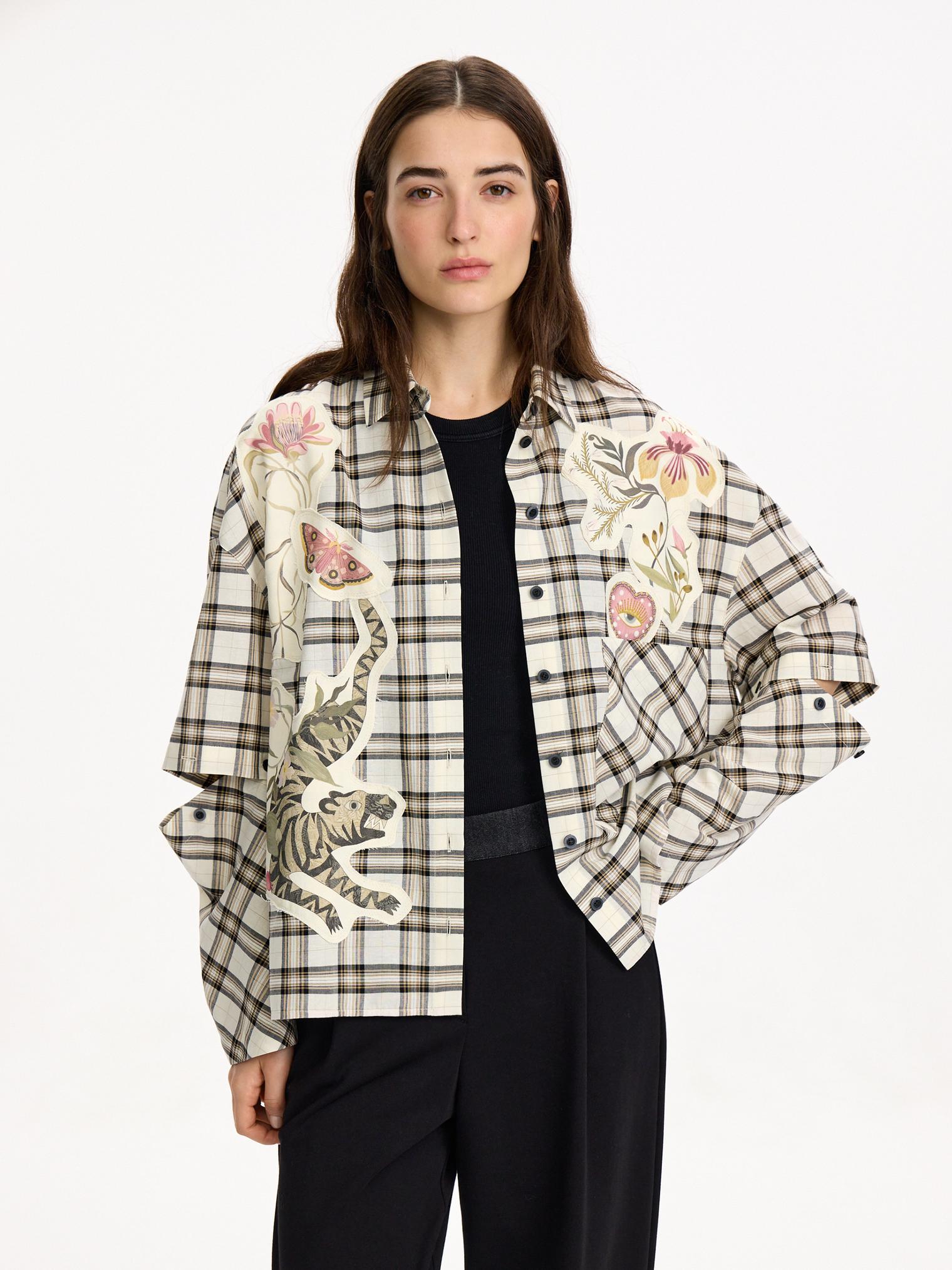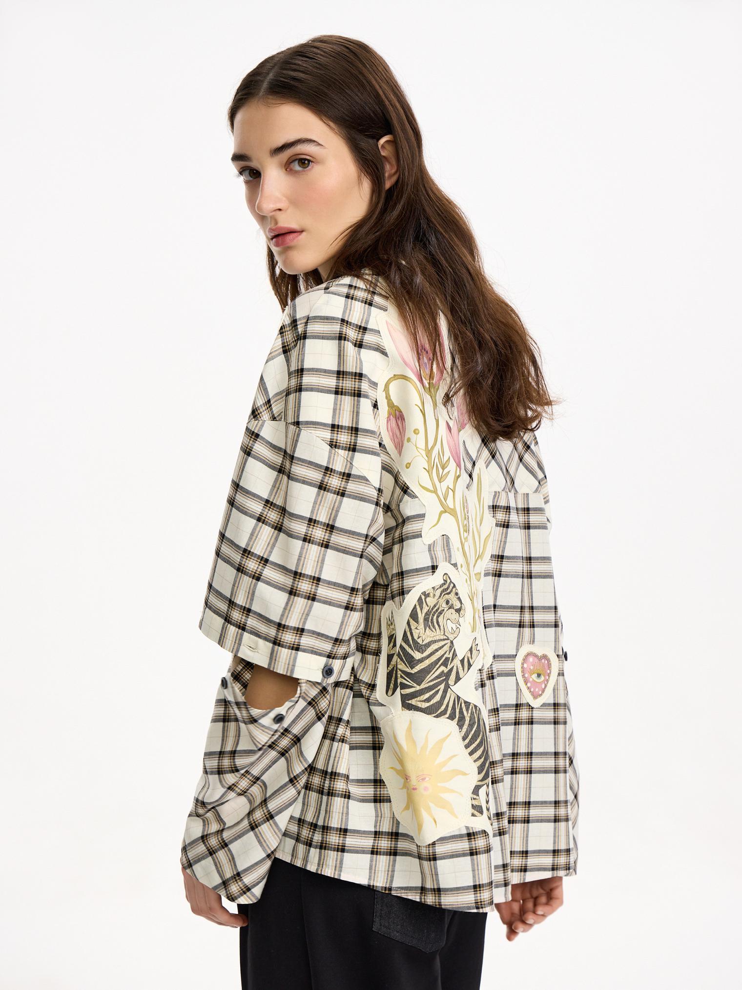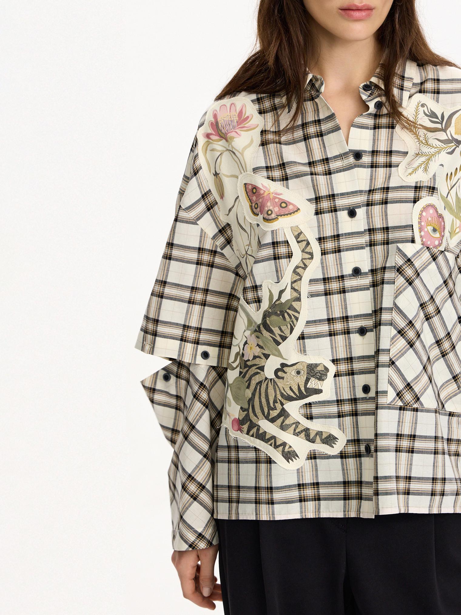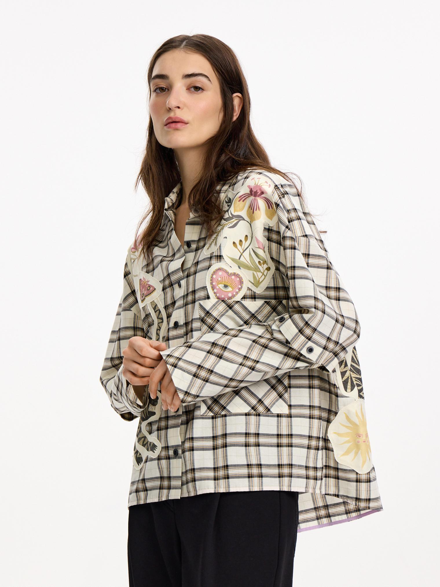 Объемная блуза из смесового хлопка и вискозы. Модель в крупную клетку и нашивки с авторскими принтами, которые настрачиваются практически вручную. Отдельного внимания достойны рукава-трансформеры. После стирки блузка станет еще выразительнее за счет приобретения эффекта гранжевости.