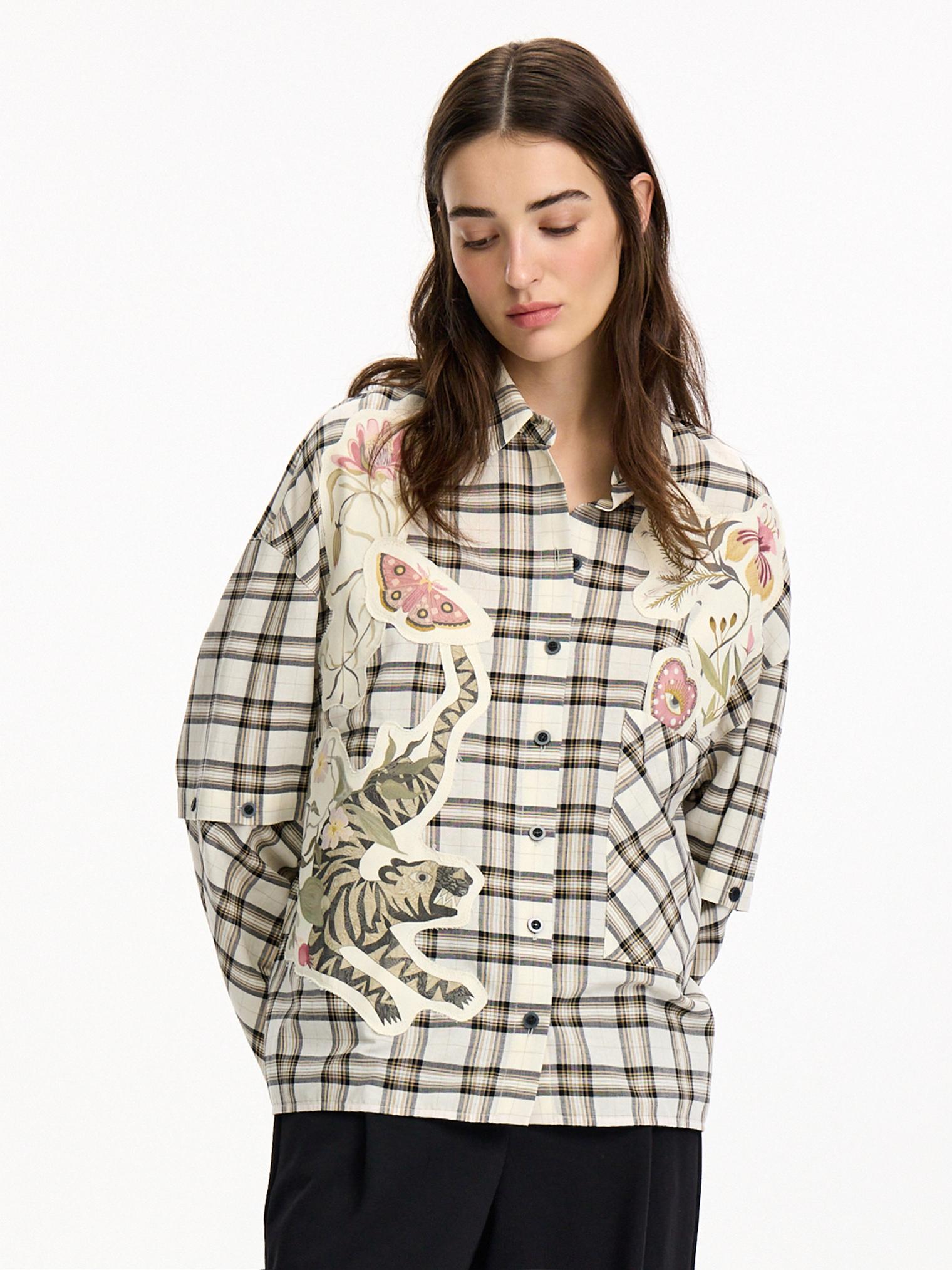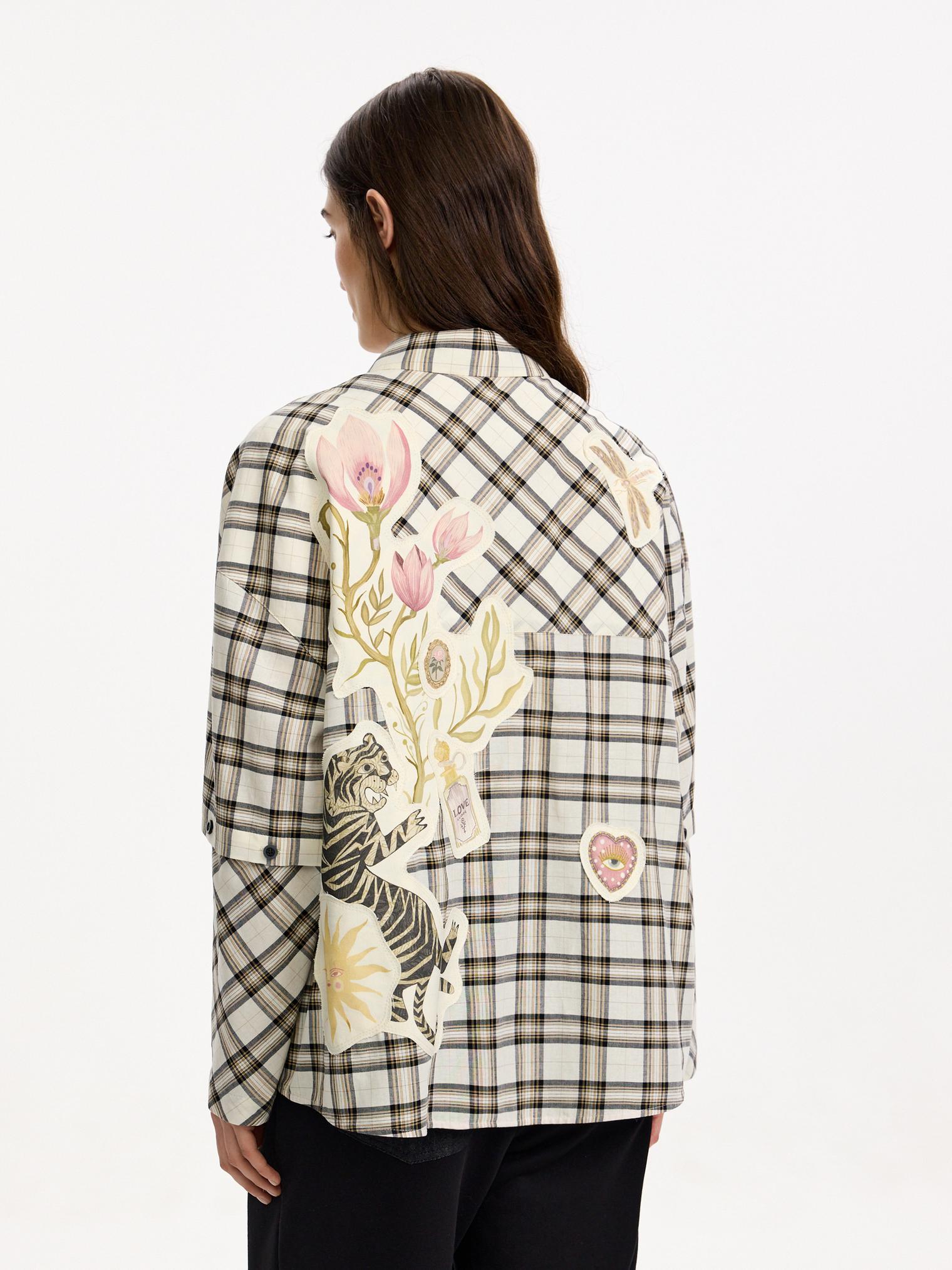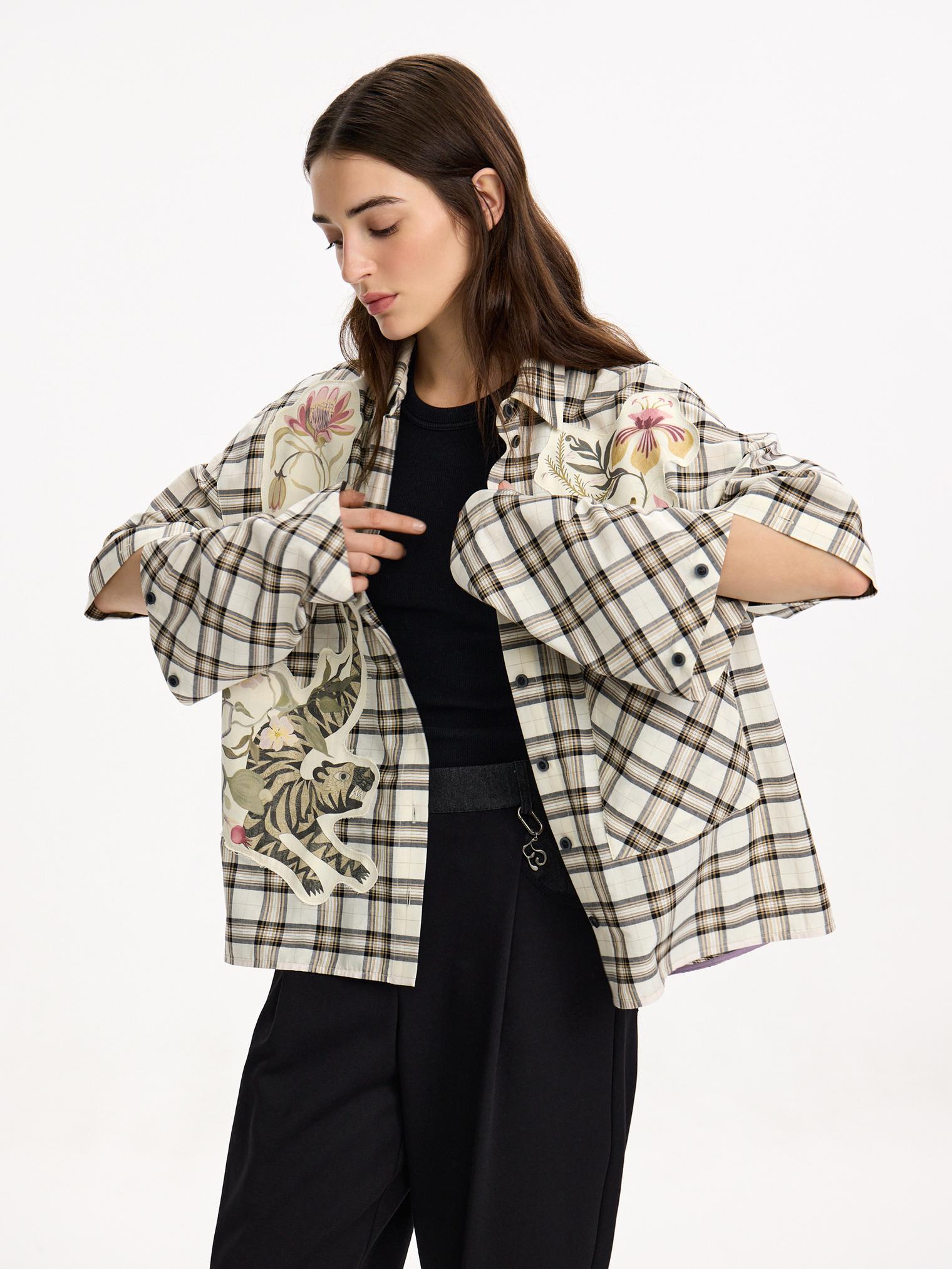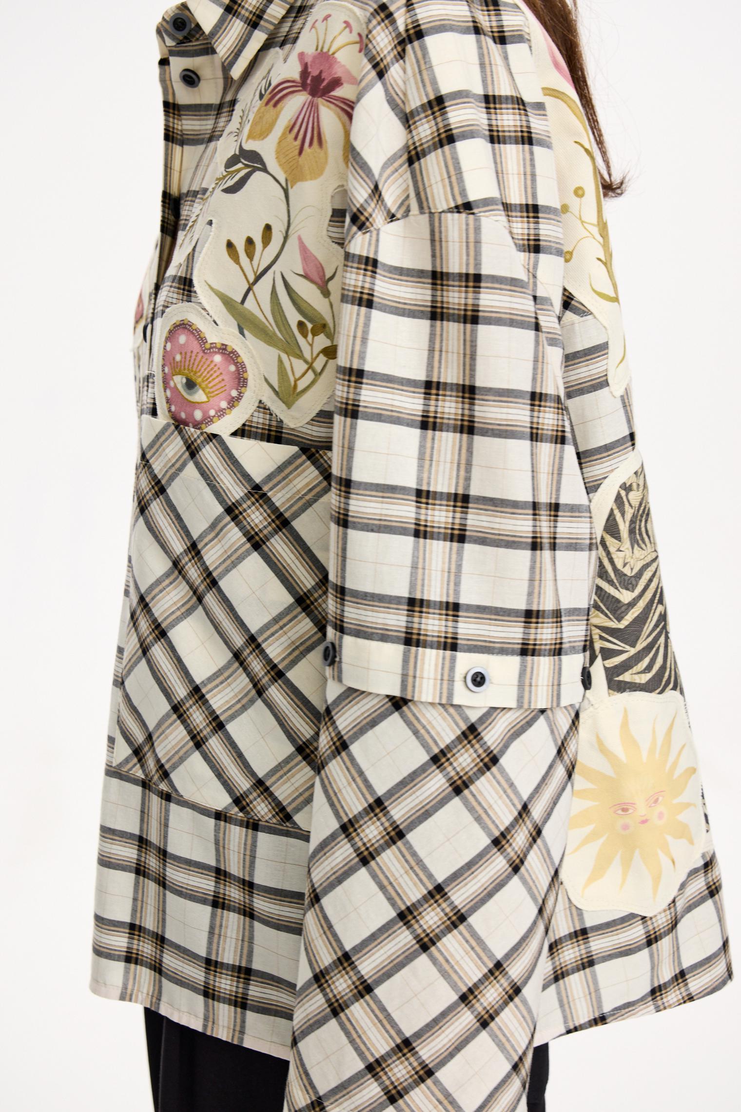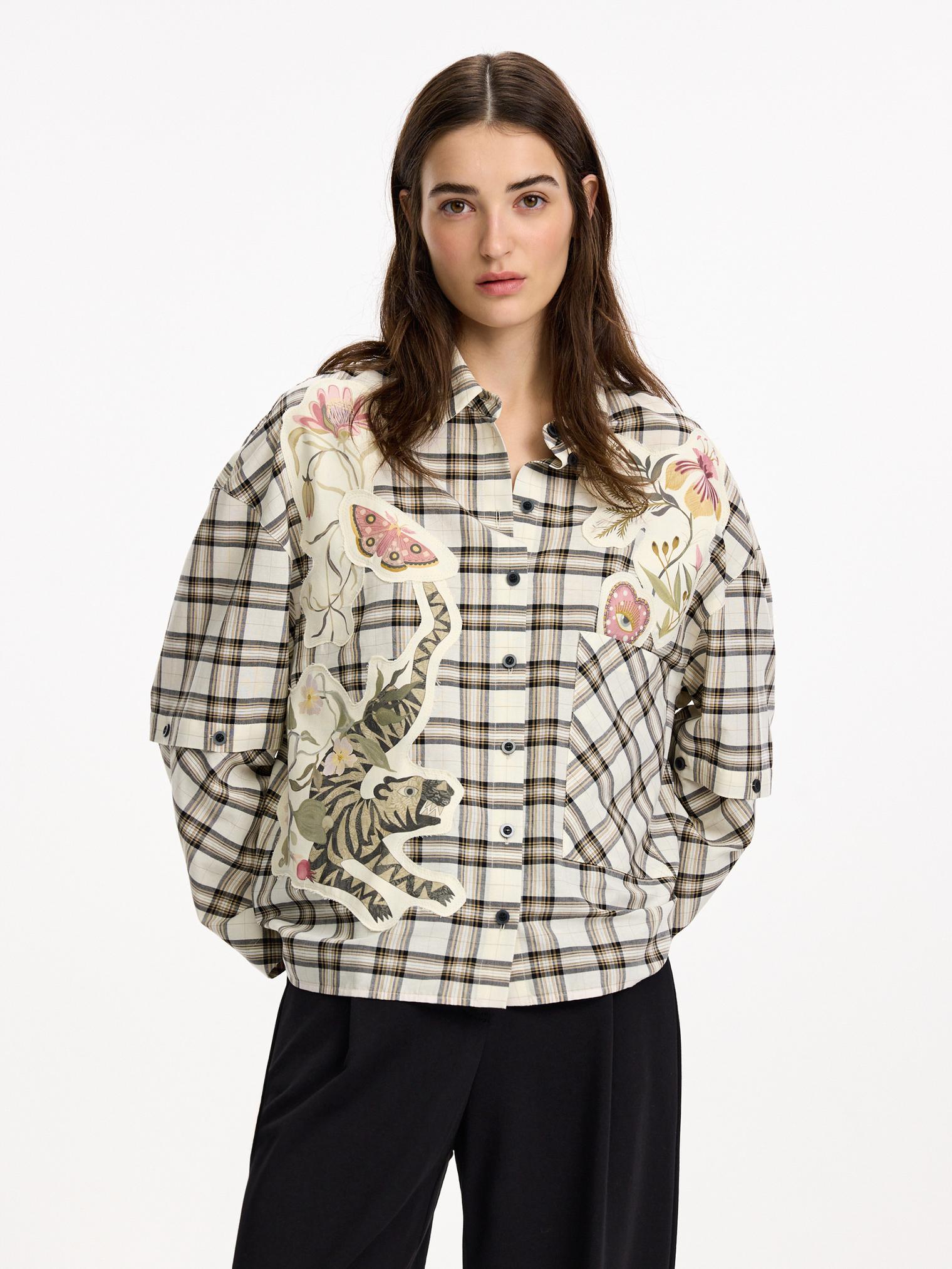Объемная блуза из смесового хлопка и вискозы. Модель в крупную клетку и нашивки с авторскими принтами, которые настрачиваются практически вручную. Отдельного внимания достойны рукава-трансформеры. После стирки блузка станет еще выразительнее за счет приобретения эффекта гранжевости.